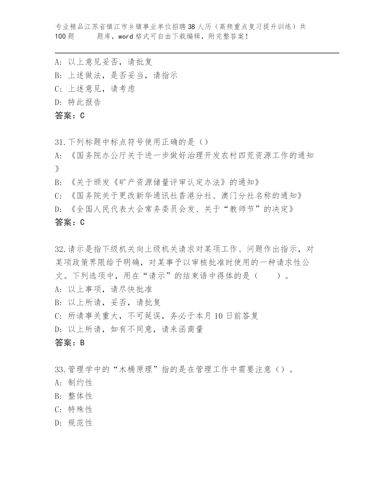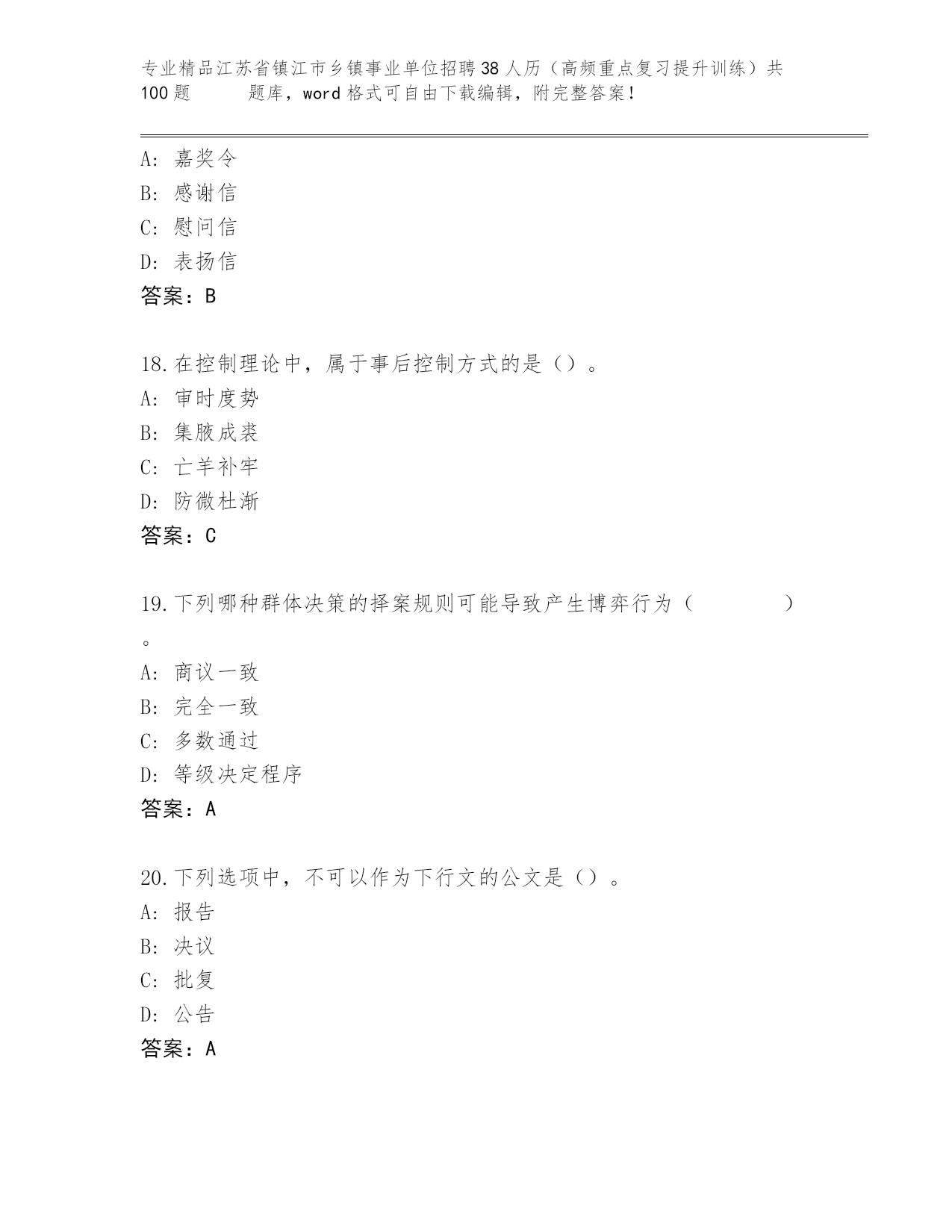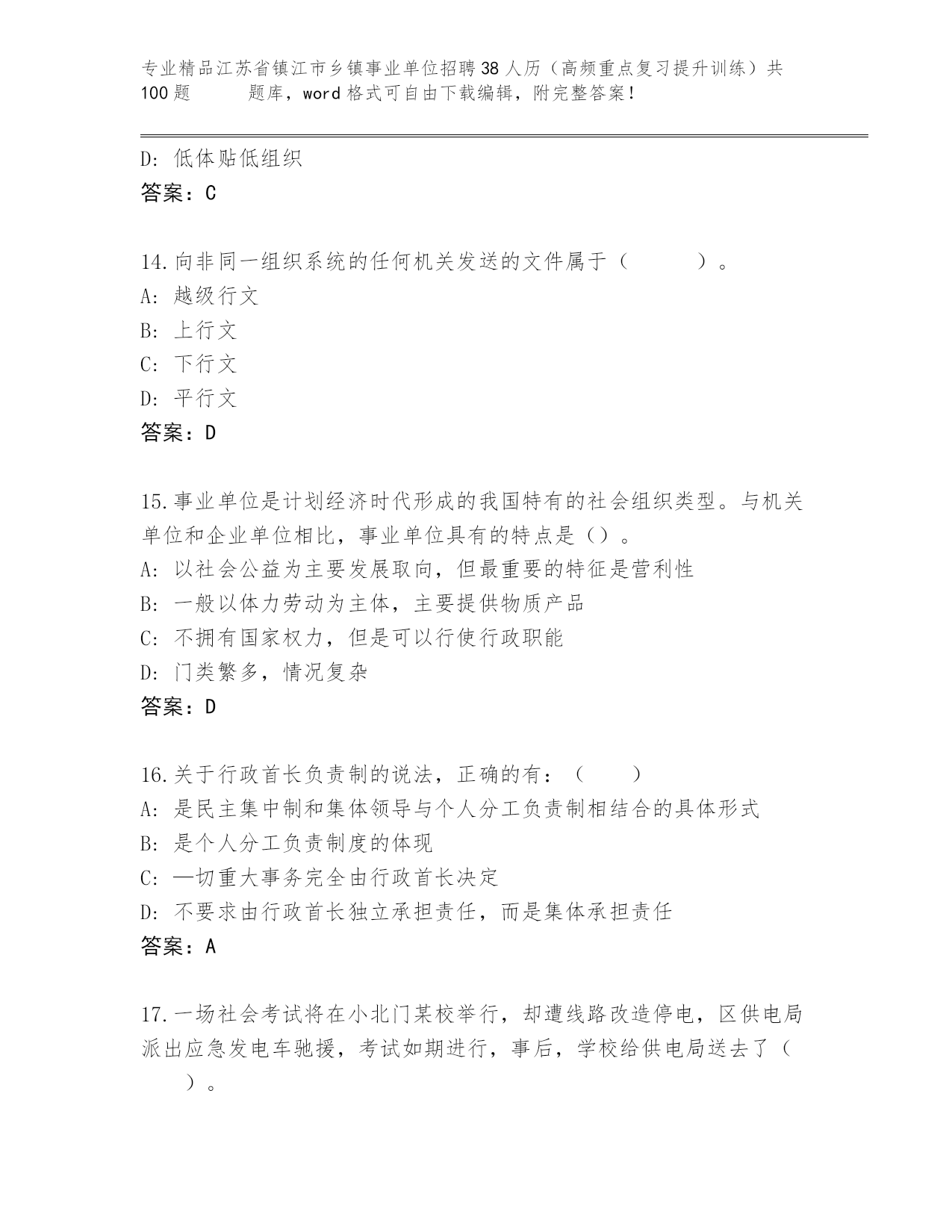 精品江苏省镇江市乡镇事业单位招聘38人历(高频重点复习提升训练)共100题 真题精品加答案