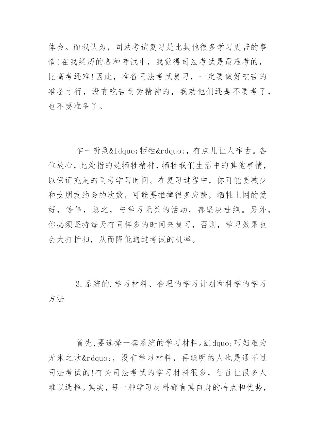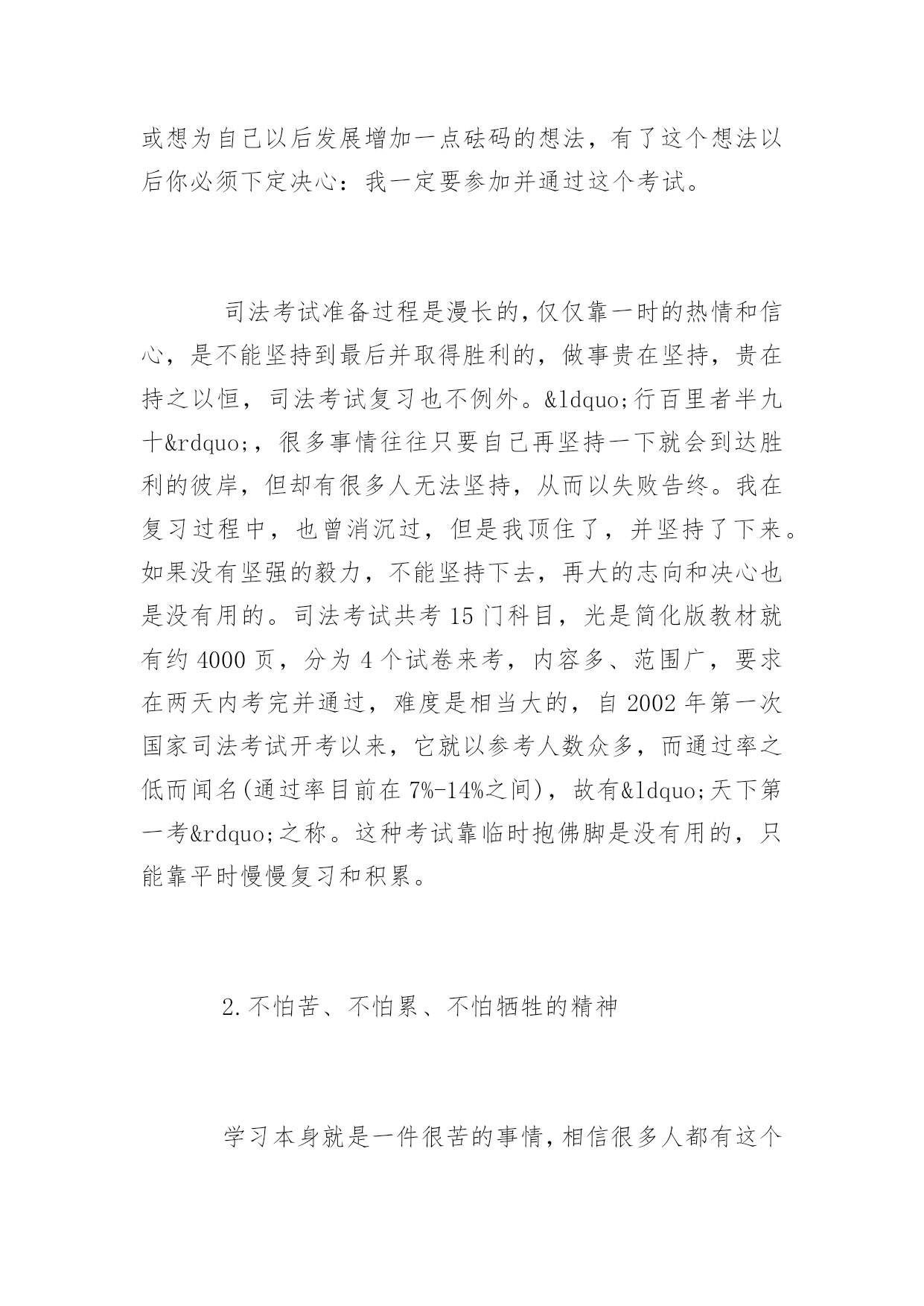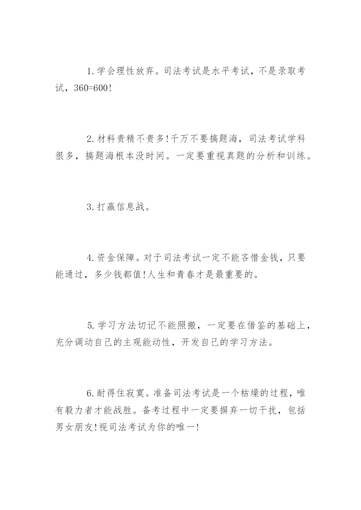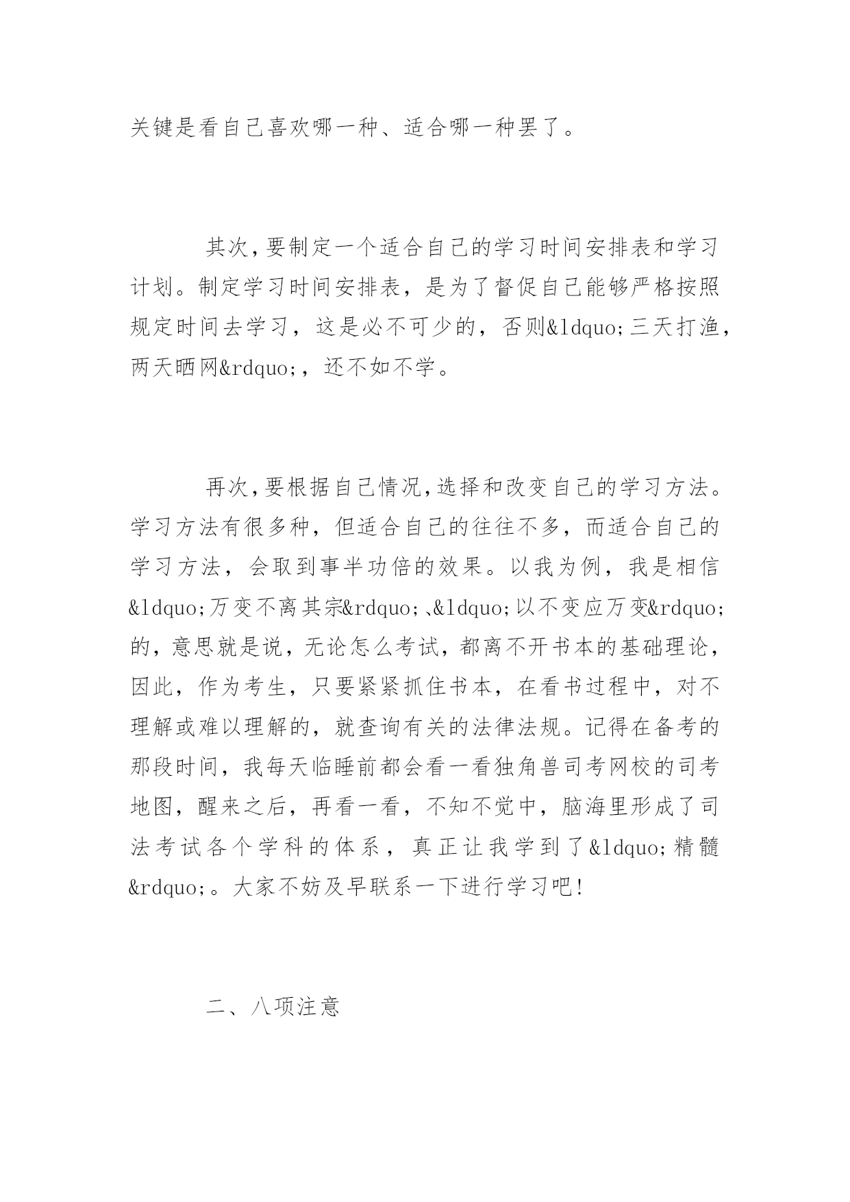 司法考试备考的纪律与注意事项2016司法考试备考的纪律与注意事项我们备战司考任务艰巨,为了严格要求自己,提高备考效率,取得良好的备战效果,我们也应该有自己的行为准则。作为一名司考的过来人,司考备战中也应该有“三大纪律、八项注意”。下面百分网小编就跟大家聊一聊。一、三大纪律1.充满信心,下定决心,持之以恒俗话说“有了良好的自信,就等于成功了一半”,这是很有道理的。要通过司法考试,首先对自己要充满信心,要相信“我能行”“我是最棒的”,如果对自己没有信心,那也就没必要准备复习和参加考试了。我之所以先辞掉公职再准备司法考试,也是源于对自己的很大的信心。自己首先要有从事法律职业,或想为自己以后发展增加一点砝码的想法,有了这个想法以后你必须下定决心:我一定要参加并通过这个考试。司法考试准备过程是漫长的,仅仅靠一时的热情和信心,是不能坚持到最后并取得胜利的,做事贵在坚持,贵在持之以恒,司法考试复习也不例外。“行百里者半九十”,很多事情往往只要自己再坚持一下就会到达胜利的彼岸,但却有很多人无法坚持,从而以失败告终。我在复习过程中,也曾消沉过,但是我顶住了,并坚持了下来。如果没有坚强的毅力,不能坚持下去,再大的志向和决心也是没有用的。司法考试共考15门科目,光是简化版教材就有约4000页,分为4个试卷来考,内容多、范围广,要求在两天内考完并通过,难度是相当大的,自2002年第一次国家司法考试开考以来,它就以参考人数众多,而通过率之低而闻名(通过率目前在7%-14%之间),故有“天下第一考”之称。这种考试靠临时抱佛脚是没有用的,只能靠平时慢慢复习和积累。2.不怕苦、不怕累、不怕牺牲的精神学习本身就是一件很苦的事情,相信很多人都有这个体会。而我认为,司法考试复习是比其他很多学习更苦的事情!在我经历的各种考试中,我觉得司法考试是最难考的,比高考还难!因此,准备司法考试复习,一定要做好吃苦的准备才行,没有吃苦耐劳精神的,我劝他们还是不要考了,也不要准备了。乍一听到“牺牲”,有点儿让人咋舌。各位放心,此处指的是牺牲精神,牺牲我们生活中的其他事情,以保证充足的司考学习时间。在复习过程中,你可能要减少和女朋友约会的次数,可能要推掉很多应酬,牺牲上网的爱好,等等,总之,与学习无关的活动,都坚决杜绝。另外,你必须坚持每天有同样多的时间来复习,否则,学习效果也会大打折扣,从而降低通过考试的机率。3.系统的.学习材料、合理的学习计划和科学的学习方法首先,要选择一套系统的学习材料。“巧妇难为无米之炊”,没有学习材料,再聪明的人也是通不过司法考试的!有关司法考试的学习材料很多,往往让很多人难以选择。其实,每一种学习材料都有其自身的特点和优势,关键是看自己喜欢哪一种、适合哪一种罢了。其次,要制定一个适合自己的学习时间安排表和学习计划。制定学习时间安排表,是为了督促自己能够严格按照规定时间去学习,这是必不可少的,否则“三天打渔,两天晒网”,还不如不学。再次,要根据自己情况,选择和改变自己的学习方法。学习方法有很多种,但适合自己的往往不多,而适合自己的学习方法,会取到事半功倍的效果。以我为例,我是相信“万变不离其宗”、“以不变应万变”的,意思就是说,无论怎么考试,都离不开书本的基础理论,因此,作为考生,只要紧紧抓住书本,在看书过程中,对不理解或难以理解的,就查询有关的法律法规。记得在备考的那段时间,我每天临睡前都会看一看独角兽司考网校的司考地图,醒来之后,再看一看,不知不觉中,脑海里形成了司法考试各个学科的体系,真正让我学到了“精髓”。大家不妨及早联系一下进行学习吧!二、八项注意1.学会理性放弃。司法考试是水平考试,不是录取考试,360=600!2.材料贵精不贵多!千万不要搞题海,司法考试学科很多,搞题海根本没时间。一定要重视真题的分析和训练。3.打赢信息战。4.资金保障。对于司法考试一定不能吝惜金钱,只要能通过,多少钱都值!人生和青春才是最重要的。5.学习方法切记不能照搬,一定要在借鉴的基础上,充分调动自己的主观能动性,开发自己的学习方法。6.耐得住寂寞。准备司法考试是一个枯燥的过程,唯有毅力者才能战胜。备考过程中一定要摒弃一切干扰,包括男女朋友!视司法考试为你的唯一!7.避免眼高手低。在复习过程中,针对案例分析和论述题一定要动笔,千万不能光看光想,我就在这方面吃亏了……8.时间要保障。司法考试复习要保证每天至少8小时
