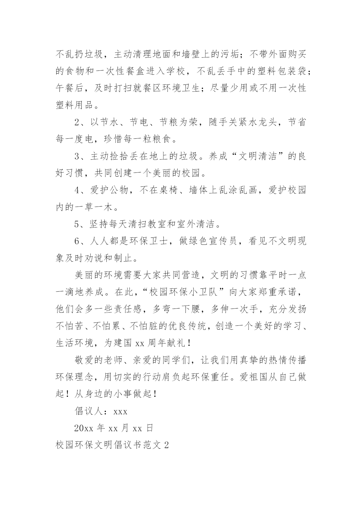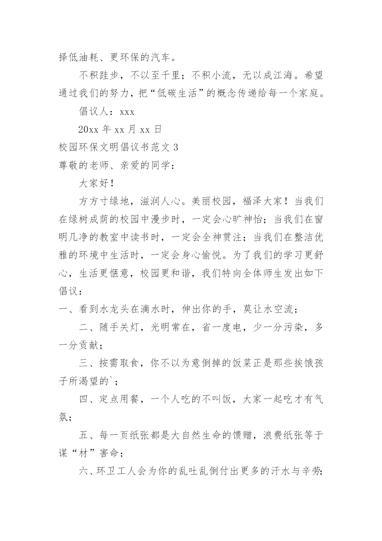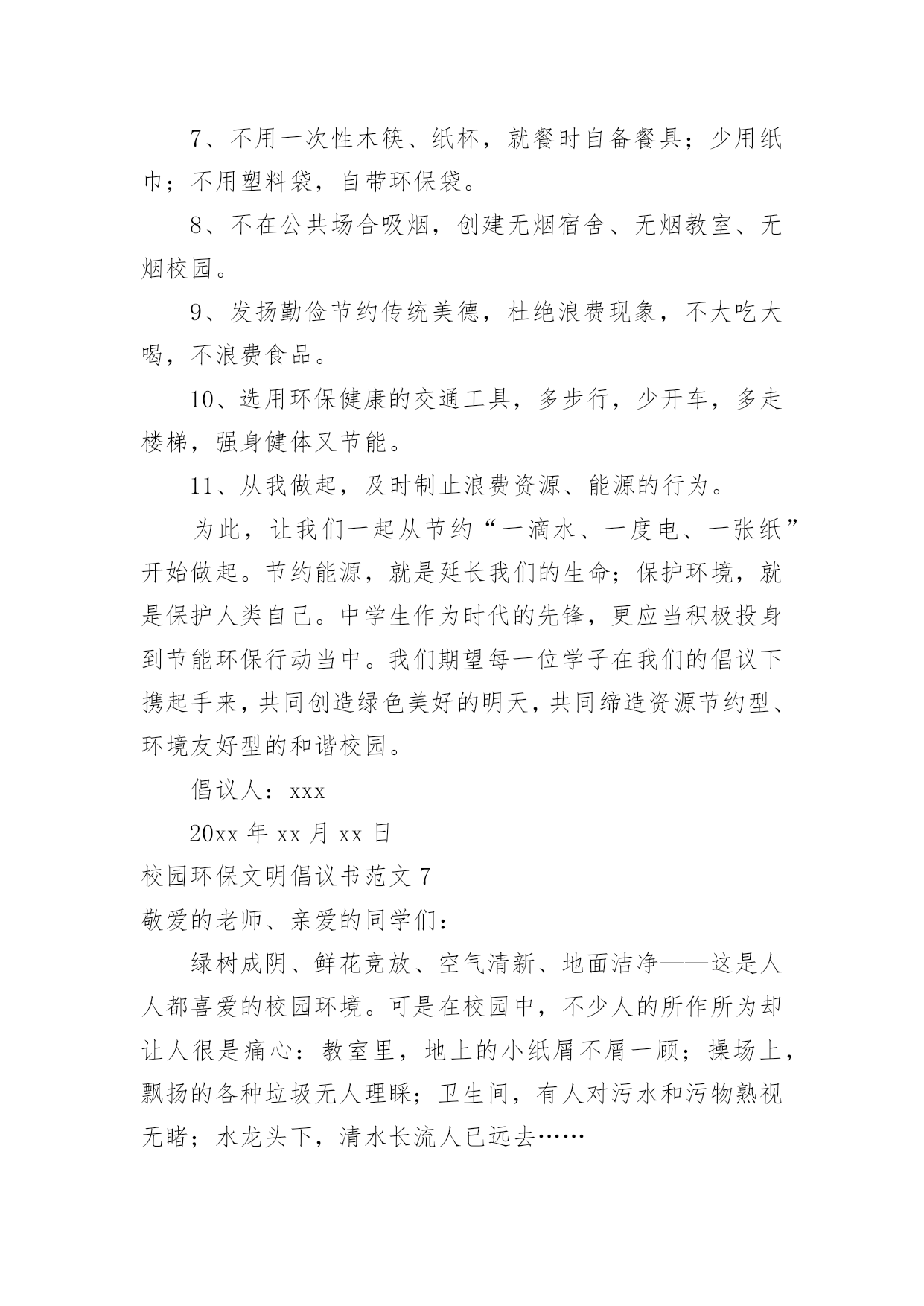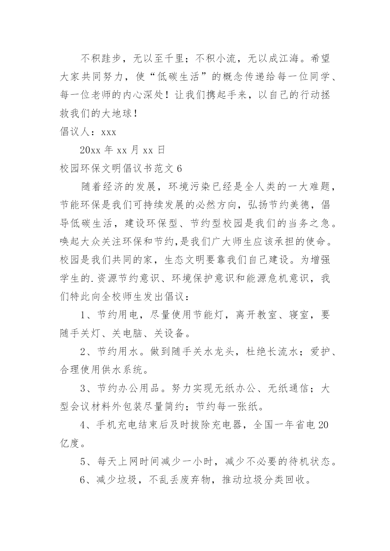 校园环保文明倡议书校园环保文明倡议书范文在学习、工作生活中,能够利用到倡议书的场合越来越多,倡议书作为一种公开提议性的专用书信,其在写作上有一定的规范。相信许多人会觉得倡议书很难写吧,下面是小编帮大家整理的校园环保文明倡议书范文,欢迎阅读与收藏。校园环保文明倡议书范文1亲爱的老师们、同学们:你们好!阳光明媚,空气清新,鸟语花香是我们梦寐以求的校园环境,每个人都希望在一个清洁、舒适的环境中学习生活,健康成长。多年来,我校一直倡导绿色文明,营造人文和谐的育人环境。但是,肆意浪费,乱扔乱倒,不文明就餐等现象却时常出现在同学们身边。再过几天,就是建国xx周年大庆。为创造优美整洁的育人环境,减少疾病发生,以全新的面貌、崭新的`姿态迎接国庆的到来,我校少先队大队部成立了一支“校园环保小卫队”,他们发扬不怕苦、不怕累、不怕脏的优良传统,用实际行动维护着校园环境卫生,唱响了校园“和谐音符”。今天,特向全校师生发出以下倡议:1、争做文明人,养成讲卫生的好习惯。不随地吐痰,不乱扔垃圾,主动清理地面和墙壁上的污垢;不带外面购买的食物和一次性餐盒进入学校,不乱丢手中的塑料包装袋;午餐后,及时打扫就餐区环境卫生;尽量少用或不用一次性塑料用品。2、以节水、节电、节粮为荣,随手关紧水龙头,节省每一度电,珍惜每一粒粮食。3、主动捡拾丢在地上的垃圾。养成“文明清洁”的良好习惯,共同创建一个美丽的校园。4、爱护公物,不在桌椅、墙体上乱涂乱画,爱护校园内的一草一木。5、坚持每天清扫教室和室外清洁。6、人人都是环保卫士,做绿色宣传员,看见不文明现象及时劝说和制止。美丽的环境需要大家共同营造,文明的习惯靠平时一点一滴地养成。在此,“校园环保小卫队”向大家郑重承诺,他们会多一些责任感,多弯一下腰,多伸一次手,充分发扬不怕苦、不怕累、不怕脏的优良传统,创造一个美好的学习、生活环境,为建国xx周年献礼!敬爱的老师、亲爱的同学们,让我们用真挚的热情传播环保理念,用切实的行动肩负起环保重任。爱祖国从自己做起!从身边的小事做起!倡议人:xxx20xx年xx月xx日校园环保文明倡议书范文2亲爱的朋友:近年来,全球气候变幻无常、水土流失严重、温室效应明显、耕地沙化蔓延、生存环境日益恶化,严重威胁着全人类的健康与生命。我们青年志愿者一直注重环保节能,倡导绿色健康的“低碳新生活”。我们愿与您一起追求低碳新生活,大家一起来行动吧!为了你、为了我、为了他、也为了我们这个赖以生存的地球大家庭,更是为了明天的美好生活。让我们一起从节约“一滴水、一度电、一张纸”做起,共同做到:衣:根据天气变化,选择适宜的衣服,尽量减少空调的使用频次。同时选择环保面料并减少洗涤,尽量选择手洗。食:尽量购买本地食品,减少食物加工及流通过程,可以减少二氧化碳的`排放。使用少油、少盐、少加工的烹饪方法,健康的不仅是自己,还有我们赖以生存的地球。住:住房面积不必一味求大,理智选择适合自己的户型。因为住房面积的减少可以降低水、电的用量,这在无形之中减少了二氧化碳的排放量。用:洗菜水、洗澡水循环利用、房间照明选择节能灯、购物使用环保袋、纸张双面打印、不使用一次性餐具、尽量购买包装简单的产品等等,既减少生产中消耗的能量,也减少了垃圾。行:提倡多步行、多骑自行车、多乘公共交通工具。汽车是二氧化碳的排放大户,有需要购买汽车的话、应尽量选择低油耗、更环保的汽车。不积跬步,不以至千里;不积小流,无以成江海。希望通过我们的努力,把“低碳生活”的概念传递给每一个家庭。倡议人:xxx20xx年xx月xx日校园环保文明倡议书范文3尊敬的老师、亲爱的同学:大家好!方方寸绿地,滋润人心。美丽校园,福泽大家!当我们在绿树成荫的校园中漫步时,一定会心旷神怡;当我们在窗明几净的教室中读书时,一定会全神贯注;当我们在整洁优雅的环境中生活时,一定会身心愉悦。为了我们的学习更舒心,生活更惬意,校园更和谐,我们特向全体师生发出如下倡议:一、看到水龙头在滴水时,伸出你的手,莫让水空流;二、随手关灯,光明常在,省一度电,少一分污染,多一分贡献;三、按需取食,你不以为意倒掉的饭菜正是那些挨饿孩子所渴望的`;四、定点用餐,一个人吃的不叫饭,大家一起吃才有气氛;五、每一页纸张都是大自然生命的馈赠,浪费纸张等于谋“材”害命;六、环卫工人会为你的乱吐乱倒付出更多的汗水与辛劳;七、任何资源都是有限的,拒绝一次性制品是一种节约,更是一种美德;八、生命无价,一草一木都有生存的权利,需要我们给予关注与呵护;九、动物是我们的朋友,善待它们,它们会带给我们快乐与温暖;十、大喊大叫可能会影响他人,公众场合保持安静是对他人最好的尊重。“事不关己,高高挂起”,你抛弃的不仅仅是你融入集体的通行证,更是你的素养。“予人玫瑰,手有余香”,你收获的不仅仅是赞誉,更是你的修养。让我们从自己做起,从此