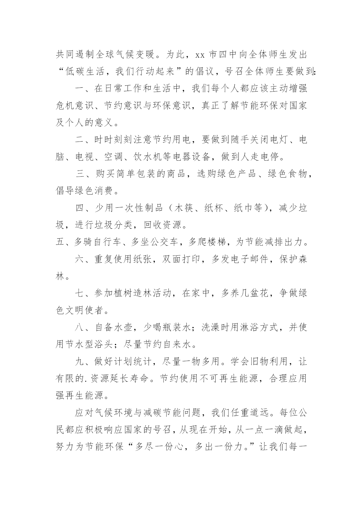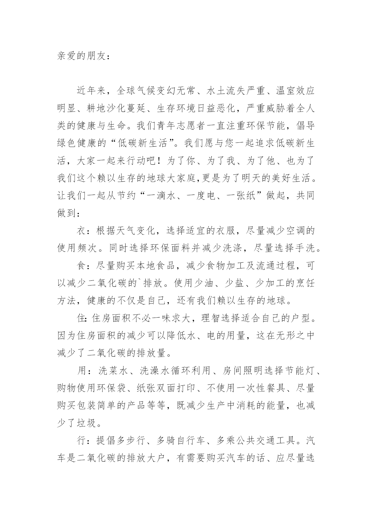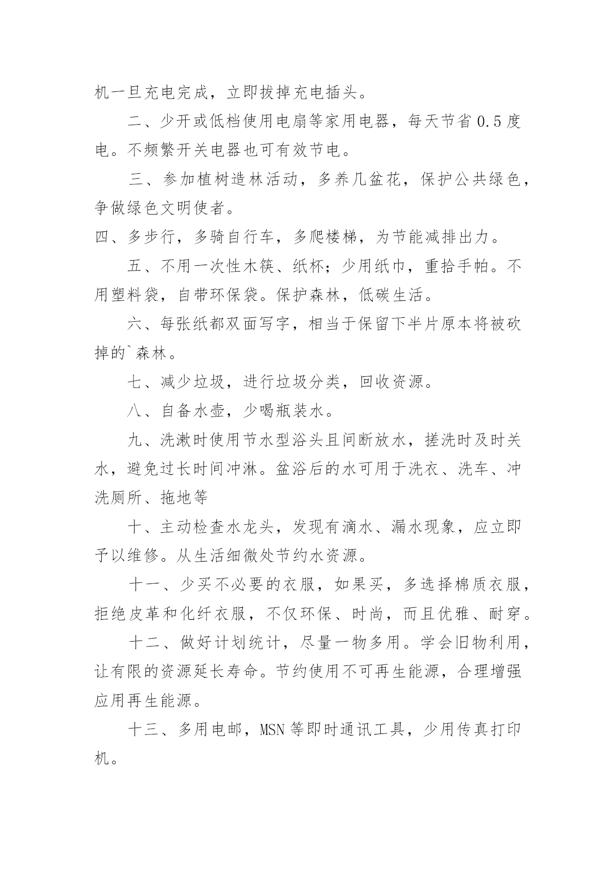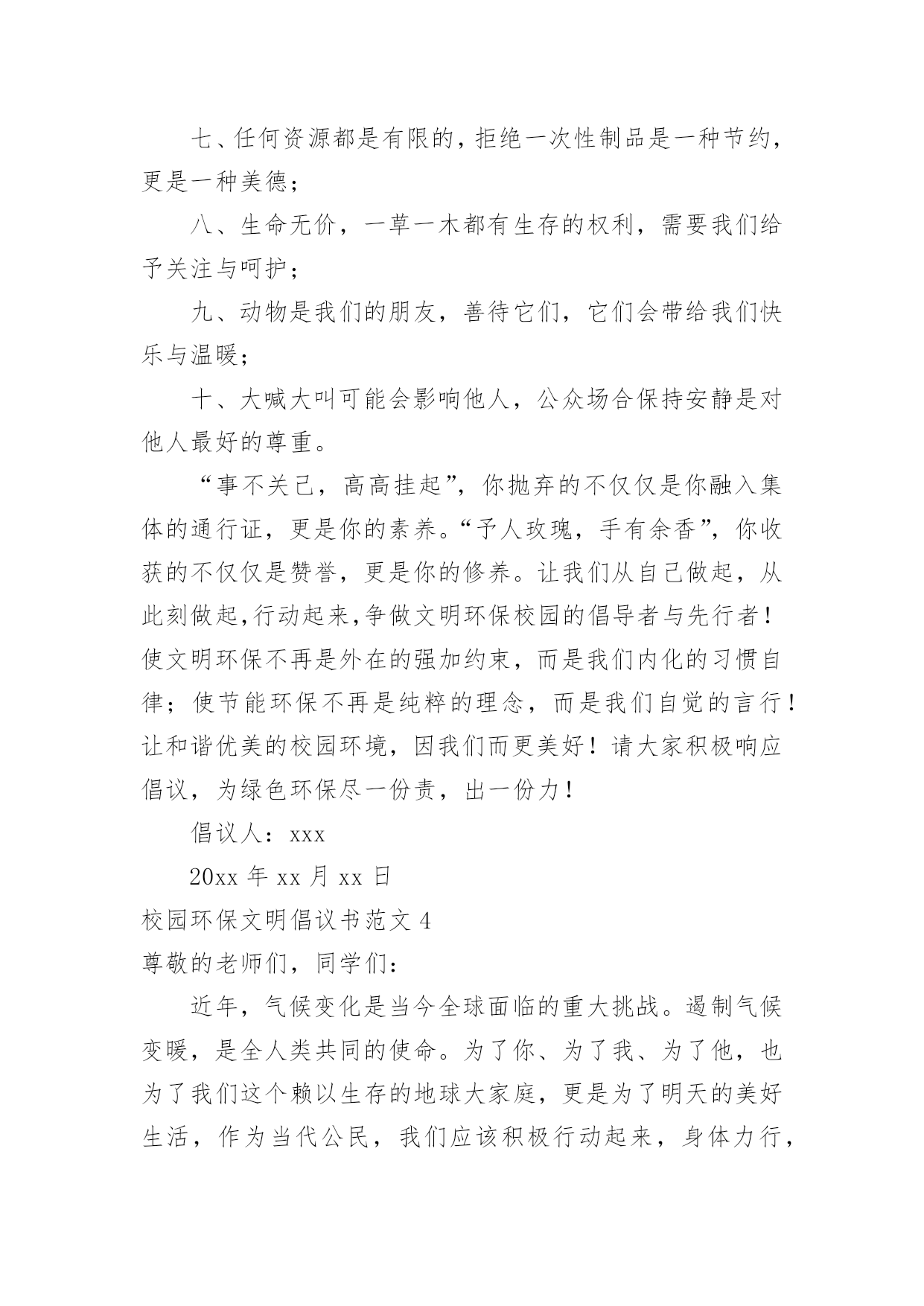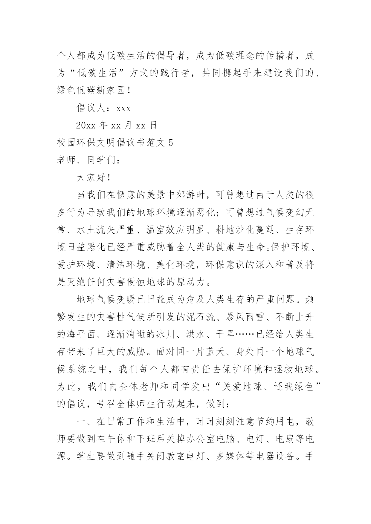 校园环保文明倡议书校园环保文明倡议书范文在学习、工作生活中,能够利用到倡议书的场合越来越多,倡议书作为一种公开提议性的专用书信,其在写作上有一定的规范。相信许多人会觉得倡议书很难写吧,下面是小编帮大家整理的校园环保文明倡议书范文,欢迎阅读与收藏。校园环保文明倡议书范文1亲爱的老师们、同学们:你们好!阳光明媚,空气清新,鸟语花香是我们梦寐以求的校园环境,每个人都希望在一个清洁、舒适的环境中学习生活,健康成长。多年来,我校一直倡导绿色文明,营造人文和谐的育人环境。但是,肆意浪费,乱扔乱倒,不文明就餐等现象却时常出现在同学们身边。再过几天,就是建国xx周年大庆。为创造优美整洁的育人环境,减少疾病发生,以全新的面貌、崭新的`姿态迎接国庆的到来,我校少先队大队部成立了一支“校园环保小卫队”,他们发扬不怕苦、不怕累、不怕脏的优良传统,用实际行动维护着校园环境卫生,唱响了校园“和谐音符”。今天,特向全校师生发出以下倡议:1、争做文明人,养成讲卫生的好习惯。不随地吐痰,不乱扔垃圾,主动清理地面和墙壁上的污垢;不带外面购买的食物和一次性餐盒进入学校,不乱丢手中的塑料包装袋;午餐后,及时打扫就餐区环境卫生;尽量少用或不用一次性塑料用品。2、以节水、节电、节粮为荣,随手关紧水龙头,节省每一度电,珍惜每一粒粮食。3、主动捡拾丢在地上的垃圾。养成“文明清洁”的良好习惯,共同创建一个美丽的校园。4、爱护公物,不在桌椅、墙体上乱涂乱画,爱护校园内的一草一木。5、坚持每天清扫教室和室外清洁。6、人人都是环保卫士,做绿色宣传员,看见不文明现象及时劝说和制止。美丽的环境需要大家共同营造,文明的习惯靠平时一点一滴地养成。在此,“校园环保小卫队”向大家郑重承诺,他们会多一些责任感,多弯一下腰,多伸一次手,充分发扬不怕苦、不怕累、不怕脏的优良传统,创造一个美好的学习、生活环境,为建国xx周年献礼!敬爱的老师、亲爱的同学们,让我们用真挚的热情传播环保理念,用切实的行动肩负起环保重任。爱祖国从自己做起!从身边的小事做起!倡议人:xxx20xx年xx月xx日校园环保文明倡议书范文2亲爱的朋友:近年来,全球气候变幻无常、水土流失严重、温室效应明显、耕地沙化蔓延、生存环境日益恶化,严重威胁着全人类的健康与生命。我们青年志愿者一直注重环保节能,倡导绿色健康的“低碳新生活”。我们愿与您一起追求低碳新生活,大家一起来行动吧!为了你、为了我、为了他、也为了我们这个赖以生存的地球大家庭,更是为了明天的美好生活。让我们一起从节约“一滴水、一度电、一张纸”做起,共同做到:衣:根据天气变化,选择适宜的衣服,尽量减少空调的使用频次。同时选择环保面料并减少洗涤,尽量选择手洗。食:尽量购买本地食品,减少食物加工及流通过程,可以减少二氧化碳的`排放。使用少油、少盐、少加工的烹饪方法,健康的不仅是自己,还有我们赖以生存的地球。住:住房面积不必一味求大,理智选择适合自己的户型。因为住房面积的减少可以降低水、电的用量,这在无形之中减少了二氧化碳的排放量。用:洗菜水、洗澡水循环利用、房间照明选择节能灯、购物使用环保袋、纸张双面打印、不使用一次性餐具、尽量购买包装简单的产品等等,既减少生产中消耗的能量,也减少了垃圾。行:提倡多步行、多骑自行车、多乘公共交通工具。汽车是二氧化碳的排放大户,有需要购买汽车的话、应尽量选择低油耗、更环保的汽车。不积跬步,不以至千里;不积小流,无以成江海。希望通过我们的努力,把“低碳生活”的概念传递给每一个家庭。倡议人:xxx20xx年xx月xx日校园环保文明倡议书范文3尊敬的老师、亲爱的同学:大家好!方方寸绿地,滋润人心。美丽校园,福泽大家!当我们在绿树成荫的校园中漫步时,一定会心旷神怡;当我们在窗明几净的教室中读书时,一定会全神贯注;当我们在整洁优雅的环境中生活时,一定会身心愉悦。为了我们的学习更舒心,生活更惬意,校园更和谐,我们特向全体师生发出如下倡议:一、看到水龙头在滴水时,伸出你的手,莫让水空流;二、随手关灯,光明常在,省一度电,少一分污染,多一分贡献;三、按需取食,你不以为意倒掉的饭菜正是那些挨饿孩子所渴望的`;四、定点用餐,一个人吃的不叫饭,大家一起吃才有气氛;五、每一页纸张都是大自然生命的馈赠,浪费纸张等于谋“材”害命;六、环卫工人会为你的乱吐乱倒付出更多的汗水与辛劳;七、任何资源都是有限的,拒绝一次性制品是一种节约,更是一种美德;八、生命无价,一草一木都有生存的权利,需要我们给予关注与呵护;九、动物是我们的朋友,善待它们,它们会带给我们快乐与温暖;十、大喊大叫可能会影响他人,公众场合保持安静是对他人最好的尊重。“事不关己,高高挂起”,你抛弃的不仅仅是你融入集体的通行证,更是你的素养。“予人玫瑰,手有余香”,你收获的不仅仅是赞誉,更是你的修养。让我们从自己做起,从此
