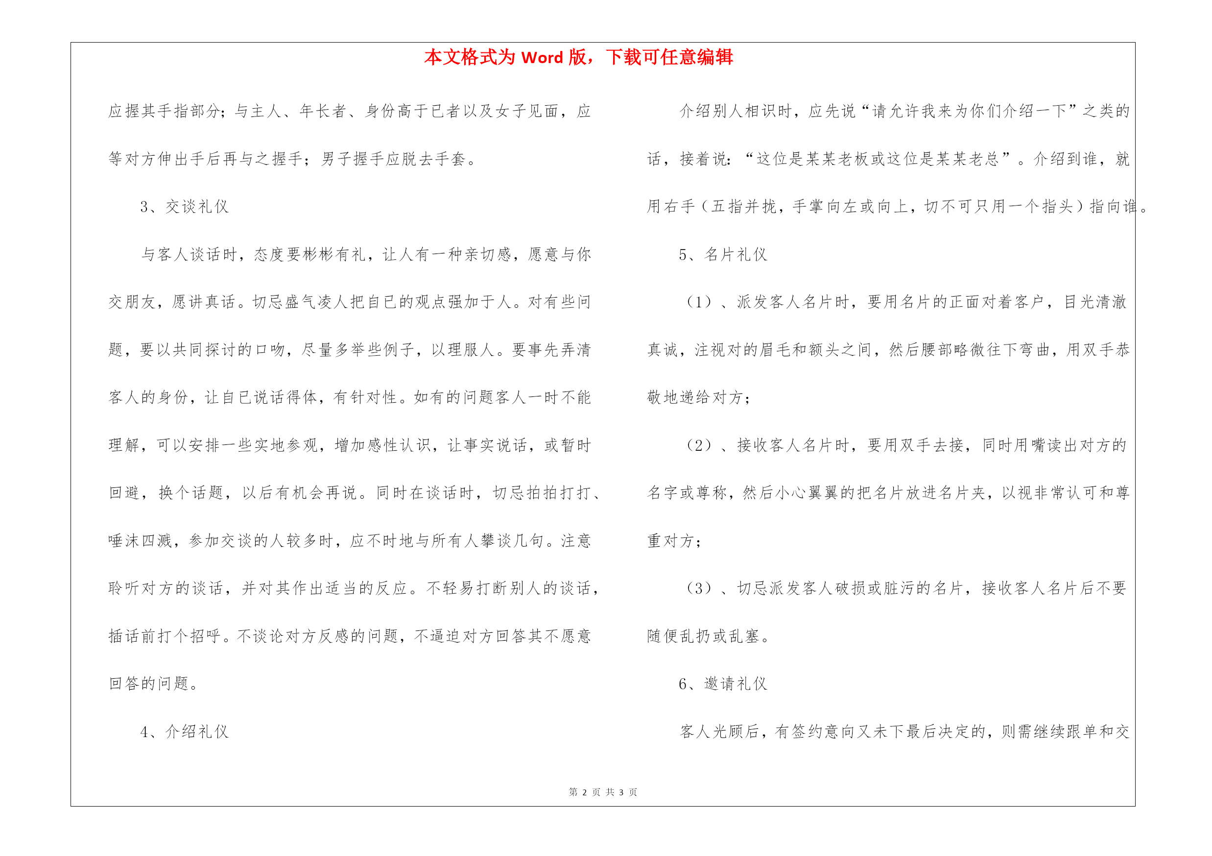 本文格式为Word版,下载可任意编辑第PAGE\*MERGEFORMAT3页共NUMPAGES\*MERGEFORMAT3页员工培训讲义:业务运作礼仪_礼仪文书(主讲人:王志武)(一)、业务基本常识:1、线路业务:(1)、一条线路原则上1000元/条,某一地区,沿途经过数市数县,在本公司未签约给其他线路前,允许其上下经过沿途市县的乘客,如果签约相应市县线路,则不允许其乘载相关市县的旅客;(2)、合同一年一签,押金5000元/条,加租视续约时的行情而定;(3)、有适当的装修期或筹备期,由运营监视具体情况而定。2、铺位业务;(1)、一楼为各行业型商铺,均价在13---20元/每平方米不等,管理费2元/每平方米;二、三、三楼主要规划作酒店、宾馆、住宿、写字楼等,均价在8元/每平方米---12元/每平方米不等。(2)、合同两年一签,付租方式二押一租,加租视续约时具体行情而定,原则上在原有价位上递增10%--15%之间。(3)、装修期或免租期在2---5个月,由运营总监视具体情况而定。(二)业务基本礼仪1、服饰礼仪服装穿着要朴素、大方、合乎时令的服装;仪容仪表要整洁、端庄,男士要适时理发,胡须要刮净,指甲要修剪,内外衣要经常保持整洁,女士活动前要梳理打扮,保持外貌整洁美观。2、握手礼仪握手要用右手,应双目注视对方,微笑致意;一般不应用力;与众人握手,一般应按从近(身边)到远的顺序一一分别进行,既不应挑跳,也不应同时握着两个人的手,与年长于已或身份高于已者握手,应稍稍欠身,用双手握住对方的手,以示尊敬;与女子握手,一般只应握其手指部分;与主人、年长者、身份高于已者以及女子见面,应等对方伸出手后再与之握手;男子握手应脱去手套。3、交谈礼仪与客人谈话时,态度要彬彬有礼,让人有一种亲切感,愿意与你交朋友,愿讲真话。切忌盛气凌人把自已的观点强加于人。对有些问题,要以共同探讨的口吻,尽量多举些例子,以理服人。要事先弄清客人的身份,让自已说话得体,有针对性。如有的问题客人一时不能理解,可以安排一些实地参观,增加感性认识,让事实说话,或暂时回避,换个话题,以后有机会再说。同时在谈话时,切忌拍拍打打、唾沫四溅,参加交谈的人较多时,应不时地与所有人攀谈几句。注意聆听对方的谈话,并对其作出适当的反应。不轻易打断别人的谈话,插话前打个招呼。不谈论对方反感的问题,不逼迫对方回答其不愿意回答的问题。4、介绍礼仪介绍别人相识时,应先说“请允许我来为你们介绍一下”之类的话,接着说:“这位是某某老板或这位是某某老总”。介绍到谁,就用右手(五指并拢,手掌向左或向上,切不可只用一个指头)指向谁。5、名片礼仪(1)、派发客人名片时,要用名片的正面对着客户,目光清澈真诚,注视对的眉毛和额头之间,然后腰部略微往下弯曲,用双手恭敬地递给对方;(2)、接收客人名片时,要用双手去接,同时用嘴读出对方的名字或尊称,然后小心翼翼的把名片放进名片夹,以视非常认可和尊重对方;(3)、切忌派发客人破损或脏污的名片,接收客人名片后不要随便乱扔或乱塞。6、邀请礼仪客人光顾后,有签约意向又未下最后决定的,则需继续跟单和交流,因而需要发出邀请再次详谈,邀请时以示礼貌和尊重,应注意如下礼仪:(1)提前发出邀请信息或邀请电话,使被邀对象有所准备,以及有时间安排好自已的其他活动;(2)、邀请信息或电话不宜发得太早,过早会使有的人感到为难,因为有的人可能由于某种原因不愿接受邀请,而需要心已有安排为借口加认拒绝。7、招待礼仪此为接待上门的客人时应当讲求的表示尊重的形式。包括以下方面:(1)、不要让客人在门外久等,应尽快热情地迎入会客间,给他让座、泡茶等;(2)、一同来访的客人如较多,应按顺序接待,不能先接待其中你熟悉的客人;(3)、正确联络来客与被访者,不要搞错联络对象,也不能传错来客的意图;(4)、在来访者较多、交谈必须分别进行的情况下,要掌握好交谈时间,不要让其他客人久等,如不得不要客人久等时,一要先征询客人的意见,二要为他们准备好座位、茶水、报刊等。8、迎送礼仪迎送应按客人的身份及来访目的规定规格,主要迎送人要同来宾的身份相当,如与来宾身份相当的人因故不能出面,代行人应向对方作出解释。9、通话礼仪打电话或接电话时应当讲求的表示礼貌和尊重的形式。包括:(1)、拿起话筒时,先说“您好”再回答或继续往下说;(2)、要仔细聆听对方的讲话,并不时地用“嗯”、“对”、“是”等给对方以积极的反馈;,当前12