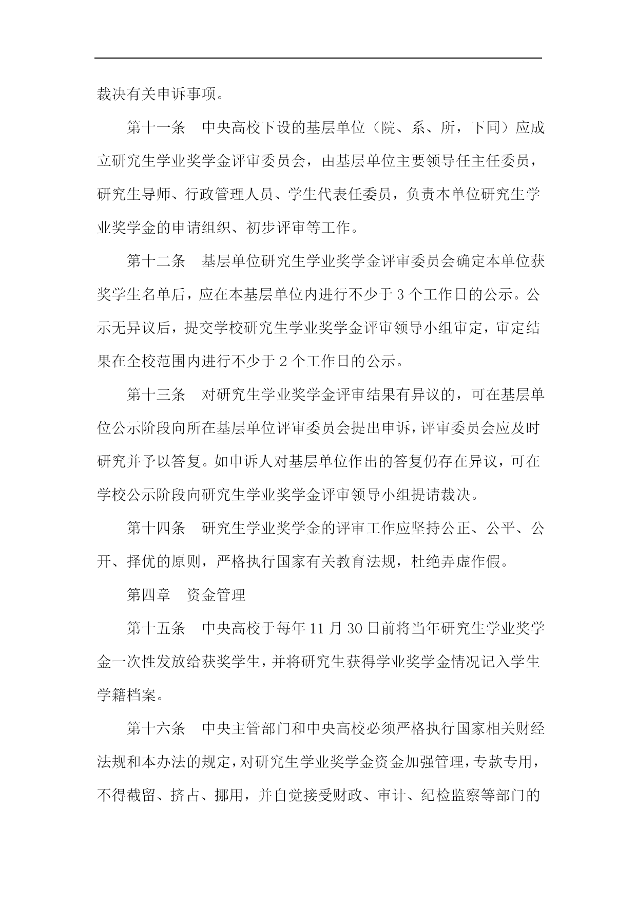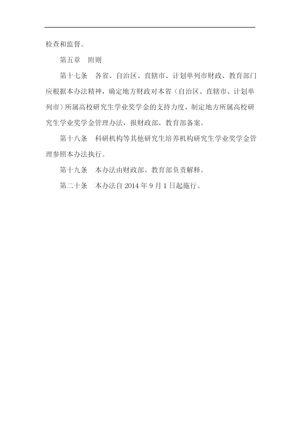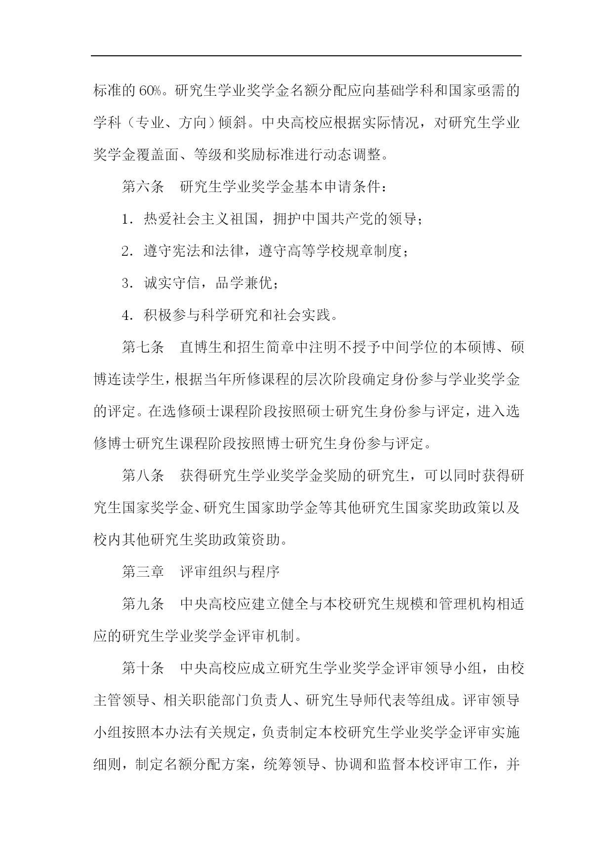 研究生学业奖学金管理暂行办法第一章总则第一条为激励研究生勤奋学习、潜心科研、勇于创新、积极进取,在全面实行研究生教育收费制度的情况下更好地支持研究生顺利完成学业,根据《财政部国家发展改革委教育部关于完善研究生教育投入机制的意见》(财教〔2013〕19号)精神,从2014年秋季学期起,设立研究生学业奖学金。为做好中央部门所属普通高等学校(以下简称中央高校)研究生学业奖学金工作,特制定本办法。第二条本办法所称研究生是指中央高校纳入全国研究生招生计划的全日制研究生。获得奖励的研究生须具有中华人民共和国国籍。第三条中央高校研究生学业奖学金由中央高校负责组织实施。中央高校应按规定统筹利用财政拨款、学费收入、社会捐助等,奖励支持表现良好的研究生更好地完成学业。第四条从2014年秋季学期起,中央财政对中央高校研究生学业奖学金所需资金,按照博士研究生每生每年10000元、硕士研究生每生每年8000元的标准以及在校生人数的一定比例给予支持,所需资金按照预算管理程序列入年度部门预算。第二章奖励比例、标准与基本条件第五条中央高校根据研究生收费标准、学业成绩、科研成果、社会服务以及家庭经济状况等因素,确定研究生学业奖学金的覆盖面、等级、奖励标准和评定办法(可分档设定奖励标准),报财政部、教育部备案。研究生学业奖学金标准不得超过同阶段研究生国家奖学金标准的60%。研究生学业奖学金名额分配应向基础学科和国家亟需的学科(专业、方向)倾斜。中央高校应根据实际情况,对研究生学业奖学金覆盖面、等级和奖励标准进行动态调整。第六条研究生学业奖学金基本申请条件:1.热爱社会主义祖国,拥护中国共产党的领导;2.遵守宪法和法律,遵守高等学校规章制度;3.诚实守信,品学兼优;4.积极参与科学研究和社会实践。第七条直博生和招生简章中注明不授予中间学位的本硕博、硕博连读学生,根据当年所修课程的层次阶段确定身份参与学业奖学金的评定。在选修硕士课程阶段按照硕士研究生身份参与评定,进入选修博士研究生课程阶段按照博士研究生身份参与评定。第八条获得研究生学业奖学金奖励的研究生,可以同时获得研究生国家奖学金、研究生国家助学金等其他研究生国家奖助政策以及校内其他研究生奖助政策资助。第三章评审组织与程序第九条中央高校应建立健全与本校研究生规模和管理机构相适应的研究生学业奖学金评审机制。第十条中央高校应成立研究生学业奖学金评审领导小组,由校主管领导、相关职能部门负责人、研究生导师代表等组成。评审领导小组按照本办法有关规定,负责制定本校研究生学业奖学金评审实施细则,制定名额分配方案,统筹领导、协调和监督本校评审工作,并裁决有关申诉事项。第十一条中央高校下设的基层单位(院、系、所,下同)应成立研究生学业奖学金评审委员会,由基层单位主要领导任主任委员,研究生导师、行政管理人员、学生代表任委员,负责本单位研究生学业奖学金的申请组织、初步评审等工作。第十二条基层单位研究生学业奖学金评审委员会确定本单位获奖学生名单后,应在本基层单位内进行不少于3个工作日的公示。公示无异议后,提交学校研究生学业奖学金评审领导小组审定,审定结果在全校范围内进行不少于2个工作日的公示。第十三条对研究生学业奖学金评审结果有异议的,可在基层单位公示阶段向所在基层单位评审委员会提出申诉,评审委员会应及时研究并予以答复。如申诉人对基层单位作出的答复仍存在异议,可在学校公示阶段向研究生学业奖学金评审领导小组提请裁决。第十四条研究生学业奖学金的评审工作应坚持公正、公平、公开、择优的原则,严格执行国家有关教育法规,杜绝弄虚作假。第四章资金管理第十五条中央高校于每年11月30日前将当年研究生学业奖学金一次性发放给获奖学生,并将研究生获得学业奖学金情况记入学生学籍档案。第十六条中央主管部门和中央高校必须严格执行国家相关财经法规和本办法的规定,对研究生学业奖学金资金加强管理,专款专用,不得截留、挤占、挪用,并自觉接受财政、审计、纪检监察等部门的检查和监督。第五章附则第十七条各省、自治区、直辖市、计划单列市财政、教育部门应根据本办法精神,确定地方财政对本省(自治区、直辖市、计划单列市)所属高校研究生学业奖学金的支持力度,制定地方所属高校研究生学业奖学金管理办法,报财政部、教育部备案。第十八条科研机构等其他研究生培养机构研究生学业奖学金管理参照本办法执行。第十九条本办法由财政部、教育部负责解释。第二十条本办法自2014年9月1日起施行。