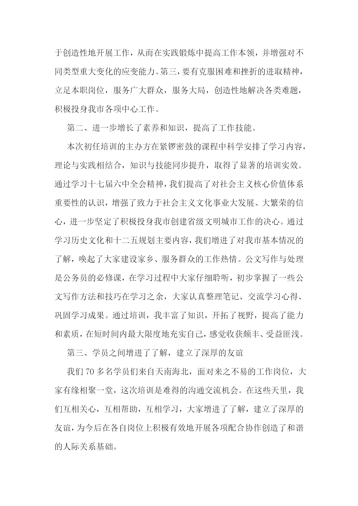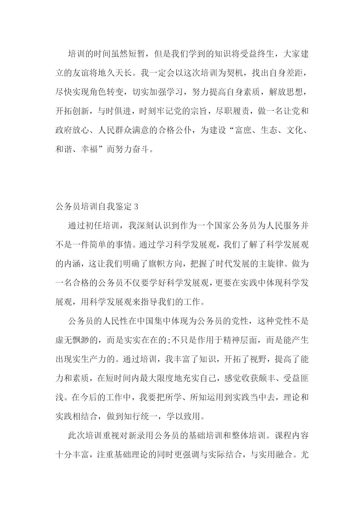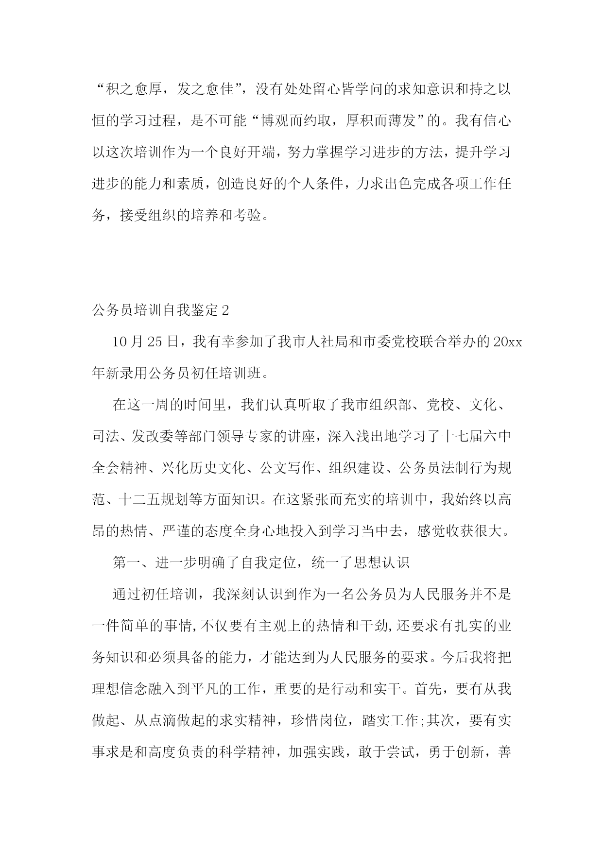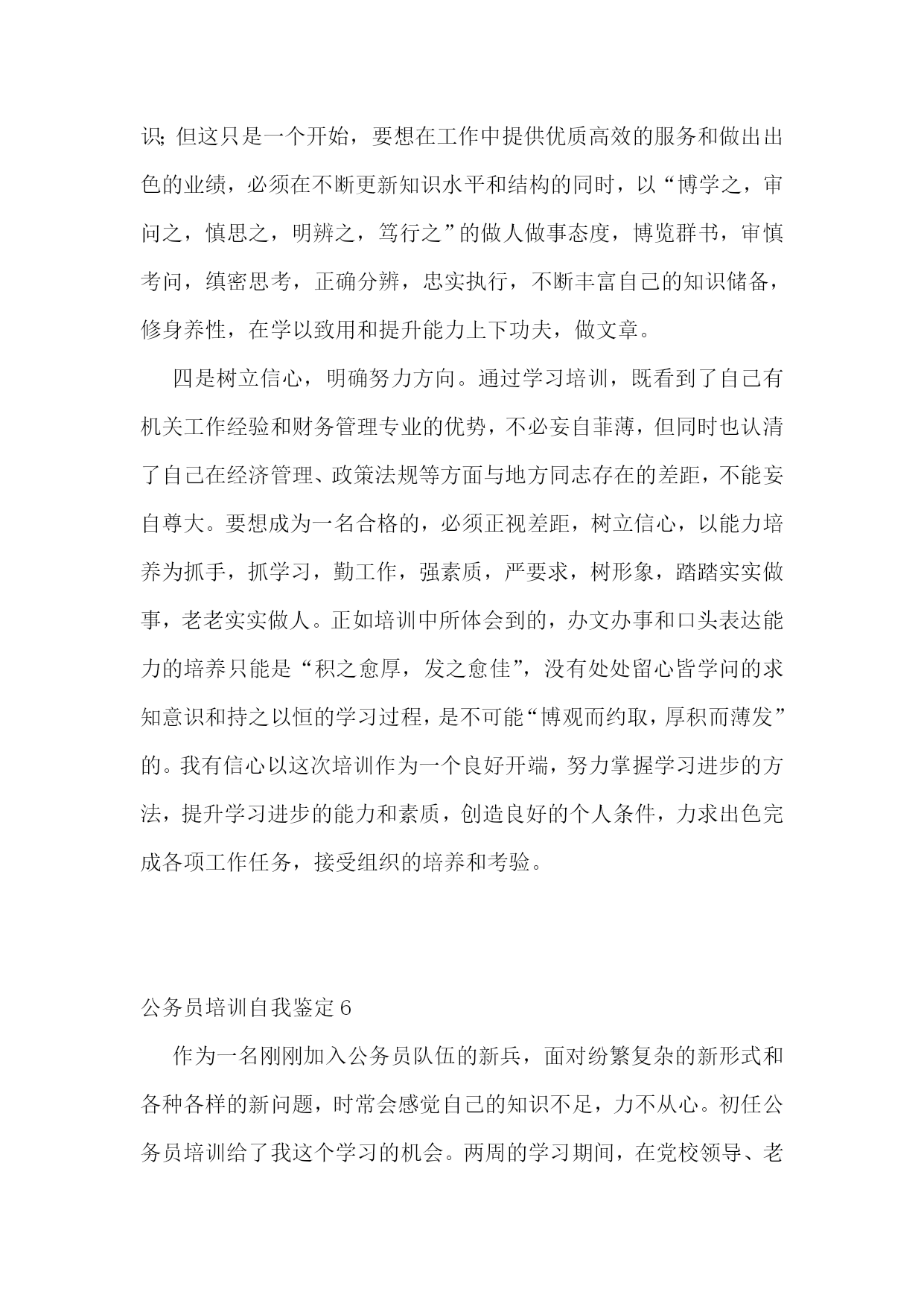 公务员培训自我鉴定(合集6篇)公务员培训自我鉴定1五十三天的军队转业干部初任公务员培训,让我迈开了转变角色,调整心态,提升能力,争做一名合格公务员的步伐。给这五十三天的学习培训作一个自我鉴定,主要有以下四点体会。一是态度端正,学习认真刻苦。我深知知识的“折旧”让学历只能代表过去,军转干部要从抓部队建设和管理,转变到参与地方经济建设,成为服务型政府中的一名合格公务员,参加此类以适应性训练、公共行政能力、电子政务为主要内容的培训非常必要,同时也是为自己的素质训练经历又添上了浓墨重彩的一笔。因而,自己在学习过程中,始终做到认真对待每一门课程,仔细听讲,做好笔记,积极消化吸收。牢记记忆最好的方法是专心和重复这一法则,定期回顾、复习所学内容,下载讲课课件进行整理归类,加深印象,寻找新的体会和感悟。二是仔细揣摩,学习卓有成效。五十多天的培训,既有讲语言艺术和心理调试,又有讲政策法规和电子政务,还有讲宏观经济和微观管理,使我收获颇丰。从机关工作语言一课中我体会到了中国特色的竞争上岗艺术—说我行!不说别人不行,尽可能利用一切机会展示自己;从社会角色转换中的心理调试一课中,我明白了如何保持一颗自信心、上进心和平常心,正确面对角色、岗位、职务和地位的转换;《公共行政》、《依法行政》和《公共政策》等课程的学习,让我掌握了政府职能、法治政府、行政程序和政策执行等公务员应具备的基本知识,提高了依法依规履行职责的能力,为日后做一名合格公务员奠定了扎实的基础。三是学以致用,提升行政能力。依法依规用权,服务人民,这是对一名公务员最起码的要求。此次培训,结合实际案例,对一次性告知、相同行为平等对待、一事不再罚等一系列公务员基本工作要求有了更深刻的认识;但这只是一个开始,要想在工作中提供优质高效的服务和做出出色的业绩,必须在不断更新知识水平和结构的同时,以“博学之,审问之,慎思之,明辨之,笃行之”的做人做事态度,博览群书,审慎考问,缜密思考,正确分辨,忠实执行,不断丰富自己的知识储备,修身养性,在学以致用和提升能力上下功夫,做文章。四是树立信心,明确努力方向。通过学习培训,既看到了自己有机关工作经验和财务管理专业的优势,不必妄自菲薄,但同时也认清了自己在经济管理、政策法规等方面与地方同志存在的差距,不能妄自尊大。要想成为一名合格的公务员,必须正视差距,树立信心,以能力培养为抓手,抓学习,勤工作,强素质,严要求,树形象,踏踏实实做事,老老实实做人。正如培训中所体会到的,公务员办文办事和口头表达能力的培养只能是“积之愈厚,发之愈佳”,没有处处留心皆学问的求知意识和持之以恒的学习过程,是不可能“博观而约取,厚积而薄发”的。我有信心以这次培训作为一个良好开端,努力掌握学习进步的方法,提升学习进步的能力和素质,创造良好的个人条件,力求出色完成各项工作任务,接受组织的培养和考验。公务员培训自我鉴定210月25日,我有幸参加了我市人社局和市委党校联合举办的20xx年新录用公务员初任培训班。在这一周的时间里,我们认真听取了我市组织部、党校、文化、司法、发改委等部门领导专家的讲座,深入浅出地学习了十七届六中全会精神、兴化历史文化、公文写作、组织建设、公务员法制行为规范、十二五规划等方面知识。在这紧张而充实的培训中,我始终以高昂的热情、严谨的态度全身心地投入到学习当中去,感觉收获很大。第一、进一步明确了自我定位,统一了思想认识通过初任培训,我深刻认识到作为一名公务员为人民服务并不是一件简单的事情,不仅要有主观上的热情和干劲,还要求有扎实的业务知识和必须具备的能力,才能达到为人民服务的要求。今后我将把理想信念融入到平凡的工作,重要的是行动和实干。首先,要有从我做起、从点滴做起的求实精神,珍惜岗位,踏实工作;其次,要有实事求是和高度负责的科学精神,加强实践,敢于尝试,勇于创新,善于创造性地开展工作,从而在实践锻炼中提高工作本领,并增强对不同类型重大变化的应变能力。第三,要有克服困难和挫折的进取精神,立足本职岗位,服务广大群众,服务大局,创造性地解决各类难题,积极投身我市各项中心工作。第二、进一步增长了素养和知识,提高了工作技能。本次初任培训的主办方在紧锣密鼓的课程中科学安排了学习内容,理论与实践相结合,知识与技能同步提升,取得了显著的培训实效。通过学习十七届六中全会精神,我们提高了对社会主义核心价值体系重要性的认识,增强了致力于社会主义文化事业大发展、大繁荣的信心,进一步坚定了积极投身我市创建省级文明城市工作的决心。通过学习历史文化和十二五规划主要内容,我们增进了对我市基本情况的了解,唤起了大家建设家乡、服务群众的工作热情。公文写作与处理是公务员的必修课,在学习过程中大家仔细聆听,初步掌握了一些公文写作方法和技巧在学习之余,大家认真整理笔记