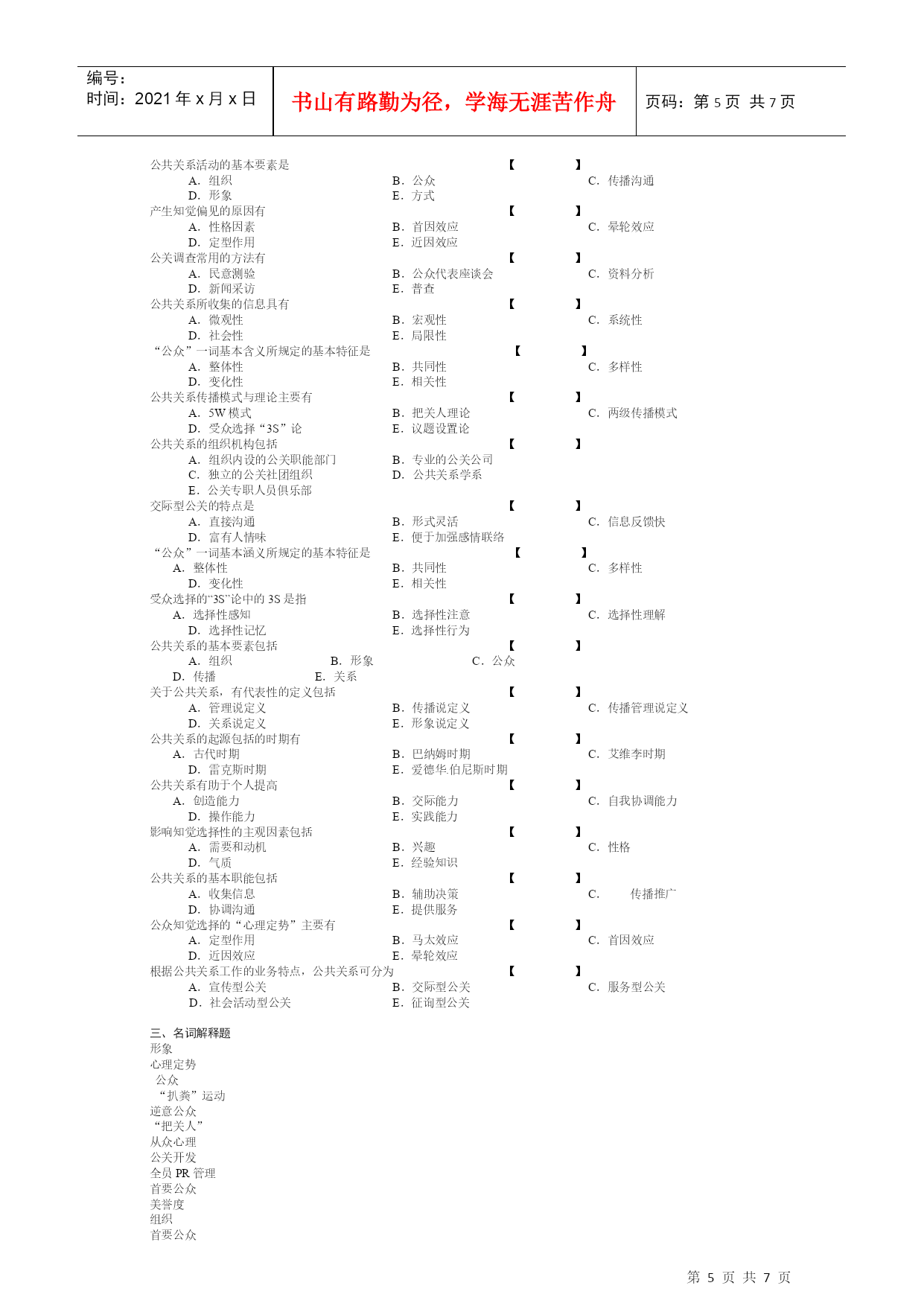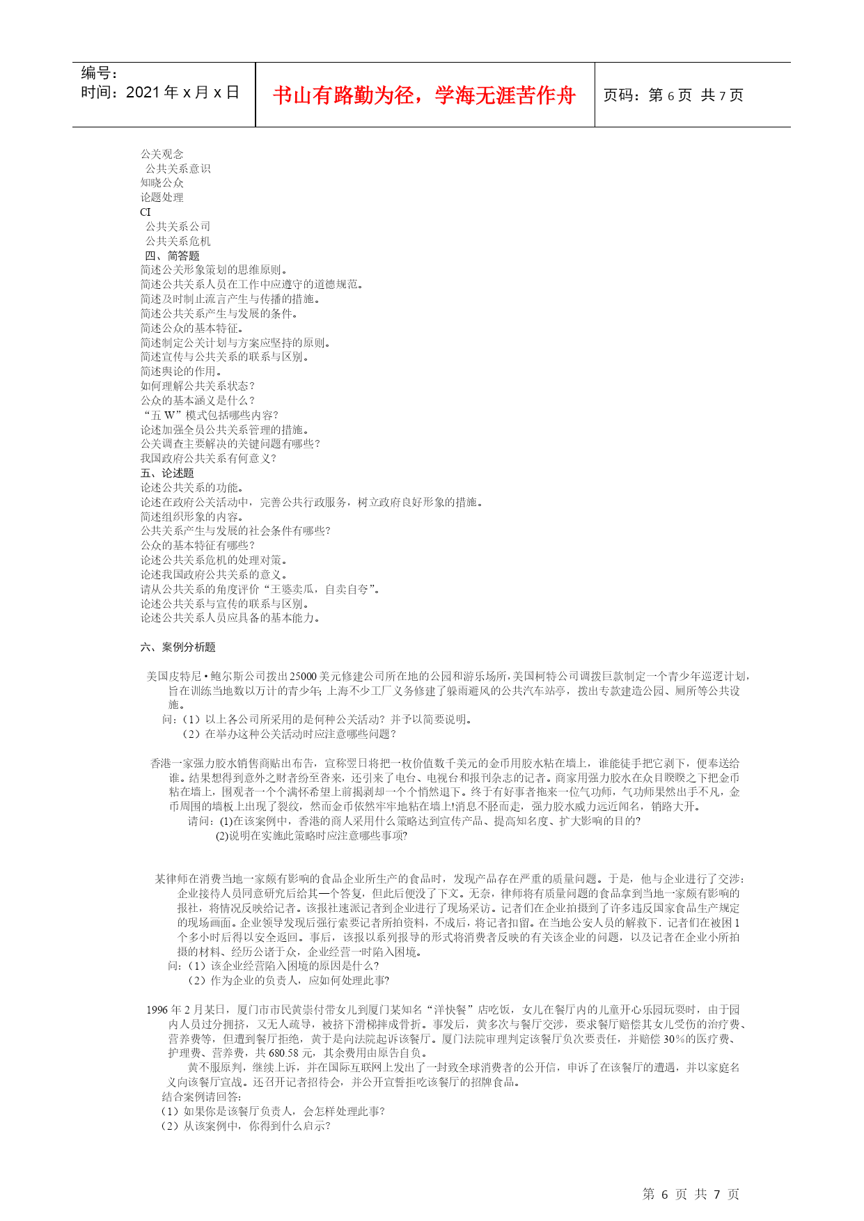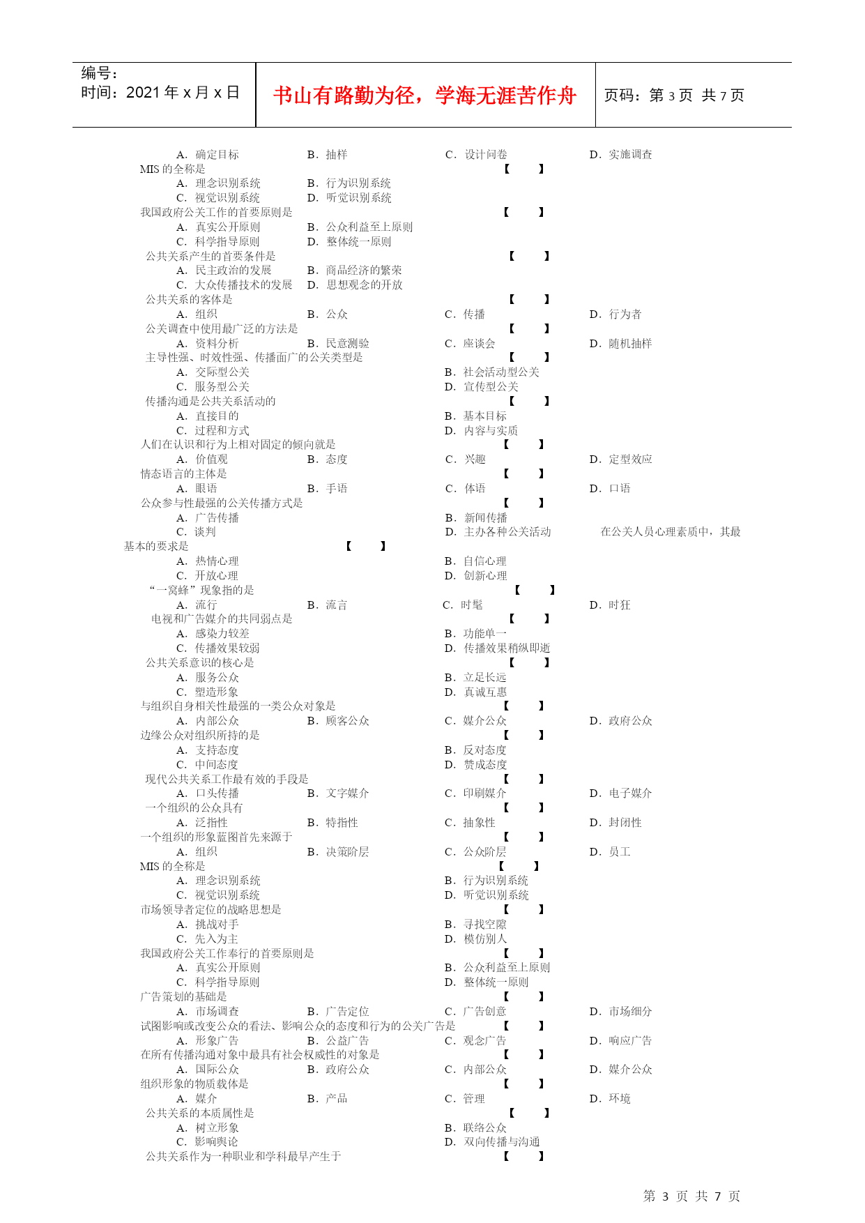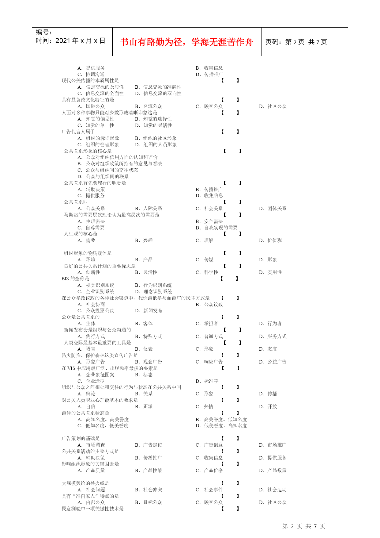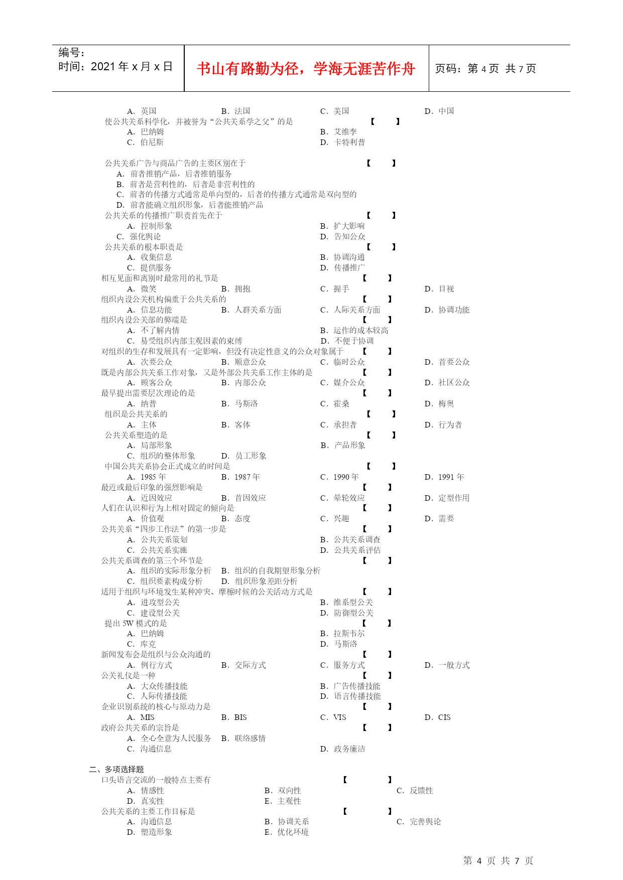编号:时间:2021年x月x日书山有路勤为径,学海无涯苦作舟页码:第PAGE7页共NUMPAGES7页第PAGE\*MERGEFORMAT7页共NUMPAGES\*MERGEFORMAT7页HYPERLINK"xxxx/"公共关系学复习题0一八2(0803)一、单项选择题公共关系管理过程中客观方面的因素【】A.环境因素系列B.主观因素系列C.客观因素系列D.技术因素系列最合乎道德的公共关系方式是【】A.新闻代理模式B.公共信息模式C.双向不平衡模式D.双向平衡模式公关调查的对象是【】A.公关人员B.公众C.媒介D.组织人员公共关系广告的重要作用是【】A.推销产品B.推销商品C.推销服务D.推销组织的形象组织形象的客观基础是【】A.产品质量B.产品形象C.服务态度D.服务质量公共关系意识的核心是【】A.服务公众的意识B.真诚互惠的意识C.立足长远的意识D.塑造形象的意识首次提出心理感应抗拒理论的是【】A.马斯洛B.阿什C.布林D.霍夫兰组织最活跃的形象载体是【】A.产品B.广告C.人员D.标语公关活动的基础是【】A.公关策划B.制定方案C.公关调查D.实施方案公关礼仪是一种【】A.大众传播技能B.广告传播技能C.人际传播技能D.语言传播技能公共关系的本质属性是【】A.联络公众B.树立形象C.影响舆论D.双向传播与沟通被后人誉为最早问世的公共关系学的理论著作《修辞学》的作者是【】A.儒略·凯撒B.亚里士多德C.柏拉图D.孔子公共关系工作的生命线是【】A.公平B.负责C.正统D.真实知觉产生的基础是【】A.兴趣B.动机C.爱好D.感觉所有流行项目的最显著的特征是【】A.新奇性B.周期性C.短暂性D.长久性政府公共关系的宗旨是【】A.全心全意为人民服务B.联络感情C.沟通信息D.政务廉洁现代公共关系业的前身是【】A.“扒粪运动”B.“揭丑运动”C.“清垃圾运动”D.“报刊宣传活动公共关系对于优化社会环境的作用具体体现在【】A.优化社会互动环境B.优化社会经济环境C.优化社会心理环境D.优化社会互动环境和心理环境反映人们某种需求的流言是【】A.愿望流言B.恐怖流言C.攻击流言D.进攻流言具有“准自家人”特点的是【】A.内部公众B.目标公众C.顾客公众D.社区公众最佳的公共关系状态是【】A.高知名度、高美誉度B.低知名度、低美誉度C.高知名度、低美誉度D.低知名度、高美誉度公共关系的根本职责是【】A.提供服务B.收集信息C.协调沟通D.传播推广现代公关传播的本质属性是【】A.信息交流的及时性B.信息交流的准确性C.信息交流的全面性D.信息交流的双向性具有显著跨文化特征的是【】A.国际公众B.名流公众C.顾客公众D.社区公众人面对多种事物只能对少数形成清晰印象这是【】A.知觉的偏见性B.知觉的选择性C.知觉的单一性D.知觉的灵活性广告代言人属于【】A.组织的标识形象B.组织的社区形象C.组织的管理形象D.组织的人员形象公共关系形象的核心是【】A.公众对组织信用方面的认知和评价B.公众对组织政策所持有的意见与看法C.公众与组织间的交往状态D.公众与组织间的联系公共关系首先要履行的职责是【】A.辅助决策B.传播推广C.提供服务D.收集信息公共关系即【】A.公众关系B.人际关系C.社会关系D.团体关系马斯洛的需要层次理论认为最高层次的需要是【】A.生理需要B.安全需要C.自尊需要D.自我实现的需要人生观的核心是【】A.需要B.兴趣C.理解D.价值观组织形象的物质载体是【】A.环境B.产品C.传媒D.形象良好的公共关系计划的重要标志是【】A.创新性B.灵活性C.科学性D.实用性BIS的全称是【】A.视觉识别系统B.行为识别系统C.企业识别系统D.理念识别系统在公众参政议政的各种社会渠道中,代价最低参与面最广的民主方式是【】A.社会协商B.公众议政C.公众投票公决D.新闻发布公众是公共关系的【】A.主体B.客体C.承担者D.行为者新闻发布会是组织与公众沟通的【】A.例行方式B.特殊方式C.普通方式D.服务方式人类交际最基本最重要的工具是【】A.语言B.仪表C.形象D.态