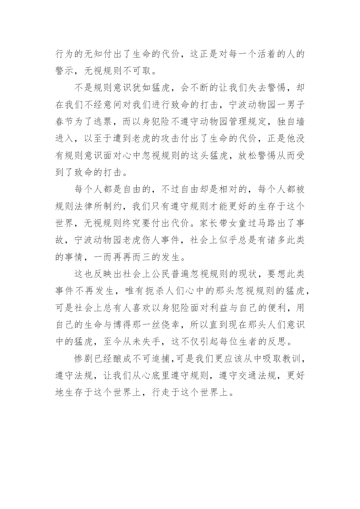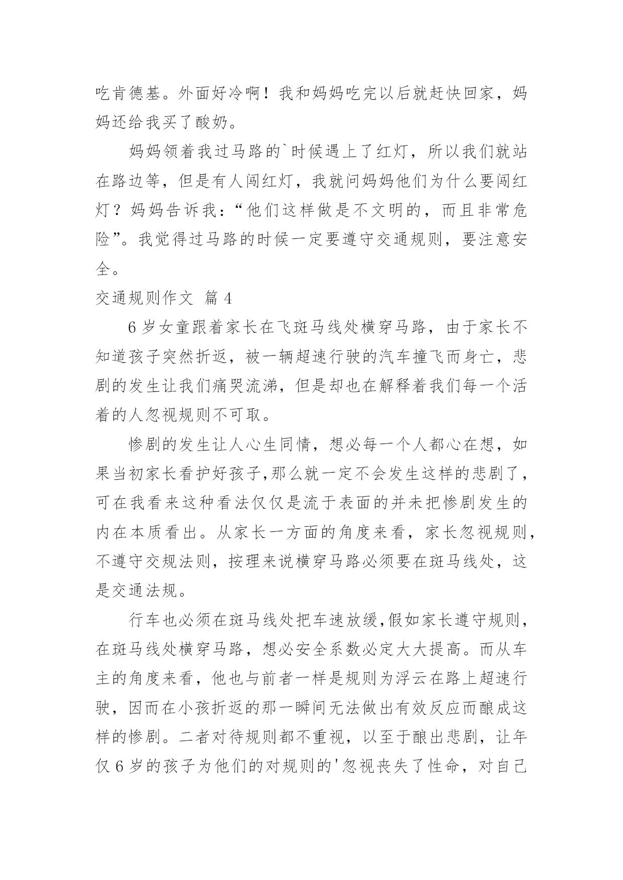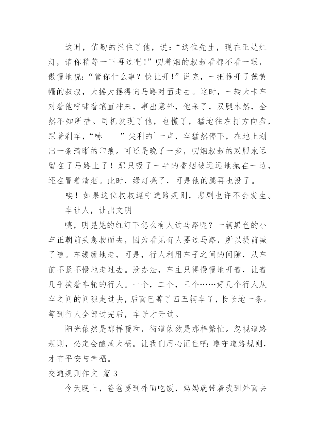 交通规则作文交通规则作文精选(4篇)在现实生活或工作学习中,大家都不可避免地要接触到作文吧,作文是从内部言语向外部言语的过渡,即从经过压缩的简要的、自己能明白的语言,向开展的、具有规范语法结构的、能为他人所理解的外部语言形式的转化。那么你有了解过作文吗?以下是小编为大家整理的交通规则作文4篇,希望对大家有所帮助。交通规则作文篇1话说:没有规矩,不成方圆。你们有没有闯过红绿灯呢?你们知道生命的宝贵吗?现在有很多人,包括小学生,都是因为不遵守交通规则而丧失了宝贵的生命。每当我看到新闻时,都会听到许多关于发生交通事故而死亡的`人,那人们为什么不珍惜自己的生命呢?交通规则作文篇2阳光很暖和,街道很繁忙,车来人往,熙熙攘攘,人们正在享受生活的富足与幸福。但忽视道路规则,却产生几多故事,让人感慨不已,令人深思。从中我们或许可以学到些什么。人让车,让出安全你看!那位叨着烟,满脸络腮胡子的看样子正要过马路。此时红灯似血,晃着人眼。可是他好像不认识这似血的红灯似的,仍然一个劲地向前走。这时,值勤的拦住了他,说:“这位先生,现在正是红灯,请你稍等一下再过吧!”叨着烟的叔叔看都不看一眼,傲慢地说:“管你什么事?快让开!”说完,一把推开了戴黄帽的叔叔,大摇大摆得向马路对面走去。这时,一辆大卡车对着他呼啸着笔直冲来,事出意外,他呆了,双腿木然,全然不知所措。司机发现了他,也慌了,猛地往左打方向盘,踩着刹车,“哧——”尖利的`一声,车猛然停下,在地上划出一条清晰的印痕。可还是晚了一步,叨烟叔叔的双腿永远留在了马路上了!那只吸了一半的香烟被远远地抛在一边,还在冒着清烟。此时,绿灯亮了,可是他的腿再也没了。唉!如果这位叔叔遵守道路规则,悲剧也许不会发生。车让人,让出文明咦,明晃晃的红灯下怎么有人过马路呢?一辆黑色的小车正朝前头急驶而去,因为看见有人要过马路,所以提前减了速。车缓缓地走,可是,行人利用车子之间的间隙,从车前不紧不慢地走过去。没办法,车主只得慢慢地开着,让着几乎挨着车轮的行人。一个,二个,三个……好几个行人从车之间的间隙走过去,后面已等了四五辆车了,长长地一条。等到行人全部过完后,车子才开过。阳光依然是那样暖和,街道依然是那样繁忙。忽视道路规则,必定会酿成大祸。让我们用心记住吧:遵守道路规则,才有平安与幸福。交通规则作文篇3今天晚上,爸爸要到外面吃饭,妈妈就带着我到外面去吃肯德基。外面好冷啊!我和妈妈吃完以后就赶快回家,妈妈还给我买了酸奶。妈妈领着我过马路的`时候遇上了红灯,所以我们就站在路边等,但是有人闯红灯,我就问妈妈他们为什么要闯红灯?妈妈告诉我:“他们这样做是不文明的,而且非常危险”。我觉得过马路的时候一定要遵守交通规则,要注意安全。交通规则作文篇46岁女童跟着家长在飞斑马线处横穿马路,由于家长不知道孩子突然折返,被一辆超速行驶的汽车撞飞而身亡,悲剧的发生让我们痛哭流涕,但是却也在解释着我们每一个活着的人忽视规则不可取。惨剧的发生让人心生同情,想必每一个人都心在想,如果当初家长看护好孩子,那么就一定不会发生这样的悲剧了,可在我看来这种看法仅仅是流于表面的并未把惨剧发生的内在本质看出。从家长一方面的角度来看,家长忽视规则,不遵守交规法则,按理来说横穿马路必须要在斑马线处,这是交通法规。行车也必须在斑马线处把车速放缓,假如家长遵守规则,在斑马线处横穿马路,想必安全系数必定大大提高。而从车主的角度来看,他也与前者一样是规则为浮云在路上超速行驶,因而在小孩折返的那一瞬间无法做出有效反应而酿成这样的惨剧。二者对待规则都不重视,以至于酿出悲剧,让年仅6岁的孩子为他们的对规则的'忽视丧失了性命,对自己行为的无知付出了生命的代价,这正是对每一个活着的人的警示,无视规则不可取。不是规则意识犹如猛虎,会不断的让我们失去警惕,却在我们不经意间对我们进行致命的打击,宁波动物园一男子春节为了逃票,而以身犯险不遵守动物园管理规定,独自墙进入,以至于遭到老虎的攻击付出了生命的代价,正是他没有规则意识面对心中忽视规则的这头猛虎,放松警惕从而受到了致命的打击。每个人都是自由的,不过自由却是相对的,每个人都被规则法律所制约,我们只有遵守规则才能更好的生存于这个世界,无视规则终究要付出代价。家长带女童过马路出了事故,宁波动物园老虎伤人事件,社会上似乎总是有诸多此类的事情,一而再再而三的发生。这也反映出社会上公民普遍忽视规则的现状,要想此类事件不再发生,唯有扼杀人们心中的那头忽视规则的猛虎,可是社会上总有人喜欢以身犯险面对利益与自己的便利,用自己的生命与博得那一丝侥幸,所以直到现在那头人们意识中的猛虎,至今从未失手,这不仅引起每位生者的反思。惨剧已经酿成不可追捕,可是我们更应该从中吸取教训,遵守法规,让我们从心底里遵守规则,遵守交通法规,更好地生存于这个世界上,行走于这个世