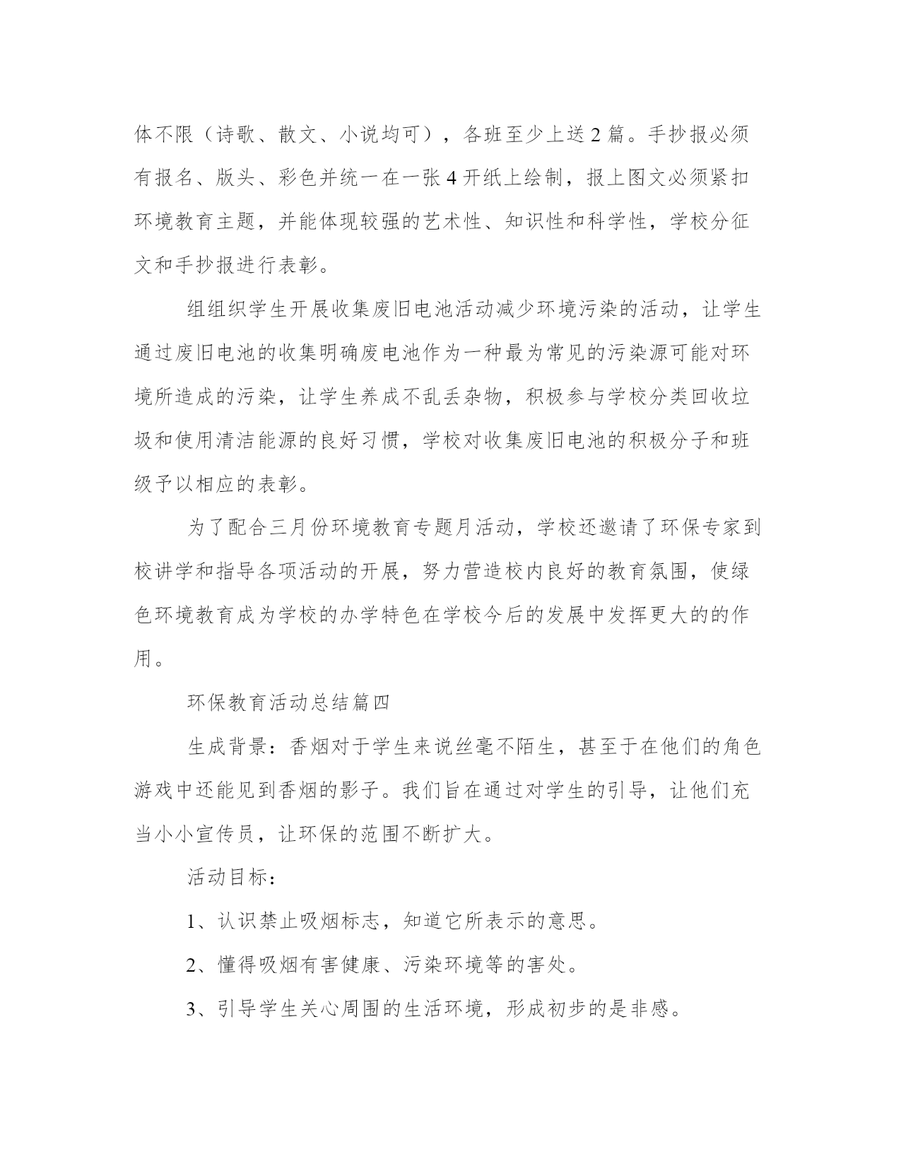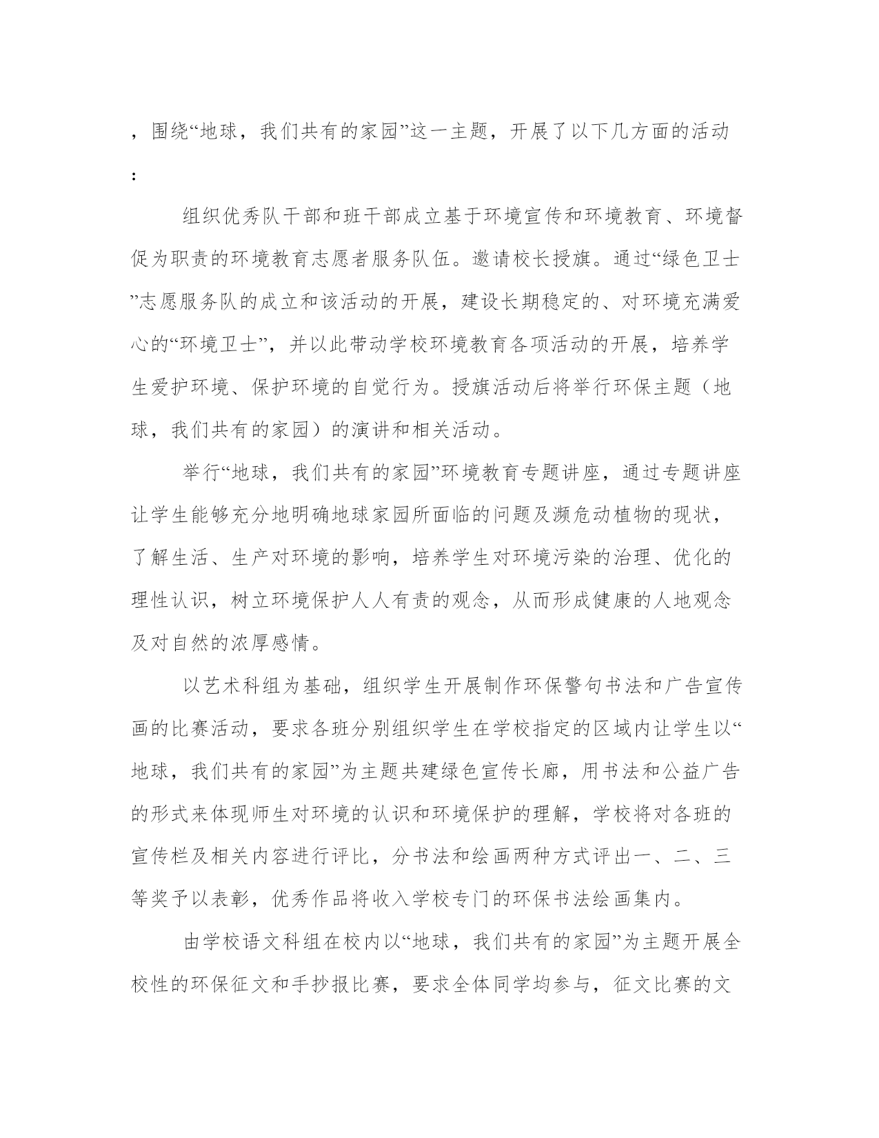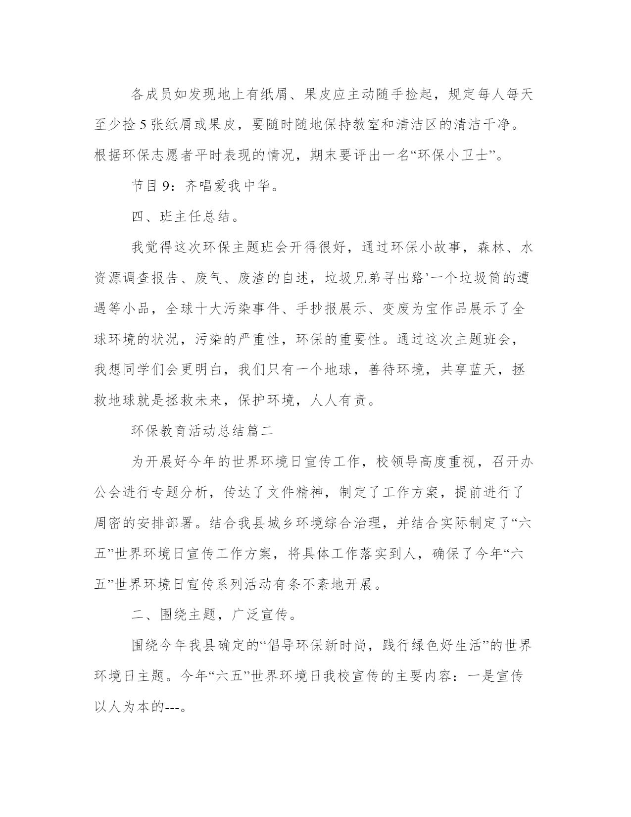 环保教育活动总结大全(16篇)通过总结,我们可以更好地了解自己的优势和弱点,为个人职业规划做出调整。总结的写作中,应注意调整好写作的角度和把握适当的语言风格。以下是小编为大家精心搜集的总结范文,供大家参考和学习。环保教育活动总结篇一班会活动目的:人类生存的自然环境日益恶劣,保护自然环境,维持生态平衡,已是摆在全人类面前的一个重大课题。通过主题班会,使学生清楚地认识到,如果人类的生存环境遭到破坏,最终受害的将是人类。教学过程:一、活动准备:1、选定主持人,分组找材料。2、在教室黑板上书写“善待环境,共享蓝天”,布置教室。二、活动程序。主持人(a):地球是我们赖以生存的`家园,(b)生命在这里繁衍生息,(a)请爱护我们的地球,(b)我们共同生活的环境。主持人(a):地球是我们的母亲,是哺育中华儿女的土地。可谁对知道地球妈妈在向我们呼唤。主持人(b):我们听到了地球妈妈的呼唤,为此召开“善待环境,共享蓝天”的主题班会。主持人(a):下面让我们先来听几个有关环境的小故事。有请梁亦钏这组。节目1:麻雀与樱桃的故事、森林与风沙的故事。调查环境的事实,(附有关材料)分三组报告森林状况、水资源状况、土地资源状况。节目2:现在听听几位废气兄弟的争论吧。节目3:歌曲绿茵两人合唱。节目4:环保知识竞赛,看图理解。节目5:全球大气污染事件。节目6:垃圾寻出路。节目7:表演环保小故事一个垃圾筒的遭遇。节目8:手抄报展览,变废为宝小制作展览。主持人:环保应该从我做起,从身边的小事做起,面对校园的环境,我们该怎么做?分组讨论,并汇总形成--班环保志愿者职责。环保应该从身边做起,在我们校内,该怎样做呢?自愿报名成为环保志愿者,各成员如发现乱扔纸屑、果皮,随地吐痰、吃零食,在墙壁上乱踢、乱涂抹、在草坪上追逐、破坏花木,在校园内吵闹喧哗,不节水节电,浪费资源等不符合环保的不良行为都要予以制止。如有特殊情况要及时上报政教处。各成员如发现地上有纸屑、果皮应主动随手捡起,规定每人每天至少捡5张纸屑或果皮,要随时随地保持教室和清洁区的清洁干净。根据环保志愿者平时表现的情况,期末要评出一名“环保小卫士”。节目9:齐唱爱我中华。四、班主任总结。我觉得这次环保主题班会开得很好,通过环保小故事,森林、水资源调查报告、废气、废渣的自述,垃圾兄弟寻出路’一个垃圾筒的遭遇等小品,全球十大污染事件、手抄报展示、变废为宝作品展示了全球环境的状况,污染的严重性,环保的重要性。通过这次主题班会,我想同学们会更明白,我们只有一个地球,善待环境,共享蓝天,拯救地球就是拯救未来,保护环境,人人有责。环保教育活动总结篇二为开展好今年的世界环境日宣传工作,校领导高度重视,召开办公会进行专题分析,传达了文件精神,制定了工作方案,提前进行了周密的安排部署。结合我县城乡环境综合治理,并结合实际制定了“六五”世界环境日宣传工作方案,将具体工作落实到人,确保了今年“六五”世界环境日宣传系列活动有条不紊地开展。二、围绕主题,广泛宣传。围绕今年我县确定的“倡导环保新时尚,践行绿色好生活”的世界环境日主题。今年“六五”世界环境日我校宣传的主要内容:一是宣传以人为本的---。转载自fAnWen.cHAzidiAN.cOm构建和谐社会以及循环发展等新理念;二是结合城乡环境综合治理和环境保护工作的要求,以全校宣传的方式,对全校学生进行了相关环保知识和法律法规宣传;三是传达中央省市县各级政府相关会议精神。介绍城市环境综合整治等方面取得的成效和今后的一些工作措施。三、方案具体,措施有力。一是学校利用国旗下的讲话时间,向师生介绍今年世界环境日的主题,并向全校学生发出倡议:“节约水资源,随手关好水龙头;珍惜身边的每一棵树,做事护花草、绿化环境的公民;保持校园整洁,养成良好个人行为习惯保持环境优美整洁,养成良好个人行为习惯,从我做起,从小事做起,从现在做起。二是利用主题班会、黑板报、展板、滚动屏幕、横幅等形式,宣传普及生态文明、绿色低碳知识理念,引导师生增强节约意识、环保意识、生态意识,切实做到节约每一滴水、每一度电、每一张纸、每一粒米的宣传教育。三是各班开设了一节倡导环保新时尚,践行绿色好生活课,由各班班主任任课,把保护环境知识引入课堂,讲授环保知识,从而自觉的加入到保护环境的队伍当中来。四是利用学校广播站播出“世界环境日”的由来和历届世界环境日的活动主题等,让学生进一步加深了对保护环境重要性的认识。五是家校联手,改变家庭成员对环境保护的单薄意识和生活陋习。以实现“通过一个学生,带动一个家庭,影响整个社会”的教育效果。倡导绿色生活,提高环保意识,营造全社会关心支持和参与环境保护的良好氛围。我校通过在世界环境日期间开展丰富多彩的环境教育活动,使学生树