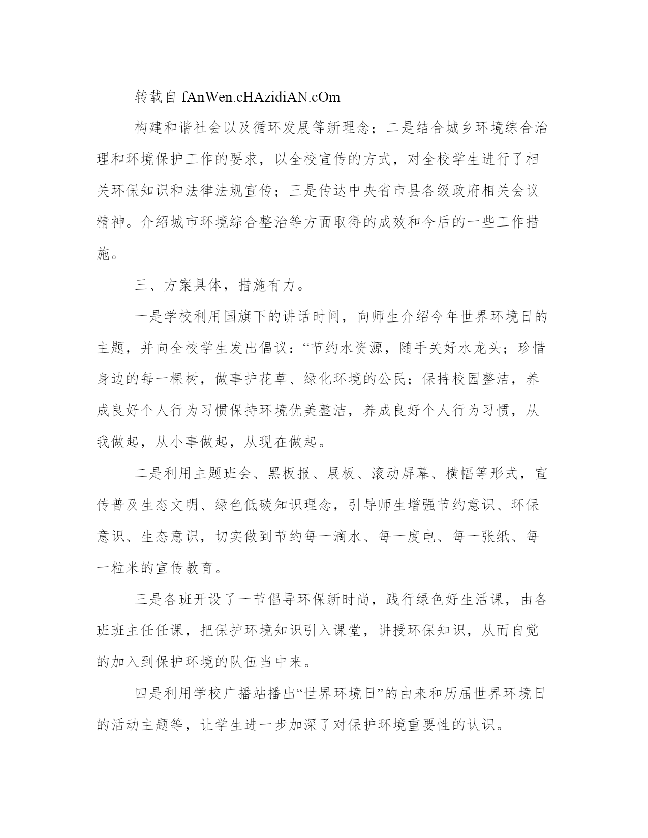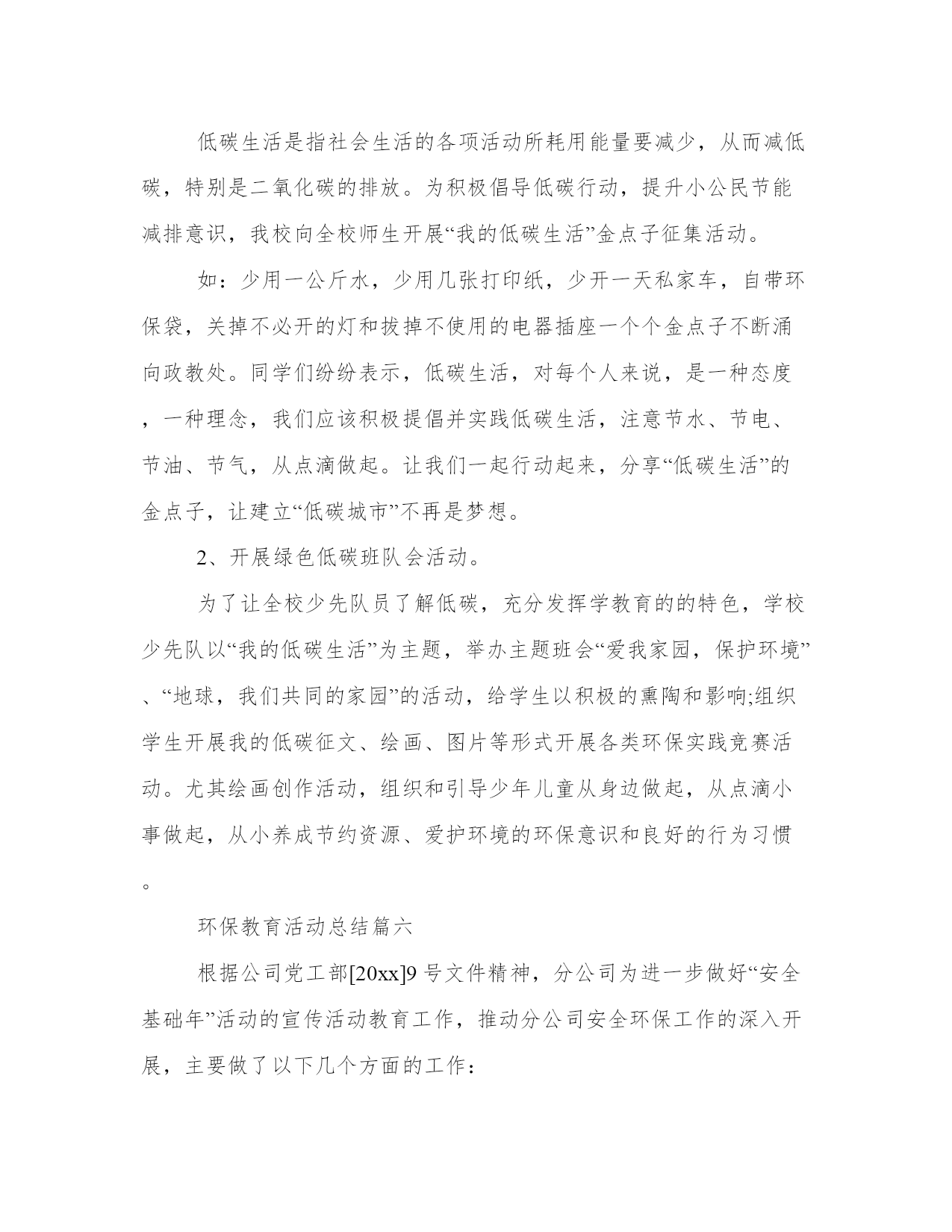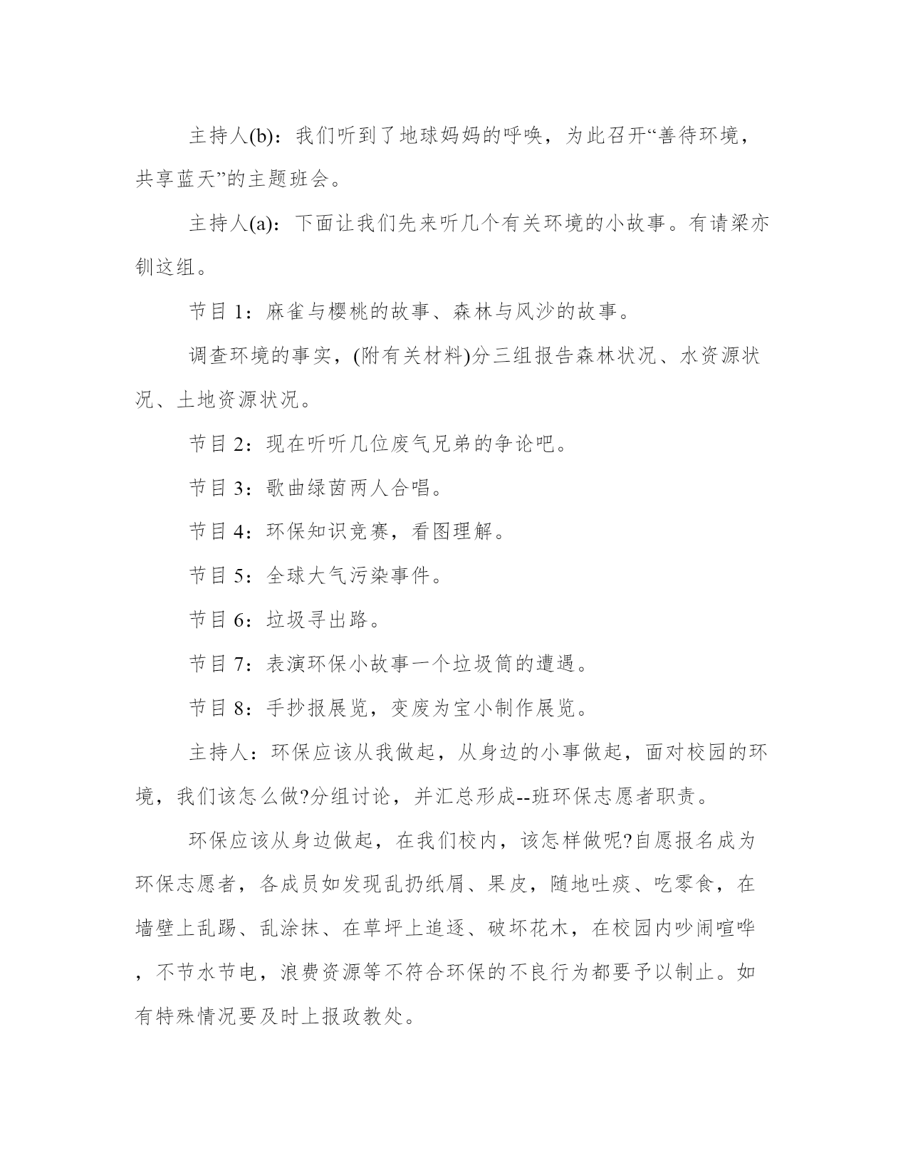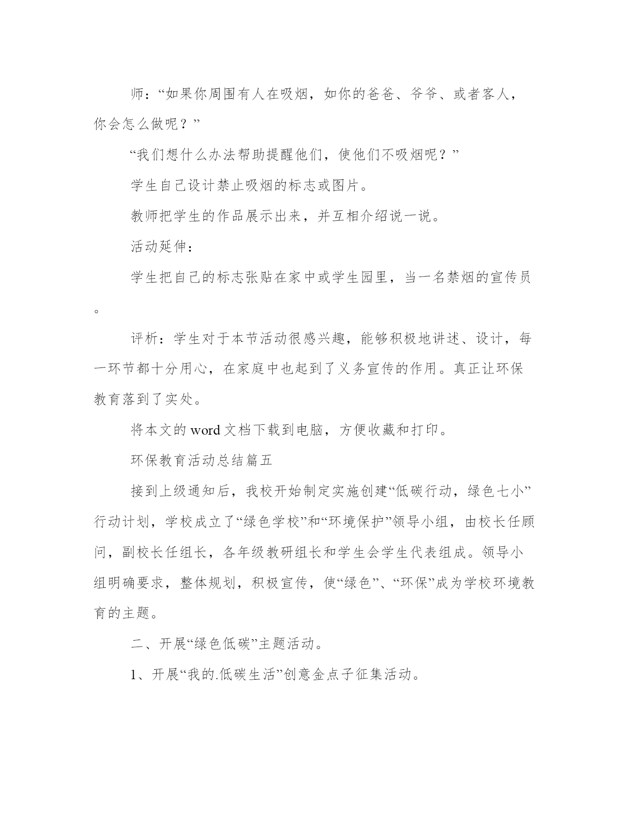 环保教育活动总结大全(16篇)通过总结,我们可以更好地了解自己的优势和弱点,为个人职业规划做出调整。总结的写作中,应注意调整好写作的角度和把握适当的语言风格。以下是小编为大家精心搜集的总结范文,供大家参考和学习。环保教育活动总结篇一班会活动目的:人类生存的自然环境日益恶劣,保护自然环境,维持生态平衡,已是摆在全人类面前的一个重大课题。通过主题班会,使学生清楚地认识到,如果人类的生存环境遭到破坏,最终受害的将是人类。教学过程:一、活动准备:1、选定主持人,分组找材料。2、在教室黑板上书写“善待环境,共享蓝天”,布置教室。二、活动程序。主持人(a):地球是我们赖以生存的`家园,(b)生命在这里繁衍生息,(a)请爱护我们的地球,(b)我们共同生活的环境。主持人(a):地球是我们的母亲,是哺育中华儿女的土地。可谁对知道地球妈妈在向我们呼唤。主持人(b):我们听到了地球妈妈的呼唤,为此召开“善待环境,共享蓝天”的主题班会。主持人(a):下面让我们先来听几个有关环境的小故事。有请梁亦钏这组。节目1:麻雀与樱桃的故事、森林与风沙的故事。调查环境的事实,(附有关材料)分三组报告森林状况、水资源状况、土地资源状况。节目2:现在听听几位废气兄弟的争论吧。节目3:歌曲绿茵两人合唱。节目4:环保知识竞赛,看图理解。节目5:全球大气污染事件。节目6:垃圾寻出路。节目7:表演环保小故事一个垃圾筒的遭遇。节目8:手抄报展览,变废为宝小制作展览。主持人:环保应该从我做起,从身边的小事做起,面对校园的环境,我们该怎么做?分组讨论,并汇总形成--班环保志愿者职责。环保应该从身边做起,在我们校内,该怎样做呢?自愿报名成为环保志愿者,各成员如发现乱扔纸屑、果皮,随地吐痰、吃零食,在墙壁上乱踢、乱涂抹、在草坪上追逐、破坏花木,在校园内吵闹喧哗,不节水节电,浪费资源等不符合环保的不良行为都要予以制止。如有特殊情况要及时上报政教处。各成员如发现地上有纸屑、果皮应主动随手捡起,规定每人每天至少捡5张纸屑或果皮,要随时随地保持教室和清洁区的清洁干净。根据环保志愿者平时表现的情况,期末要评出一名“环保小卫士”。节目9:齐唱爱我中华。四、班主任总结。我觉得这次环保主题班会开得很好,通过环保小故事,森林、水资源调查报告、废气、废渣的自述,垃圾兄弟寻出路’一个垃圾筒的遭遇等小品,全球十大污染事件、手抄报展示、变废为宝作品展示了全球环境的状况,污染的严重性,环保的重要性。通过这次主题班会,我想同学们会更明白,我们只有一个地球,善待环境,共享蓝天,拯救地球就是拯救未来,保护环境,人人有责。环保教育活动总结篇二为开展好今年的世界环境日宣传工作,校领导高度重视,召开办公会进行专题分析,传达了文件精神,制定了工作方案,提前进行了周密的安排部署。结合我县城乡环境综合治理,并结合实际制定了“六五”世界环境日宣传工作方案,将具体工作落实到人,确保了今年“六五”世界环境日宣传系列活动有条不紊地开展。二、围绕主题,广泛宣传。围绕今年我县确定的“倡导环保新时尚,践行绿色好生活”的世界环境日主题。今年“六五”世界环境日我校宣传的主要内容:一是宣传以人为本的---。转载自fAnWen.cHAzidiAN.cOm构建和谐社会以及循环发展等新理念;二是结合城乡环境综合治理和环境保护工作的要求,以全校宣传的方式,对全校学生进行了相关环保知识和法律法规宣传;三是传达中央省市县各级政府相关会议精神。介绍城市环境综合整治等方面取得的成效和今后的一些工作措施。三、方案具体,措施有力。一是学校利用国旗下的讲话时间,向师生介绍今年世界环境日的主题,并向全校学生发出倡议:“节约水资源,随手关好水龙头;珍惜身边的每一棵树,做事护花草、绿化环境的公民;保持校园整洁,养成良好个人行为习惯保持环境优美整洁,养成良好个人行为习惯,从我做起,从小事做起,从现在做起。二是利用主题班会、黑板报、展板、滚动屏幕、横幅等形式,宣传普及生态文明、绿色低碳知识理念,引导师生增强节约意识、环保意识、生态意识,切实做到节约每一滴水、每一度电、每一张纸、每一粒米的宣传教育。三是各班开设了一节倡导环保新时尚,践行绿色好生活课,由各班班主任任课,把保护环境知识引入课堂,讲授环保知识,从而自觉的加入到保护环境的队伍当中来。四是利用学校广播站播出“世界环境日”的由来和历届世界环境日的活动主题等,让学生进一步加深了对保护环境重要性的认识。五是家校联手,改变家庭成员对环境保护的单薄意识和生活陋习。以实现“通过一个学生,带动一个家庭,影响整个社会”的教育效果。倡导绿色生活,提高环保意识,营造全社会关心支持和参与环境保护的良好氛围。我校通过在世界环境日期间开展丰富多彩的环境教育活动,使学生树