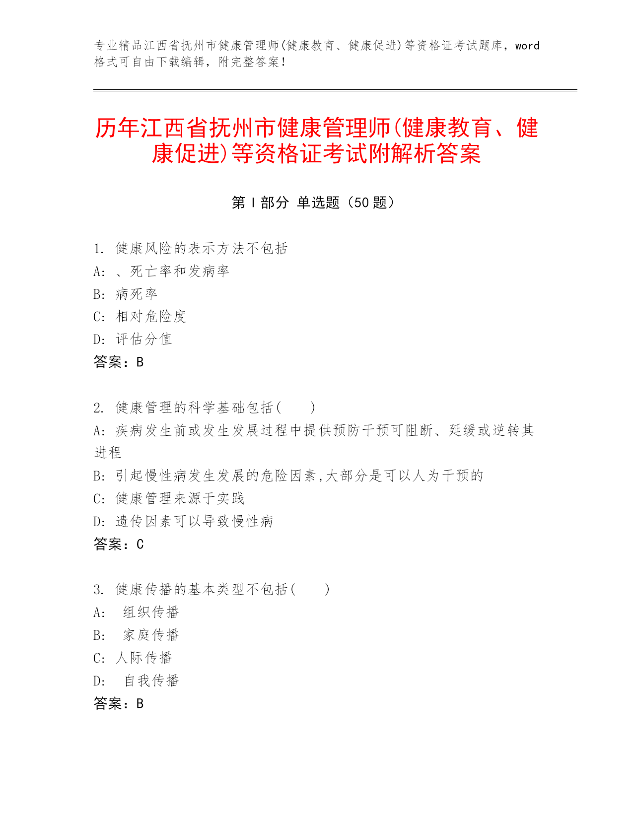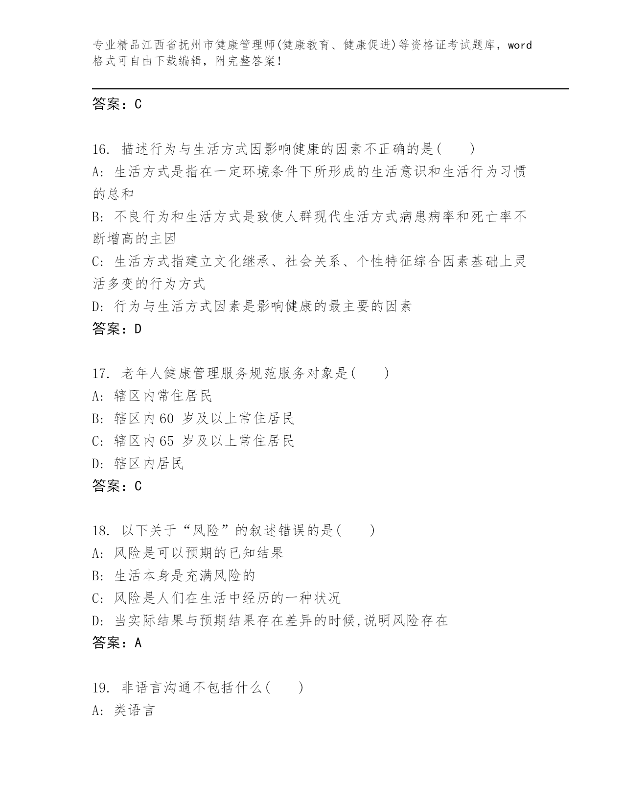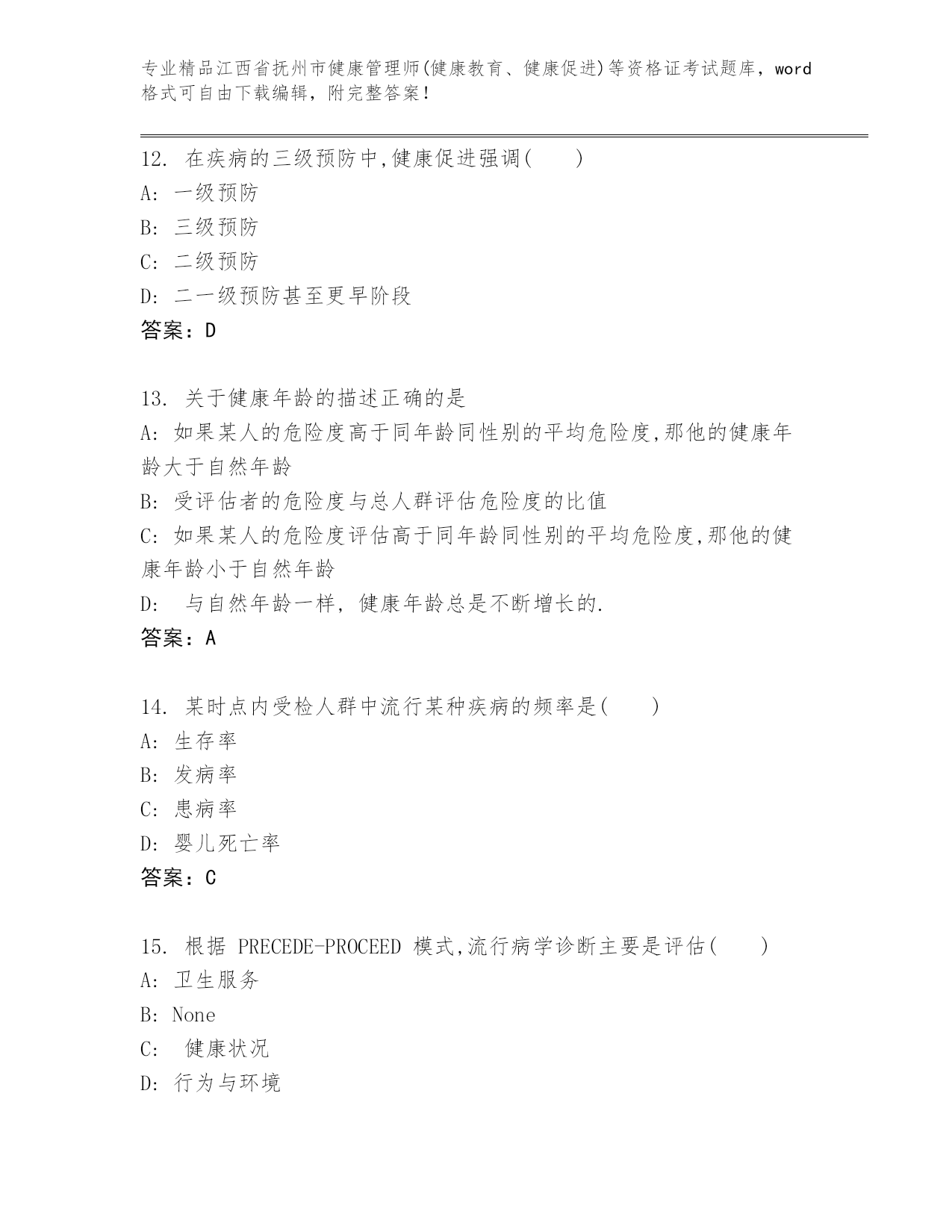 历年江西省抚州市健康管理师(健康教育、健康促进)等资格证考试附解析答案.docx