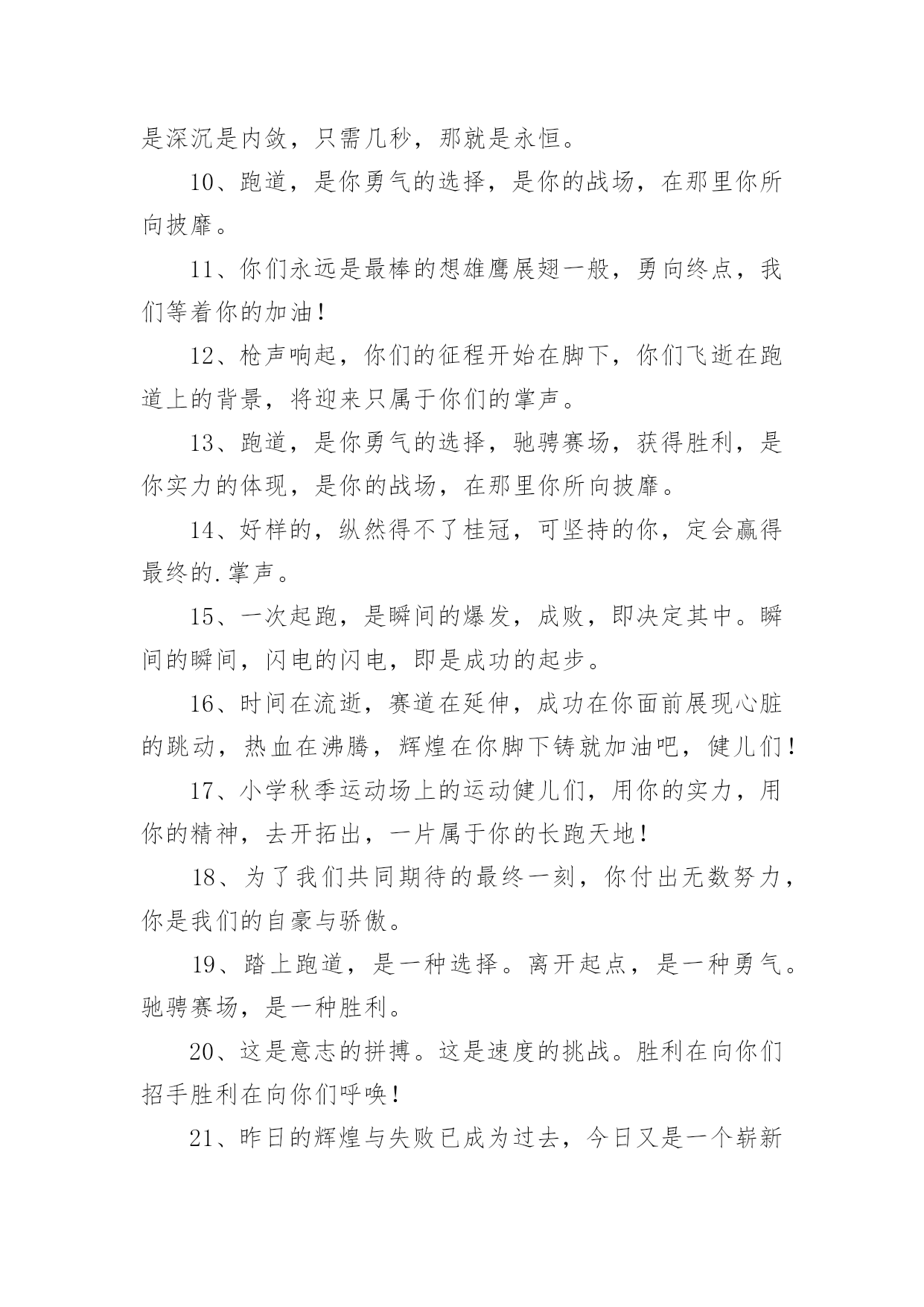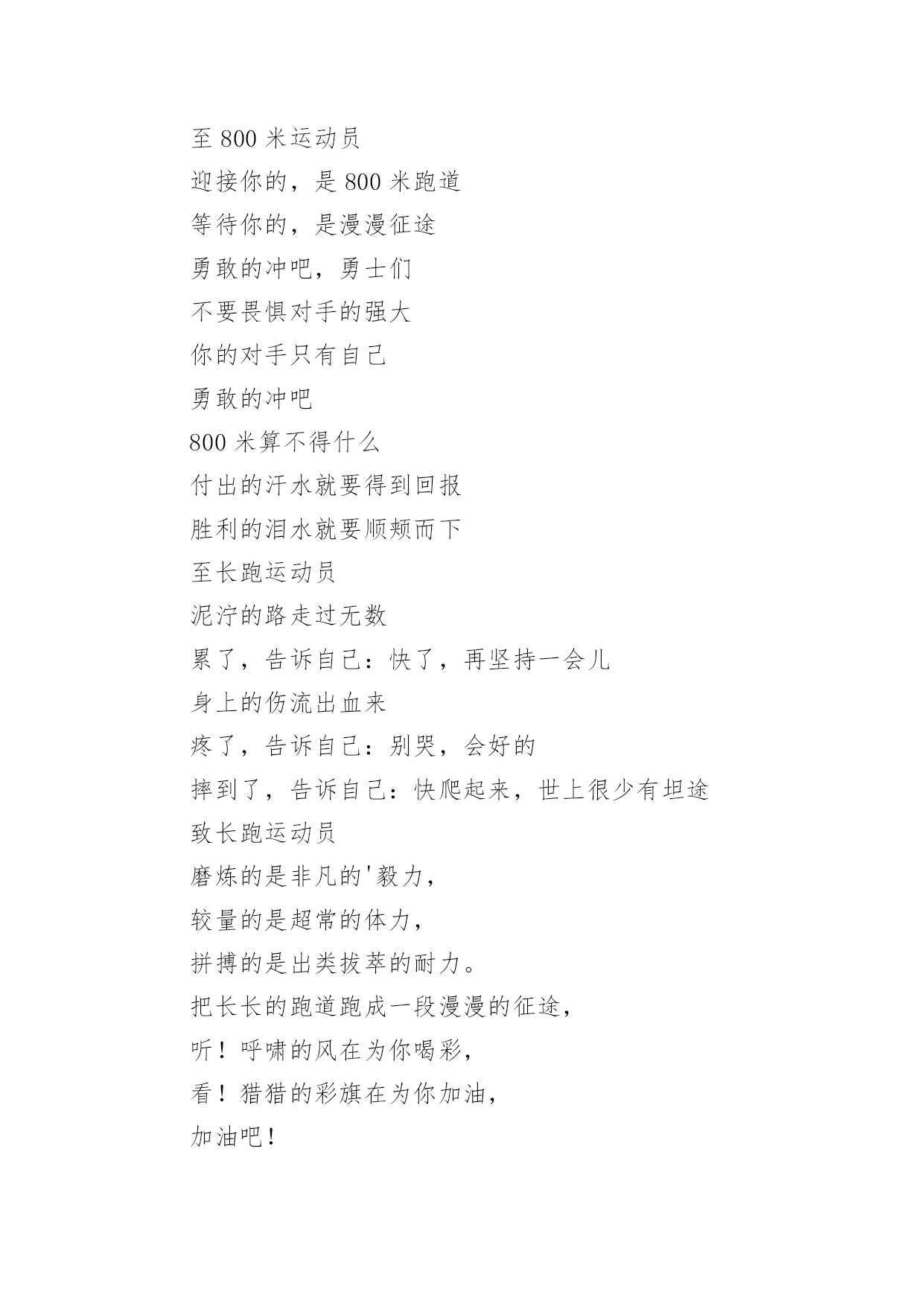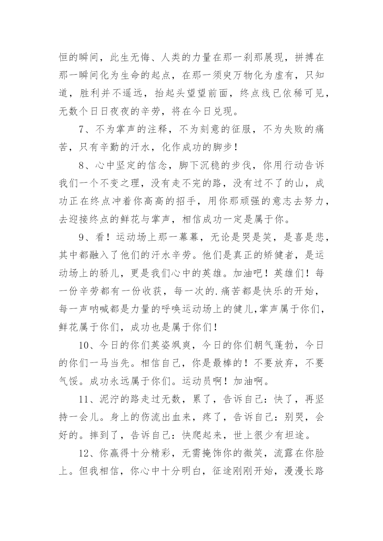 运动会加油稿运动会加油稿在不断进步的社会中,我们都可能会用到加油稿,借助加油稿可以给对方传达鼓励。写起加油稿来就毫无头绪?下面是小编为大家收集的运动会加油稿,欢迎阅读与收藏。运动会加油稿11、跑如疾风,势如闪电,这就是我班运动健儿,加油!2、鼓起勇气,迎接你的将是最终的挑战,最终的胜利。3、冲吧,向着未来冲刺,向着胜利冲刺,加油!4、你们的肌肉爆发着力量,你们的目光充满着自信,相信,胜利就在前方。5、啊!冠军,又是冠军,不要给其他学院任何机会,伟大的运动员加油!6、跑吧,追吧在这广阔的赛场上,你似骏马似离铉的箭。7、只因为始终相信,去拼搏才能胜利。总在鼓舞自我,要成功就得努力。8、人们的注视,那是人们对你的期望,祝福在你身边,呐喊在你耳边,期望在你心中。9、百米战场,枪声炸响,你抬头是勇气是自信,低头是深沉是内敛,只需几秒,那就是永恒。10、跑道,是你勇气的选择,是你的战场,在那里你所向披靡。11、你们永远是最棒的想雄鹰展翅一般,勇向终点,我们等着你的加油!12、枪声响起,你们的征程开始在脚下,你们飞逝在跑道上的背景,将迎来只属于你们的掌声。13、跑道,是你勇气的选择,驰骋赛场,获得胜利,是你实力的体现,是你的战场,在那里你所向披靡。14、好样的,纵然得不了桂冠,可坚持的你,定会赢得最终的.掌声。15、一次起跑,是瞬间的爆发,成败,即决定其中。瞬间的瞬间,闪电的闪电,即是成功的起步。16、时间在流逝,赛道在延伸,成功在你面前展现心脏的跳动,热血在沸腾,辉煌在你脚下铸就加油吧,健儿们!17、小学秋季运动场上的运动健儿们,用你的实力,用你的精神,去开拓出,一片属于你的长跑天地!18、为了我们共同期待的最终一刻,你付出无数努力,你是我们的自豪与骄傲。19、踏上跑道,是一种选择。离开起点,是一种勇气。驰骋赛场,是一种胜利。20、这是意志的拼搏。这是速度的挑战。胜利在向你们招手胜利在向你们呼唤!21、昨日的辉煌与失败已成为过去,今日又是一个崭新的看似是,高二班的同学们,你们个个朝气蓬勃,英姿煞爽,加油!22、说你必须要赢,也必须会赢。枪声响了,四百米,却又像几个世纪,你喊着,跑着,迈开大步,跨过世纪!23、健儿们,加油吧,我们是你们坚强的后盾!24、不为鲜花的围绕,不为刹那的荣耀,仅有执着的信念,化作不停的奔跑,心中燃烧着梦想,脚下不停的步伐!25、时间在流逝,赛道在延伸,成功在你面前展现心脏的跳动,热血在沸腾,辉煌在你脚下铸就。加油吧,健儿们!运动会加油稿21、不为掌声的诠释、不为刻意的征服、只有辛勤的汗水化作追求的脚步、心中坚定的信念、脚下沉稳的步伐、你用行动诉说着一个不变的真理、没有比脚更长的路、没有比人更高的山、希望在终点向你招手、努力吧用你坚韧不拔的毅志、去迎接终点的鲜花与掌声、相信成功属于你们。2、深深的呼吸,等待你的是艰难的米。相信胜利会属于你们。但在这征途上,需要你勇敢的心去面对。我们在为你加油,你是否听到了我们发自心中的呐喊?困难和胜利都在向你招手,去呀,快去呀,不要犹豫。快去击败困难、快去夺取胜利!相信你会送给我们一个汗水浸湿的微笑!3、这是意志的拼搏,这是速度的挑战,胜利在向你们招手,胜利在向你们呼唤!4、踏上跑道,是一种选择。离开起点,是一种勇气。驰骋赛场,是一种胜利。5、看,终点就在眼前;听,同学为你呼喊。鼓起勇气奋力向前,用你的荣誉带给我们希望。6、运动健将们,用你的实力,用你的精神,去开拓出,一片属于你的长跑天地!7、不为掌声的注释,不为刻意的征服,不为失败的痛苦,只有辛勤的.汗水,化作成功的脚步!8、不为鲜花的围绕,不为刹那的荣耀,只有执着的信念,化作不停的奔跑,心中燃烧着梦想,脚下不停的步伐!9、你用行动述说着过程的重要,没有无尽的终点,没有无法攀登的险峰,希望载着终点在向你微笑,拼搏吧!经历是一种精彩,迸发你全部的能量,成功是你汗水的写照。10、你们挥舞着充满力量的双臂,看着实心球化成美丽的弧线,我着实在心里佩服你们,你们抛出了自己的最佳水平。11、环形的跑道一圈又一圈的坚持,毅力与精神活跃在会场上,湿透的衣衫,满头的大汗,无限追求、奋力追赶,我们为你欢呼跳跃,我们为你骄傲。12、朋友,在你走上跑道那一刻,告诉自己,无论成功与否,微笑着跑完全程,只要年轻的心还在不停地跳动,就要大声告诉自己——我无所畏惧。13、亲爱的运动健儿们,加油吧!洒一把艰辛的汗水,继续抬起疲倦的脚步,爆发的一吼气贯长虹,继续向前,不论成功与否,你已曾经拥有。曾记否,在终点欢呼,震惊四周。14、无论成功与否,我们永远铭记这充满奋斗印记的阳光灿烂的日子15、无论你成功与否,刹那属于你。而你,一定属于永恒!16、只要你没有遗憾地奋斗了,你就不必失望,你的生命已放出了闪光!17、成功永远属于每一个勇敢者!18、我们为你呐喊,力量给你
