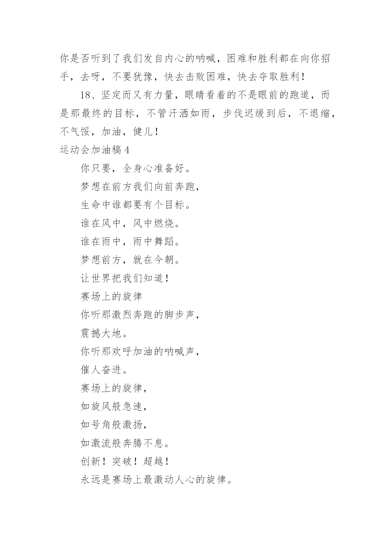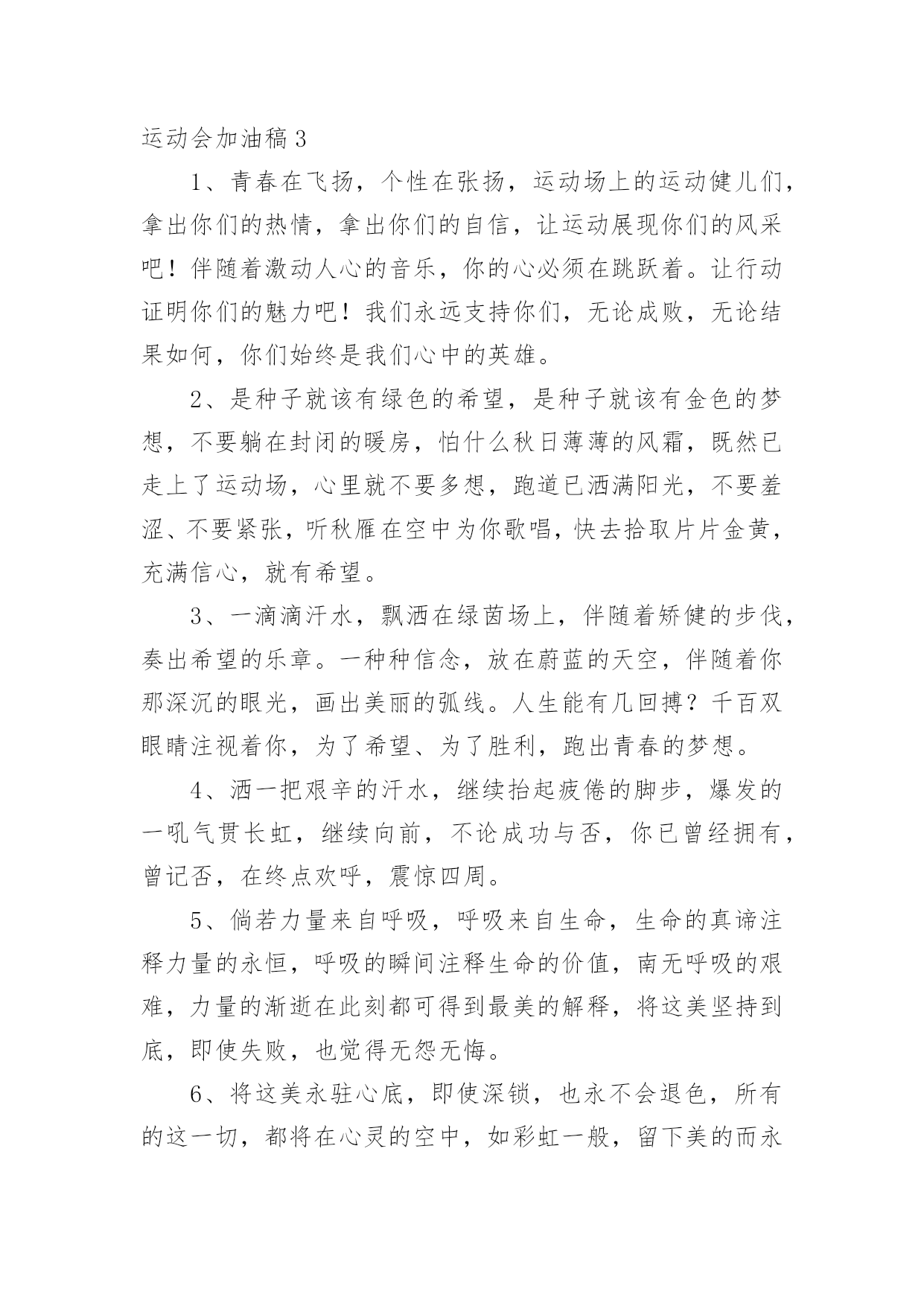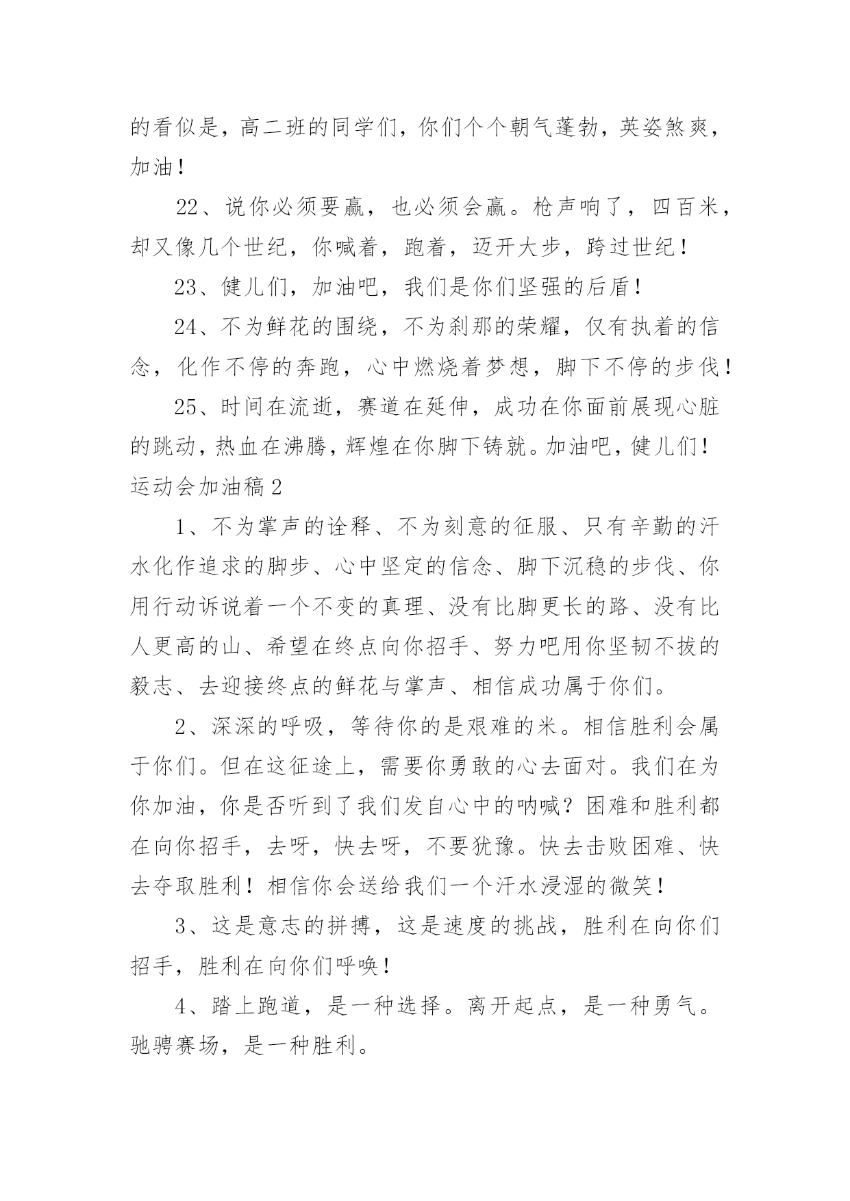 运动会加油稿运动会加油稿在不断进步的社会中,我们都可能会用到加油稿,借助加油稿可以给对方传达鼓励。写起加油稿来就毫无头绪?下面是小编为大家收集的运动会加油稿,欢迎阅读与收藏。运动会加油稿11、跑如疾风,势如闪电,这就是我班运动健儿,加油!2、鼓起勇气,迎接你的将是最终的挑战,最终的胜利。3、冲吧,向着未来冲刺,向着胜利冲刺,加油!4、你们的肌肉爆发着力量,你们的目光充满着自信,相信,胜利就在前方。5、啊!冠军,又是冠军,不要给其他学院任何机会,伟大的运动员加油!6、跑吧,追吧在这广阔的赛场上,你似骏马似离铉的箭。7、只因为始终相信,去拼搏才能胜利。总在鼓舞自我,要成功就得努力。8、人们的注视,那是人们对你的期望,祝福在你身边,呐喊在你耳边,期望在你心中。9、百米战场,枪声炸响,你抬头是勇气是自信,低头是深沉是内敛,只需几秒,那就是永恒。10、跑道,是你勇气的选择,是你的战场,在那里你所向披靡。11、你们永远是最棒的想雄鹰展翅一般,勇向终点,我们等着你的加油!12、枪声响起,你们的征程开始在脚下,你们飞逝在跑道上的背景,将迎来只属于你们的掌声。13、跑道,是你勇气的选择,驰骋赛场,获得胜利,是你实力的体现,是你的战场,在那里你所向披靡。14、好样的,纵然得不了桂冠,可坚持的你,定会赢得最终的.掌声。15、一次起跑,是瞬间的爆发,成败,即决定其中。瞬间的瞬间,闪电的闪电,即是成功的起步。16、时间在流逝,赛道在延伸,成功在你面前展现心脏的跳动,热血在沸腾,辉煌在你脚下铸就加油吧,健儿们!17、小学秋季运动场上的运动健儿们,用你的实力,用你的精神,去开拓出,一片属于你的长跑天地!18、为了我们共同期待的最终一刻,你付出无数努力,你是我们的自豪与骄傲。19、踏上跑道,是一种选择。离开起点,是一种勇气。驰骋赛场,是一种胜利。20、这是意志的拼搏。这是速度的挑战。胜利在向你们招手胜利在向你们呼唤!21、昨日的辉煌与失败已成为过去,今日又是一个崭新的看似是,高二班的同学们,你们个个朝气蓬勃,英姿煞爽,加油!22、说你必须要赢,也必须会赢。枪声响了,四百米,却又像几个世纪,你喊着,跑着,迈开大步,跨过世纪!23、健儿们,加油吧,我们是你们坚强的后盾!24、不为鲜花的围绕,不为刹那的荣耀,仅有执着的信念,化作不停的奔跑,心中燃烧着梦想,脚下不停的步伐!25、时间在流逝,赛道在延伸,成功在你面前展现心脏的跳动,热血在沸腾,辉煌在你脚下铸就。加油吧,健儿们!运动会加油稿21、不为掌声的诠释、不为刻意的征服、只有辛勤的汗水化作追求的脚步、心中坚定的信念、脚下沉稳的步伐、你用行动诉说着一个不变的真理、没有比脚更长的路、没有比人更高的山、希望在终点向你招手、努力吧用你坚韧不拔的毅志、去迎接终点的鲜花与掌声、相信成功属于你们。2、深深的呼吸,等待你的是艰难的米。相信胜利会属于你们。但在这征途上,需要你勇敢的心去面对。我们在为你加油,你是否听到了我们发自心中的呐喊?困难和胜利都在向你招手,去呀,快去呀,不要犹豫。快去击败困难、快去夺取胜利!相信你会送给我们一个汗水浸湿的微笑!3、这是意志的拼搏,这是速度的挑战,胜利在向你们招手,胜利在向你们呼唤!4、踏上跑道,是一种选择。离开起点,是一种勇气。驰骋赛场,是一种胜利。5、看,终点就在眼前;听,同学为你呼喊。鼓起勇气奋力向前,用你的荣誉带给我们希望。6、运动健将们,用你的实力,用你的精神,去开拓出,一片属于你的长跑天地!7、不为掌声的注释,不为刻意的征服,不为失败的痛苦,只有辛勤的.汗水,化作成功的脚步!8、不为鲜花的围绕,不为刹那的荣耀,只有执着的信念,化作不停的奔跑,心中燃烧着梦想,脚下不停的步伐!9、你用行动述说着过程的重要,没有无尽的终点,没有无法攀登的险峰,希望载着终点在向你微笑,拼搏吧!经历是一种精彩,迸发你全部的能量,成功是你汗水的写照。10、你们挥舞着充满力量的双臂,看着实心球化成美丽的弧线,我着实在心里佩服你们,你们抛出了自己的最佳水平。11、环形的跑道一圈又一圈的坚持,毅力与精神活跃在会场上,湿透的衣衫,满头的大汗,无限追求、奋力追赶,我们为你欢呼跳跃,我们为你骄傲。12、朋友,在你走上跑道那一刻,告诉自己,无论成功与否,微笑着跑完全程,只要年轻的心还在不停地跳动,就要大声告诉自己——我无所畏惧。13、亲爱的运动健儿们,加油吧!洒一把艰辛的汗水,继续抬起疲倦的脚步,爆发的一吼气贯长虹,继续向前,不论成功与否,你已曾经拥有。曾记否,在终点欢呼,震惊四周。14、无论成功与否,我们永远铭记这充满奋斗印记的阳光灿烂的日子15、无论你成功与否,刹那属于你。而你,一定属于永恒!16、只要你没有遗憾地奋斗了,你就不必失望,你的生命已放出了闪光!17、成功永远属于每一个勇敢者!18、我们为你呐喊,力量给你