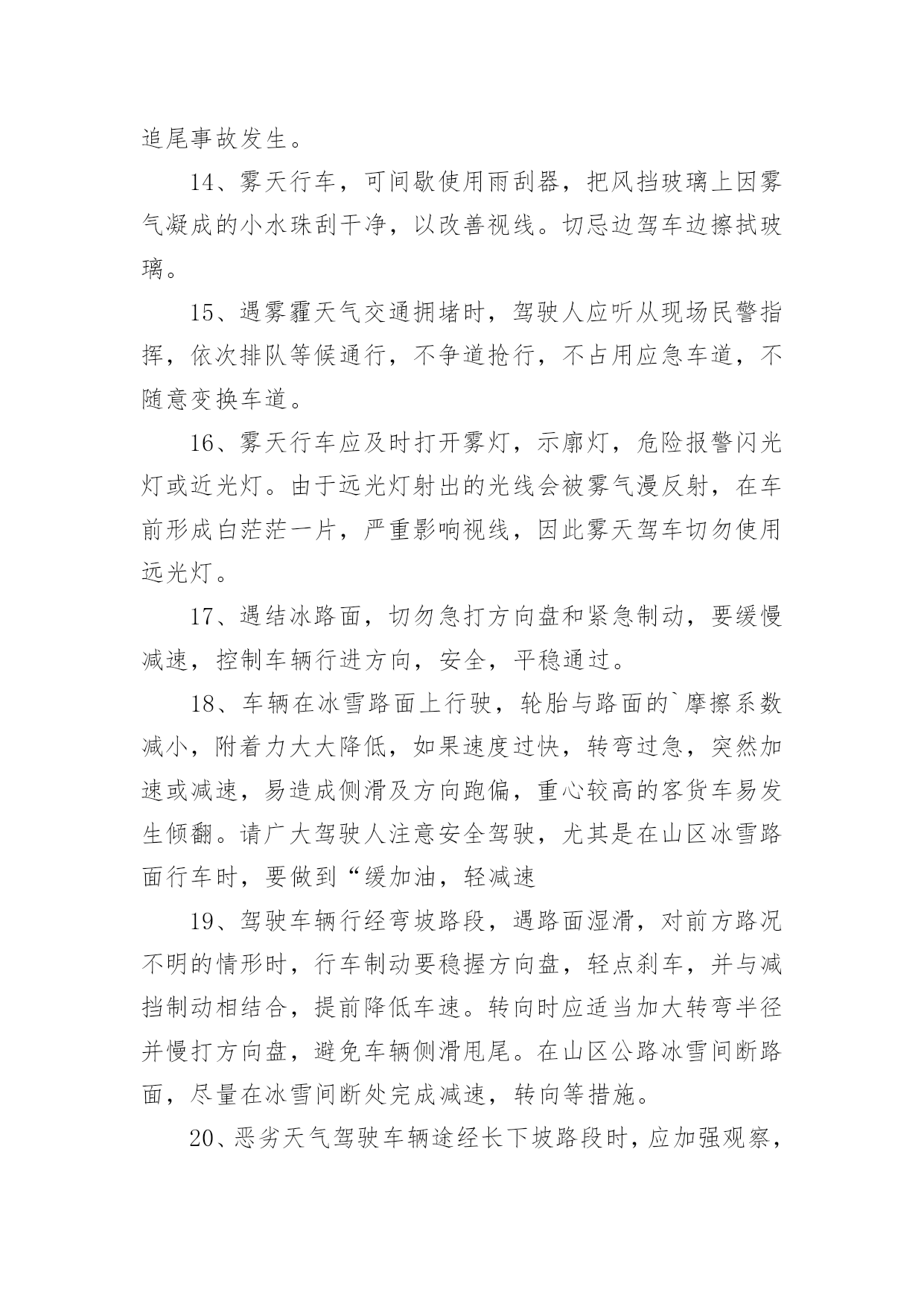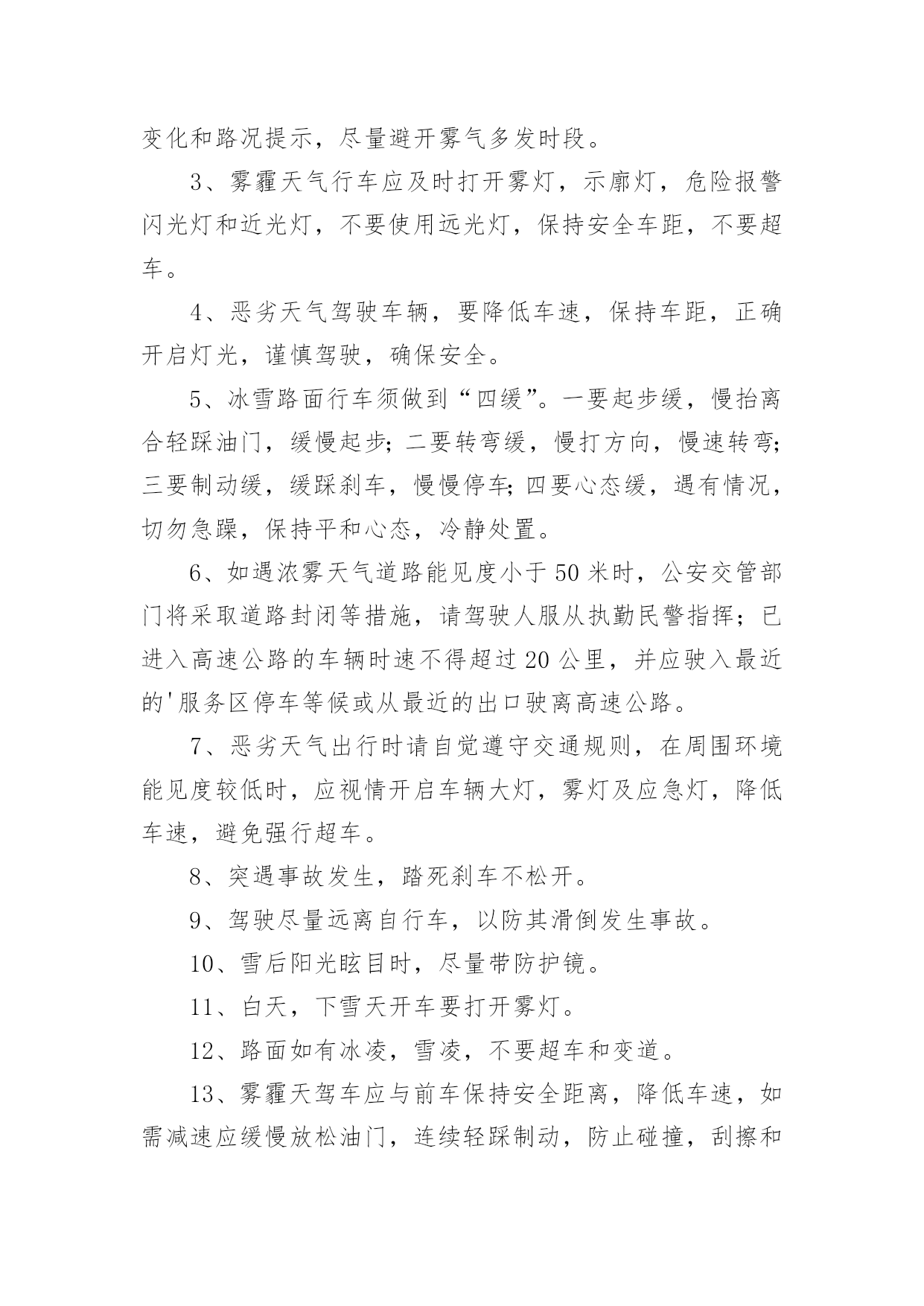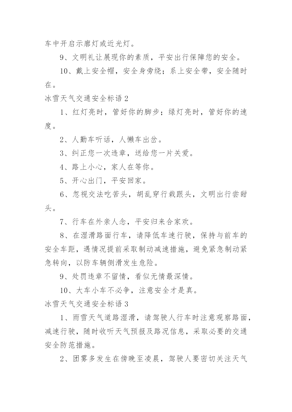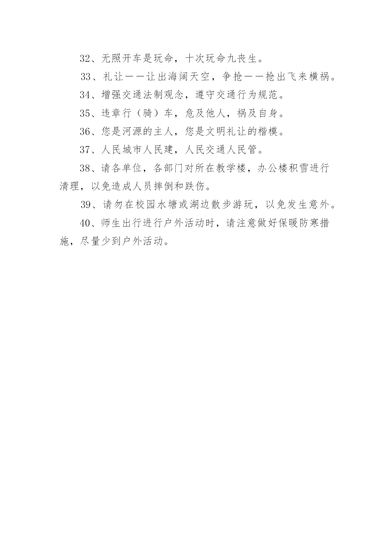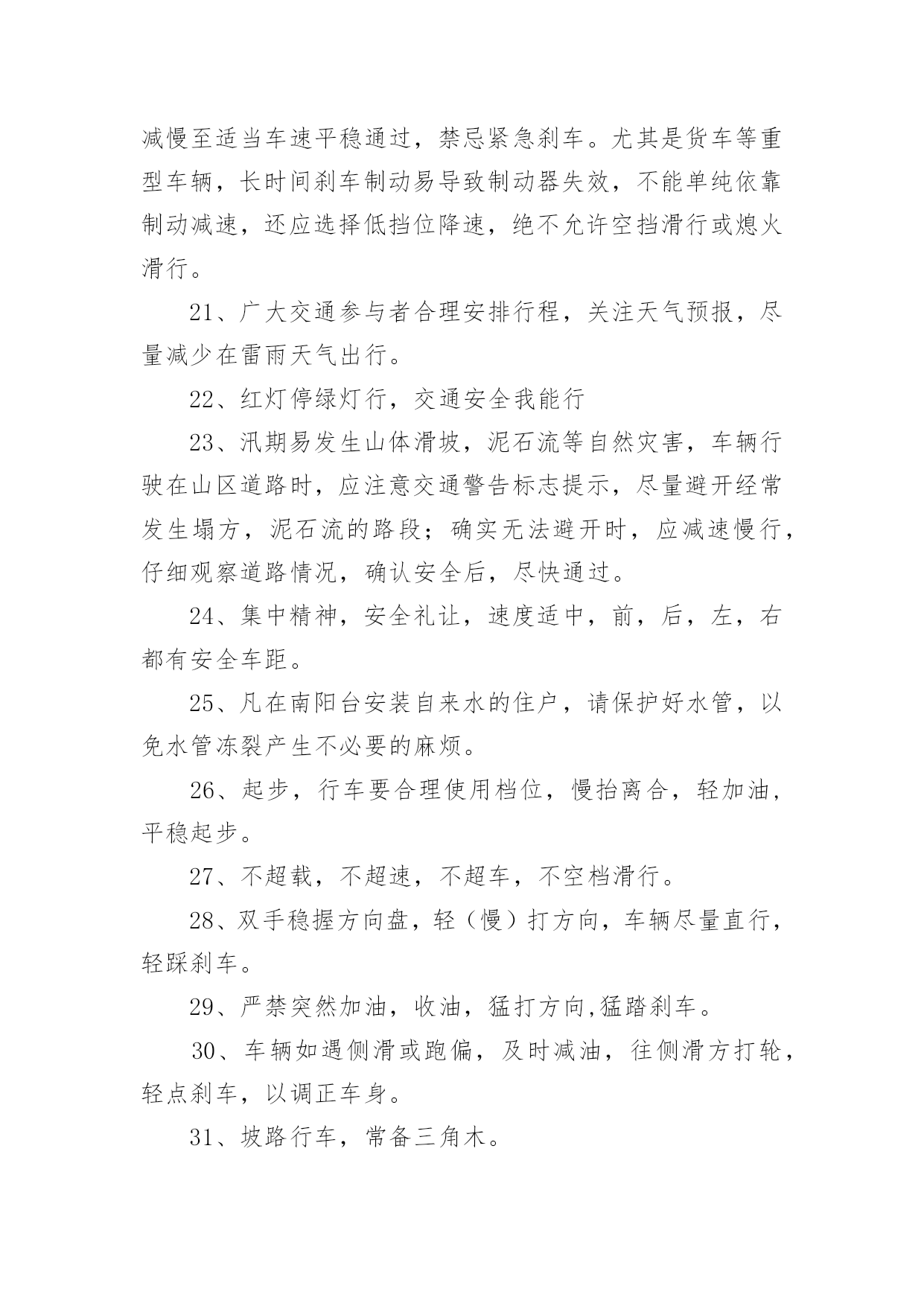冰雪天气交通安全标语冰雪天气交通安全标语在日常学习、工作或生活中,大家一定没少看到过标语吧,标语对人们的思维是有一定的感性作用的。那什么样的标语才是经典的呢?以下是小编为大家收集的冰雪天气交通安全标语,欢迎大家借鉴与参考,希望对大家有所帮助。冰雪天气交通安全标语11、外出时请注意关好宿舍,办公室和教室门窗,以免雨雪吹入室内导致地面或桌椅板凳浸湿。2、校园内车辆行驶请慢行,以免路面打滑导致方向失控,建议少骑摩托车或自行车出行。3、雪天路滑,出行时请您注意防滑。4、有车辆的住户,在进出车库时,请减速行驶,以防意外的发生。5、尽量减少不必要的户外活动,如有外出请务必注意安全;6、大雪过后,路面湿滑,如有摔倒后不要急于起身,应慢慢起身。如突然摔倒,尽量别用手腕去支撑地面,因此姿势容易造成手臂骨折。7、关好门窗,关注户外放置物品,加固易被大雪压坏的物品,妥善安置易受风雪影响的室外物品;8、雨雪天驾车上路前,请注意检查刮水器和灯光,行车中开启示廓灯或近光灯。9、文明礼让展现你的素质,平安出行保障您的安全。10、戴上安全帽,安全身旁绕;系上安全带,安全随时在。冰雪天气交通安全标语21、红灯亮时,管好你的脚步;绿灯亮时,管好你的速度。2、人勤车听话,人懒车出岔。3、纠正您一次违章,送给您一片关爱。4、路上小心,家人在等你。5、开心出门,平安回家。6、忽视交法吃苦头,胡乱穿行栽跟头,文明出行尝甜头。7、行车在外亲人念,平安归来合家欢。8、在湿滑路面行车,请降低车速行驶,保持与前车的安全车距,遇情况提前采取制动减速措施,避免紧急制动紧急转向,以防车辆侧滑发生危险。9、处罚违章不留情,看似无情最深情。10、大车小车不必争,注意安全才是真。冰雪天气交通安全标语31、雨雪天气道路湿滑,请驾驶人行车时注意观察路面,减速行驶,随时收听天气预报及路况信息,采取必要的交通安全防范措施。2、团雾多发生在傍晚至凌晨,驾驶人要密切关注天气变化和路况提示,尽量避开雾气多发时段。3、雾霾天气行车应及时打开雾灯,示廓灯,危险报警闪光灯和近光灯,不要使用远光灯,保持安全车距,不要超车。4、恶劣天气驾驶车辆,要降低车速,保持车距,正确开启灯光,谨慎驾驶,确保安全。5、冰雪路面行车须做到“四缓”。一要起步缓,慢抬离合轻踩油门,缓慢起步;二要转弯缓,慢打方向,慢速转弯;三要制动缓,缓踩刹车,慢慢停车;四要心态缓,遇有情况,切勿急躁,保持平和心态,冷静处置。6、如遇浓雾天气道路能见度小于50米时,公安交管部门将采取道路封闭等措施,请驾驶人服从执勤民警指挥;已进入高速公路的车辆时速不得超过20公里,并应驶入最近的'服务区停车等候或从最近的出口驶离高速公路。7、恶劣天气出行时请自觉遵守交通规则,在周围环境能见度较低时,应视情开启车辆大灯,雾灯及应急灯,降低车速,避免强行超车。8、突遇事故发生,踏死刹车不松开。9、驾驶尽量远离自行车,以防其滑倒发生事故。10、雪后阳光眩目时,尽量带防护镜。11、白天,下雪天开车要打开雾灯。12、路面如有冰凌,雪凌,不要超车和变道。13、雾霾天驾车应与前车保持安全距离,降低车速,如需减速应缓慢放松油门,连续轻踩制动,防止碰撞,刮擦和追尾事故发生。14、雾天行车,可间歇使用雨刮器,把风挡玻璃上因雾气凝成的小水珠刮干净,以改善视线。切忌边驾车边擦拭玻璃。15、遇雾霾天气交通拥堵时,驾驶人应听从现场民警指挥,依次排队等候通行,不争道抢行,不占用应急车道,不随意变换车道。16、雾天行车应及时打开雾灯,示廓灯,危险报警闪光灯或近光灯。由于远光灯射出的光线会被雾气漫反射,在车前形成白茫茫一片,严重影响视线,因此雾天驾车切勿使用远光灯。17、遇结冰路面,切勿急打方向盘和紧急制动,要缓慢减速,控制车辆行进方向,安全,平稳通过。18、车辆在冰雪路面上行驶,轮胎与路面的`摩擦系数减小,附着力大大降低,如果速度过快,转弯过急,突然加速或减速,易造成侧滑及方向跑偏,重心较高的客货车易发生倾翻。请广大驾驶人注意安全驾驶,尤其是在山区冰雪路面行车时,要做到“缓加油,轻减速19、驾驶车辆行经弯坡路段,遇路面湿滑,对前方路况不明的情形时,行车制动要稳握方向盘,轻点刹车,并与减挡制动相结合,提前降低车速。转向时应适当加大转弯半径并慢打方向盘,避免车辆侧滑甩尾。在山区公路冰雪间断路面,尽量在冰雪间断处完成减速,转向等措施。20、恶劣天气驾驶车辆途经长下坡路段时,应加强观察,减慢至适当车速平稳通过,禁忌紧急刹车。尤其是货车等重型车辆,长时间刹车制动易导致制动器失效,不能单纯依靠制动减速,还应选择低挡位降速,绝不允许空挡滑行或熄火滑行。21、广大交通参与者合理安排行程,关注天气预报,尽量减少在雷雨天气出行。22、红灯停绿灯行,交通安全我能行23、汛期易发生山体滑坡,泥石流等自然灾害,车辆行驶