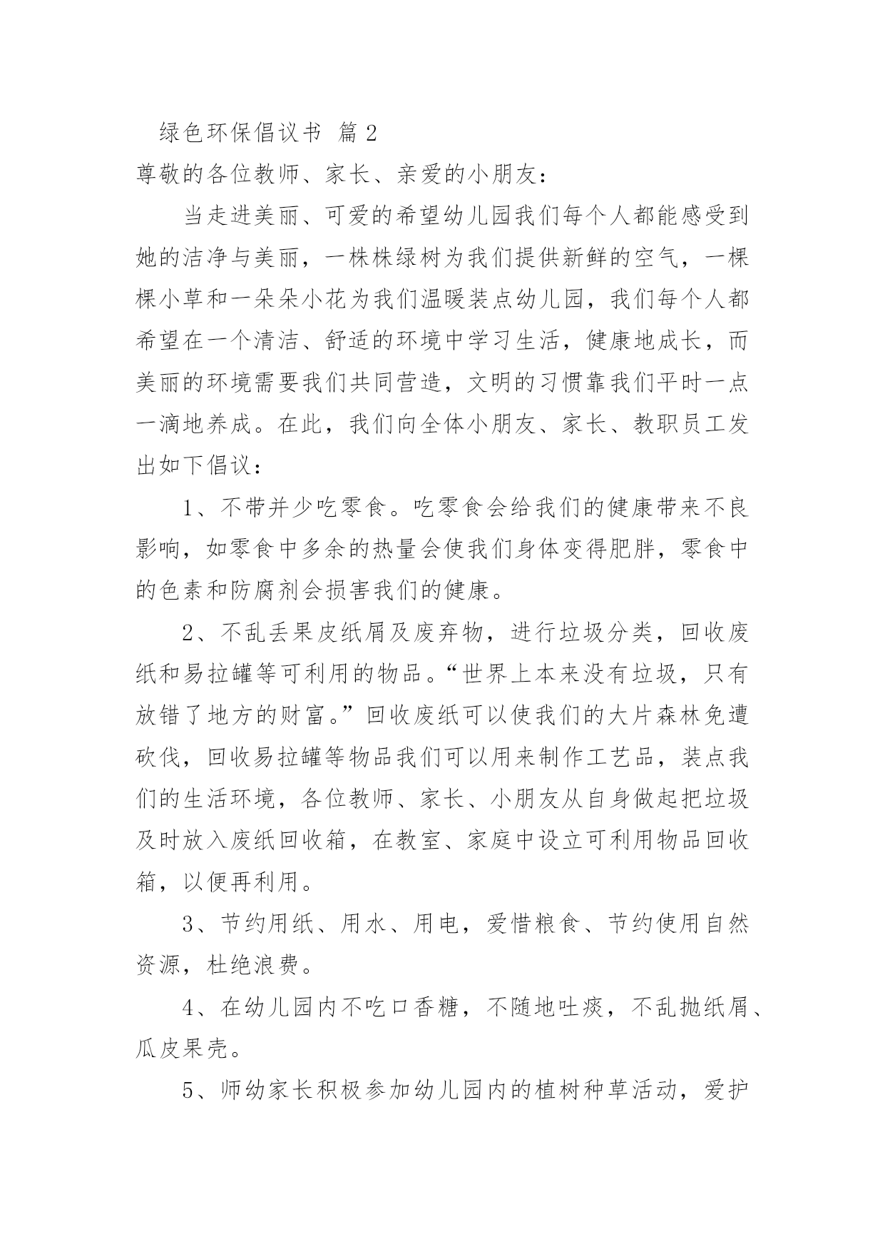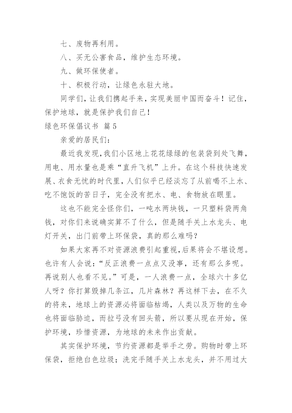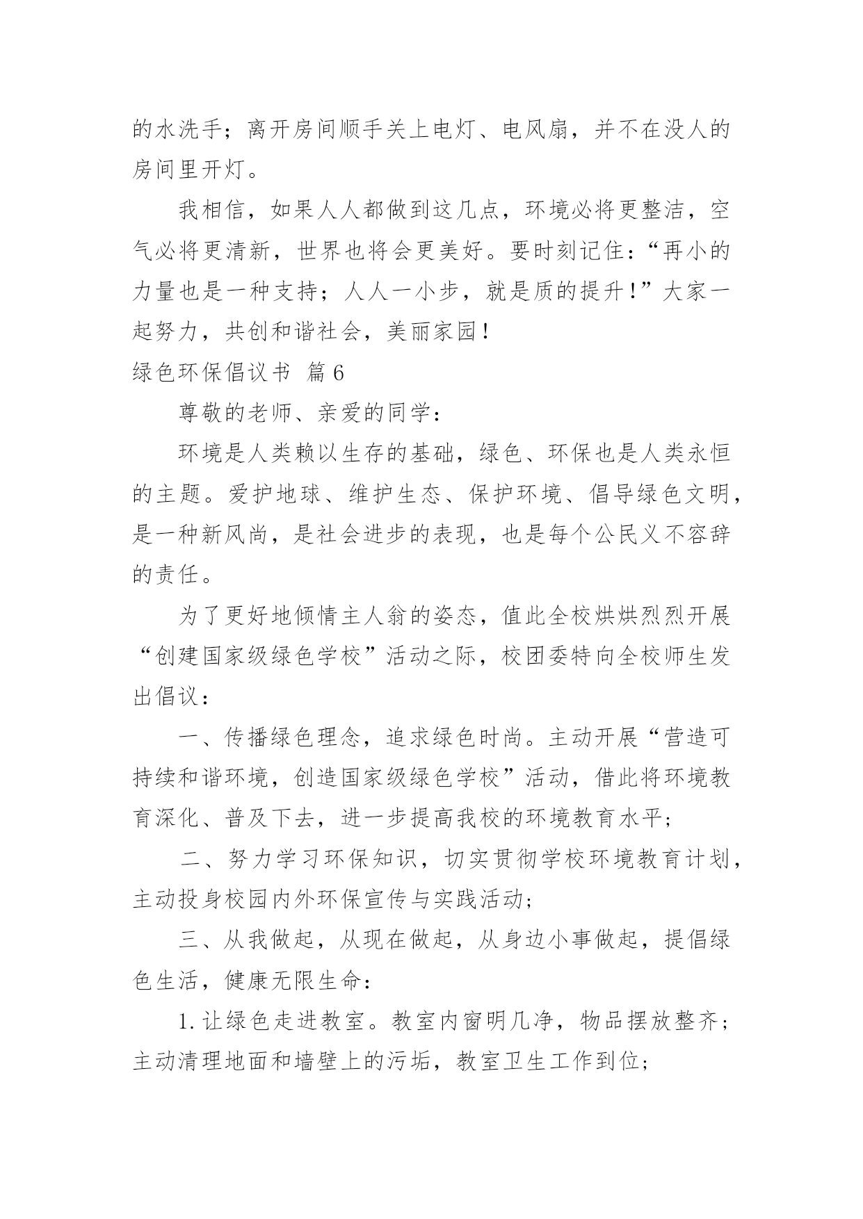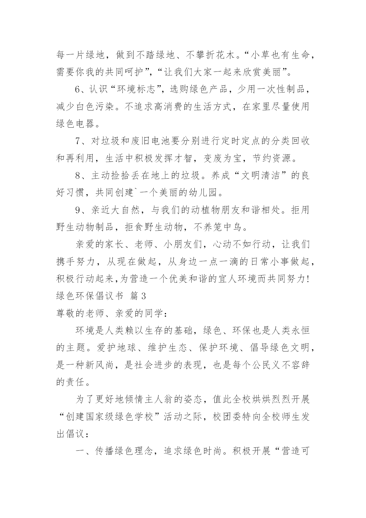 绿色环保倡议书有关绿色环保倡议书范文10篇在现实社会中,越来越多地方需要用到倡议书,倡议书作为一种公开提议性的专用书信,其在写作上有一定的规范。写起倡议书来就毫无头绪?下面是小编收集整理的绿色环保倡议书10篇,欢迎大家借鉴与参考,希望对大家有所帮助。绿色环保倡议书篇1同学们:请问你们是否看到过,在一条干净的街道旁,睡着一团白纸:你们是否看到过,垃圾桶就在一旁,这里却有一堆垃圾.现在,我们的城市既然如此美丽,我们为什么要破坏环境?在此,我向同学们提出以下几点建议:1、不乱扔垃圾,不随地吐痰。2、看到有垃圾及时捡起并扔进垃圾桶.3、向人们宣传保护环境的重要性.4、如果发现有人破坏环境,要及时劝阻.同学们,我们只有一个地球,我们只有一片蓝天,我们只有一个属于自己的家园.让我们立即行动起来,从自己做起,从身边的小事做起,保护我们的生存环境,保护我们的大自然吧!签名:日期:年月日绿色环保倡议书篇2尊敬的各位教师、家长、亲爱的小朋友:当走进美丽、可爱的希望幼儿园我们每个人都能感受到她的洁净与美丽,一株株绿树为我们提供新鲜的空气,一棵棵小草和一朵朵小花为我们温暖装点幼儿园,我们每个人都希望在一个清洁、舒适的环境中学习生活,健康地成长,而美丽的环境需要我们共同营造,文明的习惯靠我们平时一点一滴地养成。在此,我们向全体小朋友、家长、教职员工发出如下倡议:1、不带并少吃零食。吃零食会给我们的健康带来不良影响,如零食中多余的热量会使我们身体变得肥胖,零食中的色素和防腐剂会损害我们的健康。2、不乱丢果皮纸屑及废弃物,进行垃圾分类,回收废纸和易拉罐等可利用的物品。“世界上本来没有垃圾,只有放错了地方的财富。”回收废纸可以使我们的大片森林免遭砍伐,回收易拉罐等物品我们可以用来制作工艺品,装点我们的生活环境,各位教师、家长、小朋友从自身做起把垃圾及时放入废纸回收箱,在教室、家庭中设立可利用物品回收箱,以便再利用。3、节约用纸、用水、用电,爱惜粮食、节约使用自然资源,杜绝浪费。4、在幼儿园内不吃口香糖,不随地吐痰,不乱抛纸屑、瓜皮果壳。5、师幼家长积极参加幼儿园内的植树种草活动,爱护每一片绿地,做到不踏绿地、不攀折花木。“小草也有生命,需要你我的共同呵护”,“让我们大家一起来欣赏美丽”。6、认识“环境标志”,选购绿色产品,少用一次性制品,减少白色污染。不追求高消费的生活方式,在家里尽量使用绿色电器。7、对垃圾和废旧电池要分别进行定时定点的分类回收和再利用,生活中积极发挥才智,变废为宝,节约资源。8、主动捡拾丢在地上的垃圾。养成“文明清洁”的良好习惯,共同创建`一个美丽的幼儿园。9、亲近大自然,与我们的动植物朋友和谐相处。拒用野生动物制品,拒食野生动物,不养笼中鸟。亲爱的家长、老师、小朋友们,心动不如行动,让我们携手努力,从现在做起,从身边一点一滴的日常小事做起,积极行动起来,为营造一个优美和谐的宜人环境而共同努力!绿色环保倡议书篇3尊敬的老师、亲爱的同学:环境是人类赖以生存的基础,绿色、环保也是人类永恒的主题。爱护地球、维护生态、保护环境、倡导绿色文明,是一种新风尚,是社会进步的表现,也是每个公民义不容辞的责任。为了更好地倾情主人翁的姿态,值此全校烘烘烈烈开展“创建国家级绿色学校”活动之际,校团委特向全校师生发出倡议:一、传播绿色理念,追求绿色时尚。积极开展“营造可持续和谐环境,创造国家级绿色学校”活动,借此将环境教育深化、普及下去,进一步提高我校的环境教育水平;二、努力学习环保知识,切实贯彻学校环境教育计划,积极投身校园内外环保宣传与实践活动;三、从我做起,从现在做起,从身边小事做起,提倡绿色生活,健康无限生命:1.让绿色走进班级。班级内窗明几净,物品摆放整齐;主动清理地面和墙壁上的污垢,班级卫生工作到位;2.校园内不吃零食,不随地吐痰,不乱丢果皮纸屑及废弃物,主动捡拾地上的垃圾;3.爱护学校一切公共财物。不践踏草皮,不攀枝折花,爱护花草树木;不乱刻桌椅,不涂画壁墙,不故意损坏门窗、开关及其他公物;4.净公语言环境,不说粗话、脏话,使用礼貌用语;5.节约用水,爱惜电能,爱惜每一粒粮食;6.遵守《全国青少年网络文明公约》,文明上网;反对迷信,反对邪恶事物;四、积极做好校园内及所居住社区、公共场所的净化工作,清除或有效控制日常生活中产生的污染;五、树立正确的环境价值观和环境道德风尚。明确环保责任,为社会、经济和环境的可持续发展积极努力。各位老师、同学,让我们首先从寒假开始,积极宣传并组织有益的环保活动,杜绝不良陋习,营造多彩人生,过一个健康和谐的绿色春节!让我们携手播洒绿色的希望,尽全力进一步创造博文和谐、健康、可持续发展的育人环境、生态环境和生活学习环境,为我们灿烂的人生益彩益色。绿色环保倡议书篇43月12日是一年一度的植树节,30多年来,“植树造林,绿