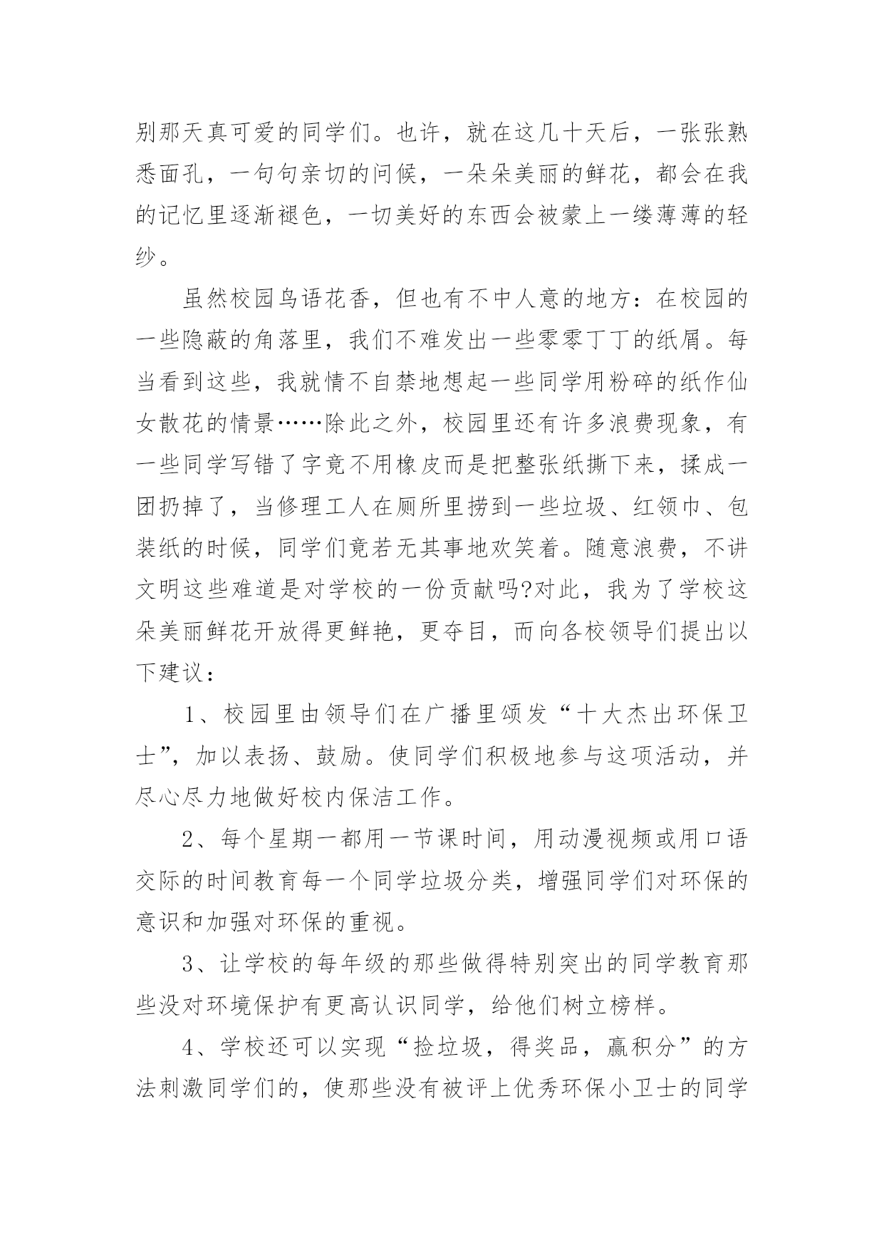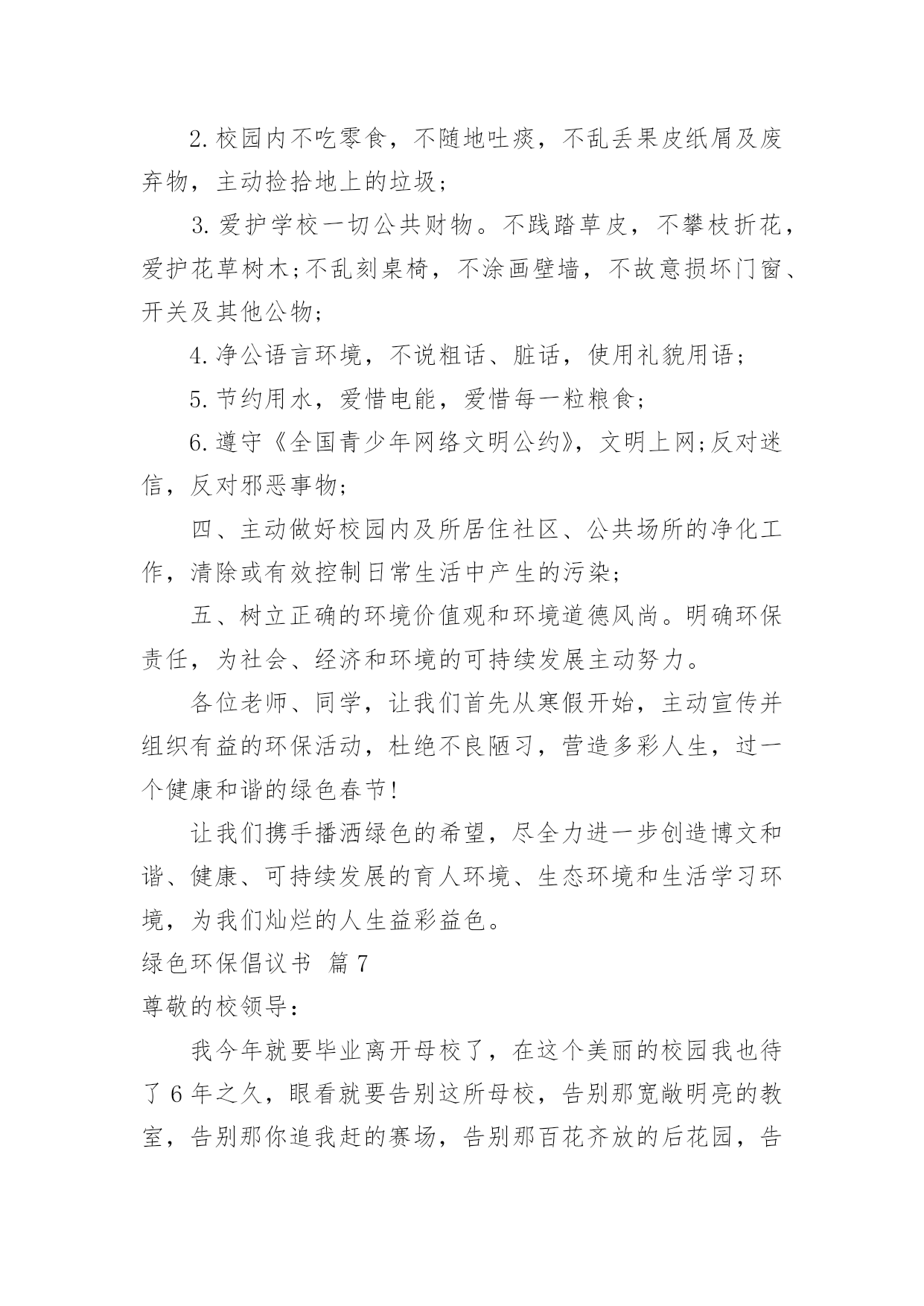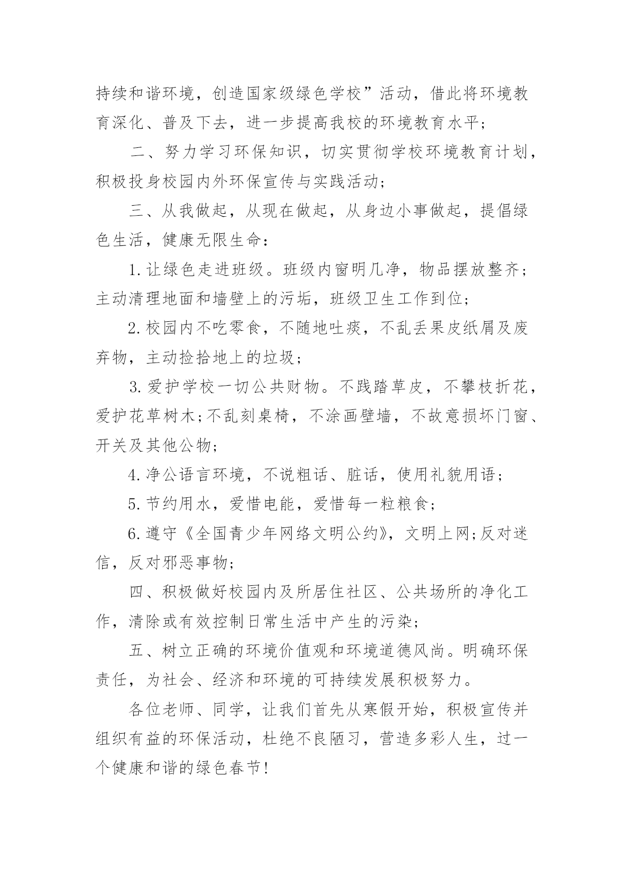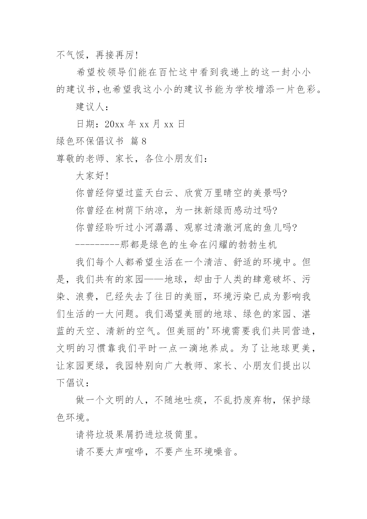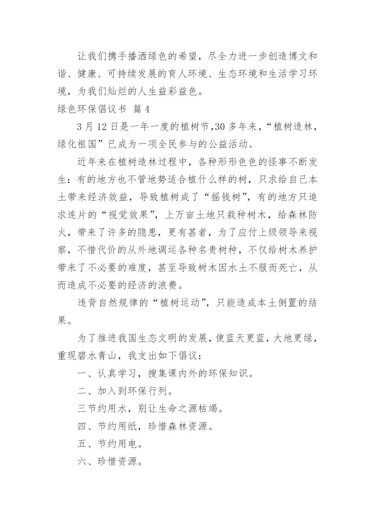 绿色环保倡议书有关绿色环保倡议书范文10篇在现实社会中,越来越多地方需要用到倡议书,倡议书作为一种公开提议性的专用书信,其在写作上有一定的规范。写起倡议书来就毫无头绪?下面是小编收集整理的绿色环保倡议书10篇,欢迎大家借鉴与参考,希望对大家有所帮助。绿色环保倡议书篇1同学们:请问你们是否看到过,在一条干净的街道旁,睡着一团白纸:你们是否看到过,垃圾桶就在一旁,这里却有一堆垃圾.现在,我们的城市既然如此美丽,我们为什么要破坏环境?在此,我向同学们提出以下几点建议:1、不乱扔垃圾,不随地吐痰。2、看到有垃圾及时捡起并扔进垃圾桶.3、向人们宣传保护环境的重要性.4、如果发现有人破坏环境,要及时劝阻.同学们,我们只有一个地球,我们只有一片蓝天,我们只有一个属于自己的家园.让我们立即行动起来,从自己做起,从身边的小事做起,保护我们的生存环境,保护我们的大自然吧!签名:日期:年月日绿色环保倡议书篇2尊敬的各位教师、家长、亲爱的小朋友:当走进美丽、可爱的希望幼儿园我们每个人都能感受到她的洁净与美丽,一株株绿树为我们提供新鲜的空气,一棵棵小草和一朵朵小花为我们温暖装点幼儿园,我们每个人都希望在一个清洁、舒适的环境中学习生活,健康地成长,而美丽的环境需要我们共同营造,文明的习惯靠我们平时一点一滴地养成。在此,我们向全体小朋友、家长、教职员工发出如下倡议:1、不带并少吃零食。吃零食会给我们的健康带来不良影响,如零食中多余的热量会使我们身体变得肥胖,零食中的色素和防腐剂会损害我们的健康。2、不乱丢果皮纸屑及废弃物,进行垃圾分类,回收废纸和易拉罐等可利用的物品。“世界上本来没有垃圾,只有放错了地方的财富。”回收废纸可以使我们的大片森林免遭砍伐,回收易拉罐等物品我们可以用来制作工艺品,装点我们的生活环境,各位教师、家长、小朋友从自身做起把垃圾及时放入废纸回收箱,在教室、家庭中设立可利用物品回收箱,以便再利用。3、节约用纸、用水、用电,爱惜粮食、节约使用自然资源,杜绝浪费。4、在幼儿园内不吃口香糖,不随地吐痰,不乱抛纸屑、瓜皮果壳。5、师幼家长积极参加幼儿园内的植树种草活动,爱护每一片绿地,做到不踏绿地、不攀折花木。“小草也有生命,需要你我的共同呵护”,“让我们大家一起来欣赏美丽”。6、认识“环境标志”,选购绿色产品,少用一次性制品,减少白色污染。不追求高消费的生活方式,在家里尽量使用绿色电器。7、对垃圾和废旧电池要分别进行定时定点的分类回收和再利用,生活中积极发挥才智,变废为宝,节约资源。8、主动捡拾丢在地上的垃圾。养成“文明清洁”的良好习惯,共同创建`一个美丽的幼儿园。9、亲近大自然,与我们的动植物朋友和谐相处。拒用野生动物制品,拒食野生动物,不养笼中鸟。亲爱的家长、老师、小朋友们,心动不如行动,让我们携手努力,从现在做起,从身边一点一滴的日常小事做起,积极行动起来,为营造一个优美和谐的宜人环境而共同努力!绿色环保倡议书篇3尊敬的老师、亲爱的同学:环境是人类赖以生存的基础,绿色、环保也是人类永恒的主题。爱护地球、维护生态、保护环境、倡导绿色文明,是一种新风尚,是社会进步的表现,也是每个公民义不容辞的责任。为了更好地倾情主人翁的姿态,值此全校烘烘烈烈开展“创建国家级绿色学校”活动之际,校团委特向全校师生发出倡议:一、传播绿色理念,追求绿色时尚。积极开展“营造可持续和谐环境,创造国家级绿色学校”活动,借此将环境教育深化、普及下去,进一步提高我校的环境教育水平;二、努力学习环保知识,切实贯彻学校环境教育计划,积极投身校园内外环保宣传与实践活动;三、从我做起,从现在做起,从身边小事做起,提倡绿色生活,健康无限生命:1.让绿色走进班级。班级内窗明几净,物品摆放整齐;主动清理地面和墙壁上的污垢,班级卫生工作到位;2.校园内不吃零食,不随地吐痰,不乱丢果皮纸屑及废弃物,主动捡拾地上的垃圾;3.爱护学校一切公共财物。不践踏草皮,不攀枝折花,爱护花草树木;不乱刻桌椅,不涂画壁墙,不故意损坏门窗、开关及其他公物;4.净公语言环境,不说粗话、脏话,使用礼貌用语;5.节约用水,爱惜电能,爱惜每一粒粮食;6.遵守《全国青少年网络文明公约》,文明上网;反对迷信,反对邪恶事物;四、积极做好校园内及所居住社区、公共场所的净化工作,清除或有效控制日常生活中产生的污染;五、树立正确的环境价值观和环境道德风尚。明确环保责任,为社会、经济和环境的可持续发展积极努力。各位老师、同学,让我们首先从寒假开始,积极宣传并组织有益的环保活动,杜绝不良陋习,营造多彩人生,过一个健康和谐的绿色春节!让我们携手播洒绿色的希望,尽全力进一步创造博文和谐、健康、可持续发展的育人环境、生态环境和生活学习环境,为我们灿烂的人生益彩益色。绿色环保倡议书篇43月12日是一年一度的植树节,30多年来,“植树造林,绿