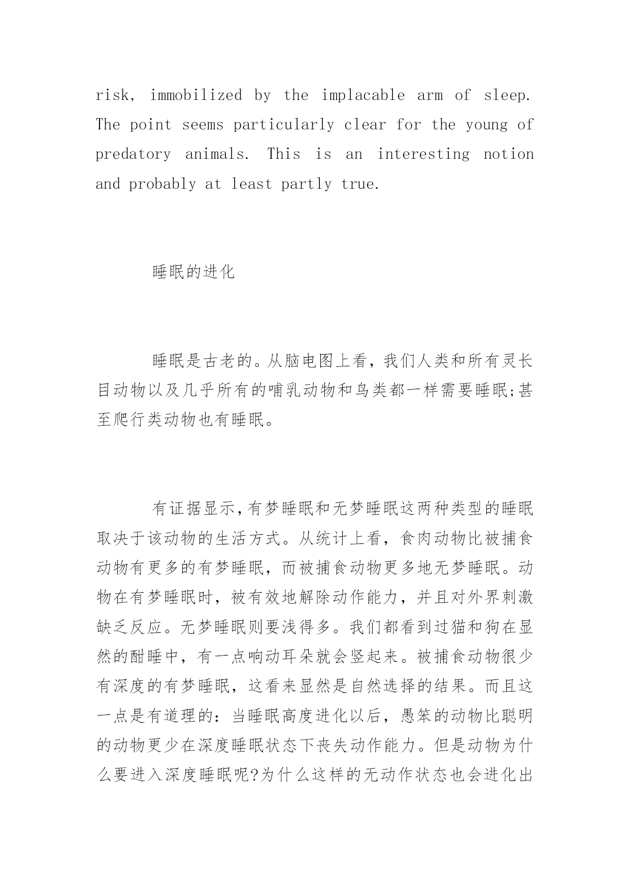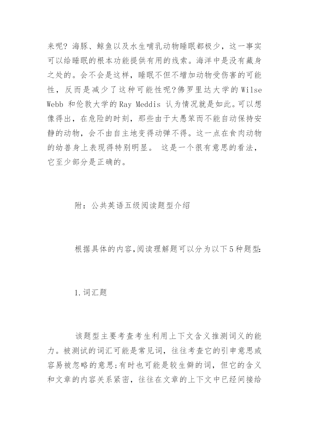 公共英语五级阅读材料公共英语五级阅读材料公共英语五级的考试难度较大,这对于考生来说是一个比较大的挑战,下面,小编就为大家送上一篇公共英语五级阅读材料,希望对大家有所帮助。EvolutionofSleepSleepisveryancient.Intheelectroencephalographicsenseweshareitwithalltheprimatesandalmostalltheothermammalsandbirds:itmayextendbackasfarasthereptiles.Thereissomeevidencethatthetwotypesofsleep,dreaminganddreamless,dependonthelife-styleoftheanimal,andthatpredatorsarestatisticallymuchmorelikelytodreamthanprey,whichareinturnmuchmorelikelytoexperiencedreamlesssleep.Indreamsleep,theanimalispowerfullyimmobilizedandremarkablyunresponsivetoexternalstimuli.Dreamlesssleepismuchshallower,andwehaveallwitnessedcatsordogscockingtheirearstoasoundwhenapparentlyfastasleep.Thefactthatdeepdreamsleepisrareamongpreytodayseemsclearlytobeaproductofnaturalselection,anditmakessensethattoday,whensleepishighlyevolved,thestupidanimalsarelessfrequentlyimmobilizedbydeepsleepthanthesmartones.Butwhyshouldtheysleepdeeplyatall?Whyshouldastateofsuchdeepimmobilizationeverhaveevolved?Perhapsoneusefulhintabouttheoriginalfunctionofsleepistobefoundinthefactthatdolphinsandwhalesandaquaticmammalsingeneralseemtosleepverylittle.Thereis,byandlarge,noplacetohideintheocean.Coulditbethat,ratherthanincreasingananimal'svulnerability,thefunctionofsleepistodecreaseit?WilseWebboftheUniversityofFloridaandRayMeddisofLondonUniversityhavesuggestedthistobethecase.Itisconceivablethatanimalswhoaretoostupidtobequietontheirowninitiativeare,duringperiodsofhighrisk,immobilizedbytheimplacablearmofsleep.Thepointseemsparticularlyclearfortheyoungofpredatoryanimals.Thisisaninterestingnotionandprobablyatleastpartlytrue.睡眠的进化睡眠是古老的。从脑电图上看,我们人类和所有灵长目动物以及几乎所有的哺乳动物和鸟类都一样需要睡眠;甚至爬行类动物也有睡眠。有证据显示,有梦睡眠和无梦睡眠这两种类型的睡眠取决于该动物的生活方式。从统计上看,食肉动物比被捕食动物有更多的有梦睡眠,而被捕食动物更多地无梦睡眠。动物在有梦睡眠时,被有效地解除动作能力,并且对外界刺激缺乏反应。无梦睡眠则要浅得多。我们都看到过猫和狗在显然的酣睡中,有一点响动耳朵就会竖起来。被捕食动物很少有深度的有梦睡眠,这看来显然是自然选择的结果。而且这一点是有道理的:当睡眠高度进化以后,愚笨的动物比聪明的动物更少在深度睡眠状态下丧失动作能力。但是动物为什么要进入深度睡眠呢?为什么这样的无动作状态也会进化出来呢?海豚、鲸鱼以及水生哺乳动物睡眠都极少,这一事实可以给睡眠的根本功能提供有用的线索。海洋中是没有藏身之处的。会不会是这样,睡眠不但不增加动物受伤害的可能性,反而是减少了这种可能性