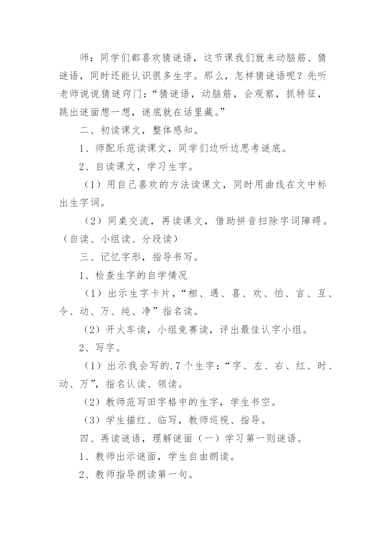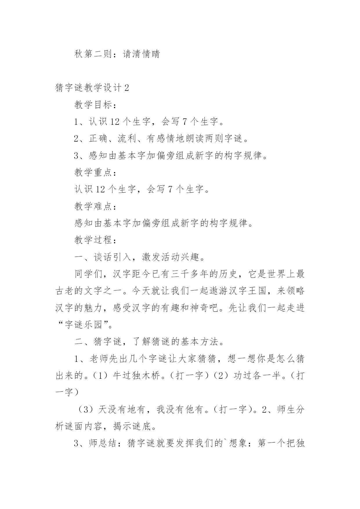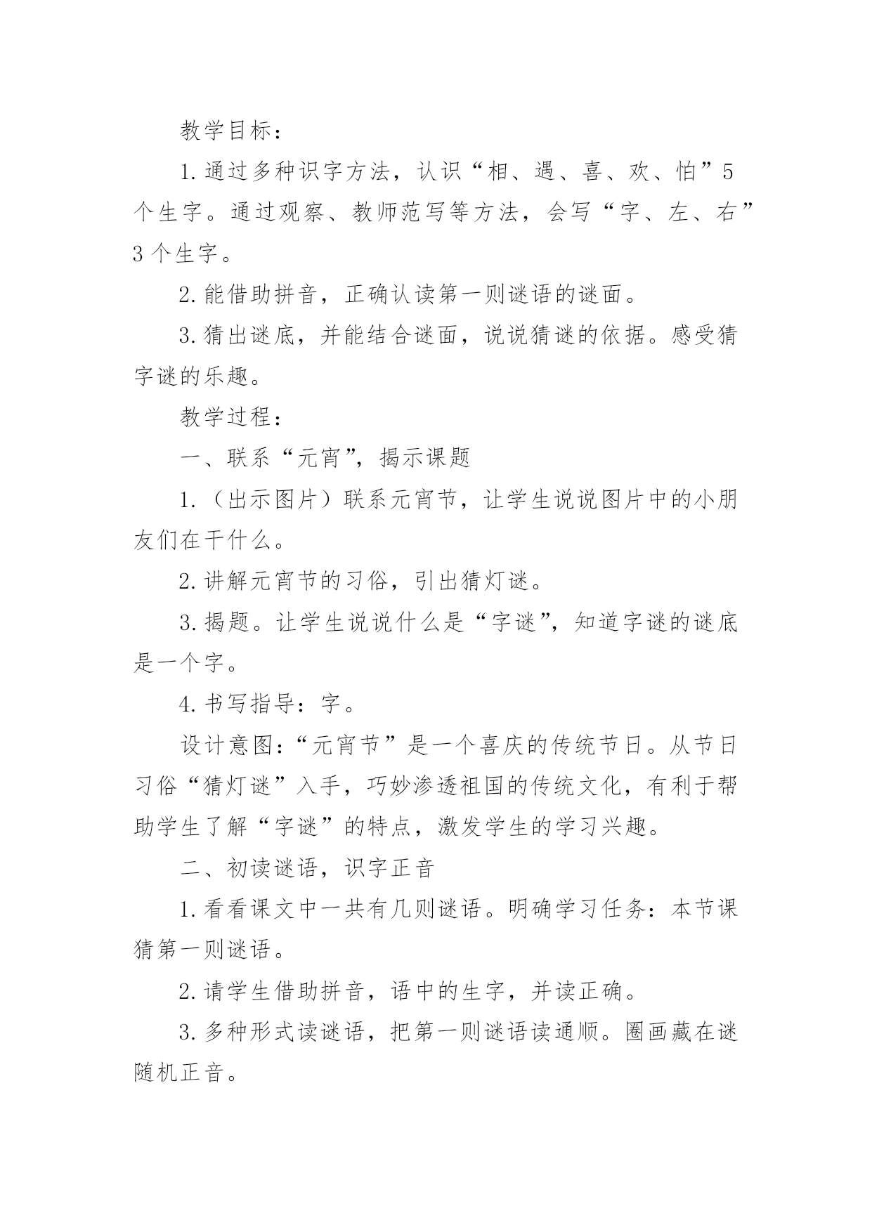 猜字谜教学设计猜字谜教学设计13篇作为一位无私奉献的人民教师,很有必要精心设计一份教学设计,借助教学设计可以让教学工作更加有效地进行。那么写教学设计需要注意哪些问题呢?以下是小编帮大家整理的猜字谜教学设计,希望能够帮助到大家。猜字谜教学设计1教学目标:1、知识目标:正确认读本课“相、遇、喜”等12个生字,会写田字格里的“字、左、右”等7个生字。2、能力目标:学生自主识字,养成良好的写字习惯;能说出自己是怎么猜出谜语的。3、情感目标:有收集谜语和自编谜语的兴趣。教学重点:识字,写字。教学难点:能根据谜面猜出谜底。教学课时:1课时。教学过程:一、谈话激趣,引入新课。师:同学们都喜欢猜谜语,这节课我们就来动脑筋、猜谜语,同时还能认识很多生字。那么,怎样猜谜语呢?先听老师说说猜谜窍门:“猜谜语,动脑筋,会观察,抓特征,跳出谜面想一想,谜底就在话里藏。”二、初读课文,整体感知。1、师配乐范读课文,同学们边听边思考谜底。2、自读课文,学习生字。(1)用自己喜欢的方法读课文,同时用曲线在文中标出生字词。(2)同桌交流,再读课文,借助拼音扫除字词障碍。(自读、小组读、分段读)三、记忆字形,指导书写。1、检查生字的自学情况(1)出示生字卡片,“相、遇、喜、欢、怕、言、互、令、动、万、纯、净”指名读。(2)开火车读,小组竞赛读,评出最佳认字小组。2、写字。(1)出示我会写的.7个生字:“字、左、右、红、时、动、万”,指名认读、领读。(2)教师范写田字格中的生字,学生书空。(3)学生描红、临写,教师巡视、指导。四、再读谜语,理解谜面(一)学习第一则谜语。1、教师出示谜面,学生自由朗读。2、教师指导朗读第一句。师:想想什么是绿色的?什么是红色的?什么时候左右相遇起凉风?3、指导朗读最后两句。师:想想什么最喜欢及时雨?什么最怕水来攻?4、想一想谜底会是什么字?学生猜出时,教师出示谜底卡片。5、回想一下是怎么猜出谜底的?学生交流。6、背诵谜语。(二)学习第二则谜语。1、复习汉字:请、情、晴、清。精、睛。2、请两个同学表演互相礼貌用语的情景,让大家观察,学习他们互相尊重的优点。让学生通过情景表演,用谜语的话说一说,猜出谜底。3、朗读谜语,猜谜底。4、背诵谜语,看谁背得最快。五、总结全文。学了这一课,你学会了什么呢?六、扩展活动1、猜字谜一口咬断牛尾巴(告)天无它大,人有它大。(一)收集谜语。3、自编谜语。板书设计:《4猜字谜》第一则:秋第二则:请清情睛猜字谜教学设计2教学目标:1、认识12个生字,会写7个生字。2、正确、流利、有感情地朗读两则字谜。3、感知由基本字加偏旁组成新字的构字规律。教学重点:认识12个生字,会写7个生字。教学难点:感知由基本字加偏旁组成新字的构字规律。教学过程:一、谈话引入,激发活动兴趣。同学们,汉字距今已有三千多年的历史,它是世界上最古老的文字之一。今天就让我们一起遨游汉字王国,来领略汉字的魅力,感受汉字的有趣和神奇吧。先让我们一起走进“字谜乐园”。二、猜字谜,了解猜谜的基本方法。1、老师先出几个字谜让大家猜猜,想一想你是怎么猜出来的。(1)牛过独木桥。(打一字)(2)功过各一半。(打一字)(3)天没有地有,我没有他有。(打一字)。2、师生分析谜面内容,揭示谜底。3、师总结:猜字谜就要发挥我们的`想象:第一个把独木桥想象成一横,这种猜谜方法叫“象形法”。第二个根据谜面的暗示,对原来的字进行分拆,然后重新加以组合,这种方法我们称之为“组合法”。第三个谜底隐含在谜面的某个字中,这种猜谜方法叫“隐含法”。三、初读课文,学习生字。1、学生借助拼音自读课文,不认识的生字多读几遍。2、教师范读课文。3、学生一边读一边把“我会认”中的生字在文中找出来,做上标记。4、出示生字,各种形式认读生字,并尝试组词,全班评价。5、指导书写生字,重点指导“左”“右”的区别,“红”和“时”利用和“江”“村”换偏旁的方法来记。四、拓展延伸,布置作业。1、我们了解了一些基本的猜谜方法,也试着运用这些方法学习了课文,大家表现不错。老师也知道大家在课前已经收集了一些字谜。现在,我们就来进行一场小型的猜谜比赛,看哪个小组的同学表现最佳。2、课后搜集字谜,在家里或在学校里进行猜字谜比赛,看谁猜得快,猜得多。5、组织学生回想一下,他们是怎样猜出来的?猜谜有什么窍门?同学之间互相交流。6、尝试背诵谜语。猜字谜教学设计3第一课时教学目标:1.通过多种识字方法,认识“相、遇、喜、欢、怕”5个生字。通过观察、教师范写等方法,会写“字、左、右”3个生字。2.能借助拼音,正确认读第一则谜语的谜面。3.猜出谜底,并能结合谜面,说说猜谜的依据。感受猜字谜的乐趣。教学过程:一、联系“元宵”,揭示课题1.(出示图片)联系元宵节,让学生说说图片中的小朋友们在干什么。2.讲解元宵节的习俗,引出