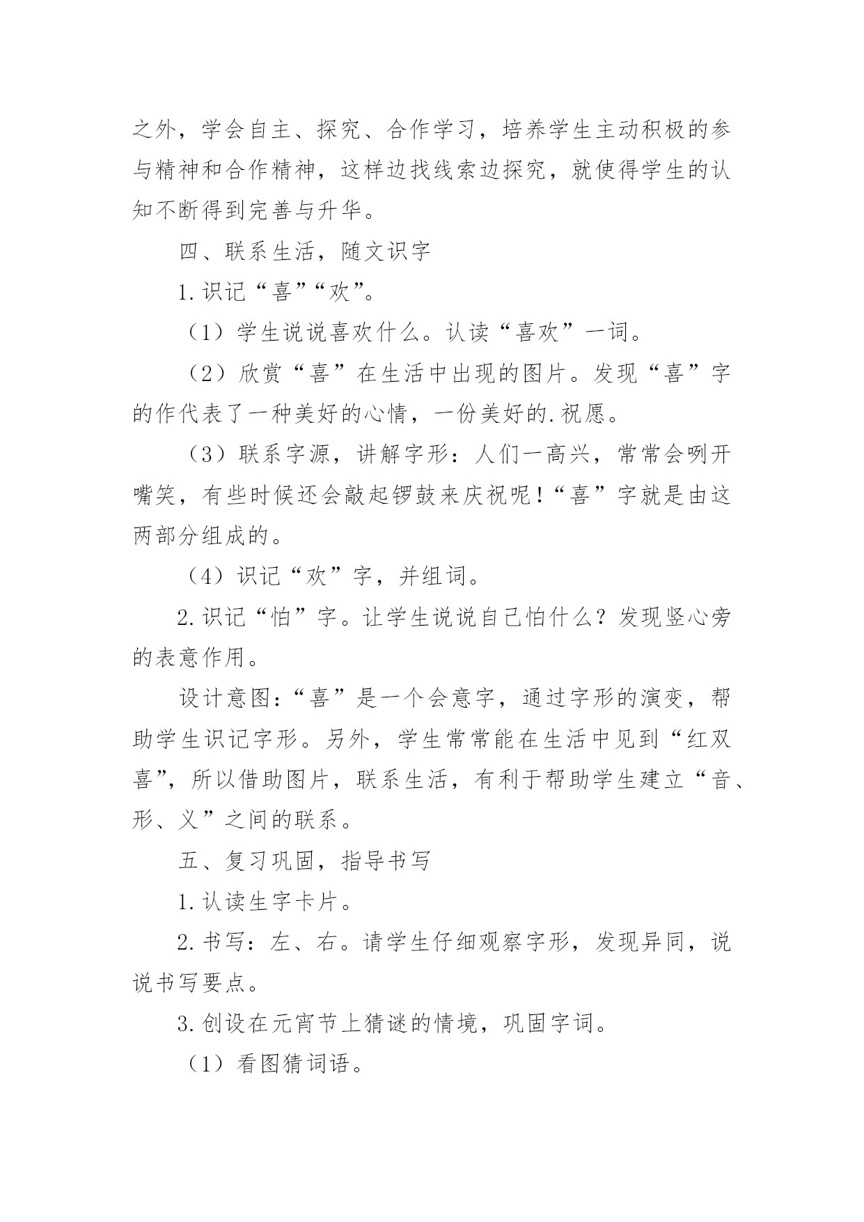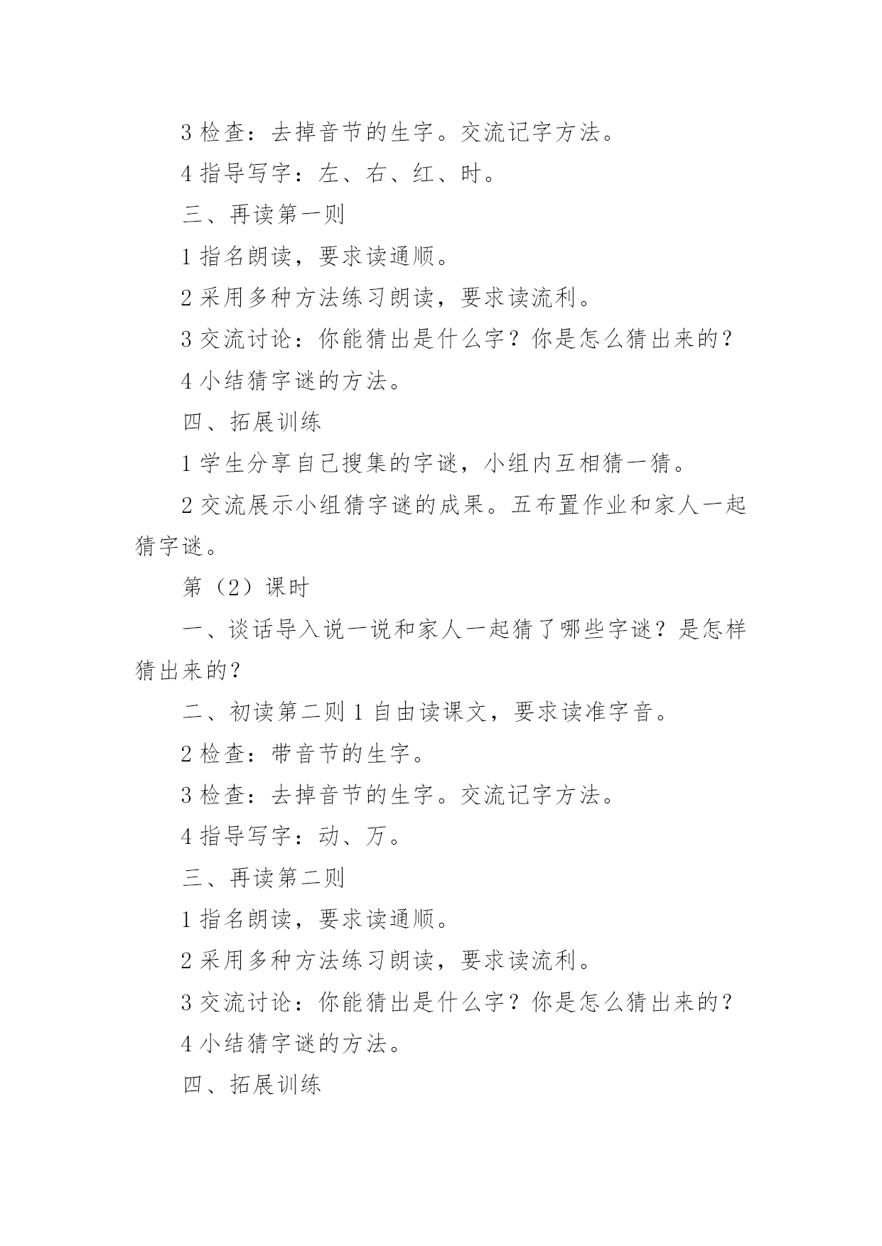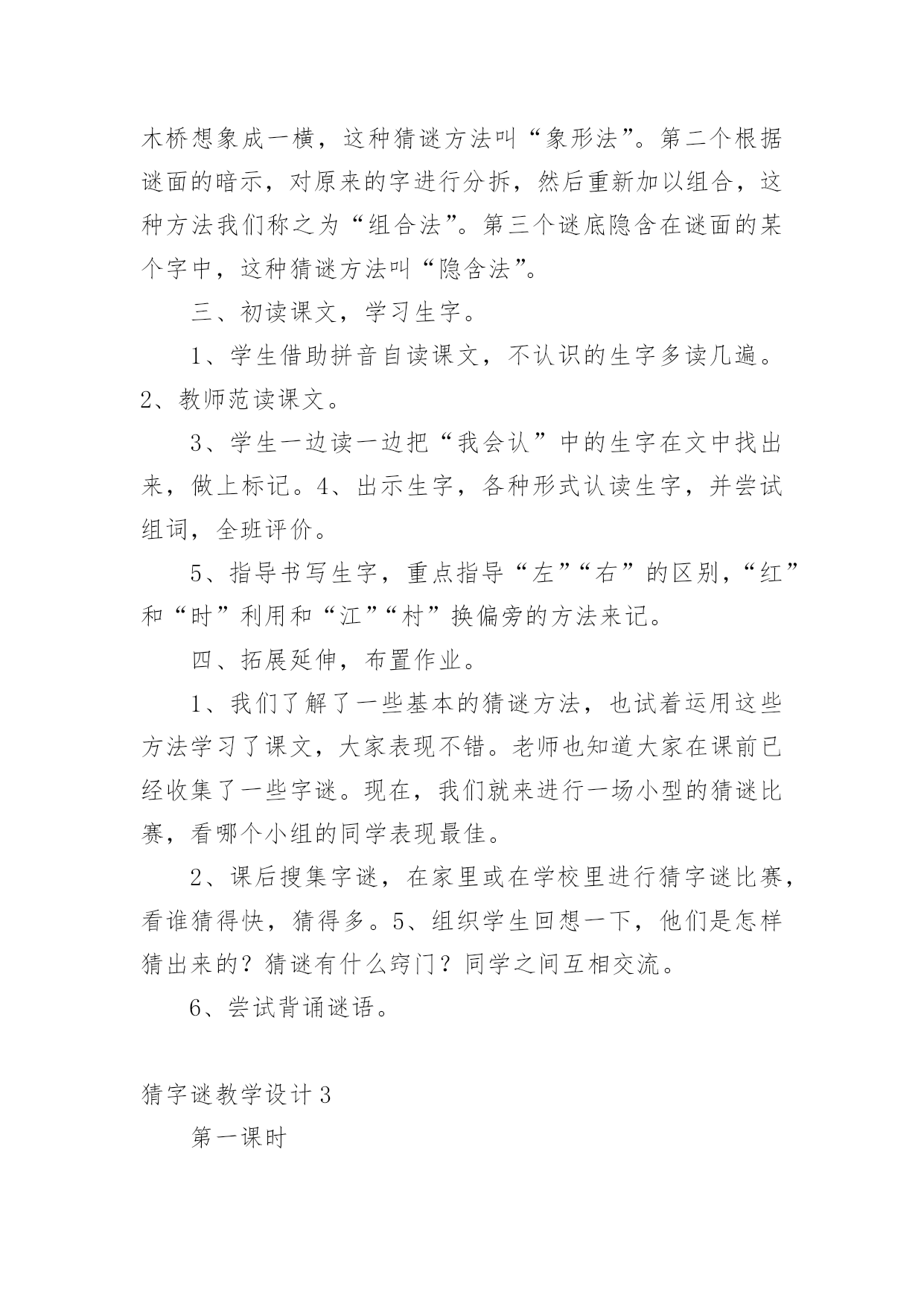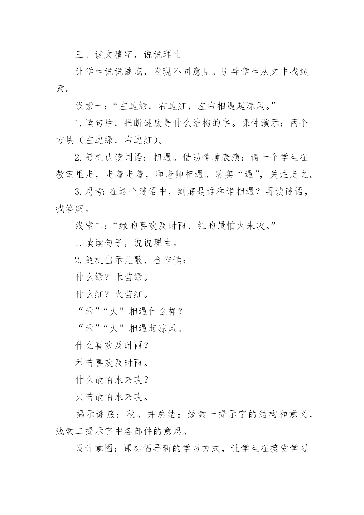 猜字谜教学设计猜字谜教学设计13篇作为一位无私奉献的人民教师,很有必要精心设计一份教学设计,借助教学设计可以让教学工作更加有效地进行。那么写教学设计需要注意哪些问题呢?以下是小编帮大家整理的猜字谜教学设计,希望能够帮助到大家。猜字谜教学设计1教学目标:1、知识目标:正确认读本课“相、遇、喜”等12个生字,会写田字格里的“字、左、右”等7个生字。2、能力目标:学生自主识字,养成良好的写字习惯;能说出自己是怎么猜出谜语的。3、情感目标:有收集谜语和自编谜语的兴趣。教学重点:识字,写字。教学难点:能根据谜面猜出谜底。教学课时:1课时。教学过程:一、谈话激趣,引入新课。师:同学们都喜欢猜谜语,这节课我们就来动脑筋、猜谜语,同时还能认识很多生字。那么,怎样猜谜语呢?先听老师说说猜谜窍门:“猜谜语,动脑筋,会观察,抓特征,跳出谜面想一想,谜底就在话里藏。”二、初读课文,整体感知。1、师配乐范读课文,同学们边听边思考谜底。2、自读课文,学习生字。(1)用自己喜欢的方法读课文,同时用曲线在文中标出生字词。(2)同桌交流,再读课文,借助拼音扫除字词障碍。(自读、小组读、分段读)三、记忆字形,指导书写。1、检查生字的自学情况(1)出示生字卡片,“相、遇、喜、欢、怕、言、互、令、动、万、纯、净”指名读。(2)开火车读,小组竞赛读,评出最佳认字小组。2、写字。(1)出示我会写的.7个生字:“字、左、右、红、时、动、万”,指名认读、领读。(2)教师范写田字格中的生字,学生书空。(3)学生描红、临写,教师巡视、指导。四、再读谜语,理解谜面(一)学习第一则谜语。1、教师出示谜面,学生自由朗读。2、教师指导朗读第一句。师:想想什么是绿色的?什么是红色的?什么时候左右相遇起凉风?3、指导朗读最后两句。师:想想什么最喜欢及时雨?什么最怕水来攻?4、想一想谜底会是什么字?学生猜出时,教师出示谜底卡片。5、回想一下是怎么猜出谜底的?学生交流。6、背诵谜语。(二)学习第二则谜语。1、复习汉字:请、情、晴、清。精、睛。2、请两个同学表演互相礼貌用语的情景,让大家观察,学习他们互相尊重的优点。让学生通过情景表演,用谜语的话说一说,猜出谜底。3、朗读谜语,猜谜底。4、背诵谜语,看谁背得最快。五、总结全文。学了这一课,你学会了什么呢?六、扩展活动1、猜字谜一口咬断牛尾巴(告)天无它大,人有它大。(一)收集谜语。3、自编谜语。板书设计:《4猜字谜》第一则:秋第二则:请清情睛猜字谜教学设计2教学目标:1、认识12个生字,会写7个生字。2、正确、流利、有感情地朗读两则字谜。3、感知由基本字加偏旁组成新字的构字规律。教学重点:认识12个生字,会写7个生字。教学难点:感知由基本字加偏旁组成新字的构字规律。教学过程:一、谈话引入,激发活动兴趣。同学们,汉字距今已有三千多年的历史,它是世界上最古老的文字之一。今天就让我们一起遨游汉字王国,来领略汉字的魅力,感受汉字的有趣和神奇吧。先让我们一起走进“字谜乐园”。二、猜字谜,了解猜谜的基本方法。1、老师先出几个字谜让大家猜猜,想一想你是怎么猜出来的。(1)牛过独木桥。(打一字)(2)功过各一半。(打一字)(3)天没有地有,我没有他有。(打一字)。2、师生分析谜面内容,揭示谜底。3、师总结:猜字谜就要发挥我们的`想象:第一个把独木桥想象成一横,这种猜谜方法叫“象形法”。第二个根据谜面的暗示,对原来的字进行分拆,然后重新加以组合,这种方法我们称之为“组合法”。第三个谜底隐含在谜面的某个字中,这种猜谜方法叫“隐含法”。三、初读课文,学习生字。1、学生借助拼音自读课文,不认识的生字多读几遍。2、教师范读课文。3、学生一边读一边把“我会认”中的生字在文中找出来,做上标记。4、出示生字,各种形式认读生字,并尝试组词,全班评价。5、指导书写生字,重点指导“左”“右”的区别,“红”和“时”利用和“江”“村”换偏旁的方法来记。四、拓展延伸,布置作业。1、我们了解了一些基本的猜谜方法,也试着运用这些方法学习了课文,大家表现不错。老师也知道大家在课前已经收集了一些字谜。现在,我们就来进行一场小型的猜谜比赛,看哪个小组的同学表现最佳。2、课后搜集字谜,在家里或在学校里进行猜字谜比赛,看谁猜得快,猜得多。5、组织学生回想一下,他们是怎样猜出来的?猜谜有什么窍门?同学之间互相交流。6、尝试背诵谜语。猜字谜教学设计3第一课时教学目标:1.通过多种识字方法,认识“相、遇、喜、欢、怕”5个生字。通过观察、教师范写等方法,会写“字、左、右”3个生字。2.能借助拼音,正确认读第一则谜语的谜面。3.猜出谜底,并能结合谜面,说说猜谜的依据。感受猜字谜的乐趣。教学过程:一、联系“元宵”,揭示课题1.(出示图片)联系元宵节,让学生说说图片中的小朋友们在干什么。2.讲解元宵节的习俗,引出