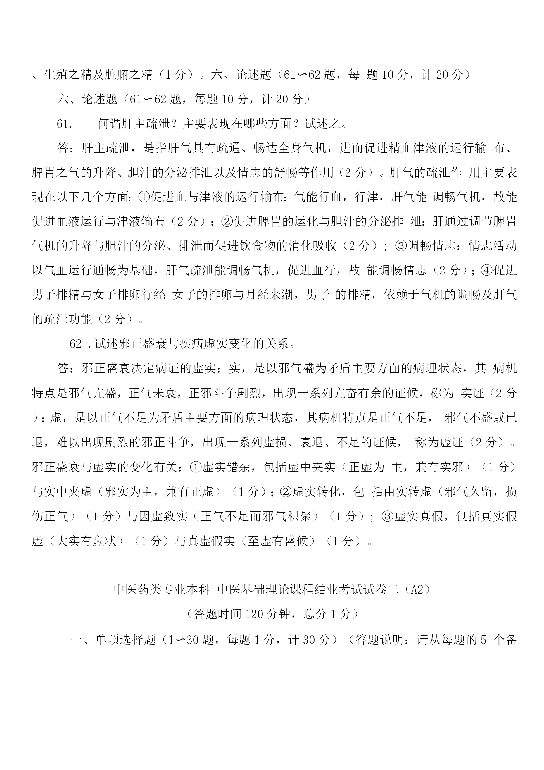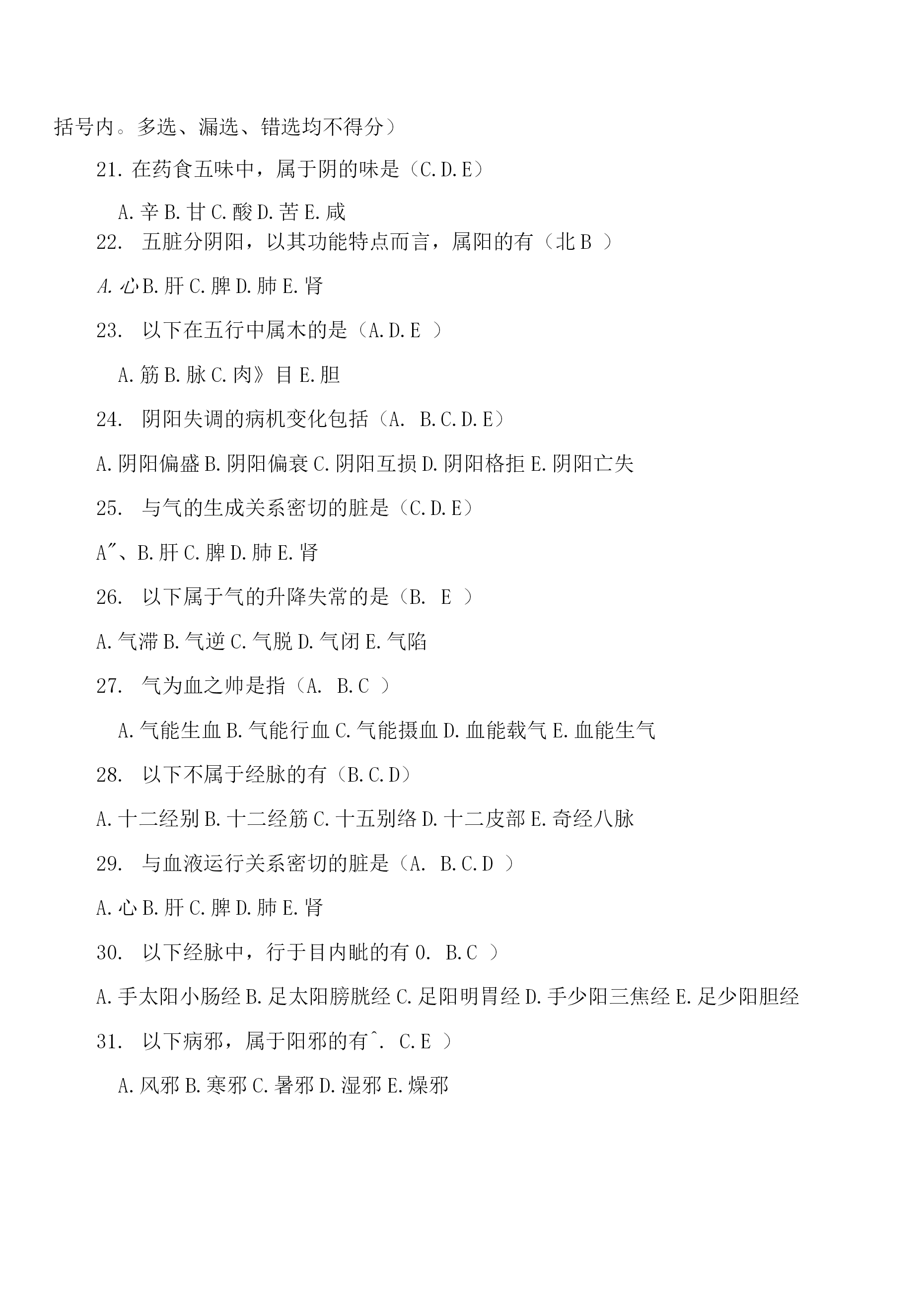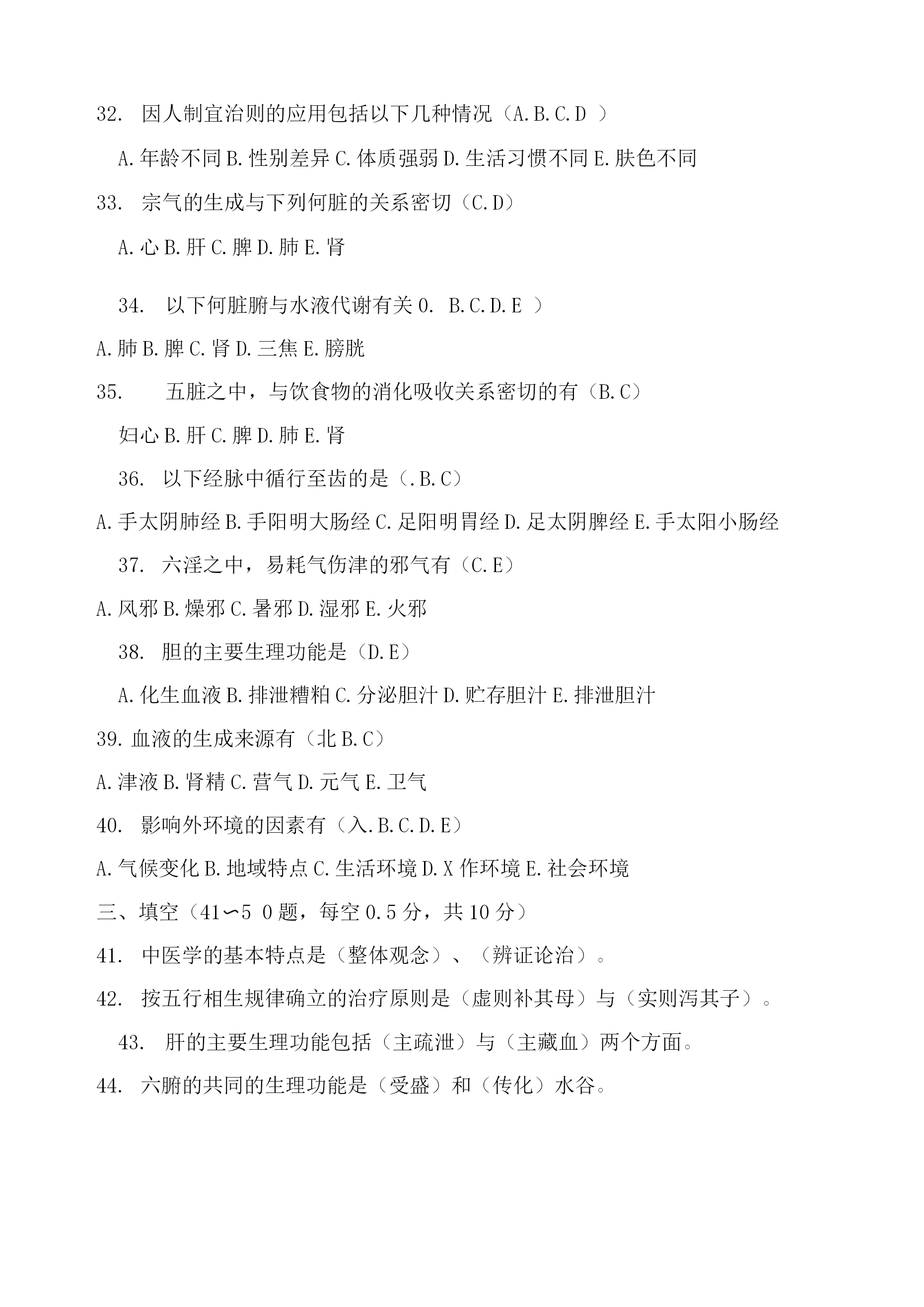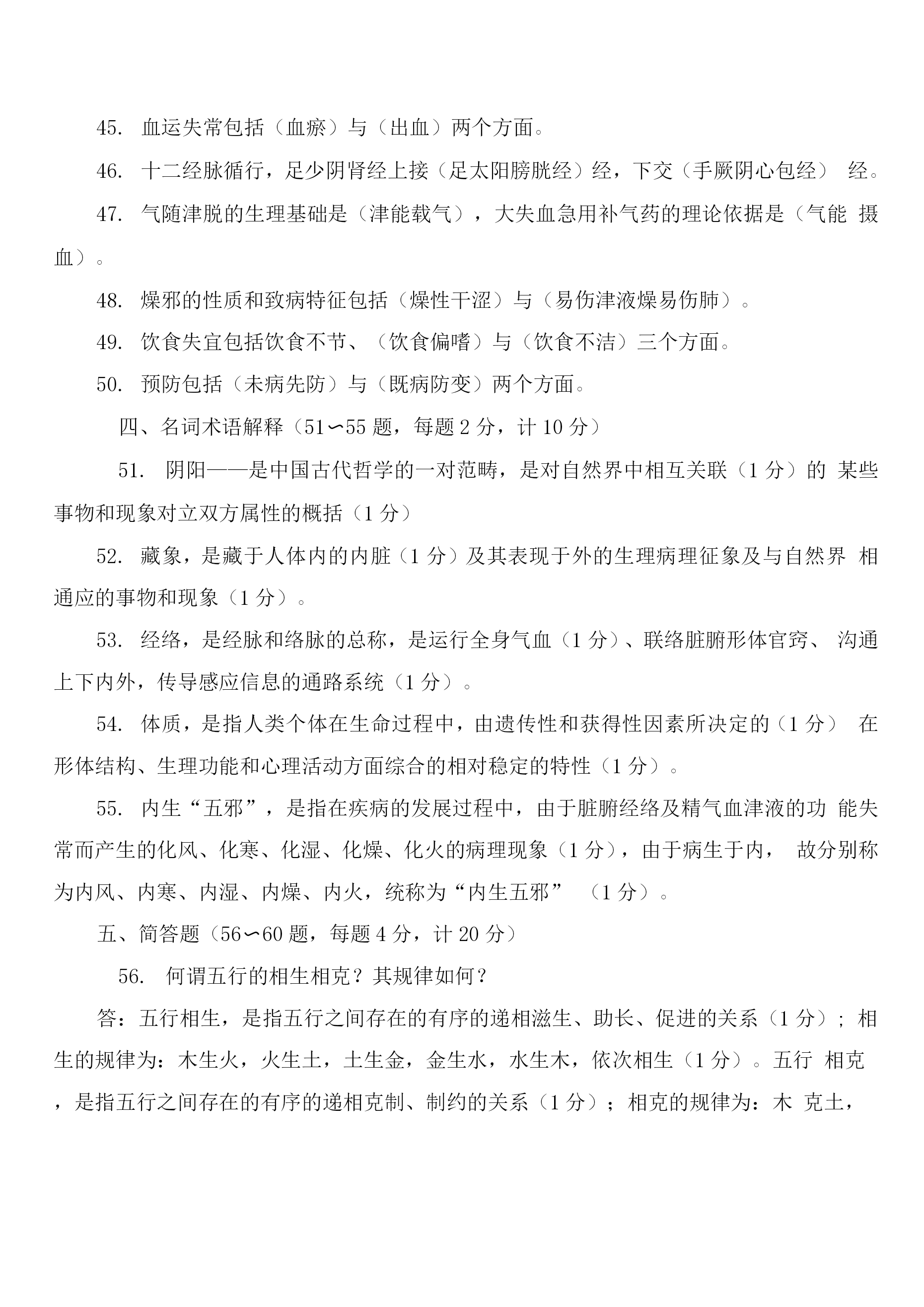 中医基础理论试题及答案中医基础理论课程结业考试试卷一(A1)一、单项选择题中医学理论体系形成于(D)A.隋唐时期B.金元时期C.明清时期D.战国至秦汉时期E.春秋战国时期金元四大家中,“养阴派”的代表人物是(D)A.刘完素B.李杲C.张从正D.朱震亨E.张元素以下属于阴中之阳的是(C)A"、B.脾C.肝D.肾E.肺“佐金平木”法确立的理论依据是(B)A.五行相生B.五行相克C.五行相乘D.五行相侮E.五行制化脏腑之中,被称为“孤府”的是(C)A.胆B.胃C.三焦D.脾E.脑五脏与五窍的关系密切,其中肾开窍于(B)A.鼻B.耳C.D.舌£.目“罢极之本”是指(A)A.肝B.肾C.脾D.胆E.心五脏中,与全身气机调节关系密切的是(A)A.肝与肺B.心与肺C.脾与肺D.肾与肺E.心与肾具有“贯心脉行血气”功能的是(C)A.元气B.心气C.宗气D.营气E.卫气“吐下之余,定无完气”的理论基础是(D)A.气能生津B.气能行津C.气能摄津D.津能载气E.津能化气内脏下垂的主要病机是(C)A.宗气虚8.胃气虚C.脾气虚D.肾气虚E.肺气虚经络系统中,具有加强十二经脉在体表联系的是(D)A.正经B.经别C.经筋D.别络E.奇经手少阴心经与手太阳小肠经的交接部位是(D)A.拇指端B.食指端C.中指端D.小指端E.无名指端14.平素畏热喜凉、好动易躁,易感暑热邪气的体质类型属于(B)A.偏阴质B.偏阳质C.痰湿质D.阴阳平和质E.气虚质六淫邪气中,具有伤津而不耗气致病特征的是(D)A.风邪B.火邪C.暑邪D.燥邪E.以上都不是以下哪一项是错误的(B)A.怒则气上B.思则气缓C.悲则气消D.惊则气乱E.劳则气耗疾病发生的内在依据是(A)A.正气不足B.邪气侵袭C.正邪相争D.体质虚弱E.气候异常真寒假热证的病机是(C)A.阴损及阳B.阳损及阴C.阴盛格阳D.阳盛格阴E.阴盛转阳临床上气虚病变以下列哪项为多见(D)A.脾肾B.肺肾。.心肺D.脾肺£.心肾阳病治阴的方法,适用于下列哪种病证(C)A.阴偏盛B.阳偏盛C.阴偏衰D.阳偏衰E.阳胜则阴病二、多项选择题(21〜40题,每题1分,共20分)(答题说明:下列每题的5个备选答案中至少有2个是正确的。请为每题选择2个及2个以上的正确答案,填在题干后的括号内。多选、漏选、错选均不得分)在药食五味中,属于阴的味是(C.D.E)A.辛B.甘C.酸D.苦E.咸五脏分阴阳,以其功能特点而言,属阳的有(北B)A.心B.肝C.脾D.肺E.肾以下在五行中属木的是(A.D.E)A.筋B.脉C.肉》目E.胆阴阳失调的病机变化包括(A.B.C.D.E)A.阴阳偏盛B.阴阳偏衰C.阴阳互损D.阴阳格拒E.阴阳亡失与气的生成关系密切的脏是(C.D.E)A"、B.肝C.脾D.肺E.肾以下属于气的升降失常的是(B.E)A.气滞B.气逆C.气脱D.气闭E.气陷气为血之帅是指(A.B.C)A.气能生血B.气能行血C.气能摄血D.血能载气E.血能生气以下不属于经脉的有(B.C.D)A.十二经别B.十二经筋C.十五别络D.十二皮部E.奇经八脉与血液运行关系密切的脏是(A.B.C.D)A.心B.肝C.脾D.肺E.肾以下经脉中,行于目内眦的有0.B.C)A.手太阳小肠经B.足太阳膀胱经C.足阳明胃经D.手少阳三焦经E.足少阳胆经以下病邪,属于阳邪的有^.C.E)A.风邪B.寒邪C.暑邪D.湿邪E.燥邪因人制宜治则的应用包括以下几种情况(A.B.C.D)A.年龄不同B.性别差异C.体质强弱D.生活习惯不同E.肤色不同宗气的生成与下列何脏的关系密切(C.D)A.心B.肝C.脾D.肺E.肾以下何脏腑与水液代谢有关0.B.C.D.E)A.肺B.脾C.肾D.三焦E.膀胱五脏之中,与饮食物的消化吸收关系密切的有(B.C)妇心B.肝C.脾D.肺E.肾以下经脉中循行至齿的是(.B.C)A.手太阴肺经B.手阳明大肠经C.足阳明胃经D.足太阴脾经E.手太阳小肠经六淫之中,易耗气伤津的邪气有(C.E)A.风邪B.燥邪C.暑邪D.湿邪E.火邪胆的主要生理功能是(D.E)A.化生血液B.排泄糟粕C.分泌胆汁D.贮存胆汁E.排泄胆汁血液的生成来源有(北B.C)A.津液B.肾精C.营气D.元气E.卫气影响外环境的因素有(入.B.C.D.E)A.气候变化B.地域特点C.生活环境D.X作环境E.社会环境三、填空(41〜50题,每空0.5分,共10分)中医学的基本特点是(整体观念)、(辨证论治)。按五行相生规律确立的治疗原则是(虚则补其母)与(实则泻其子)。肝的主要生理功能包括(主疏泄)与(主藏血)两个方面