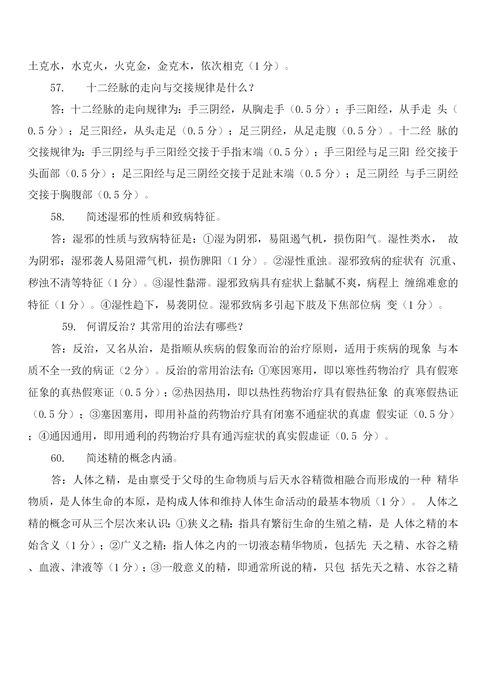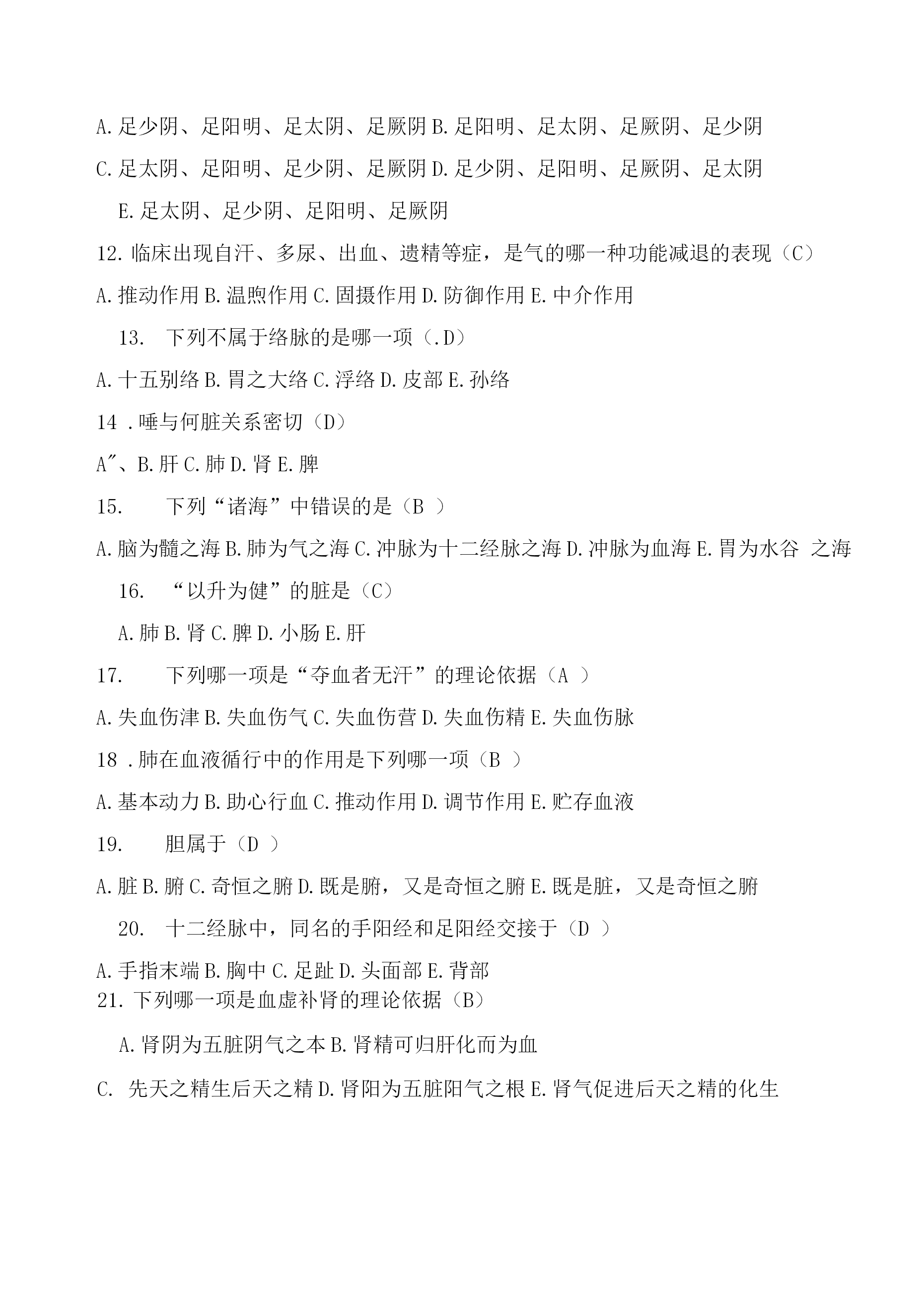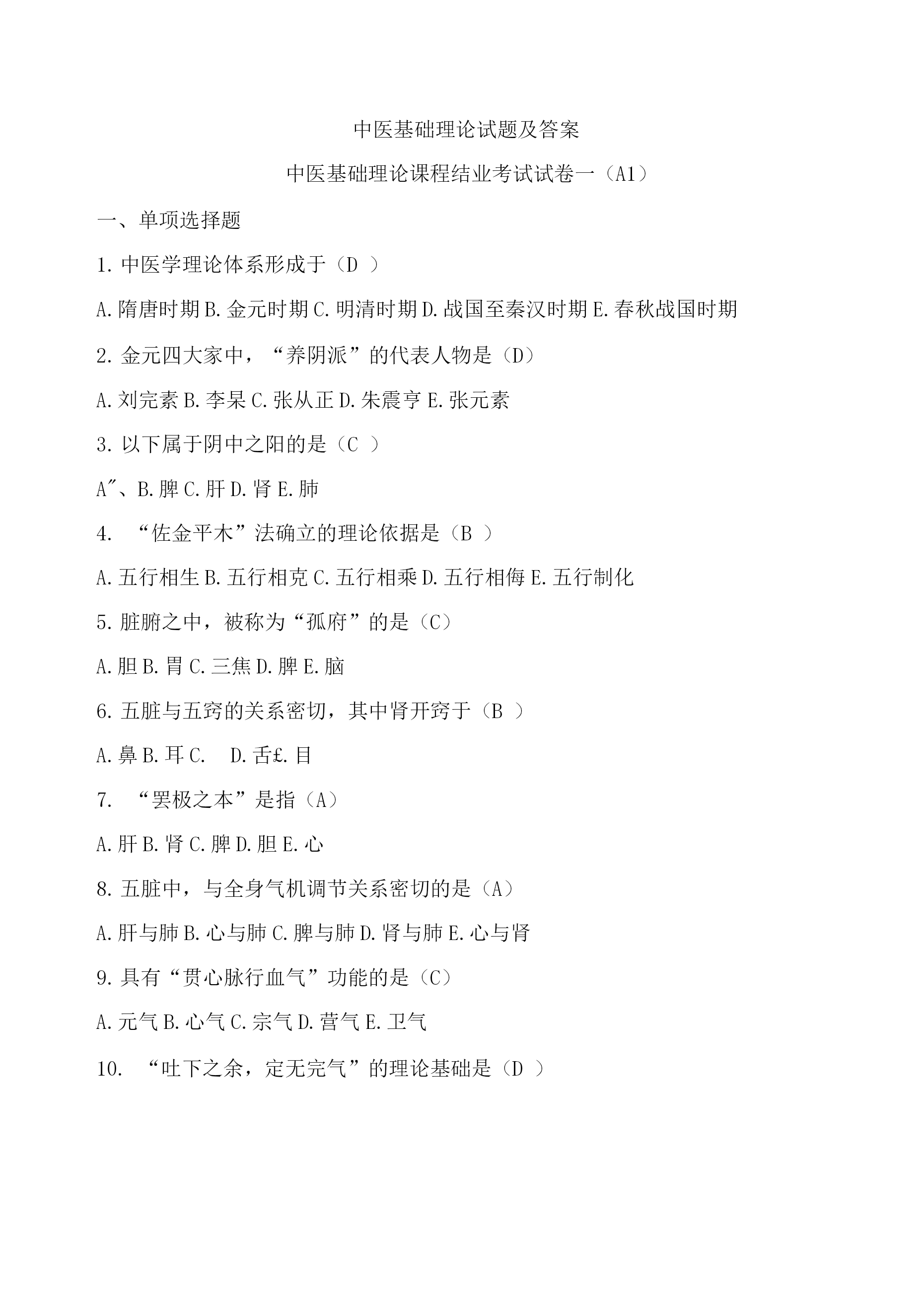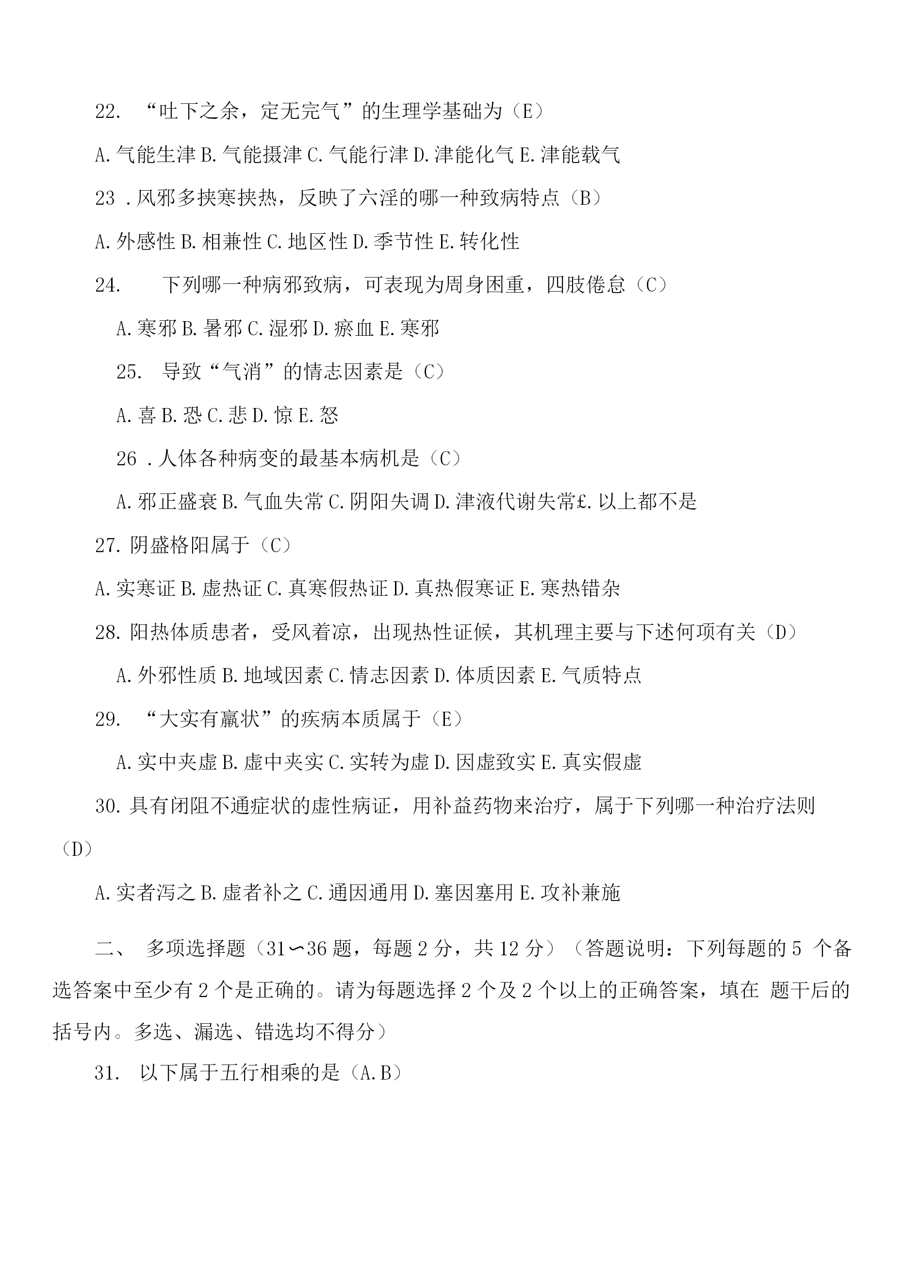 中医基础理论试题及答案中医基础理论课程结业考试试卷一(A1)一、单项选择题中医学理论体系形成于(D)A.隋唐时期B.金元时期C.明清时期D.战国至秦汉时期E.春秋战国时期金元四大家中,“养阴派”的代表人物是(D)A.刘完素B.李杲C.张从正D.朱震亨E.张元素以下属于阴中之阳的是(C)A"、B.脾C.肝D.肾E.肺“佐金平木”法确立的理论依据是(B)A.五行相生B.五行相克C.五行相乘D.五行相侮E.五行制化脏腑之中,被称为“孤府”的是(C)A.胆B.胃C.三焦D.脾E.脑五脏与五窍的关系密切,其中肾开窍于(B)A.鼻B.耳C.D.舌£.目“罢极之本”是指(A)A.肝B.肾C.脾D.胆E.心五脏中,与全身气机调节关系密切的是(A)A.肝与肺B.心与肺C.脾与肺D.肾与肺E.心与肾具有“贯心脉行血气”功能的是(C)A.元气B.心气C.宗气D.营气E.卫气“吐下之余,定无完气”的理论基础是(D)A.气能生津B.气能行津C.气能摄津D.津能载气E.津能化气内脏下垂的主要病机是(C)A.宗气虚8.胃气虚C.脾气虚D.肾气虚E.肺气虚经络系统中,具有加强十二经脉在体表联系的是(D)A.正经B.经别C.经筋D.别络E.奇经手少阴心经与手太阳小肠经的交接部位是(D)A.拇指端B.食指端C.中指端D.小指端E.无名指端14.平素畏热喜凉、好动易躁,易感暑热邪气的体质类型属于(B)A.偏阴质B.偏阳质C.痰湿质D.阴阳平和质E.气虚质六淫邪气中,具有伤津而不耗气致病特征的是(D)A.风邪B.火邪C.暑邪D.燥邪E.以上都不是以下哪一项是错误的(B)A.怒则气上B.思则气缓C.悲则气消D.惊则气乱E.劳则气耗疾病发生的内在依据是(A)A.正气不足B.邪气侵袭C.正邪相争D.体质虚弱E.气候异常真寒假热证的病机是(C)A.阴损及阳B.阳损及阴C.阴盛格阳D.阳盛格阴E.阴盛转阳临床上气虚病变以下列哪项为多见(D)A.脾肾B.肺肾。.心肺D.脾肺£.心肾阳病治阴的方法,适用于下列哪种病证(C)A.阴偏盛B.阳偏盛C.阴偏衰D.阳偏衰E.阳胜则阴病二、多项选择题(21〜40题,每题1分,共20分)(答题说明:下列每题的5个备选答案中至少有2个是正确的。请为每题选择2个及2个以上的正确答案,填在题干后的括号内。多选、漏选、错选均不得分)在药食五味中,属于阴的味是(C.D.E)A.辛B.甘C.酸D.苦E.咸五脏分阴阳,以其功能特点而言,属阳的有(北B)A.心B.肝C.脾D.肺E.肾以下在五行中属木的是(A.D.E)A.筋B.脉C.肉》目E.胆阴阳失调的病机变化包括(A.B.C.D.E)A.阴阳偏盛B.阴阳偏衰C.阴阳互损D.阴阳格拒E.阴阳亡失与气的生成关系密切的脏是(C.D.E)A"、B.肝C.脾D.肺E.肾以下属于气的升降失常的是(B.E)A.气滞B.气逆C.气脱D.气闭E.气陷气为血之帅是指(A.B.C)A.气能生血B.气能行血C.气能摄血D.血能载气E.血能生气以下不属于经脉的有(B.C.D)A.十二经别B.十二经筋C.十五别络D.十二皮部E.奇经八脉与血液运行关系密切的脏是(A.B.C.D)A.心B.肝C.脾D.肺E.肾以下经脉中,行于目内眦的有0.B.C)A.手太阳小肠经B.足太阳膀胱经C.足阳明胃经D.手少阳三焦经E.足少阳胆经以下病邪,属于阳邪的有^.C.E)A.风邪B.寒邪C.暑邪D.湿邪E.燥邪因人制宜治则的应用包括以下几种情况(A.B.C.D)A.年龄不同B.性别差异C.体质强弱D.生活习惯不同E.肤色不同宗气的生成与下列何脏的关系密切(C.D)A.心B.肝C.脾D.肺E.肾以下何脏腑与水液代谢有关0.B.C.D.E)A.肺B.脾C.肾D.三焦E.膀胱五脏之中,与饮食物的消化吸收关系密切的有(B.C)妇心B.肝C.脾D.肺E.肾以下经脉中循行至齿的是(.B.C)A.手太阴肺经B.手阳明大肠经C.足阳明胃经D.足太阴脾经E.手太阳小肠经六淫之中,易耗气伤津的邪气有(C.E)A.风邪B.燥邪C.暑邪D.湿邪E.火邪胆的主要生理功能是(D.E)A.化生血液B.排泄糟粕C.分泌胆汁D.贮存胆汁E.排泄胆汁血液的生成来源有(北B.C)A.津液B.肾精C.营气D.元气E.卫气影响外环境的因素有(入.B.C.D.E)A.气候变化B.地域特点C.生活环境D.X作环境E.社会环境三、填空(41〜50题,每空0.5分,共10分)中医学的基本特点是(整体观念)、(辨证论治)。按五行相生规律确立的治疗原则是(虚则补其母)与(实则泻其子)。肝的主要生理功能包括(主疏泄)与(主藏血)两个方面