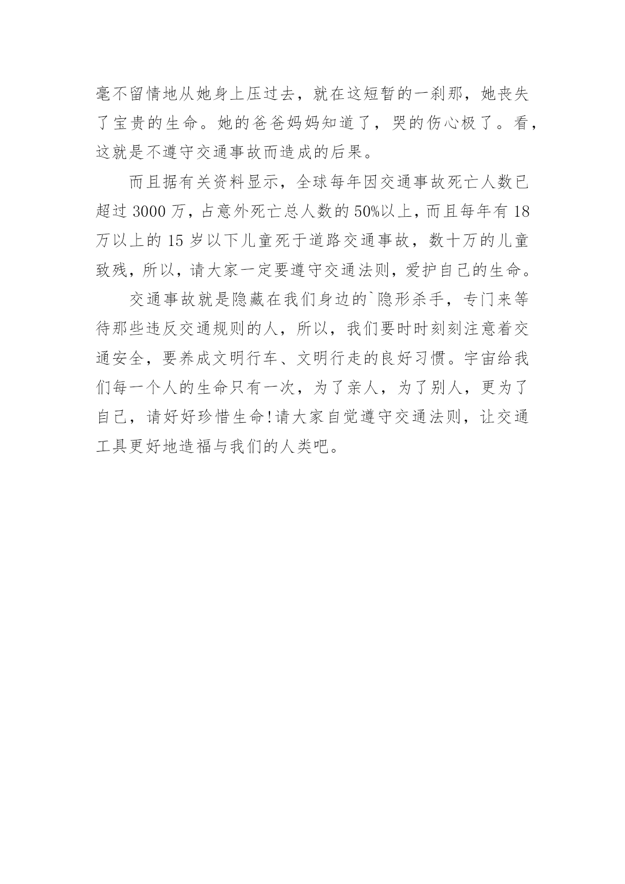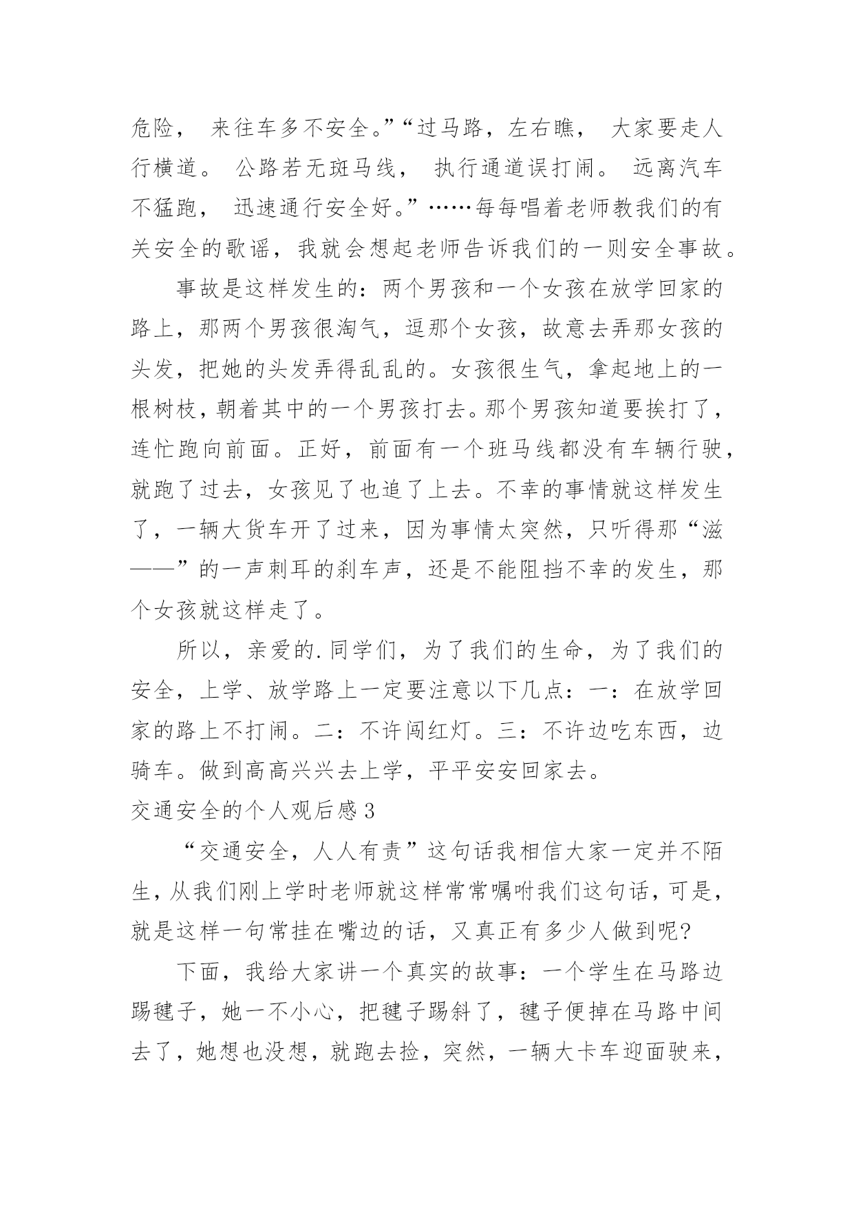 交通安全的个人观后感交通安全的个人观后感3篇认真看完一部作品以后,相信你会有不少感想吧,不能光会看哦,写一篇观后感吧。到底应如何写观后感呢?下面是小编整理的交通安全的个人观后感,仅供参考,希望能够帮助到大家。交通安全的个人观后感1说到“交通”这个词,大家一定会把它和生命连在一起,因为它与我们的生命财产息息相关。随着社会的发展,交通事业为我们的生活和生产提供了便利条件,与此同时,它也时时刻刻威胁着我们的生命财产的安全,交通事故已成为社会的重大问题之一。由于一些人交通意识的淡薄,平坦的马路经常上演一场场人间悲剧,那车轮下的无辜生命和失去亲人催人心碎的`哭声,有谁不会感到痛心,他们带走的是欢乐、幸福、和谐,留下的是灾难、思念、痛苦,这血的教训,生命的代价,难道还换不回我们遵守交通法规,时刻注意安全的自觉性吗?交通安全是生命的纽带,我们要从小树立安全第一的思想,才能实现辉煌的梦想,幸福和欢乐才能永远伴随着我们。同学们,朋友们,请大家警觉起来,坚决遵守交通安全。交通安全的个人观后感2“放学回家不要慌,玩耍不在路中央,追逐打闹最危险,来往车多不安全。”“过马路,左右瞧,大家要走人行横道。公路若无斑马线,执行通道误打闹。远离汽车不猛跑,迅速通行安全好。”……每每唱着老师教我们的有关安全的歌谣,我就会想起老师告诉我们的一则安全事故。事故是这样发生的:两个男孩和一个女孩在放学回家的路上,那两个男孩很淘气,逗那个女孩,故意去弄那女孩的头发,把她的头发弄得乱乱的。女孩很生气,拿起地上的一根树枝,朝着其中的一个男孩打去。那个男孩知道要挨打了,连忙跑向前面。正好,前面有一个班马线都没有车辆行驶,就跑了过去,女孩见了也追了上去。不幸的事情就这样发生了,一辆大货车开了过来,因为事情太突然,只听得那“滋——”的一声刺耳的刹车声,还是不能阻挡不幸的发生,那个女孩就这样走了。所以,亲爱的.同学们,为了我们的生命,为了我们的安全,上学、放学路上一定要注意以下几点:一:在放学回家的路上不打闹。二:不许闯红灯。三:不许边吃东西,边骑车。做到高高兴兴去上学,平平安安回家去。交通安全的个人观后感3“交通安全,人人有责”这句话我相信大家一定并不陌生,从我们刚上学时老师就这样常常嘱咐我们这句话,可是,就是这样一句常挂在嘴边的话,又真正有多少人做到呢?下面,我给大家讲一个真实的故事:一个学生在马路边踢毽子,她一不小心,把毽子踢斜了,毽子便掉在马路中间去了,她想也没想,就跑去捡,突然,一辆大卡车迎面驶来,毫不留情地从她身上压过去,就在这短暂的一刹那,她丧失了宝贵的生命。她的爸爸妈妈知道了,哭的伤心极了。看,这就是不遵守交通事故而造成的后果。而且据有关资料显示,全球每年因交通事故死亡人数已超过3000万,占意外死亡总人数的50%以上,而且每年有18万以上的15岁以下儿童死于道路交通事故,数十万的儿童致残,所以,请大家一定要遵守交通法则,爱护自己的生命。交通事故就是隐藏在我们身边的`隐形杀手,专门来等待那些违反交通规则的人,所以,我们要时时刻刻注意着交通安全,要养成文明行车、文明行走的良好习惯。宇宙给我们每一个人的生命只有一次,为了亲人,为了别人,更为了自己,请好好珍惜生命!请大家自觉遵守交通法则,让交通工具更好地造福与我们的人类吧。