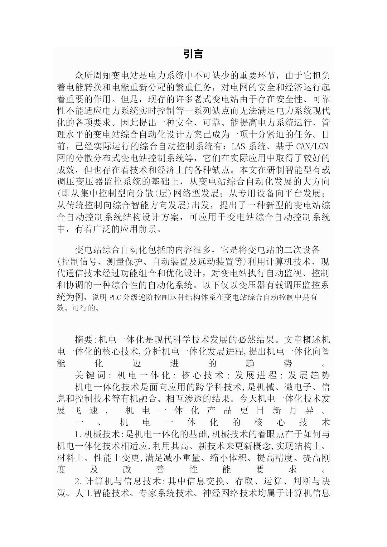 浅谈机电一体化的发展及趋势摘要依据机电一体化技术的发展前景,提出一种新型电动执行机构的设计方案,详细介绍了该执行机构各功能元件的选型与设计、阀位及速度控制原理以及各种关键问题的解决方法。该执行机构将阀门、伺服电机、控制器合为一体,采用8031单片机、变频技术实现了阀门的动作速度和位置控制,解决了阀门的精确定位、阀门柔性开关、极限位置判断、电机保护及模拟信号隔离等技术问题。现场运行情况表明,该电动执行机构具有动作快、保护完善以及便于和HYPERLINK"http://www.lunwentianxia.com/class_free/19_1.shtml"计算机通讯等优点,充分利用了机电一体化技术带来的方便快捷。关键词:电动机阀门,继电器保护,机电一体化技术总结目录一.机电一体化的核心技术...................................................................4二.机电一体化的发展进程...................................................................4三.机电一体化向智能化迈进.................................................................6参考文献..................................................................................7引言众所周知变电站是电力系统中不可缺少的重要环节,由于它担负着电能转换和电能重新分配的繁重任务,对电网的安全和经济运行起着重要的作用。但是,现存的许多老式变电站由于存在安全性、可靠性不能适应电力系统实时控制等一系列缺点而无法满足电力系统现代化的各项要求。因此提出一种安全、可靠、能提高电力系统运行、管理水平的变电站综合自动化设计方案已成为一项十分紧迫的任务。目前,已经实际运行的综合自动控制系统有:LAS系统、基于CAN/LON网的分散分布式变电站控制系统等,它们在实际应用中取得了较好的成效,但也存在着技术和经济上的各种缺点。本文在研制智能型有载调压变压器监控系统的基础上,从变电站综合自动化发展的大方向(即从集中控制型向分散(层)网络型发展;从专用设备向平台发展;从传统控制向综合智能方向发展)出发,提出了一种新型的变电站综合自动控制系统结构设计方案,可应用于变电站综合自动控制系统中,有着广泛的应用前景。变电站综合自动化包括的内容很多,它是将变电站的二次设备(控制信号、测量保护、自动装置及远动装置等)利用计算机技术、现代通信技术经过功能组合和优化设计,对变电站执行自动监视、控制和协调的一种综合性的自动化系统。以下仅以变压器有载调压监控系统为例,说明PLC分级递阶控制这种结构体系在变电站综合自动控制中是有效、可行的。摘要:机电一体化是现代科学技术发展的必然结果。文章概述机电一体化的核心技术,分析机电一体化发展进程,提出机电一体化向智能化迈进的趋势。关键词:机电一体化;核心技术;发展进程;发展趋势机电一体化技术是面向应用的跨学科技术,是机械、微电子、信息和控制技术等有机融合、相互渗透的结果。今天机电一体化技术发展飞速,机电一体化产品更日新月异。一、机电一体化的核心技术1.机械技术:是机电一体化的基础,机械技术的着眼点在于如何与机电一体化技术相适应,利用其高、新技术来更新概念,实现结构上、材料上、性能上变更,满足减小重量、缩小体积、提高精度、提高刚度及改善性能要求。2.计算机与信息技术:其中信息交换、存取、运算、判断与决策、人工智能技术、专家系统技术、神经网络技术均属于计算机信息处理技术。3.系统技术:即以整体概念组织应用各种相关技术,从全局角度和系统目标出发,将总体分解成相互关联的若干功能单元,接口技术是系统技术中一个重要方面,是实现系统各部分有机连接的保证。4.自动控制技术:其范围很广,在控制理论指导下,进行系统设计,设计后的系统仿真,现场调试,控制技术包括如高精度定位控制、速度控制、自适应控制、自诊断校正、补偿、再现、检索等。5.传感检测技术:是系统的感受器官,是实现自动控制、自动调节的关键环节。其功能越强,系统的自动化程序就越高。6.伺服传动技术:包括电动、气动、液压等各种类型的传动装置,伺服系统是实现电信号到机械动作的转换装置与部件、对系统的动态性能、控制质量和功能有决定性的影响。二、机电一体化的发展进程1.数控机床问世:自从1952年美国第1台数控铣床问世至今已50个年头。我国数控机床制造业在80年代曾有过高速发展阶段,尤其是在1999年后,国家向国防工业及关键民用工业部门投入大量技改资