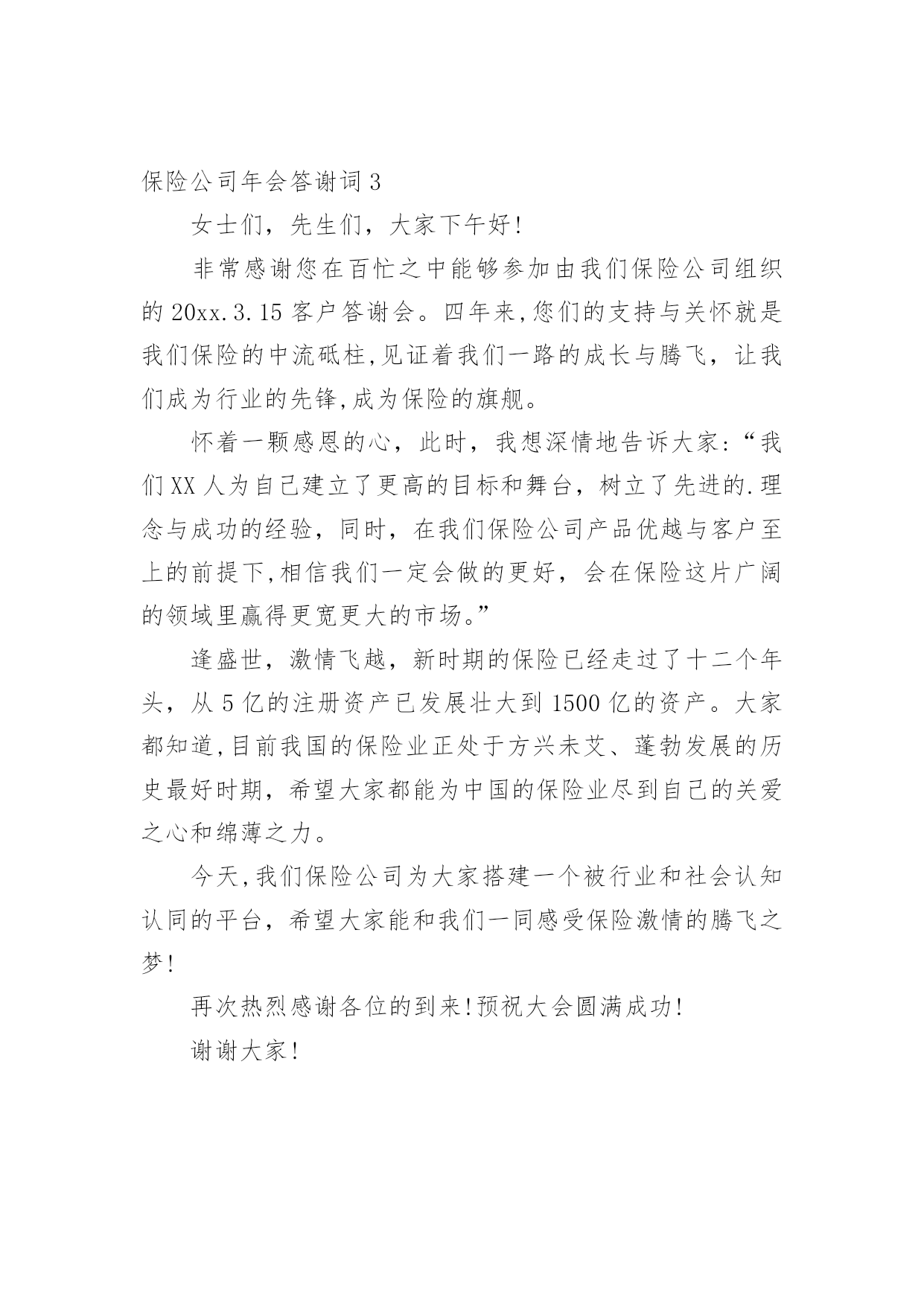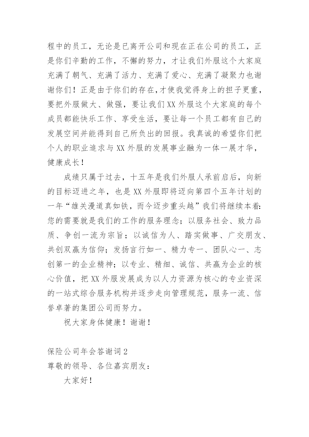 保险公司年会答谢词在当下社会,答谢词在生活中的使用越来越广泛,我们在写答谢词的时候评价要适度,要恰如其分。你所见过的答谢词是什么样的呢?以下是小编帮大家整理的保险公司年会答谢词,仅供参考,希望能够帮助到大家。保险公司年会答谢词1尊敬的各位领导、各位嘉宾、各位朋友、女士们、先生们:大家晚上好!在XX省外国企业服务有限公司成立十五周年之际,我们在这里迎来了公司最尊贵的客人,在此我怀着感恩之心,真诚的表达我的感激之情,正是您们十五年如一日的支持、关爱和呵护,才使得我们XX外服不断发展壮大和成长,在此请允许我代表公司全体员工和我本人向各位来宾表示最深深的感谢和最崇高的敬礼,感谢大家!回想起我们外服公司的发展,至今历历在目。1996年,我们外服公司组建成立,在各级领导和各位朋友的大力支持和帮助下,本着诚信做人、踏实做事的.宗旨,公司不断成长,并获取了一大批忠实的、长期合作的合作伙伴。他们正是在座的各位领导、以及企业界的代表和朋友,正是由于您们不离不弃的信赖与支持,才使得我们公司得以成长、壮大,谢谢您们!同时在此也让我深深的感谢在我们公司十五年成长过程中的员工,无论是已离开公司和现在正在公司的员工,正是你们辛勤的工作,不懈的努力,才让我们外服这个大家庭充满了朝气、充满了活力、充满了爱心、充满了凝聚力也谢谢你们!正是由于你们的存在,才使我觉得身上的担子更重,要把外服做大、做强,要让我们XX外服这个大家庭的每个成员都能快乐工作、享受生活,要让每一个员工都有自己的发展空间并能得到自己所负出的回报。我真诚的希望你们把个人的职业追求与XX外服的发展事业融为一体一展才华,健康成长!成绩只属于过去,十五年是我们外服人承前启后,向新的目标迈进之年,也是XX外服即将迈向第四个五年计划的一年“雄关漫道真如铁,而今迈步重头越”我们将继续本着:您的需要就是我们的工作的服务理念;以服务社会、致力品质、争创一流为宗旨;以诚信为人、踏实做事、广交朋友、共创双赢为信仰;发扬言行如一、精力专一、团队心一、志创第一的企业精神;以专业、精细、诚信、共赢为企业的核心价值,把XX外服发展成为以人力资源为核心的专业资深的一站式综合服务机构并逐步走向管理规范,服务一流、信誉卓著的集团公司而努力。祝大家身体健康!谢谢!保险公司年会答谢词2尊敬的领导、各位嘉宾朋友:大家好!首先我谨代表保险公司全体员工及我的家人对各位在百忙之中来参加感恩客户答谢会表示衷心的感谢和诚挚的欢迎,欢迎你们!今天我怀着一颗无比感恩的心站在这里,心情真的无比激动,如果说要感谢,我要感谢的人真的很多很多……如果说给了我一些荣誉和成绩,那么所有的荣誉和鲜花应属于和在座的每一位,正是你们一路的支持和信任,让我才能有这个机会站在这里,因为有你们的勉励和帮助,让我才能坚信自己的平安之路。回首过去的一年,我经历过许多的拒绝和挫折,也走过了无数个社区的道路,虽然有很多的心酸,但我收获了成长和快乐;也成就了无数人的家庭梦想,让更多的家庭拥有平安依然是我最大的心愿。今天莅临现场的有我的亲戚朋友,新老客户,在此请您相信:您的每一件小事都是我的大事。未来我会以更好的售后服务来回馈各位。也更希望大家在未来的日子里一如既往的`支持我,监督我,指正我,让我在平安的路上走得更远更长。谢谢你们。今天我能站在这里接受表彰,我要借助大家的掌声特别感谢平安的一个人,我们在六年前因保险结缘,后又因保险一起并肩合作,是他在这个寿险的道路上给与我无私帮助和鼓励,他就是我平安的引路人AAA先生,工作中我们虽然有过无数次的分歧和争执,但他依然一如既往的给与我帮助,所以在此借助大家的掌声说声谢谢你!最后,在这元旦佳节来临之际,衷心地祝愿在座新老客户朋友新年快乐!合家幸福!一生平安!谢谢大家!保险公司年会答谢词3女士们,先生们,大家下午好!非常感谢您在百忙之中能够参加由我们保险公司组织的20xx.3.15客户答谢会。四年来,您们的支持与关怀就是我们保险的中流砥柱,见证着我们一路的成长与腾飞,让我们成为行业的先锋,成为保险的旗舰。怀着一颗感恩的心,此时,我想深情地告诉大家:“我们XX人为自己建立了更高的目标和舞台,树立了先进的.理念与成功的经验,同时,在我们保险公司产品优越与客户至上的前提下,相信我们一定会做的更好,会在保险这片广阔的领域里赢得更宽更大的市场。”逢盛世,激情飞越,新时期的保险已经走过了十二个年头,从5亿的注册资产已发展壮大到1500亿的资产。大家都知道,目前我国的保险业正处于方兴未艾、蓬勃发展的历史最好时期,希望大家都能为中国的保险业尽到自己的关爱之心和绵薄之力。今天,我们保险公司为大家搭建一个被行业和社会认知认同的平台,希望大家能和我们一同感受保险激情的腾飞之梦!再次热烈感谢各位的到来!预祝大会圆满成功!谢谢大家!