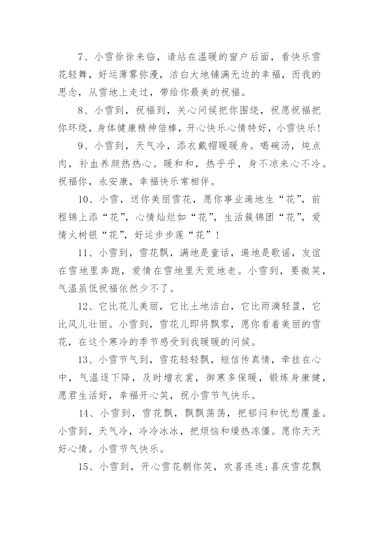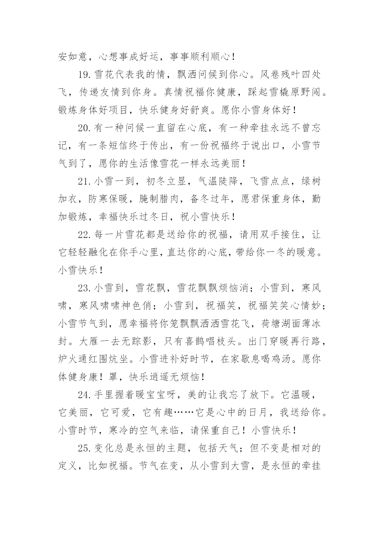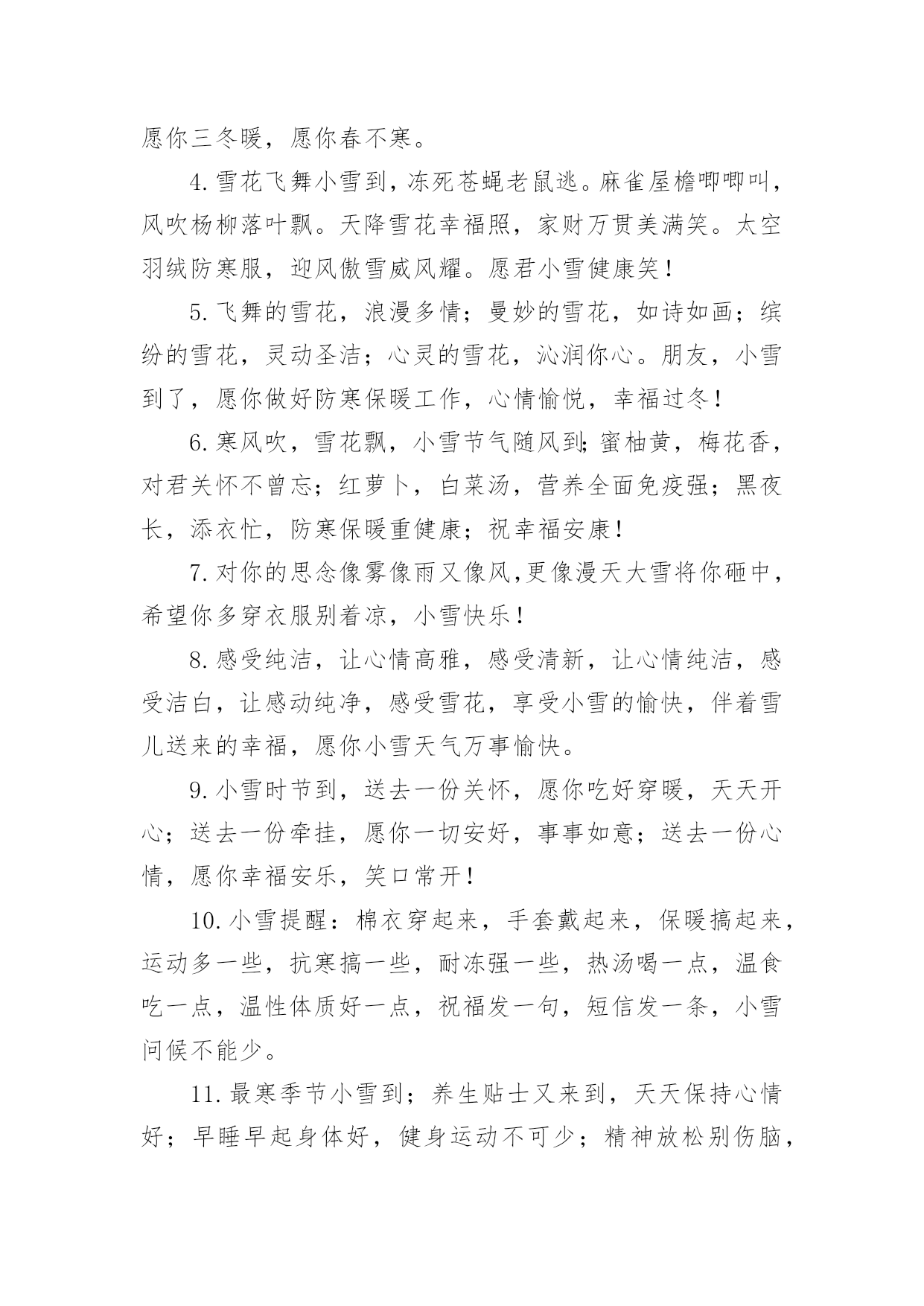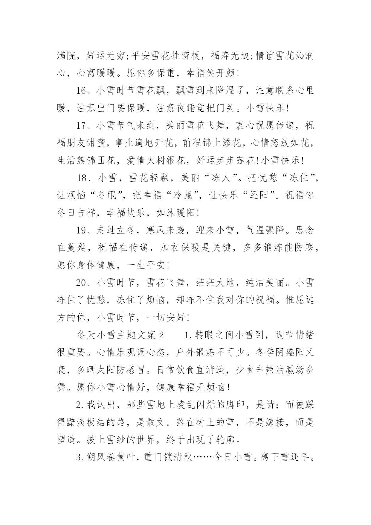 冬天小雪主题文案冬天小雪主题文案随着社交网络的普遍使用,越来越多人钟情于在线上发布文案,文案用以分享自己对生活的思考,表达自己的喜怒哀乐。那什么样的文案才是经典的呢?下面是小编为大家整理的冬天小雪主题文案,欢迎阅读与收藏。冬天小雪主题文案11、小雪到,把快乐送到,小雪飘,把健康送到,小雪绕,把平安送到,小雪扰,把成功送到,小雪闹,把富贵送到,小雪跳,把幸福送到,小雪节气,愿你好我也好。2、今日小雪节气,祝福不曾忘记,不管雪花飞起,还是晴空万里,都有牵挂给你;变化无常天气,一定注意身体,保暖锻炼相结合,健康快乐属于你。3、雪花飘飞小雪到,洒向人间幸福罩。银色北国吉祥耀,漫天飞舞快乐调。思念随风来传递,飞雪诉说我情思。愿你小雪身体好,幸福生活美乐道。4、一个冬天的记忆,是奶茶飘雪和你。5、迎春花,是春天的报晓;牡丹花,是夏天的微笑;金菊花,是秋天的丰收;小雪花,是冬天的来到;小雪到,天气冷,注意保暖,祝小雪快乐!6、小雪到,雪花飘,飘落忧愁和烦恼,寒流至,冷风吹,吹落疲惫和困扰,梅花开,蜜柚黄,送去祝福和吉祥,保身体,勤滋养,祝你幸福永安康!7、小雪徐徐来临,请站在温暖的窗户后面,看快乐雪花轻舞,好运薄雾弥漫,洁白大地铺满无边的幸福,而我的思念,从雪地上走过,带给你最美的祝福。8、小雪到,祝福到,关心问候把你围绕,祝愿祝福把你环绕,身体健康精神倍棒,开心快乐心情特好,小雪快乐!9、小雪到,天气冷,添衣戴帽暖暖身。喝碗汤,炖点肉,补血养颜热热心。暖和和,热乎乎,身不凉来心不冷。祝福你,永安康,幸福快乐常相伴。10、小雪,送你美丽雪花,愿你事业遍地生“花”,前程锦上添“花”,心情灿烂如“花”,生活簇锦团“花”,爱情火树银“花”,好运步步莲“花”!11、小雪到,雪花飘,满地是童话,遍地是歌谣,友谊在雪地里奔跑,爱情在雪地里天荒地老。小雪到,要微笑,气温虽低祝福依然少不了。12、它比花儿美丽,它比土地洁白,它比雨滴轻盈,它比风儿壮丽。小雪到,雪花儿即将飘零,愿你看着美丽的雪花,在这个寒冷的季节感受到我暖暖的问候。13、小雪节气到,雪花轻轻飘,短信传真情,牵挂在心中,气温逐下降,及时增衣裳,御寒多保暖,锻炼身康健,愿君生活好,幸福开心笑,祝小雪节气快乐。14、小雪到,雪花飘,飘飘荡荡,把郁闷和忧愁覆盖。小雪到,天气冷,冷冷冰冰,把烦恼和燥热冻僵。愿你天天好心情。小雪节气快乐。15、小雪到,开心雪花朝你笑,欢喜连连;喜庆雪花飘满院,好运无穷;平安雪花挂窗棂,福寿无边;情谊雪花沁润心,心窝暖暖。愿你多保重,幸福笑开颜!16、小雪时节雪花飘,飘雪到来降温了,注意联系心里暖,注意出门要保暖,注意夜睡觉把门关。小雪快乐!17、小雪节气来到,美丽雪花飞舞,衷心祝愿传递,祝福朋友甜蜜,事业遍地开花,前程锦上添花,心情怒放如花,生活簇锦团花,爱情火树银花,好运步步莲花!小雪快乐!18、小雪,雪花轻飘,美丽“冻人”。把忧愁“冻住”,让烦恼“冬眠”,把幸福“冷藏”,让快乐“还阳”。祝福你冬日吉祥,幸福快乐,如沐暖阳!19、走过立冬,寒风来袭,迎来小雪,气温骤降。思念在蔓延,祝福在传递,加衣保暖是关键,多多锻炼能防寒,愿你身体健康,一生平安!20、小雪时节,雪花飞舞,茫茫大地,纯洁美丽。小雪冻住了忧愁,冻住了烦恼,却冻不住我对你的祝福。惟愿远方的你,小雪时节,一切安好!冬天小雪主题文案21.转眼之间小雪到,调节情绪很重要。心情乐观调心态,户外锻炼不可少。冬季阴盛阳又衰,多晒太阳防感冒。日常饮食宜清淡,少食辛辣油腻汤多煲。愿你小雪心情好,健康幸福无烦恼!2.我认出,那些雪地上凌乱闪烁的脚印,是诗;而被踩得黯淡板结的路,是散文。落在树上的雪,不是嫁接,而是塑造。披上雪纱的世界,终于出现了轮廓。3.朔风卷黄叶,重门锁清秋……今日小雪。离下雪还早。愿你三冬暖,愿你春不寒。4.雪花飞舞小雪到,冻死苍蝇老鼠逃。麻雀屋檐唧唧叫,风吹杨柳落叶飘。天降雪花幸福照,家财万贯美满笑。太空羽绒防寒服,迎风傲雪威风耀。愿君小雪健康笑!5.飞舞的雪花,浪漫多情;曼妙的雪花,如诗如画;缤纷的雪花,灵动圣洁;心灵的雪花,沁润你心。朋友,小雪到了,愿你做好防寒保暖工作,心情愉悦,幸福过冬!6.寒风吹,雪花飘,小雪节气随风到;蜜柚黄,梅花香,对君关怀不曾忘;红萝卜,白菜汤,营养全面免疫强;黑夜长,添衣忙,防寒保暖重健康;祝幸福安康!7.对你的思念像雾像雨又像风,更像漫天大雪将你砸中,希望你多穿衣服别着凉,小雪快乐!8.感受纯洁,让心情高雅,感受清新,让心情纯洁,感受洁白,让感动纯净,感受雪花,享受小雪的愉快,伴着雪儿送来的幸福,愿你小雪天气万事愉快。9.小雪时节到,送去一份关怀,愿你吃好穿暖,天天开心;送去一份牵挂,愿你一切安好,事事如意;送去一份心情,愿你幸福安乐,笑口常开!10.小雪提醒: