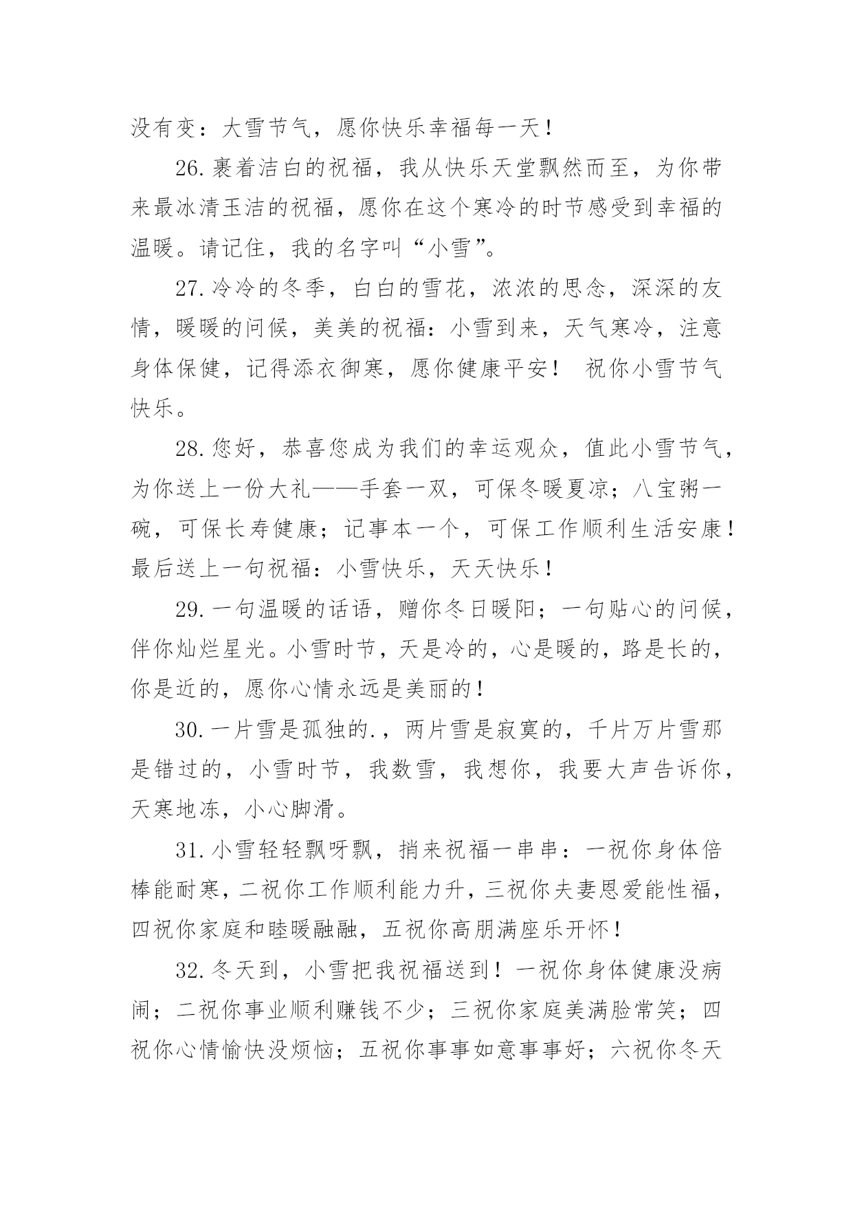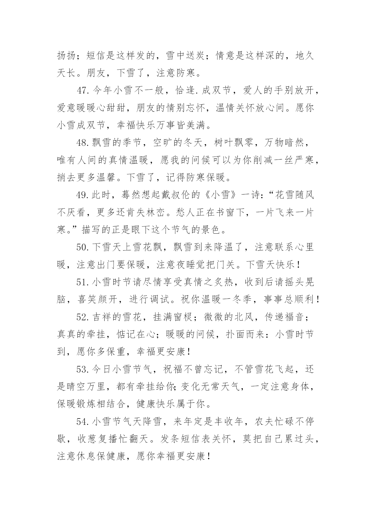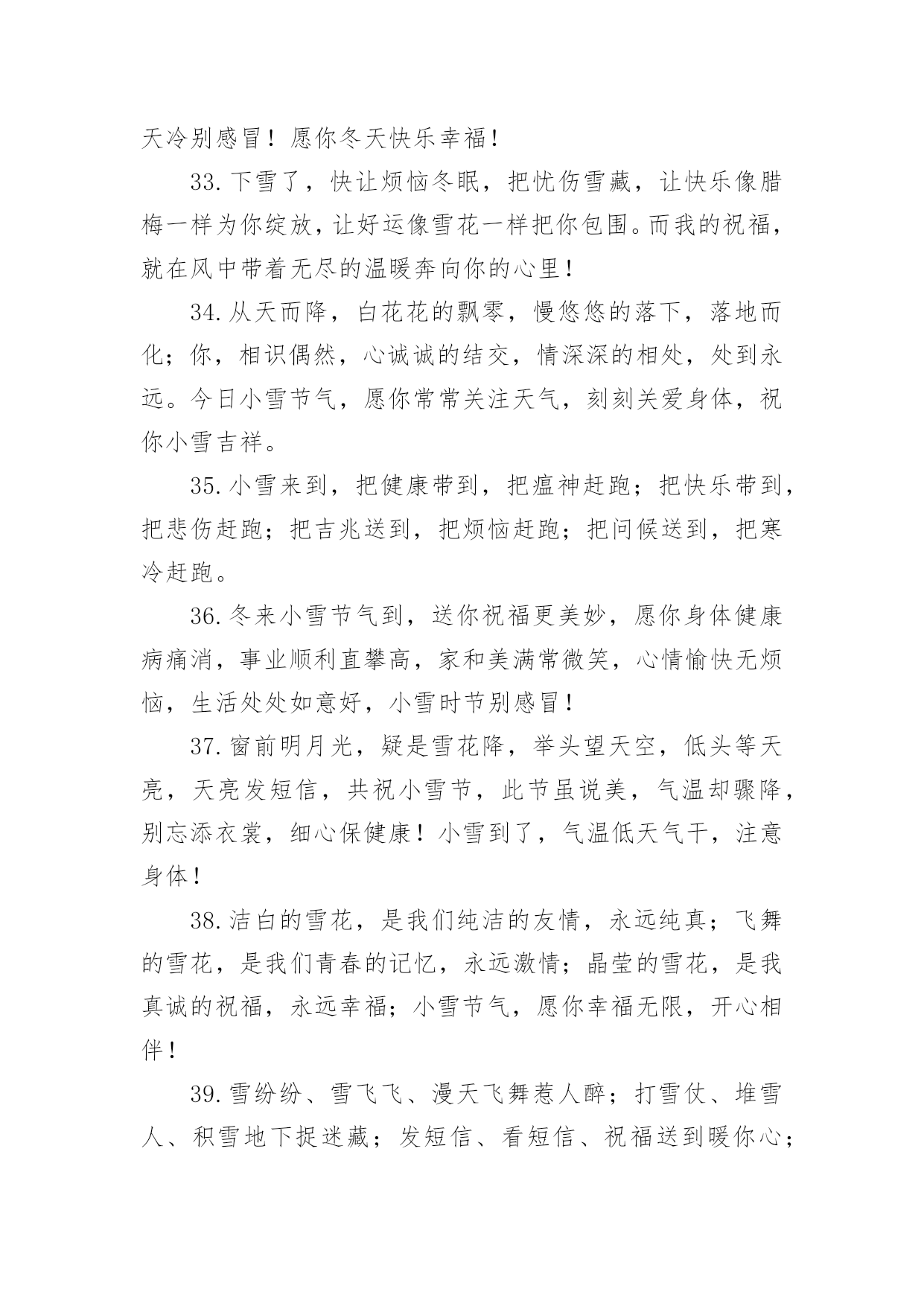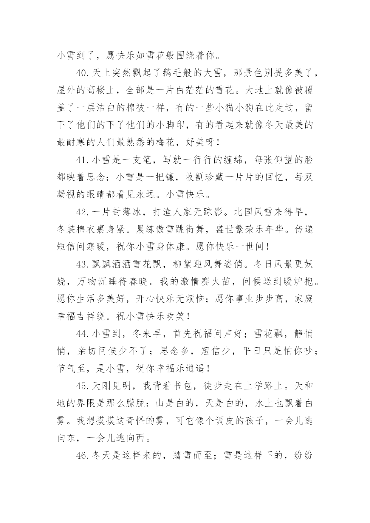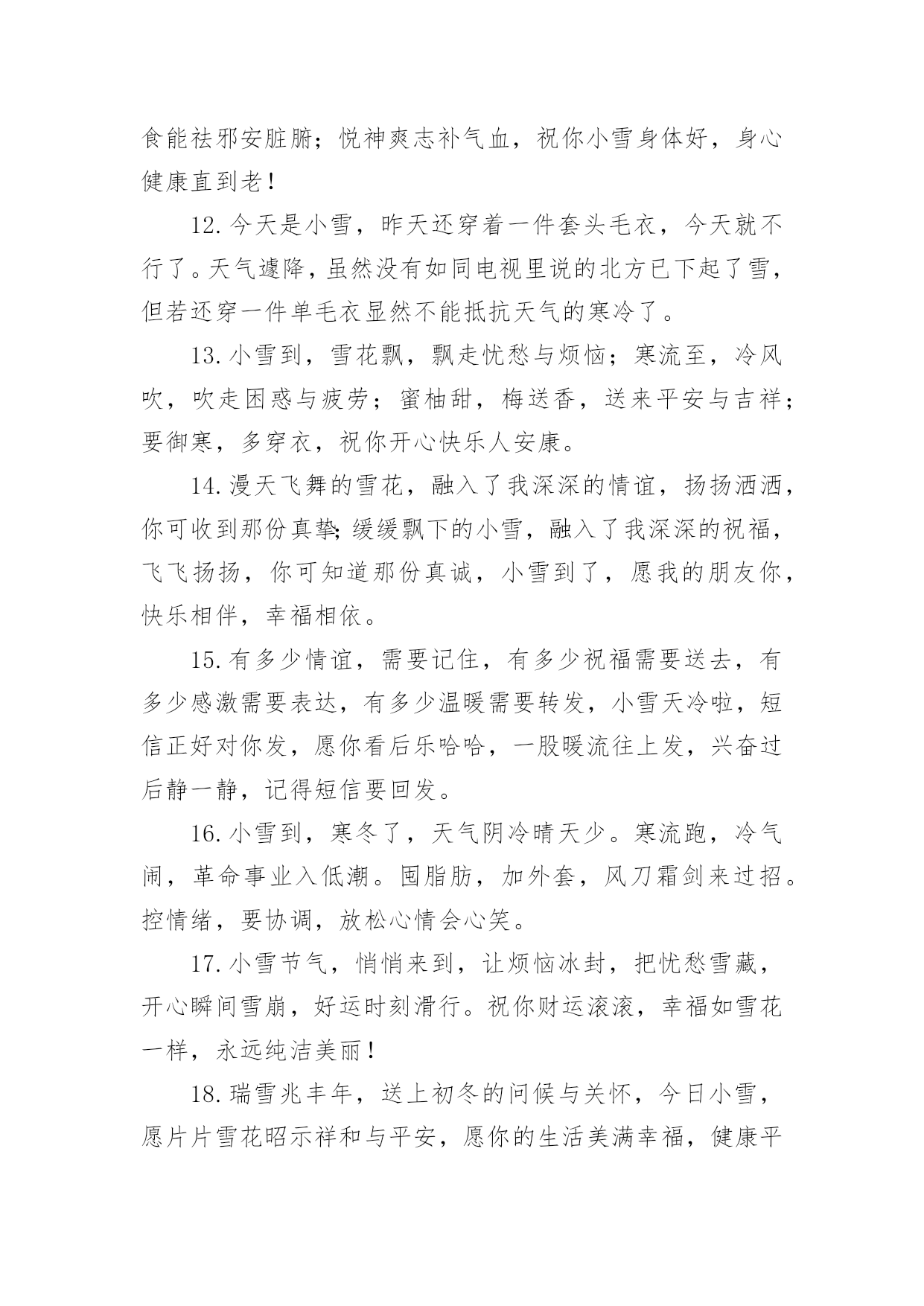 冬天小雪主题文案冬天小雪主题文案随着社交网络的普遍使用,越来越多人钟情于在线上发布文案,文案用以分享自己对生活的思考,表达自己的喜怒哀乐。那什么样的文案才是经典的呢?下面是小编为大家整理的冬天小雪主题文案,欢迎阅读与收藏。冬天小雪主题文案11、小雪到,把快乐送到,小雪飘,把健康送到,小雪绕,把平安送到,小雪扰,把成功送到,小雪闹,把富贵送到,小雪跳,把幸福送到,小雪节气,愿你好我也好。2、今日小雪节气,祝福不曾忘记,不管雪花飞起,还是晴空万里,都有牵挂给你;变化无常天气,一定注意身体,保暖锻炼相结合,健康快乐属于你。3、雪花飘飞小雪到,洒向人间幸福罩。银色北国吉祥耀,漫天飞舞快乐调。思念随风来传递,飞雪诉说我情思。愿你小雪身体好,幸福生活美乐道。4、一个冬天的记忆,是奶茶飘雪和你。5、迎春花,是春天的报晓;牡丹花,是夏天的微笑;金菊花,是秋天的丰收;小雪花,是冬天的来到;小雪到,天气冷,注意保暖,祝小雪快乐!6、小雪到,雪花飘,飘落忧愁和烦恼,寒流至,冷风吹,吹落疲惫和困扰,梅花开,蜜柚黄,送去祝福和吉祥,保身体,勤滋养,祝你幸福永安康!7、小雪徐徐来临,请站在温暖的窗户后面,看快乐雪花轻舞,好运薄雾弥漫,洁白大地铺满无边的幸福,而我的思念,从雪地上走过,带给你最美的祝福。8、小雪到,祝福到,关心问候把你围绕,祝愿祝福把你环绕,身体健康精神倍棒,开心快乐心情特好,小雪快乐!9、小雪到,天气冷,添衣戴帽暖暖身。喝碗汤,炖点肉,补血养颜热热心。暖和和,热乎乎,身不凉来心不冷。祝福你,永安康,幸福快乐常相伴。10、小雪,送你美丽雪花,愿你事业遍地生“花”,前程锦上添“花”,心情灿烂如“花”,生活簇锦团“花”,爱情火树银“花”,好运步步莲“花”!11、小雪到,雪花飘,满地是童话,遍地是歌谣,友谊在雪地里奔跑,爱情在雪地里天荒地老。小雪到,要微笑,气温虽低祝福依然少不了。12、它比花儿美丽,它比土地洁白,它比雨滴轻盈,它比风儿壮丽。小雪到,雪花儿即将飘零,愿你看着美丽的雪花,在这个寒冷的季节感受到我暖暖的问候。13、小雪节气到,雪花轻轻飘,短信传真情,牵挂在心中,气温逐下降,及时增衣裳,御寒多保暖,锻炼身康健,愿君生活好,幸福开心笑,祝小雪节气快乐。14、小雪到,雪花飘,飘飘荡荡,把郁闷和忧愁覆盖。小雪到,天气冷,冷冷冰冰,把烦恼和燥热冻僵。愿你天天好心情。小雪节气快乐。15、小雪到,开心雪花朝你笑,欢喜连连;喜庆雪花飘满院,好运无穷;平安雪花挂窗棂,福寿无边;情谊雪花沁润心,心窝暖暖。愿你多保重,幸福笑开颜!16、小雪时节雪花飘,飘雪到来降温了,注意联系心里暖,注意出门要保暖,注意夜睡觉把门关。小雪快乐!17、小雪节气来到,美丽雪花飞舞,衷心祝愿传递,祝福朋友甜蜜,事业遍地开花,前程锦上添花,心情怒放如花,生活簇锦团花,爱情火树银花,好运步步莲花!小雪快乐!18、小雪,雪花轻飘,美丽“冻人”。把忧愁“冻住”,让烦恼“冬眠”,把幸福“冷藏”,让快乐“还阳”。祝福你冬日吉祥,幸福快乐,如沐暖阳!19、走过立冬,寒风来袭,迎来小雪,气温骤降。思念在蔓延,祝福在传递,加衣保暖是关键,多多锻炼能防寒,愿你身体健康,一生平安!20、小雪时节,雪花飞舞,茫茫大地,纯洁美丽。小雪冻住了忧愁,冻住了烦恼,却冻不住我对你的祝福。惟愿远方的你,小雪时节,一切安好!冬天小雪主题文案21.转眼之间小雪到,调节情绪很重要。心情乐观调心态,户外锻炼不可少。冬季阴盛阳又衰,多晒太阳防感冒。日常饮食宜清淡,少食辛辣油腻汤多煲。愿你小雪心情好,健康幸福无烦恼!2.我认出,那些雪地上凌乱闪烁的脚印,是诗;而被踩得黯淡板结的路,是散文。落在树上的雪,不是嫁接,而是塑造。披上雪纱的世界,终于出现了轮廓。3.朔风卷黄叶,重门锁清秋……今日小雪。离下雪还早。愿你三冬暖,愿你春不寒。4.雪花飞舞小雪到,冻死苍蝇老鼠逃。麻雀屋檐唧唧叫,风吹杨柳落叶飘。天降雪花幸福照,家财万贯美满笑。太空羽绒防寒服,迎风傲雪威风耀。愿君小雪健康笑!5.飞舞的雪花,浪漫多情;曼妙的雪花,如诗如画;缤纷的雪花,灵动圣洁;心灵的雪花,沁润你心。朋友,小雪到了,愿你做好防寒保暖工作,心情愉悦,幸福过冬!6.寒风吹,雪花飘,小雪节气随风到;蜜柚黄,梅花香,对君关怀不曾忘;红萝卜,白菜汤,营养全面免疫强;黑夜长,添衣忙,防寒保暖重健康;祝幸福安康!7.对你的思念像雾像雨又像风,更像漫天大雪将你砸中,希望你多穿衣服别着凉,小雪快乐!8.感受纯洁,让心情高雅,感受清新,让心情纯洁,感受洁白,让感动纯净,感受雪花,享受小雪的愉快,伴着雪儿送来的幸福,愿你小雪天气万事愉快。9.小雪时节到,送去一份关怀,愿你吃好穿暖,天天开心;送去一份牵挂,愿你一切安好,事事如意;送去一份心情,愿你幸福安乐,笑口常开!10.小雪提醒: