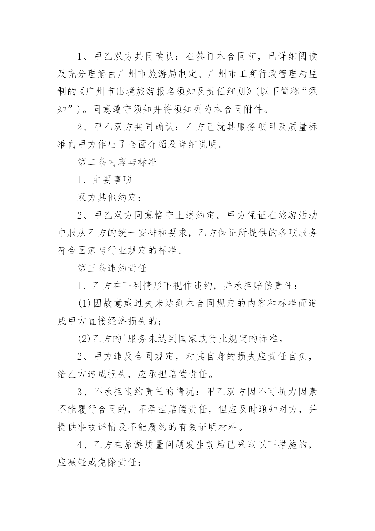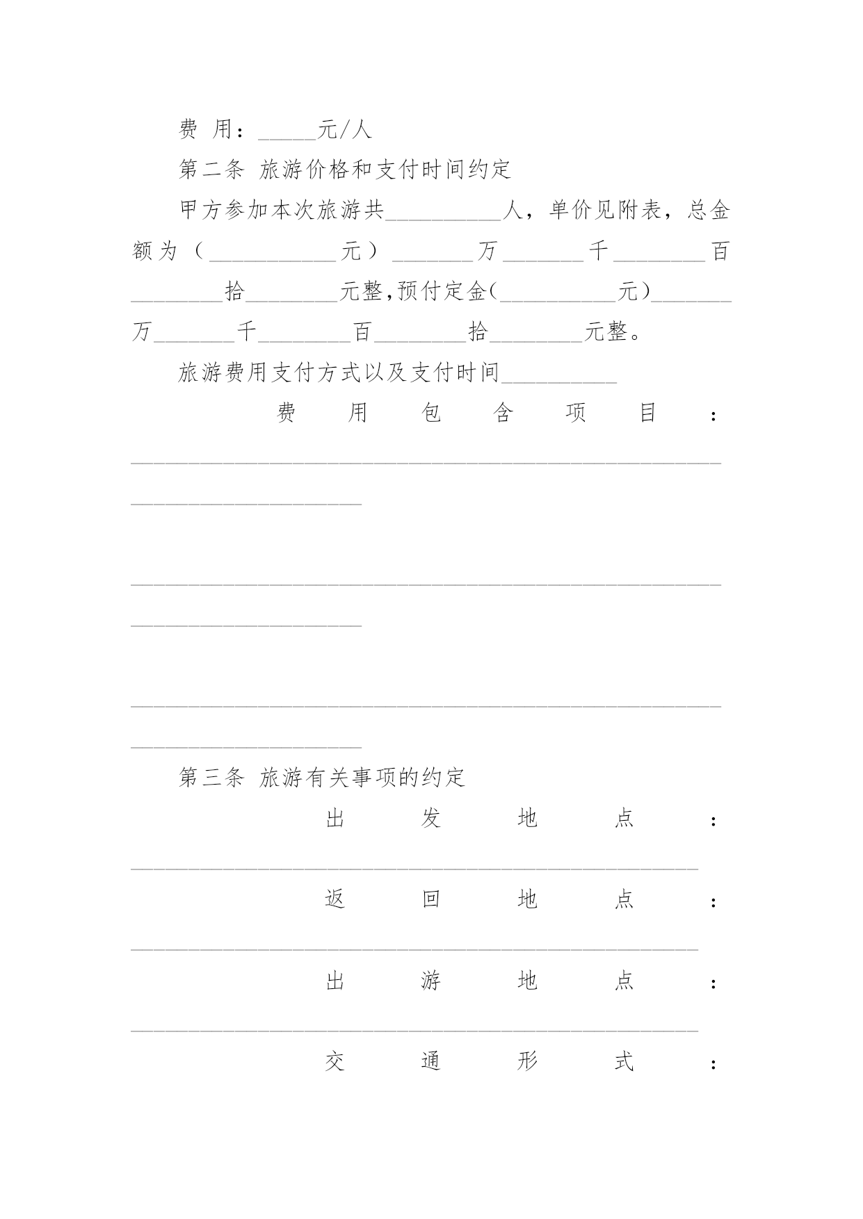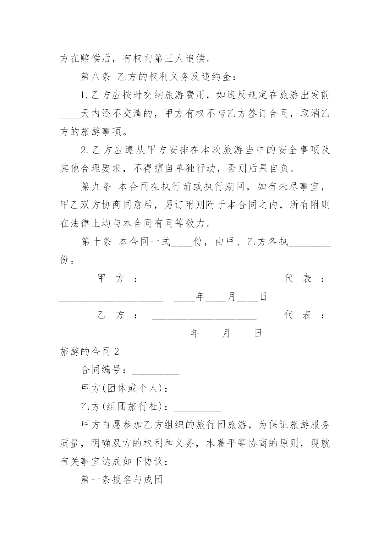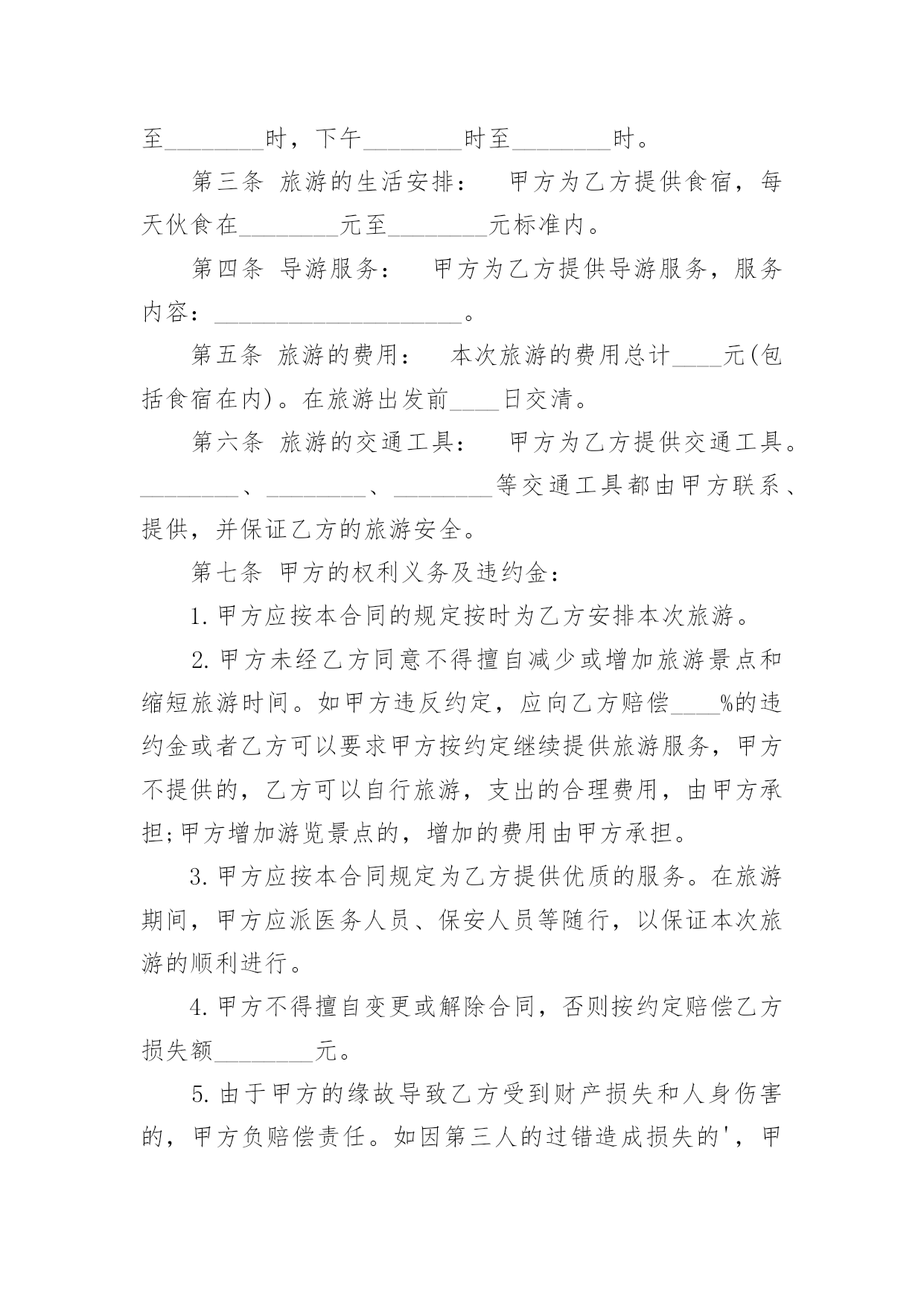 旅游的合同【推荐】旅游的合同随着人们法律意识的加强,合同起到的作用越来越大,签订合同也是最有效的法律依据之一。那么大家知道正规的合同书怎么写吗?下面是小编整理的旅游的合同,希望对大家有所帮助。旅游的合同1甲方:________旅行社(或公司)______________地址:____________________邮码:___________电话:__________法定代表人:________________职务:______________乙方:姓名(或团体名称)________________________地址:____________________邮码:___________电话:__________根据国家有关旅游事业管理的规定,甲乙双方经协商一致,签订本合同,共同信守执行。第一条旅游的时间安排:由甲方在__年__月__日至__年__月__日为乙方提供旅游服务。第二条旅游的地点及每个旅游景点的时间安排:甲方为乙方提供的旅游景点为个。分别是________、________、________。每天的时间安排为上午________时至________时,下午________时至________时。第三条旅游的生活安排:甲方为乙方提供食宿,每天伙食在________元至________元标准内。第四条导游服务:甲方为乙方提供导游服务,服务内容:____________________。第五条旅游的费用:本次旅游的费用总计____元(包括食宿在内)。在旅游出发前____日交清。第六条旅游的交通工具:甲方为乙方提供交通工具。________、________、________等交通工具都由甲方联系、提供,并保证乙方的旅游安全。第七条甲方的权利义务及违约金:1.甲方应按本合同的规定按时为乙方安排本次旅游。2.甲方未经乙方同意不得擅自减少或增加旅游景点和缩短旅游时间。如甲方违反约定,应向乙方赔偿____%的违约金或者乙方可以要求甲方按约定继续提供旅游服务,甲方不提供的,乙方可以自行旅游,支出的合理费用,由甲方承担;甲方增加游览景点的,增加的费用由甲方承担。3.甲方应按本合同规定为乙方提供优质的服务。在旅游期间,甲方应派医务人员、保安人员等随行,以保证本次旅游的顺利进行。4.甲方不得擅自变更或解除合同,否则按约定赔偿乙方损失额________元。5.由于甲方的缘故导致乙方受到财产损失和人身伤害的,甲方负赔偿责任。如因第三人的过错造成损失的',甲方在赔偿后,有权向第三人追偿。第八条乙方的权利义务及违约金:1.乙方应按时交纳旅游费用,如违反规定在旅游出发前____天内还不交清的,甲方有权不与乙方签订合同,取消乙方的旅游事项。2.乙方应遵从甲方安排在本次旅游当中的安全事项及其他合理要求,不得擅自单独行动,否则后果自负。第九条本合同在执行前或执行期间,如有未尽事宜,甲乙双方协商同意后,另订附则附于本合同之内,所有附则在法律上均与本合同有同等效力。第十条本合同一式____份,由甲、乙方各执________份。甲方:____________________代表:________________________年____月____日乙方:____________________代表:________________________年____月____日旅游的合同2合同编号:_________甲方(团体或个人):_________乙方(组团旅行社):_________甲方自愿参加乙方组织的旅行团旅游,为保证旅游服务质量,明确双方的权利和义务,本着平等协商的原则,现就有关事宜达成如下协议:第一条报名与成团1、甲乙双方共同确认:在签订本合同前,已详细阅读及充分理解由广州市旅游局制定、广州市工商行政管理局监制的《广州市出境旅游报名须知及责任细则》(以下简称“须知”)。同意遵守须知并将须知列为本合同附件。2、甲乙双方共同确认:乙方己就其服务项目及质量标准向甲方作出了全面介绍及详细说明。第二条内容与标准1、主要事项双方其他约定:_________2、甲乙双方同意恪守上述约定。甲方保证在旅游活动中服从乙方的统一安排和要求,乙方保证所提供的各项服务符合国家与行业规定的标准。第三条违约责任1、乙方在下列情形下视作违约,并承担赔偿责任:(1)因故意或过失未达到本合同规定的内容和标准而造成甲方直接经济损失的;(2)乙方的'服务未达到国家或行业规定的标准。2、甲方违反合同规定,对其自身的损失应责任自负,给乙方造成损失,应承担赔偿责任。3、不承担违约责任的情况:甲乙双方因不可抗力因素不能履行合同的,不承担赔偿责任,但应及时通知对方,并提供事故详情及不能履约的有效证明材料。4、乙方在旅游质量问题发生前后已采取以下措施的,应减轻或免除责任:(1)对旅游质量和安全状况已