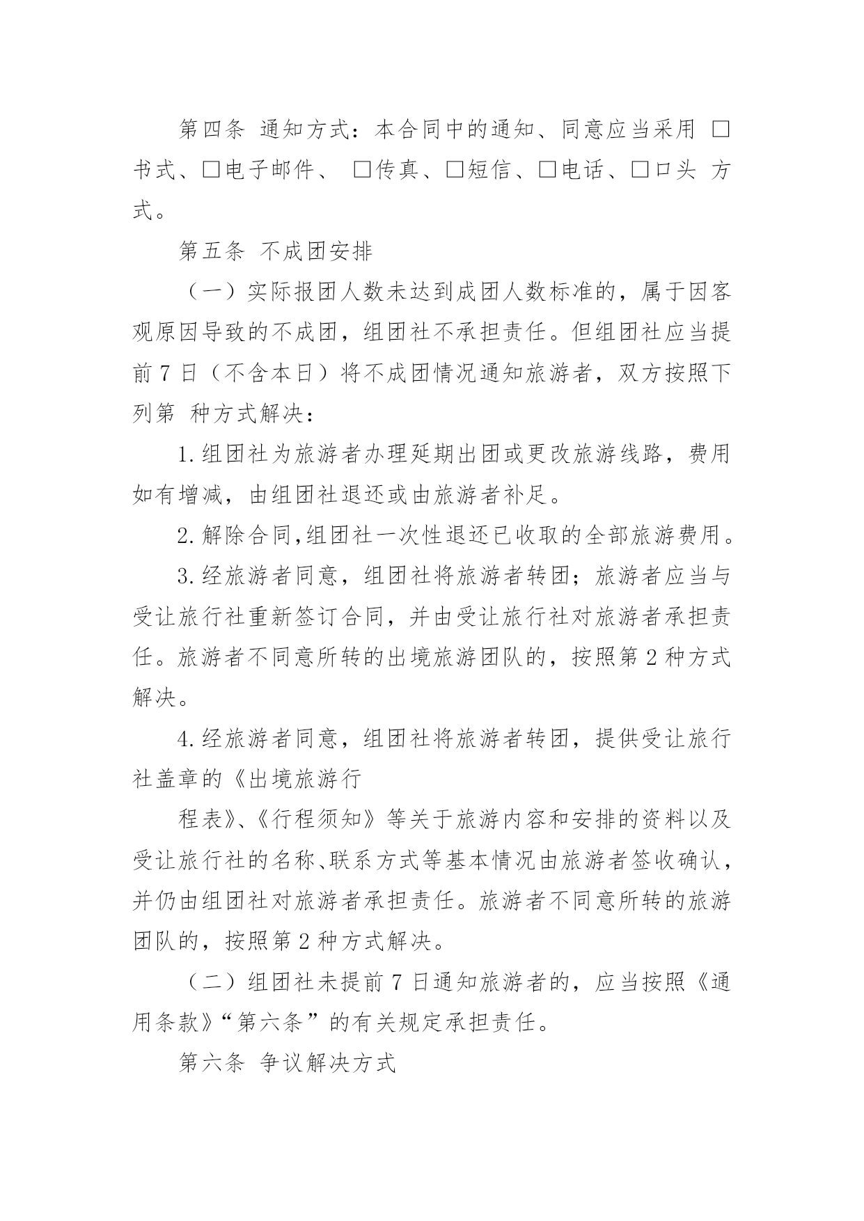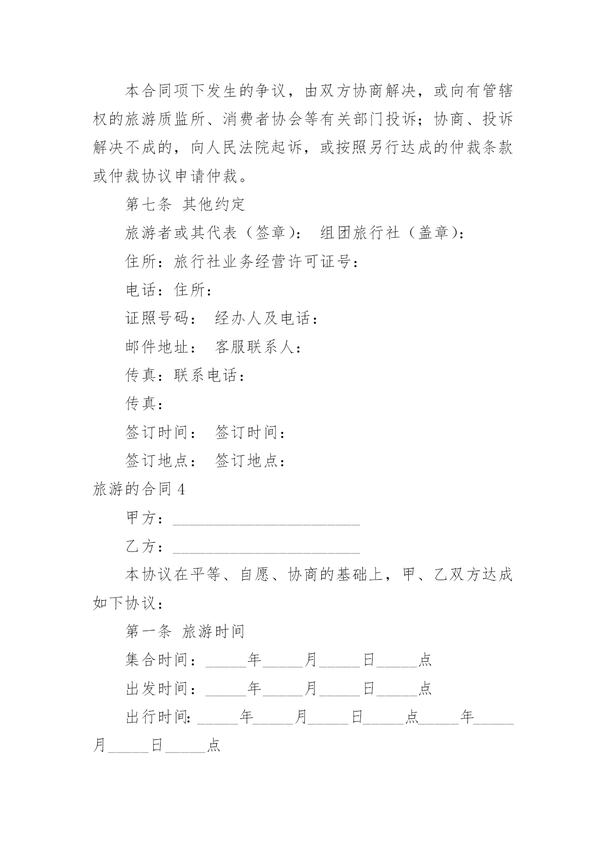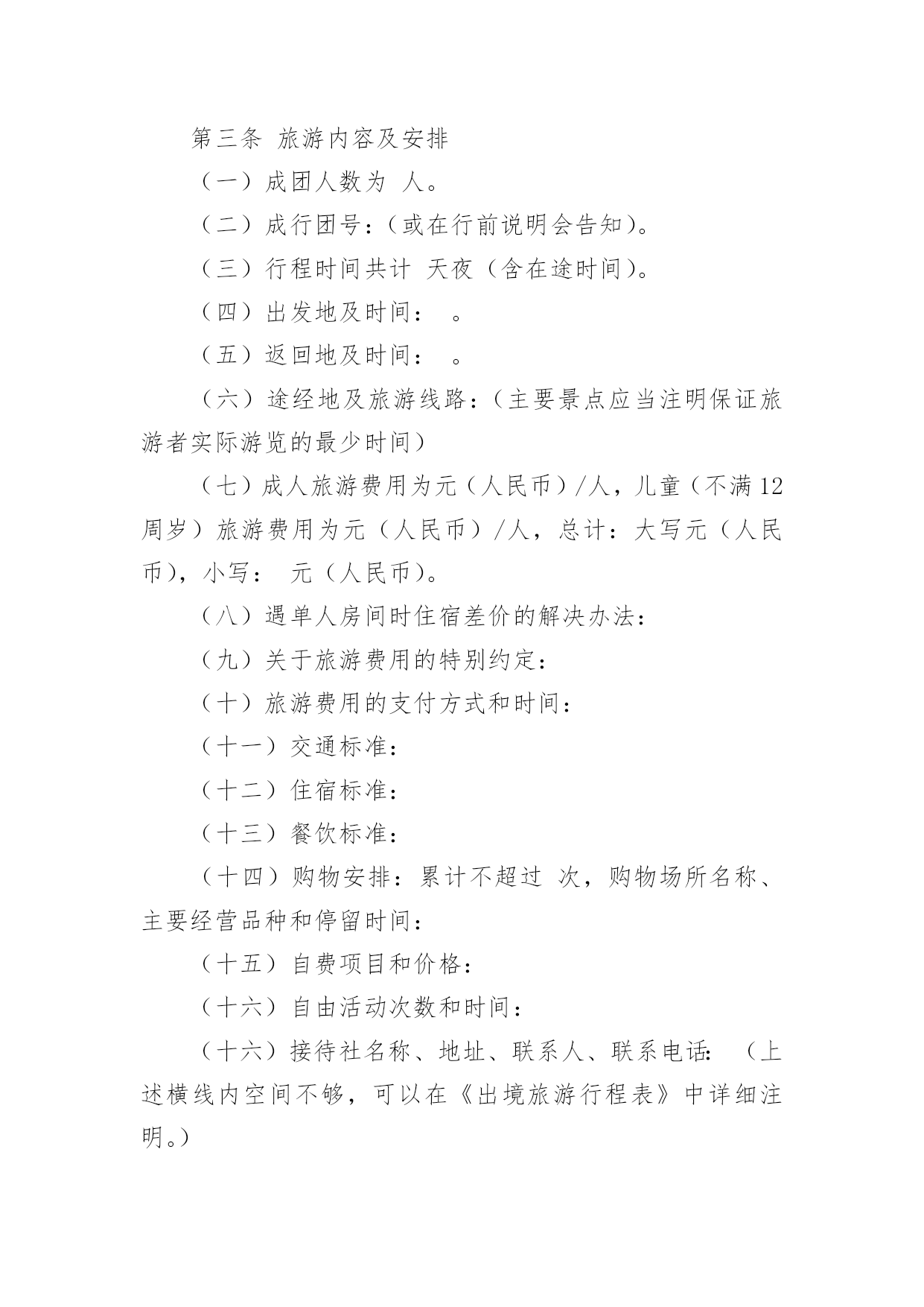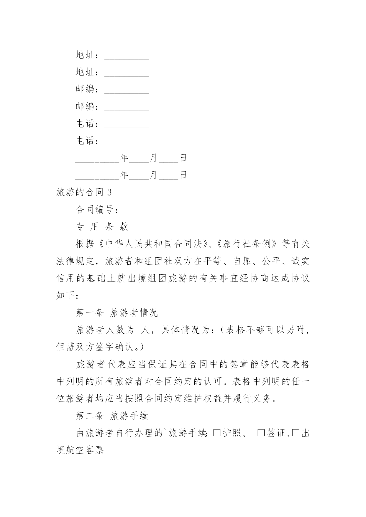 旅游的合同【推荐】旅游的合同随着人们法律意识的加强,合同起到的作用越来越大,签订合同也是最有效的法律依据之一。那么大家知道正规的合同书怎么写吗?下面是小编整理的旅游的合同,希望对大家有所帮助。旅游的合同1甲方:________旅行社(或公司)______________地址:____________________邮码:___________电话:__________法定代表人:________________职务:______________乙方:姓名(或团体名称)________________________地址:____________________邮码:___________电话:__________根据国家有关旅游事业管理的规定,甲乙双方经协商一致,签订本合同,共同信守执行。第一条旅游的时间安排:由甲方在__年__月__日至__年__月__日为乙方提供旅游服务。第二条旅游的地点及每个旅游景点的时间安排:甲方为乙方提供的旅游景点为个。分别是________、________、________。每天的时间安排为上午________时至________时,下午________时至________时。第三条旅游的生活安排:甲方为乙方提供食宿,每天伙食在________元至________元标准内。第四条导游服务:甲方为乙方提供导游服务,服务内容:____________________。第五条旅游的费用:本次旅游的费用总计____元(包括食宿在内)。在旅游出发前____日交清。第六条旅游的交通工具:甲方为乙方提供交通工具。________、________、________等交通工具都由甲方联系、提供,并保证乙方的旅游安全。第七条甲方的权利义务及违约金:1.甲方应按本合同的规定按时为乙方安排本次旅游。2.甲方未经乙方同意不得擅自减少或增加旅游景点和缩短旅游时间。如甲方违反约定,应向乙方赔偿____%的违约金或者乙方可以要求甲方按约定继续提供旅游服务,甲方不提供的,乙方可以自行旅游,支出的合理费用,由甲方承担;甲方增加游览景点的,增加的费用由甲方承担。3.甲方应按本合同规定为乙方提供优质的服务。在旅游期间,甲方应派医务人员、保安人员等随行,以保证本次旅游的顺利进行。4.甲方不得擅自变更或解除合同,否则按约定赔偿乙方损失额________元。5.由于甲方的缘故导致乙方受到财产损失和人身伤害的,甲方负赔偿责任。如因第三人的过错造成损失的',甲方在赔偿后,有权向第三人追偿。第八条乙方的权利义务及违约金:1.乙方应按时交纳旅游费用,如违反规定在旅游出发前____天内还不交清的,甲方有权不与乙方签订合同,取消乙方的旅游事项。2.乙方应遵从甲方安排在本次旅游当中的安全事项及其他合理要求,不得擅自单独行动,否则后果自负。第九条本合同在执行前或执行期间,如有未尽事宜,甲乙双方协商同意后,另订附则附于本合同之内,所有附则在法律上均与本合同有同等效力。第十条本合同一式____份,由甲、乙方各执________份。甲方:____________________代表:________________________年____月____日乙方:____________________代表:________________________年____月____日旅游的合同2合同编号:_________甲方(团体或个人):_________乙方(组团旅行社):_________甲方自愿参加乙方组织的旅行团旅游,为保证旅游服务质量,明确双方的权利和义务,本着平等协商的原则,现就有关事宜达成如下协议:第一条报名与成团1、甲乙双方共同确认:在签订本合同前,已详细阅读及充分理解由广州市旅游局制定、广州市工商行政管理局监制的《广州市出境旅游报名须知及责任细则》(以下简称“须知”)。同意遵守须知并将须知列为本合同附件。2、甲乙双方共同确认:乙方己就其服务项目及质量标准向甲方作出了全面介绍及详细说明。第二条内容与标准1、主要事项双方其他约定:_________2、甲乙双方同意恪守上述约定。甲方保证在旅游活动中服从乙方的统一安排和要求,乙方保证所提供的各项服务符合国家与行业规定的标准。第三条违约责任1、乙方在下列情形下视作违约,并承担赔偿责任:(1)因故意或过失未达到本合同规定的内容和标准而造成甲方直接经济损失的;(2)乙方的'服务未达到国家或行业规定的标准。2、甲方违反合同规定,对其自身的损失应责任自负,给乙方造成损失,应承担赔偿责任。3、不承担违约责任的情况:甲乙双方因不可抗力因素不能履行合同的,不承担赔偿责任,但应及时通知对方,并提供事故详情及不能履约的有效证明材料。4、乙方在旅游质量问题发生前后已采取以下措施的,应减轻或免除责任:(1)对旅游质量和安全状况已