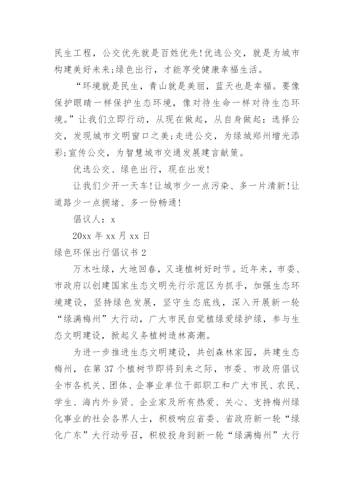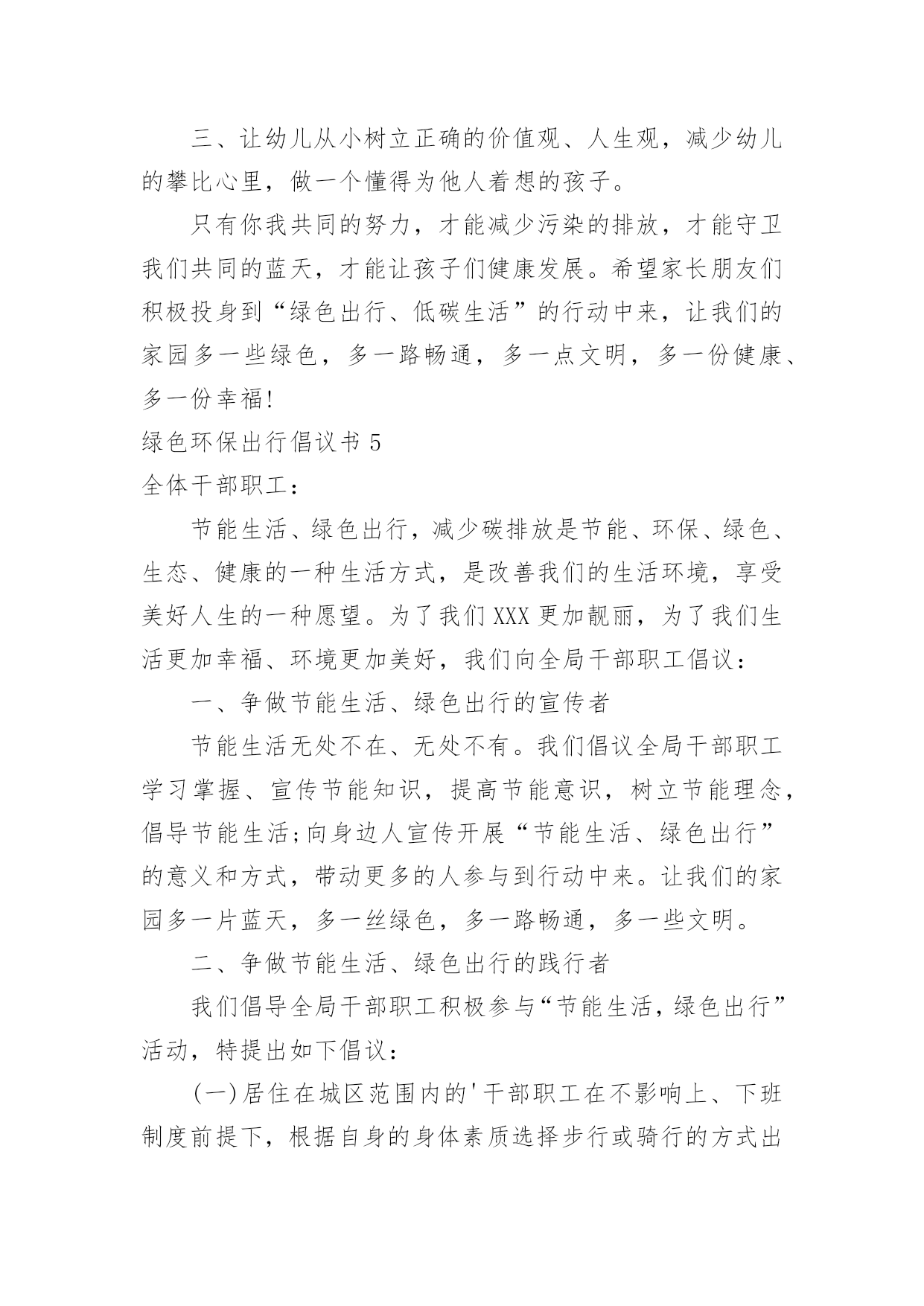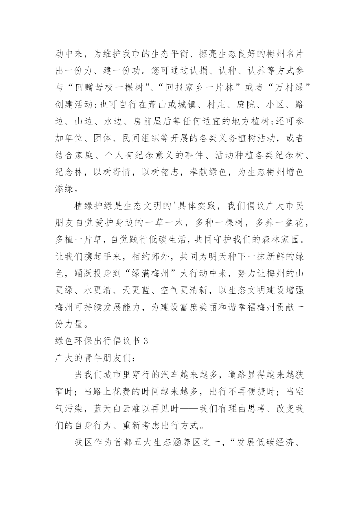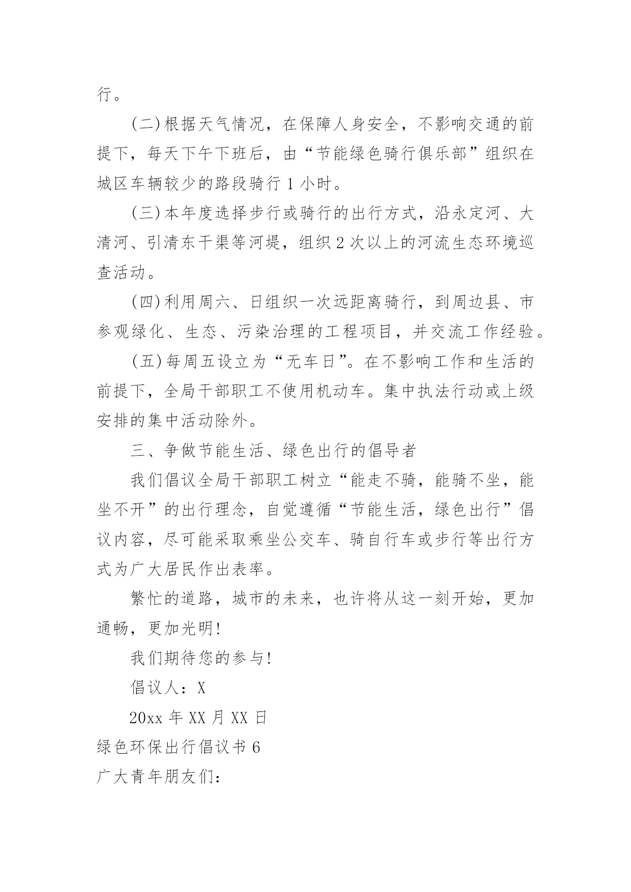 绿色环保出行倡议书绿色环保出行倡议书在当今社会生活中,需要使用倡议书的场合越来越多,倡议书本身不具有很强的约束力,有关人员可以表示响应,也可以不表示响应。相信许多人会觉得倡议书很难写吧,以下是小编精心整理的绿色环保出行倡议书,仅供参考,大家一起来看看吧。绿色环保出行倡议书1广大市民朋友:爱护城市、保护家园是我们每个人的责任。在郑州市强力推进大气污染防治行动之时,我们迎来了20xx年全国“绿色出行”暨“公交出行宣传周”活动,此次活动以“优选公交、绿色出行”作为活动主题,并于9月22日开展“绿色出行”活动,倡导广大市民在9月22日这一天少开一天车,低碳出行、文明出行,以实际行动创造更加健康美好的生态环境。据有关资料统计,每增加1元公共交通投资,将产生4元的综合经济收益。公交车辆每百公里的人均能耗只有小汽车的8.4%。运送相同数量的.乘客,公共交通人均道路资源占有率仅为小汽车的10%左右。作为提供基本出行服务重大民生工程,公交优先就是百姓优先!优选公交,就是为城市构建美好未来;绿色出行,才能享受健康幸福生活。“环境就是民生,青山就是美丽,蓝天也是幸福。要像保护眼睛一样保护生态环境,像对待生命一样对待生态环境。”让我们立即行动,从现在做起,从自身做起:选择公交,发现城市文明窗口之美;走进公交,为绿城郑州增光添彩;宣传公交,为智慧城市交通发展建言献策。优选公交、绿色出行,现在出发!让我们少开一天车!让城市少一点污染、多一片清新!让道路少一点拥堵、多一份畅通!倡议人:x20xx年xx月xx日绿色环保出行倡议书2万木吐绿,大地回春,又逢植树好时节。近年来,市委、市政府以创建国家生态文明先行示范区为抓手,加强生态环境建设,坚持绿色发展,坚守生态底线,深入开展新一轮“绿满梅州”大行动,广大市民自觉植绿爱绿护绿,参与生态文明建设,掀起义务植树造林高潮。为进一步推进生态文明建设,共创森林家园,共建生态梅州,在第37个植树节即将到来之际,市委、市政府倡议全市各机关、团体、企事业单位干部职工和广大市民、农民、学生、海内外乡贤、企业家及所有热爱、关心、支持梅州绿化事业的社会各界人士,积极响应省委、省政府新一轮“绿化广东”大行动号召,积极投身到新一轮“绿满梅州”大行动中来,为维护我市的生态平衡、擦亮生态良好的梅州名片出一份力、建一份功。您可通过认捐、认种、认养等方式参与“回赠母校一棵树”、“回报家乡一片林”或者“万村绿”创建活动;也可自行在荒山或城镇、村庄、庭院、小区、路边、山边、水边、房前屋后等任何适宜的地方植树;还可参加单位、团体、民间组织等开展的各类义务植树活动,或者结合家庭、个人有纪念意义的事件、活动种植各类纪念树、纪念林,以树寄情,以树铭志,奉献绿色,为生态梅州增色添绿。植绿护绿是生态文明的'具体实践,我们倡议广大市民朋友自觉爱护身边的一草一木,多种一棵树,多养一盆花,多植一片草,自觉践行低碳生活,共同守护我们的森林家园。让我们携起手来,相约郊外,共同为明天种下一抹新鲜的绿色,踊跃投身到“绿满梅州”大行动中来,努力让梅州的山更绿、水更清、天更蓝、空气更清新,以生态文明建设增强梅州可持续发展能力,为建设富庶美丽和谐幸福梅州贡献一份力量。绿色环保出行倡议书3广大的青年朋友们:当我们城市里穿行的汽车越来越多,道路显得越来越狭窄时;当路上花费的时间越来越多,出行不再便捷时;当空气污染,蓝天白云难以再见时——我们有理由思考、改变我们的自身行为、重新考虑出行方式。我区作为首都五大生态涵养区之一,“发展低碳经济、倡导低碳生活、建设低碳城市”应当成为我们的目标。走低碳之路、建绿色平谷是我区42万人民的共同责任。为更好地建设绿色平谷,我们发起以“绿色出行、文明交通”为主题的绿色出行公益活动,倡导低碳出行、健康出行、文明出行,并向广大青年朋友发出如下倡议:一、争做绿色出行(低碳生活)的先行者。我们倡议各机关、企事业单位,“有车族”带头选择骑自行车或步行上下班,坚持每周少开一天车,多步行,多骑车。我们不仅是建设绿色平谷的组织者、推动者,也是建设绿色平谷的先行者。这就要求我们每一名机关工作者,在绿色出行中率先垂范,躬身力行,带动更多的人参与到活动中来,让我们的家园多一些绿色,多一路畅通,多一点文明,多一份健康、多一份幸福。二、争做绿色出行倡导者。通过参与活动广大青年应提高环保意识,自愿加入活动当中,大力倡导绿色出行方式。积极向群众和亲朋好友宣传“绿色出行、文明交通”活动意义,主动承担起绿色宣传的责任和义务。人人争做绿色出行的宣传者、推广者、倡导者。三、争做幸福平谷的建设者。未来属于青年,青年创造未来。平谷区各界青年作为我区改革开放和现代化建设的生力军,应以建设“五个平谷”为己任,勇当时代先锋、充当发展主力、争当解放思想、开拓创新、弘扬新风、倡导文明、促进和谐的.先锋