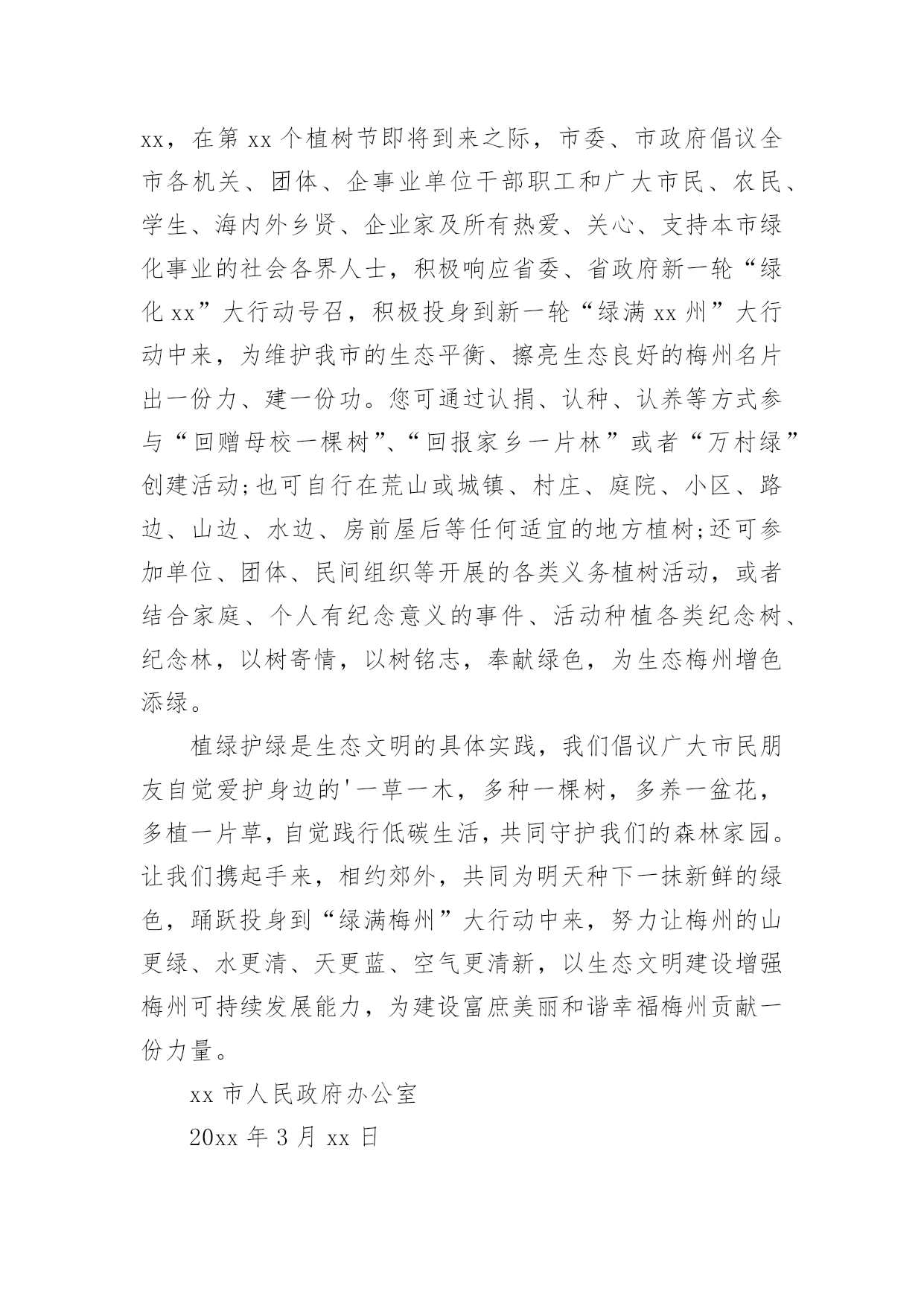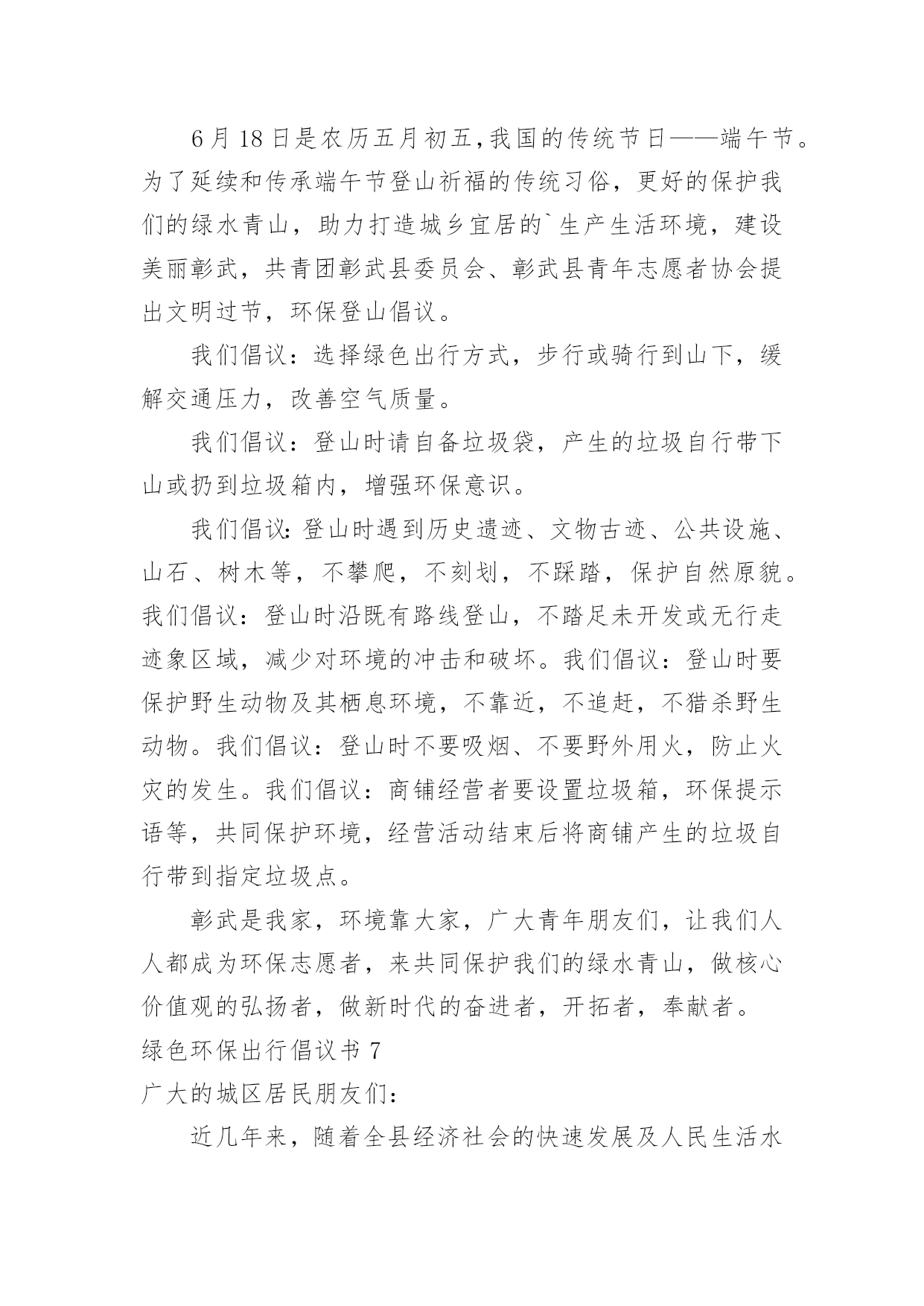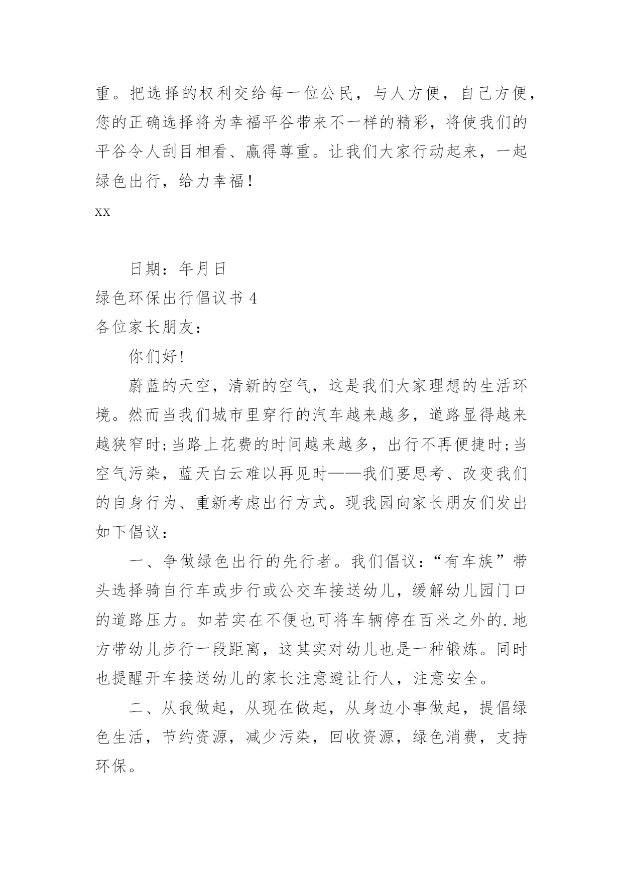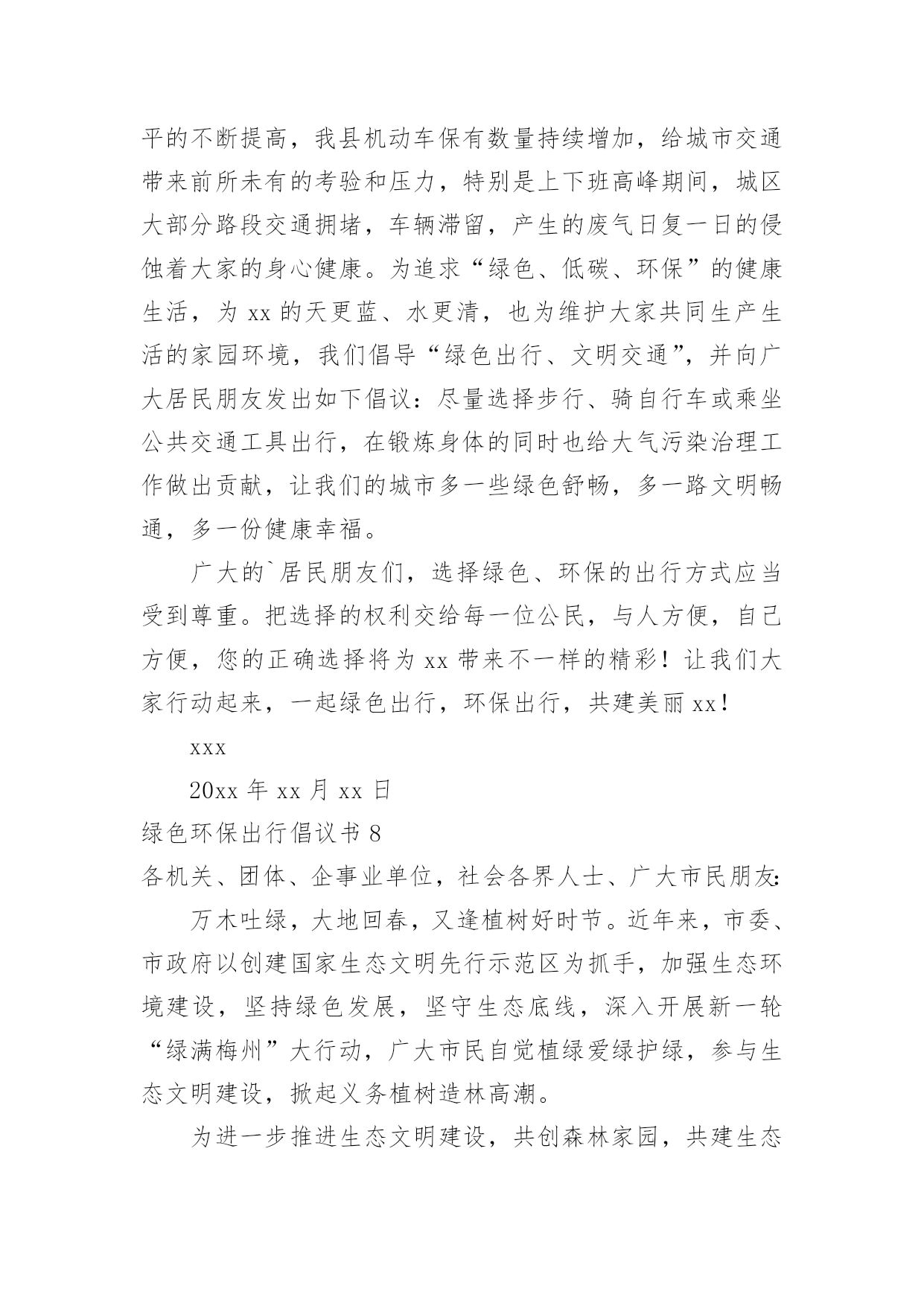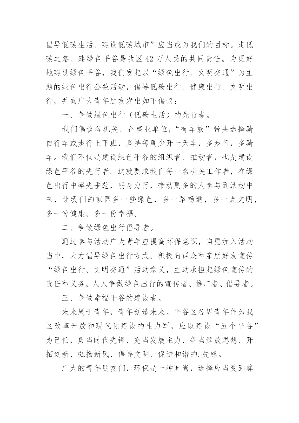 绿色环保出行倡议书绿色环保出行倡议书在当今社会生活中,需要使用倡议书的场合越来越多,倡议书本身不具有很强的约束力,有关人员可以表示响应,也可以不表示响应。相信许多人会觉得倡议书很难写吧,以下是小编精心整理的绿色环保出行倡议书,仅供参考,大家一起来看看吧。绿色环保出行倡议书1广大市民朋友:爱护城市、保护家园是我们每个人的责任。在郑州市强力推进大气污染防治行动之时,我们迎来了20xx年全国“绿色出行”暨“公交出行宣传周”活动,此次活动以“优选公交、绿色出行”作为活动主题,并于9月22日开展“绿色出行”活动,倡导广大市民在9月22日这一天少开一天车,低碳出行、文明出行,以实际行动创造更加健康美好的生态环境。据有关资料统计,每增加1元公共交通投资,将产生4元的综合经济收益。公交车辆每百公里的人均能耗只有小汽车的8.4%。运送相同数量的.乘客,公共交通人均道路资源占有率仅为小汽车的10%左右。作为提供基本出行服务重大民生工程,公交优先就是百姓优先!优选公交,就是为城市构建美好未来;绿色出行,才能享受健康幸福生活。“环境就是民生,青山就是美丽,蓝天也是幸福。要像保护眼睛一样保护生态环境,像对待生命一样对待生态环境。”让我们立即行动,从现在做起,从自身做起:选择公交,发现城市文明窗口之美;走进公交,为绿城郑州增光添彩;宣传公交,为智慧城市交通发展建言献策。优选公交、绿色出行,现在出发!让我们少开一天车!让城市少一点污染、多一片清新!让道路少一点拥堵、多一份畅通!倡议人:x20xx年xx月xx日绿色环保出行倡议书2万木吐绿,大地回春,又逢植树好时节。近年来,市委、市政府以创建国家生态文明先行示范区为抓手,加强生态环境建设,坚持绿色发展,坚守生态底线,深入开展新一轮“绿满梅州”大行动,广大市民自觉植绿爱绿护绿,参与生态文明建设,掀起义务植树造林高潮。为进一步推进生态文明建设,共创森林家园,共建生态梅州,在第37个植树节即将到来之际,市委、市政府倡议全市各机关、团体、企事业单位干部职工和广大市民、农民、学生、海内外乡贤、企业家及所有热爱、关心、支持梅州绿化事业的社会各界人士,积极响应省委、省政府新一轮“绿化广东”大行动号召,积极投身到新一轮“绿满梅州”大行动中来,为维护我市的生态平衡、擦亮生态良好的梅州名片出一份力、建一份功。您可通过认捐、认种、认养等方式参与“回赠母校一棵树”、“回报家乡一片林”或者“万村绿”创建活动;也可自行在荒山或城镇、村庄、庭院、小区、路边、山边、水边、房前屋后等任何适宜的地方植树;还可参加单位、团体、民间组织等开展的各类义务植树活动,或者结合家庭、个人有纪念意义的事件、活动种植各类纪念树、纪念林,以树寄情,以树铭志,奉献绿色,为生态梅州增色添绿。植绿护绿是生态文明的'具体实践,我们倡议广大市民朋友自觉爱护身边的一草一木,多种一棵树,多养一盆花,多植一片草,自觉践行低碳生活,共同守护我们的森林家园。让我们携起手来,相约郊外,共同为明天种下一抹新鲜的绿色,踊跃投身到“绿满梅州”大行动中来,努力让梅州的山更绿、水更清、天更蓝、空气更清新,以生态文明建设增强梅州可持续发展能力,为建设富庶美丽和谐幸福梅州贡献一份力量。绿色环保出行倡议书3广大的青年朋友们:当我们城市里穿行的汽车越来越多,道路显得越来越狭窄时;当路上花费的时间越来越多,出行不再便捷时;当空气污染,蓝天白云难以再见时——我们有理由思考、改变我们的自身行为、重新考虑出行方式。我区作为首都五大生态涵养区之一,“发展低碳经济、倡导低碳生活、建设低碳城市”应当成为我们的目标。走低碳之路、建绿色平谷是我区42万人民的共同责任。为更好地建设绿色平谷,我们发起以“绿色出行、文明交通”为主题的绿色出行公益活动,倡导低碳出行、健康出行、文明出行,并向广大青年朋友发出如下倡议:一、争做绿色出行(低碳生活)的先行者。我们倡议各机关、企事业单位,“有车族”带头选择骑自行车或步行上下班,坚持每周少开一天车,多步行,多骑车。我们不仅是建设绿色平谷的组织者、推动者,也是建设绿色平谷的先行者。这就要求我们每一名机关工作者,在绿色出行中率先垂范,躬身力行,带动更多的人参与到活动中来,让我们的家园多一些绿色,多一路畅通,多一点文明,多一份健康、多一份幸福。二、争做绿色出行倡导者。通过参与活动广大青年应提高环保意识,自愿加入活动当中,大力倡导绿色出行方式。积极向群众和亲朋好友宣传“绿色出行、文明交通”活动意义,主动承担起绿色宣传的责任和义务。人人争做绿色出行的宣传者、推广者、倡导者。三、争做幸福平谷的建设者。未来属于青年,青年创造未来。平谷区各界青年作为我区改革开放和现代化建设的生力军,应以建设“五个平谷”为己任,勇当时代先锋、充当发展主力、争当解放思想、开拓创新、弘扬新风、倡导文明、促进和谐的.先锋