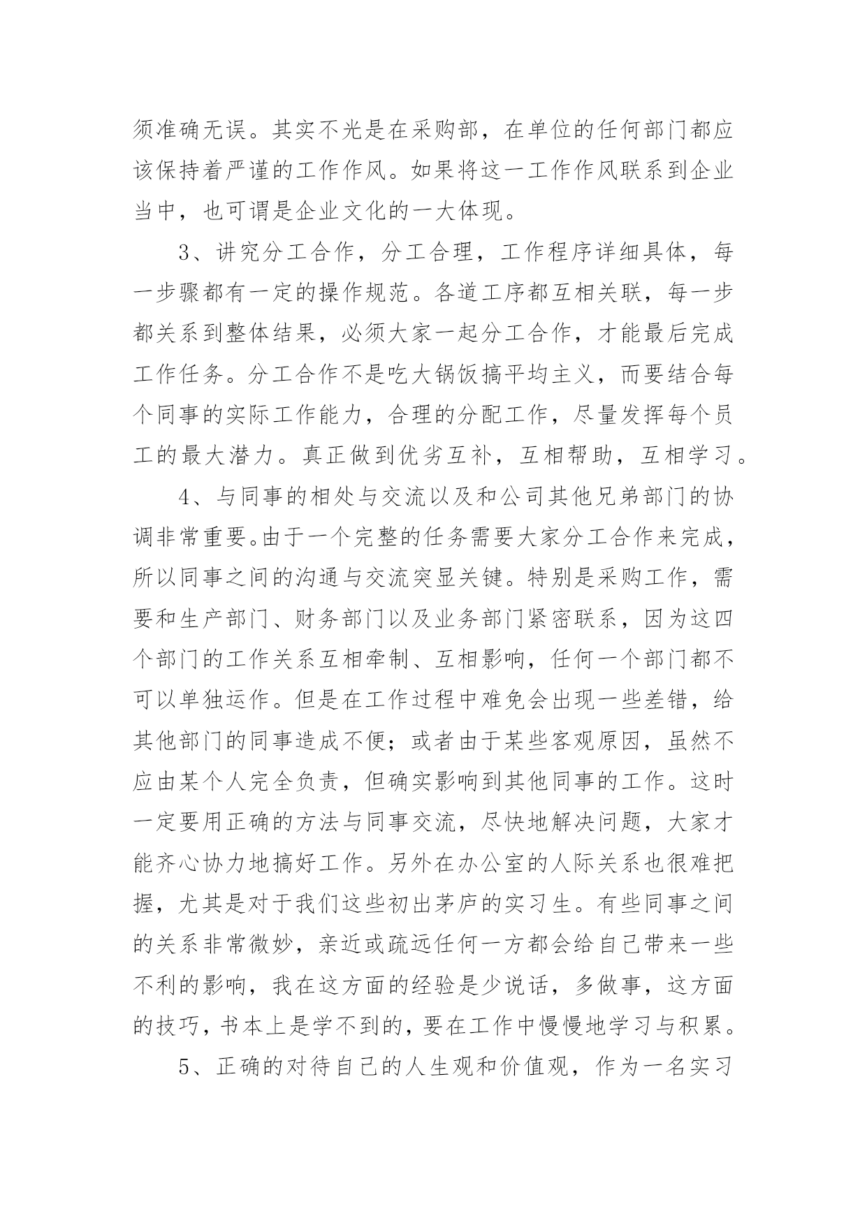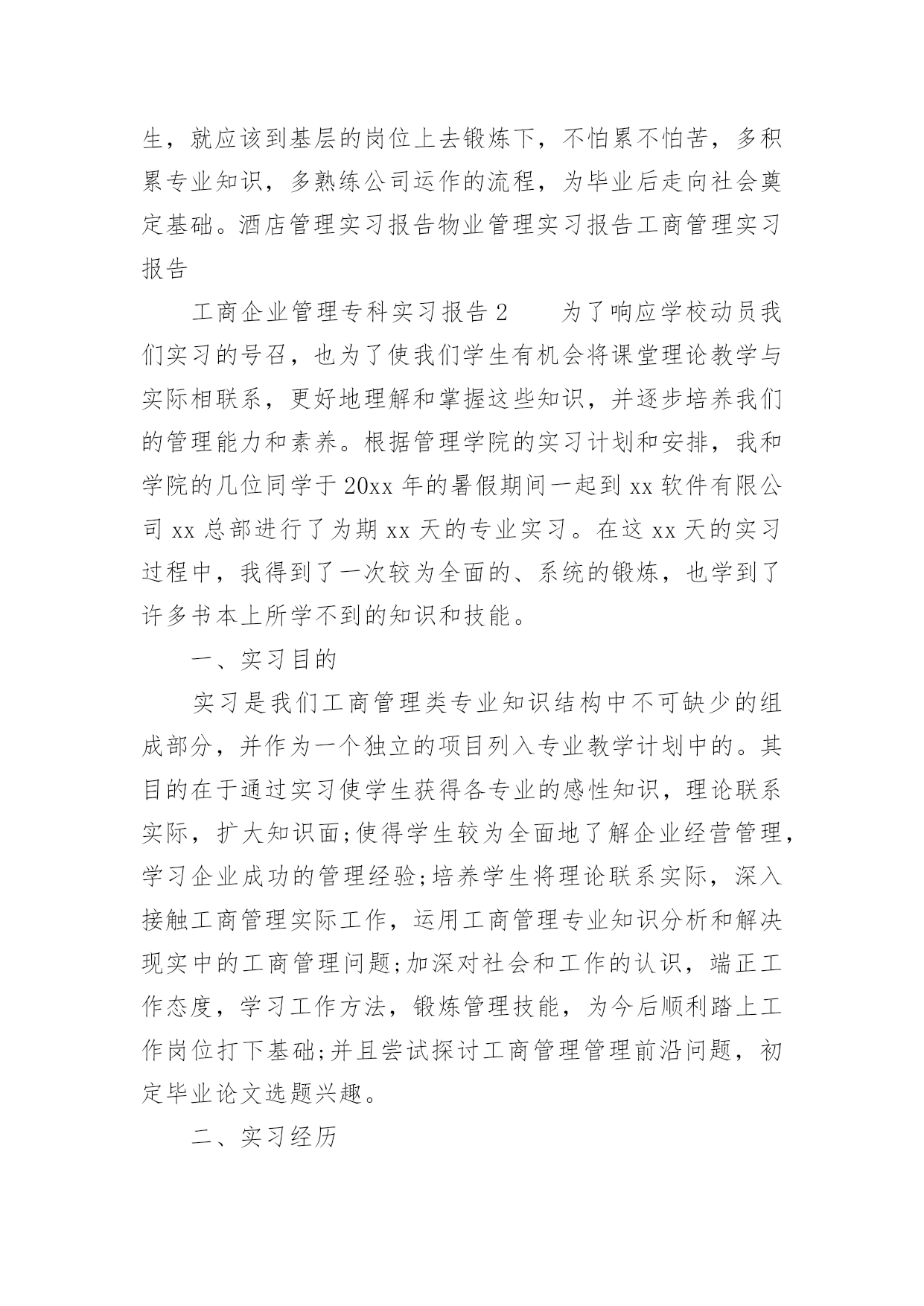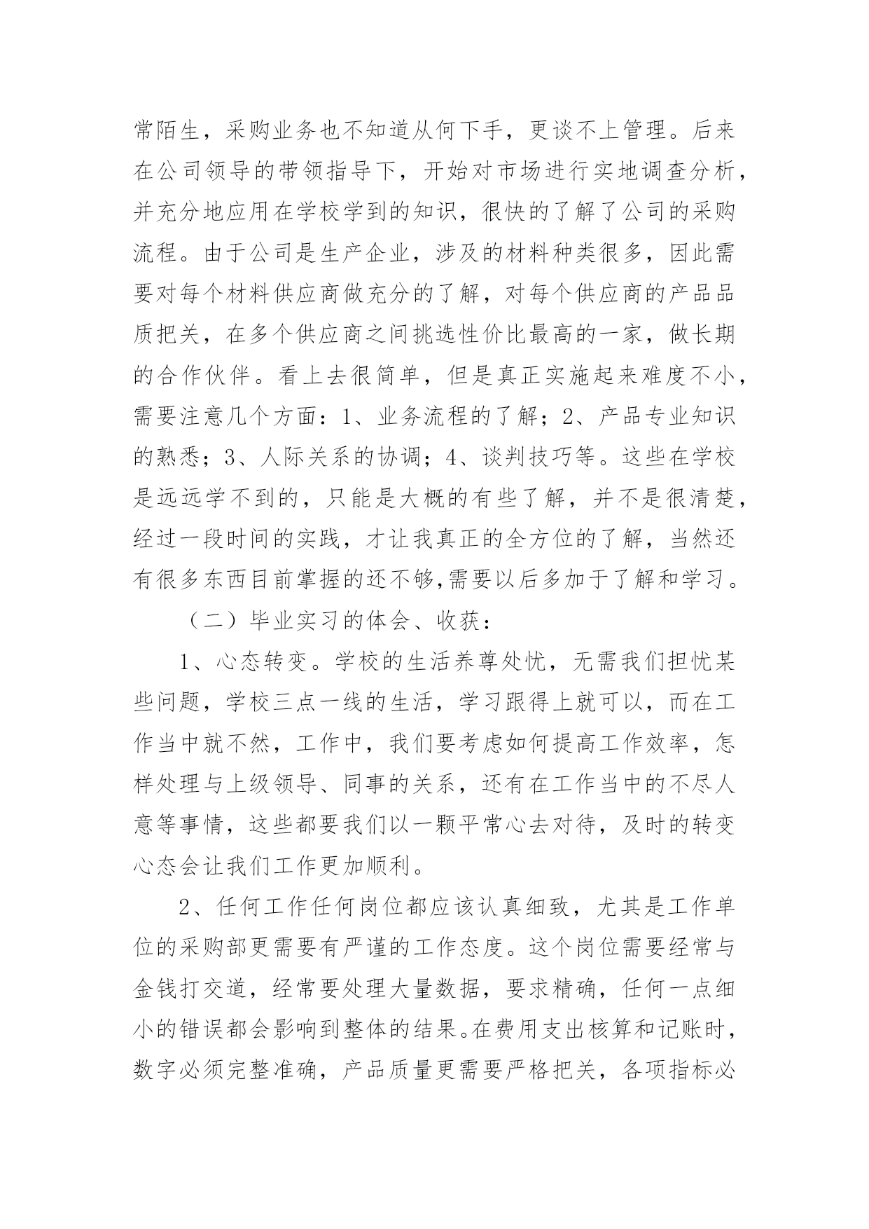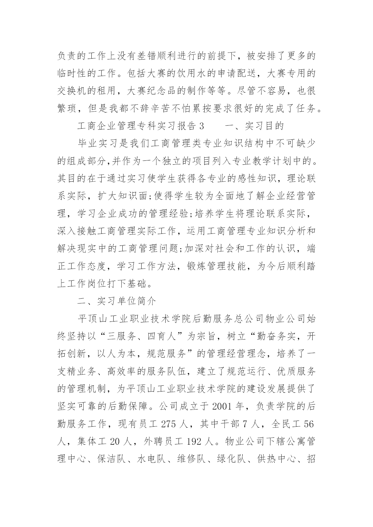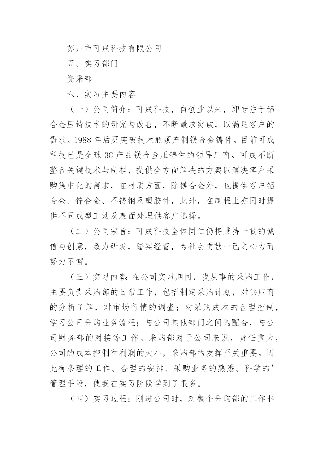 工商企业管理专科实习报告工商企业管理专科实习报告(精选6篇)接地气的实习生活已经告一段落,你梳理过这段时间的实习生活吗?该总结一下这段时间的得与失,好好写份实习报告了。为了让您不再为写实习报告头疼,以下是小编精心整理的工商企业管理专科实习报告(精选6篇),欢迎大家借鉴与参考,希望对大家有所帮助。工商企业管理专科实习报告1刚进入单位的时候我有些担心,经历了一连串的实习之后,我努力调整观念,正确认识了单位和个人的地位以及发展方向,我相信只要我们立足于现实,改变和调整看问题的角度,锐意进取,在成才的道路上不断攀登,有朝一日,那些成才的机遇就会纷至沓来,促使我们成为社会公认的人才。一、实习目的了解工商企业管理的先进方式和现代化管理方法,提高调查研究、文献检索和搜集资料的能力,提高理论与实际相结合的能力,提高协同合作及组织工作的能力,培养独立分析问题和解决实际问题的能力。二、实习时间20xx年9月―20xx年5月三、实习地点苏州工业园区苏虹中路201号四、实习单位苏州市可成科技有限公司五、实习部门资采部六、实习主要内容(一)公司简介:可成科技,自创业以来,即专注于铝合金压铸技术的研究与改善,不断最求突破,以满足客户的需求。1988年后更突破技术瓶颈产制镁合金铸件。目前可成科技已是全球3C产品镁合金压铸件的领导厂商。可成不断整合关键技术与制程,提供全方面解决的方案以解决客户采购集中化的需求,在材质方面,除镁合金外,也提供客户铝合金、锌合金、不锈钢及塑胶件,此外,在制程上亦同时提供不同成型工法及表面处理供客户选择。(二)公司宗旨:可成科技全体同仁仍将秉持一贯的诚信与创意,致力研发,踏实经营,为社会贡献一己之心力而努力不懈。(三)实习内容:在公司实习期间,我从事的采购工作,主要负责采购部的日常工作,包括制定采购计划,对供应商的分析了解,对市场行情的调查;对采购成本的合理控制,学习公司采购业务流程;与公司其他部门之间的配合,与公司财务部的对接等工作。采购部对于公司来说,责任重大,公司的成本控制和利润的大小,采购部的发挥至关重要。因此有条理的工作、合理的安排、采购业务的熟悉、科学的'管理手段,使我在实习阶段学到了很多。(四)实习过程:刚进公司时,对整个采购部的工作非常陌生,采购业务也不知道从何下手,更谈不上管理。后来在公司领导的带领指导下,开始对市场进行实地调查分析,并充分地应用在学校学到的知识,很快的了解了公司的采购流程。由于公司是生产企业,涉及的材料种类很多,因此需要对每个材料供应商做充分的了解,对每个供应商的产品品质把关,在多个供应商之间挑选性价比最高的一家,做长期的合作伙伴。看上去很简单,但是真正实施起来难度不小,需要注意几个方面:1、业务流程的了解;2、产品专业知识的熟悉;3、人际关系的协调;4、谈判技巧等。这些在学校是远远学不到的,只能是大概的有些了解,并不是很清楚,经过一段时间的实践,才让我真正的全方位的了解,当然还有很多东西目前掌握的还不够,需要以后多加于了解和学习。(二)毕业实习的体会、收获:1、心态转变。学校的生活养尊处忧,无需我们担忧某些问题,学校三点一线的生活,学习跟得上就可以,而在工作当中就不然,工作中,我们要考虑如何提高工作效率,怎样处理与上级领导、同事的关系,还有在工作当中的不尽人意等事情,这些都要我们以一颗平常心去对待,及时的转变心态会让我们工作更加顺利。2、任何工作任何岗位都应该认真细致,尤其是工作单位的采购部更需要有严谨的工作态度。这个岗位需要经常与金钱打交道,经常要处理大量数据,要求精确,任何一点细小的错误都会影响到整体的结果。在费用支出核算和记账时,数字必须完整准确,产品质量更需要严格把关,各项指标必须准确无误。其实不光是在采购部,在单位的任何部门都应该保持着严谨的工作作风。如果将这一工作作风联系到企业当中,也可谓是企业文化的一大体现。3、讲究分工合作,分工合理,工作程序详细具体,每一步骤都有一定的操作规范。各道工序都互相关联,每一步都关系到整体结果,必须大家一起分工合作,才能最后完成工作任务。分工合作不是吃大锅饭搞平均主义,而要结合每个同事的实际工作能力,合理的分配工作,尽量发挥每个员工的最大潜力。真正做到优劣互补,互相帮助,互相学习。4、与同事的相处与交流以及和公司其他兄弟部门的协调非常重要。由于一个完整的任务需要大家分工合作来完成,所以同事之间的沟通与交流突显关键。特别是采购工作,需要和生产部门、财务部门以及业务部门紧密联系,因为这四个部门的工作关系互相牵制、互相影响,任何一个部门都不可以单独运作。但是在工作过程中难免会出现一些差错,给其他部门的同事造成不便;或者由于某些客观原因,虽然不应由某个人完全负责,但确实影响到其他同事的工作。这时一定要用正确的方法与同事交流,尽快地解决问题,大家才能齐心协
