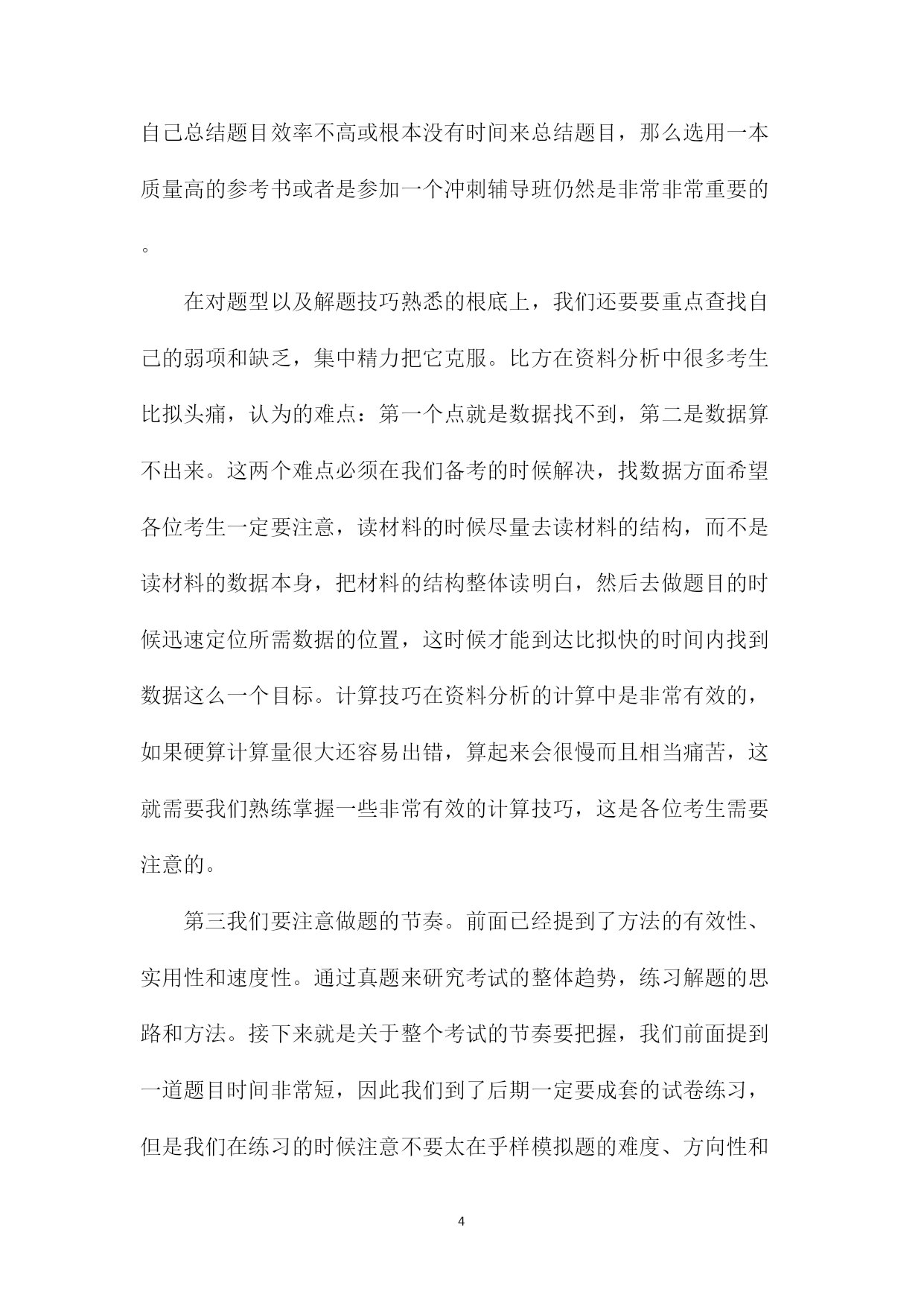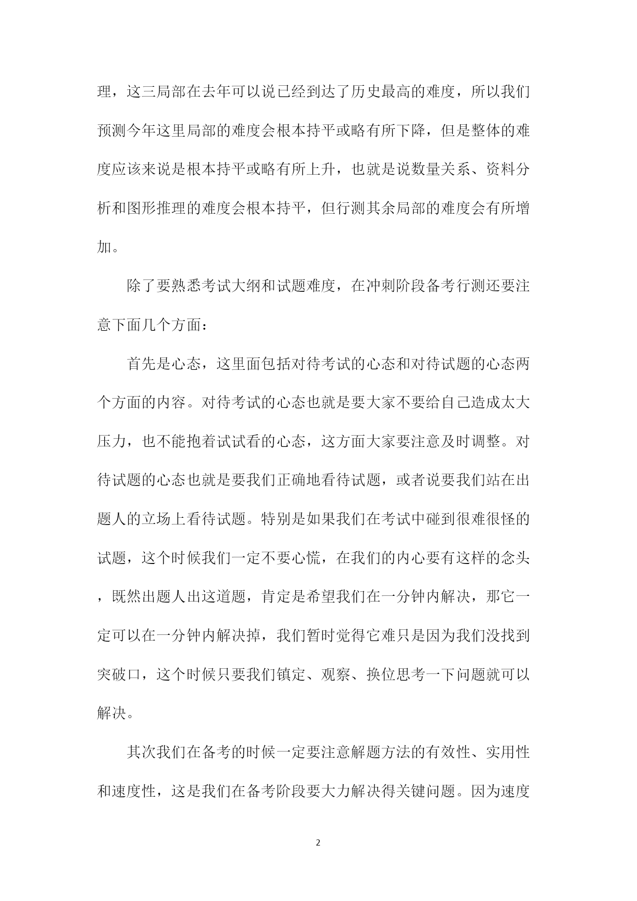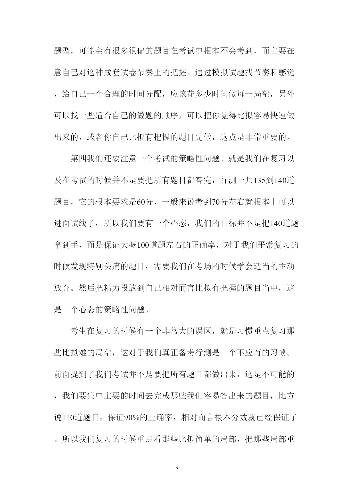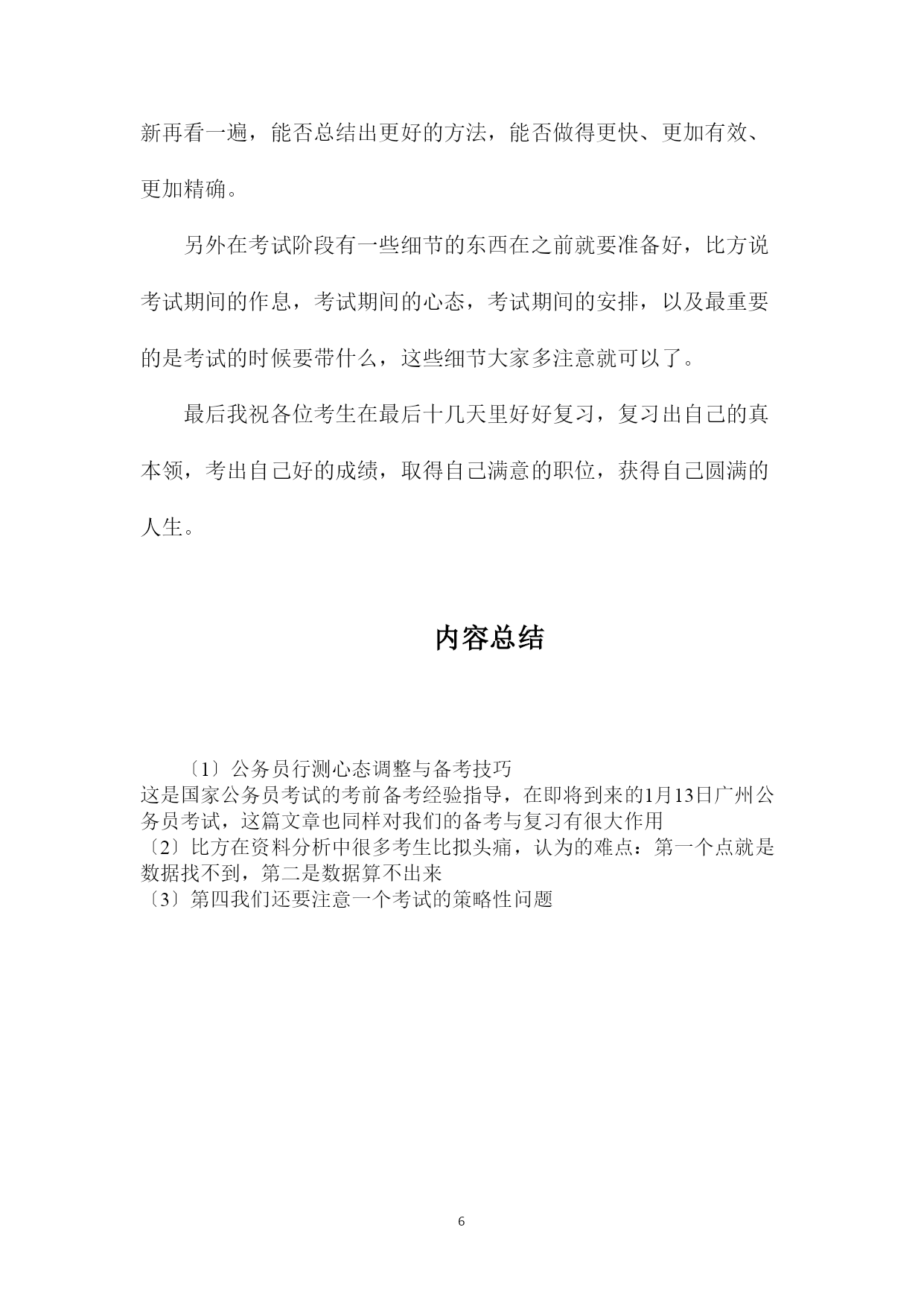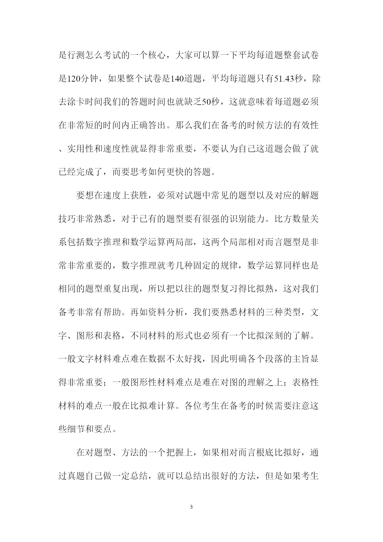 PAGEPAGE6公务员行测心态调整与备考技巧这是国家公务员考试的考前备考经验指导,在即将到来的1月13日广州公务员考试,这篇文章也同样对我们的备考与复习有很大作用。20*年国家公务员考试已进入最后的冲刺阶段,为了帮助广阔考生在这关键时刻有的放矢的进行复习、最有效的提高自身能力,我在这里给大家简单的谈谈行政职业能力测试冲刺阶段的心态和备考技巧,帮助考生顺利通过考试。要想充分备战公务员考试,就要熟悉公考考试大纲。今年大纲与去年大纲相比根本没有什么变化,只有判断推理中有一种类比推理可能会出一种比拟新的题型,除此之外其他局部从大纲意义上说完全没有什么变化,所以大家备考根本上按照去年的题型、题量、分布准备就足够了。但是大纲没有变化并不代表今年的题目不会有变化,这可以从历年题目的变化趋势看出。而且今年有80万考生报考,一共招一万三千多人,大概比例是1:60,去年大致的比例是1:40,这个比例在上升,也就意味着今年的竞争会比去年更加剧烈。所以各位考生一定要注意,题目变难是一种趋势,但是变难也要局部来看,比方数量关系和资料分析,以及判断推理当中的图形推理,这三局部在去年可以说已经到达了历史最高的难度,所以我们预测今年这里局部的难度会根本持平或略有所下降,但是整体的难度应该来说是根本持平或略有所上升,也就是说数量关系、资料分析和图形推理的难度会根本持平,但行测其余局部的难度会有所增加。除了要熟悉考试大纲和试题难度,在冲刺阶段备考行测还要注意下面几个方面:首先是心态,这里面包括对待考试的心态和对待试题的心态两个方面的内容。对待考试的心态也就是要大家不要给自己造成太大压力,也不能抱着试试看的心态,这方面大家要注意及时调整。对待试题的心态也就是要我们正确地看待试题,或者说要我们站在出题人的立场上看待试题。特别是如果我们在考试中碰到很难很怪的试题,这个时候我们一定不要心慌,在我们的内心要有这样的念头,既然出题人出这道题,肯定是希望我们在一分钟内解决,那它一定可以在一分钟内解决掉,我们暂时觉得它难只是因为我们没找到突破口,这个时候只要我们镇定、观察、换位思考一下问题就可以解决。其次我们在备考的时候一定要注意解题方法的有效性、实用性和速度性,这是我们在备考阶段要大力解决得关键问题。因为速度是行测怎么考试的一个核心,大家可以算一下平均每道题整套试卷是120分钟,如果整个试卷是140道题,平均每道题只有51.43秒,除去涂卡时间我们的答题时间也就缺乏50秒,这就意味着每道题必须在非常短的时间内正确答出。那么我们在备考的时候方法的有效性、实用性和速度性就显得非常重要,不要认为自己这道题会做了就已经完成了,而要思考如何更快的答题。要想在速度上获胜,必须对试题中常见的题型以及对应的解题技巧非常熟悉,对于已有的题型要有很强的识别能力。比方数量关系包括数字推理和数学运算两局部,这两个局部相对而言题型是非常非常重要的,数字推理就考几种固定的规律,数学运算同样也是相同的题型重复出现,所以把以往的题型复习得比拟熟,这对我们备考非常有帮助。再如资料分析,我们要熟悉材料的三种类型,文字、图形和表格,不同材料的形式也必须有一个比拟深刻的了解。一般文字材料难点难在数据不太好找,因此明确各个段落的主旨显得非常重要;一般图形性材料难点是难在对图的理解之上;表格性材料的难点一般在比拟难计算。各位考生在备考的时候需要注意这些细节和要点。在对题型、方法的一个把握上,如果相对而言根底比拟好,通过真题自己做一定总结,就可以总结出很好的方法,但是如果考生自己总结题目效率不高或根本没有时间来总结题目,那么选用一本质量高的参考书或者是参加一个冲刺辅导班仍然是非常非常重要的。在对题型以及解题技巧熟悉的根底上,我们还要要重点查找自己的弱项和缺乏,集中精力把它克服。比方在资料分析中很多考生比拟头痛,认为的难点:第一个点就是数据找不到,第二是数据算不出来。这两个难点必须在我们备考的时候解决,找数据方面希望各位考生一定要注意,读材料的时候尽量去读材料的结构,而不是读材料的数据本身,把材料的结构整体读明白,然后去做题目的时候迅速定位所需数据的位置,这时候才能到达比拟快的时间内找到数据这么一个目标。计算技巧在资料分析的计算中是非常有效的,如果硬算计算量很大还容易出错,算起来会很慢而且相当痛苦,这就需要我们熟练掌握一些非常有效的计算技巧,这是各位考生需要注意的。第三我们要注意做题的节奏。前面已经提到了方法的有效性、实用性和速度性。通过真题来研究考试的整体趋势,练习解题的思路和方法。接下来就是关于整个考试的节奏要把握,我们前面提到一道题目时间非常短,因此我们到了后期一定要成套的试卷练习,但是我们在练习的时候注意不要太在乎样模拟题的难度、方向性和题型,可能会有很多很偏的题目