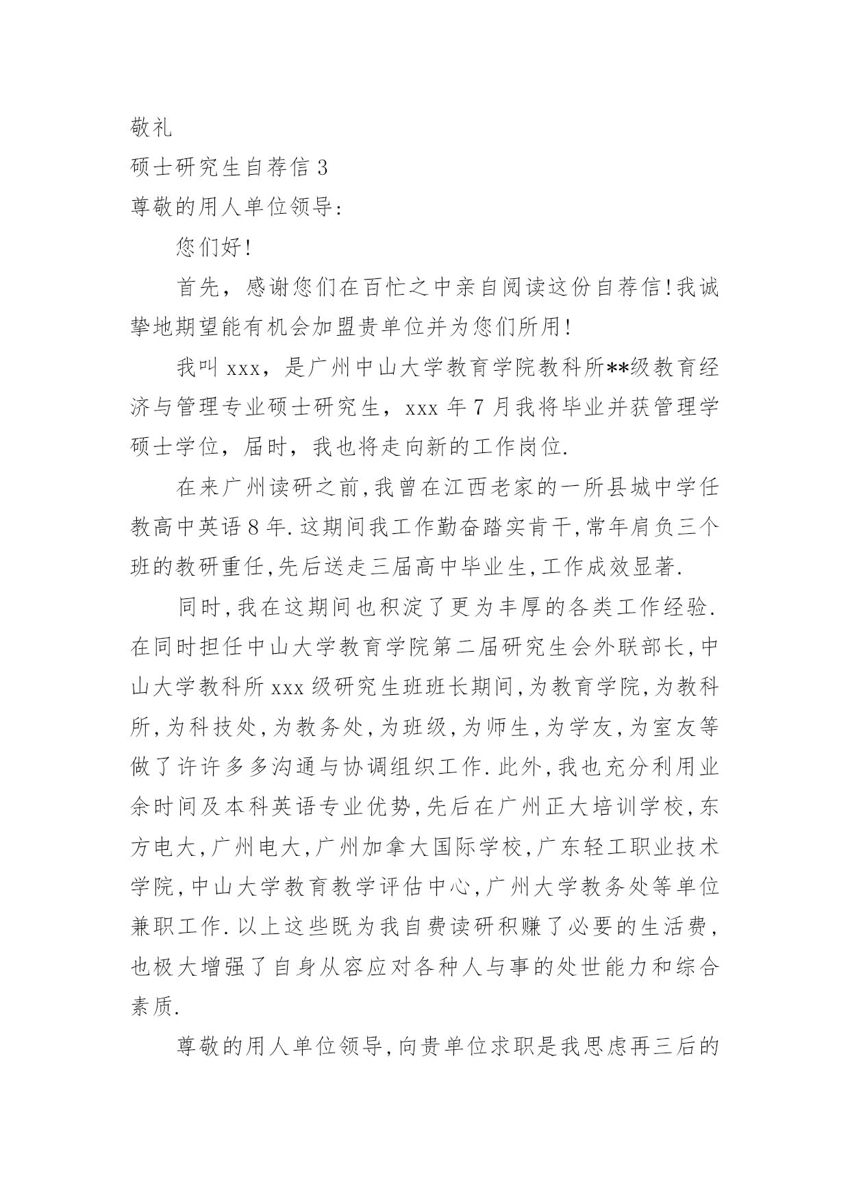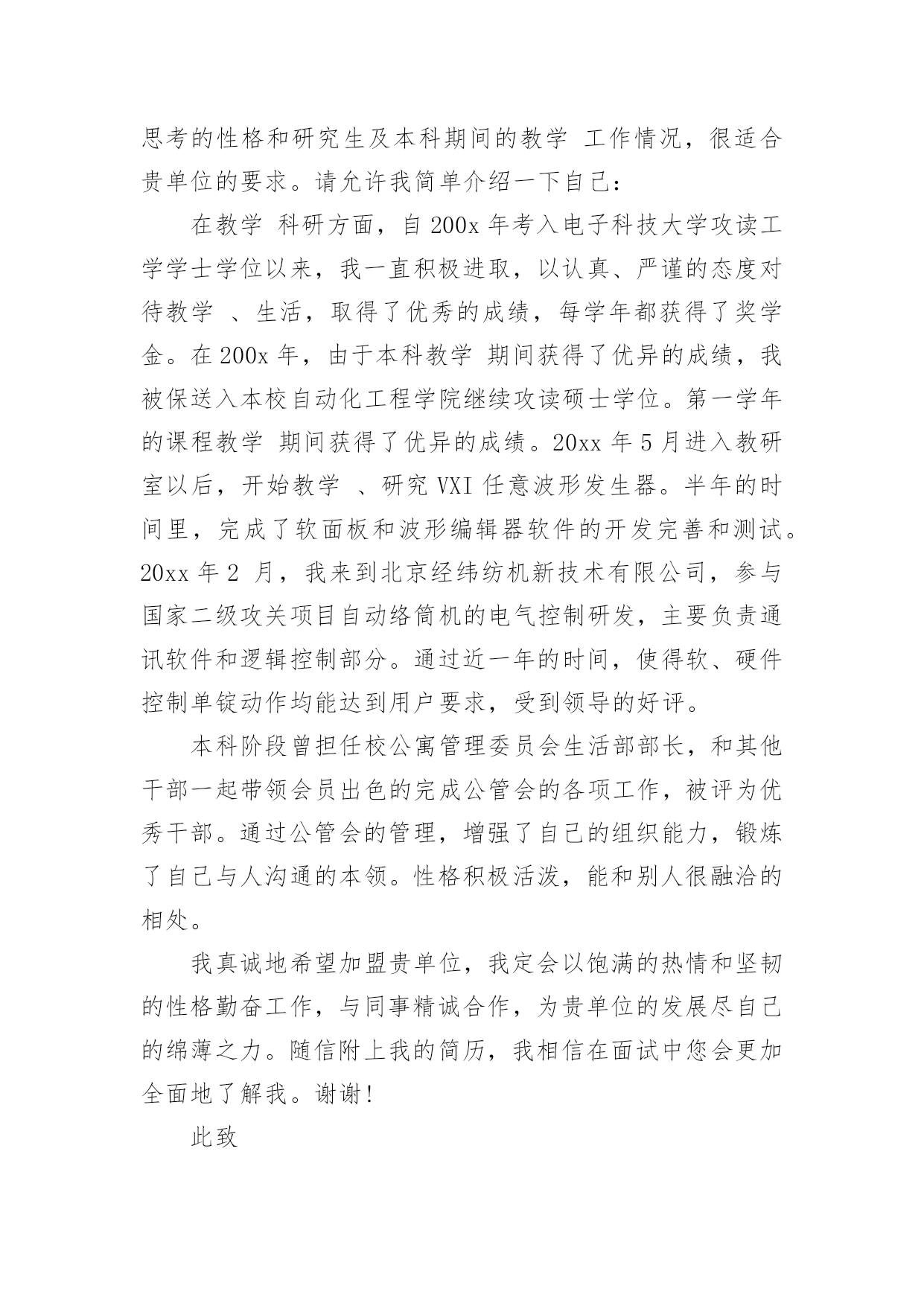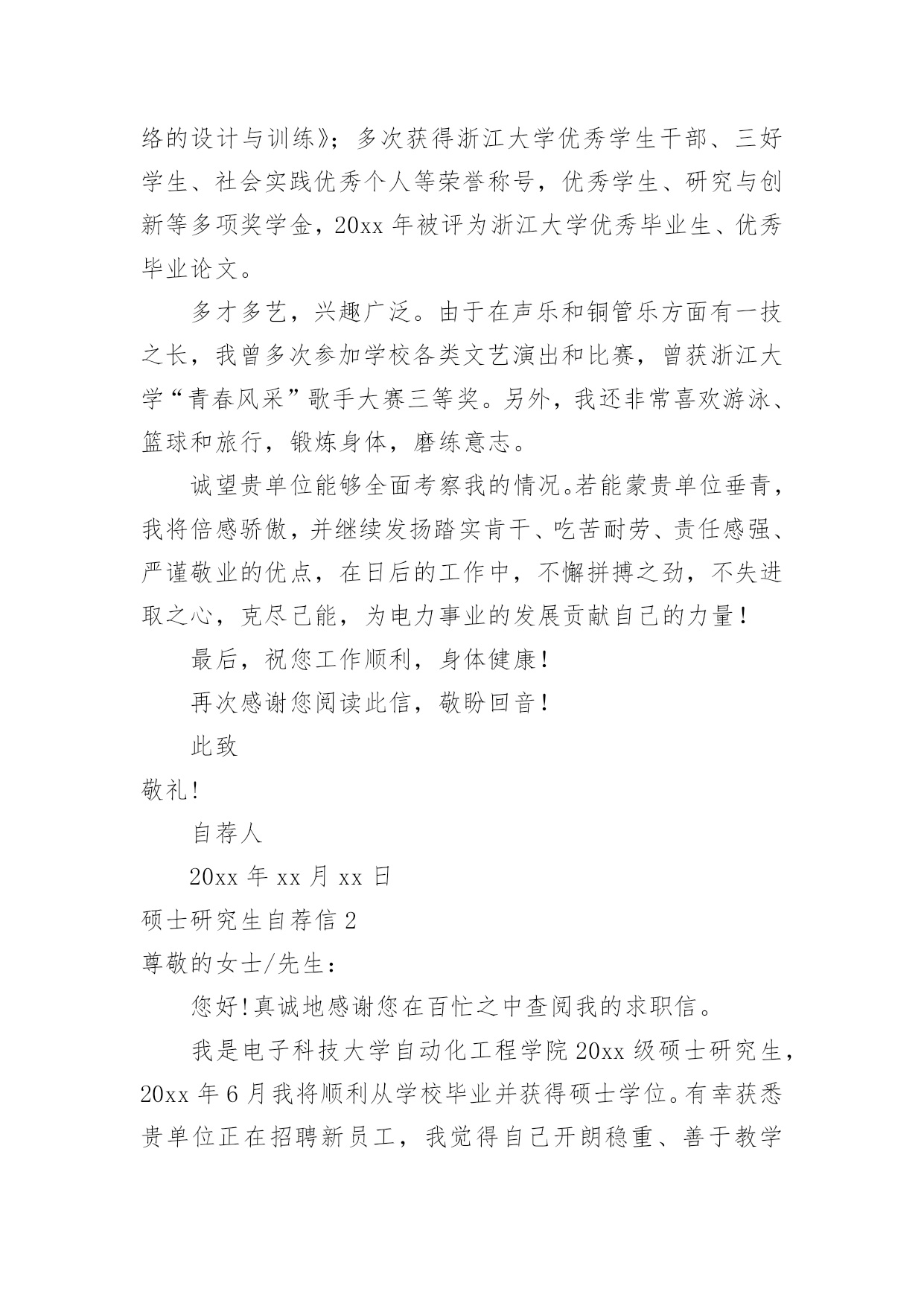 硕士研究生自荐信硕士研究生自荐信在如今这个时代,各种自荐信频频出现,自荐信可以展示出自己的才干和优势。想必许多人都在为如何写好自荐信而烦恼吧,以下是小编为大家收集的硕士研究生自荐信,仅供参考,大家一起来看看吧。硕士研究生自荐信1尊敬的领导:您好!首先感谢您在百忙之中抽出时间来阅读我的这份自荐材料。我叫****,是浙江大学电力系统及其自动化专业的一名硕士研究生,将于20xx年xx月xx日毕业。基于专业和兴趣取向,我非常希望能够成为贵单位的一分子,谨在此向您做一自我推荐。本人20xx年进入浙江大学,就读于电气工程及其自动化专业,同时辅修经济管理学;20xx年获得免试研究生资格,在电力系统及其自动化专业继续深造。在浙大的六年里,我勇于尝试,积极进取,各方面能力都得到了很大的提高。责任心强,吃苦耐劳,能胜任诸多工作。在科研项目方面,主动承担多个课题,完成好导师交给的各项工作:作为“发电厂GCB应用经济效益分析软件开发及应用研究”的主要工作者,推动项目进展顺利;负责学习并推广德国亚琛工业大学可靠性分析软件RAMSES,已服务于实验室多项课题研究,效果显著;还曾独立开发过电网规划经济性分析软件。在社会工作方面,曾任浙江大学电气工程学院研究生会主席、电力经济及其信息化06硕党支部书记、电气工程学院学生会主席等职务,带领团队,成功策划组织过许许多多深受广大师生喜爱的活动。此外,曾作为浙江大学带队人,成功访问过台湾新竹清华大学,并给对方留下非常深刻的印象。严谨敬业,团队合作。多年的科研和社会工作让我养成了严谨敬业、追求团队协作以提高效率的好习惯。20xx年暑期,我在北京电力公司实习,先后在调度通信中心和客户服务中心学习和工作,认真的态度和踏实的作风受到领导和客户的一致好评;20xx年暑期,我在宝洁(中国)有限公司采购部实习,通过与研发部门同事良好的合作,为公司“镁皂”项目的主要原料Mg(OH)2找到三家合适的供货商,并供货至今;作为“浙江省遂昌县电力公司‘十一五’电网发展规划”的参与者,配合师兄很好地完成了负荷预测、经济分析、绘制网架示意图、编写文本等工作,使项目顺利通过上级有关部门验收。品学兼优,成绩显著。多年的刻苦努力,让我取得了许多成果。曾在《华东电力》发表文章《TPPW软件对大容量发电机装设出口断路器的技术经济分析》、《电力市场可中断负荷用户属性研究》,在《内蒙古科技与经济》发表文章《永磁涡流制动的电磁分析与设计》、《基于MATLAB的BP神经网络的设计与训练》;多次获得浙江大学优秀学生干部、三好学生、社会实践优秀个人等荣誉称号,优秀学生、研究与创新等多项奖学金,20xx年被评为浙江大学优秀毕业生、优秀毕业论文。多才多艺,兴趣广泛。由于在声乐和铜管乐方面有一技之长,我曾多次参加学校各类文艺演出和比赛,曾获浙江大学“青春风采”歌手大赛三等奖。另外,我还非常喜欢游泳、篮球和旅行,锻炼身体,磨练意志。诚望贵单位能够全面考察我的情况。若能蒙贵单位垂青,我将倍感骄傲,并继续发扬踏实肯干、吃苦耐劳、责任感强、严谨敬业的优点,在日后的工作中,不懈拼搏之劲,不失进取之心,克尽己能,为电力事业的发展贡献自己的力量!最后,祝您工作顺利,身体健康!再次感谢您阅读此信,敬盼回音!此致敬礼!自荐人20xx年xx月xx日硕士研究生自荐信2尊敬的女士/先生:您好!真诚地感谢您在百忙之中查阅我的求职信。我是电子科技大学自动化工程学院20xx级硕士研究生,20xx年6月我将顺利从学校毕业并获得硕士学位。有幸获悉贵单位正在招聘新员工,我觉得自己开朗稳重、善于教学思考的性格和研究生及本科期间的教学工作情况,很适合贵单位的要求。请允许我简单介绍一下自己:在教学科研方面,自200x年考入电子科技大学攻读工学学士学位以来,我一直积极进取,以认真、严谨的态度对待教学、生活,取得了优秀的成绩,每学年都获得了奖学金。在200x年,由于本科教学期间获得了优异的成绩,我被保送入本校自动化工程学院继续攻读硕士学位。第一学年的课程教学期间获得了优异的成绩。20xx年5月进入教研室以后,开始教学、研究VXI任意波形发生器。半年的时间里,完成了软面板和波形编辑器软件的开发完善和测试。20xx年2月,我来到北京经纬纺机新技术有限公司,参与国家二级攻关项目自动络筒机的电气控制研发,主要负责通讯软件和逻辑控制部分。通过近一年的时间,使得软、硬件控制单锭动作均能达到用户要求,受到领导的好评。本科阶段曾担任校公寓管理委员会生活部部长,和其他干部一起带领会员出色的完成公管会的各项工作,被评为优秀干部。通过公管会的管理,增强了自己的组织能力,锻炼了自己与人沟通的本领。性格积极活泼,能和别人很融洽的相处。我真诚地希望加盟贵单位,我定会以饱满的热情和坚韧的性格勤奋工作,与同事精诚合作,为贵单位的发展尽自己的绵薄