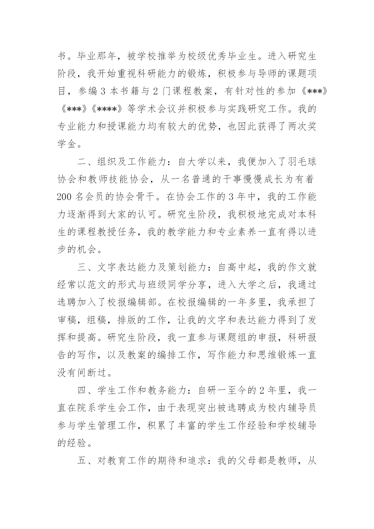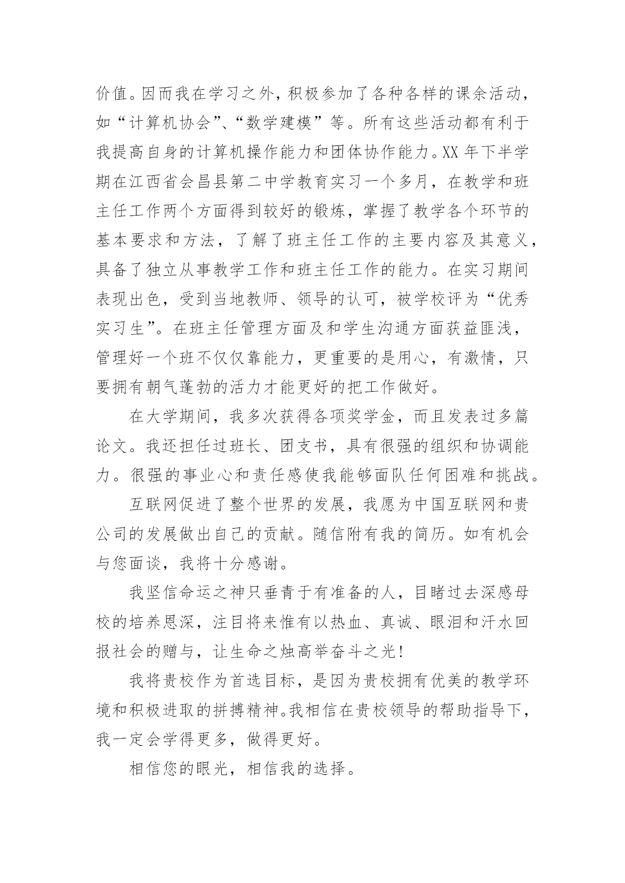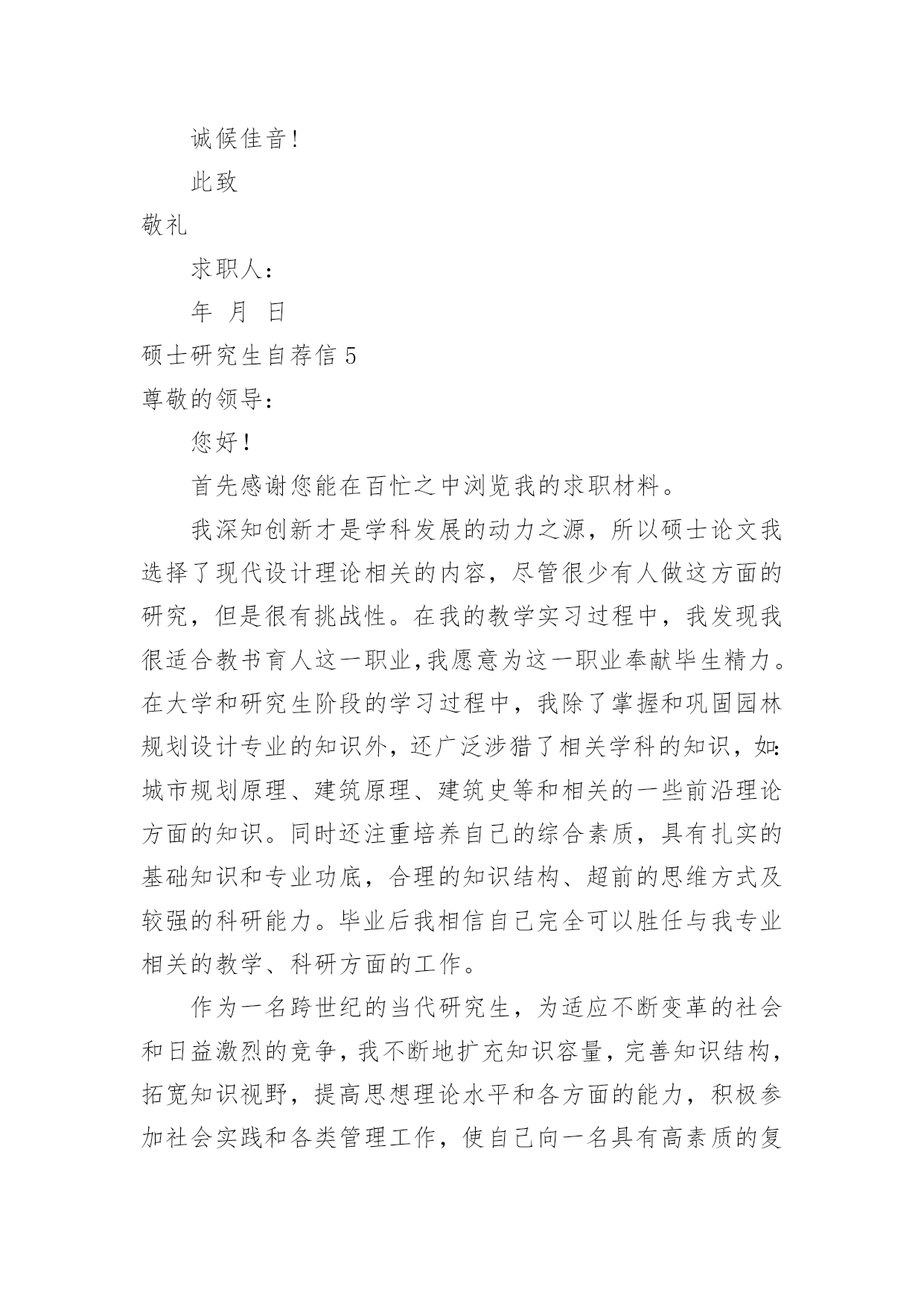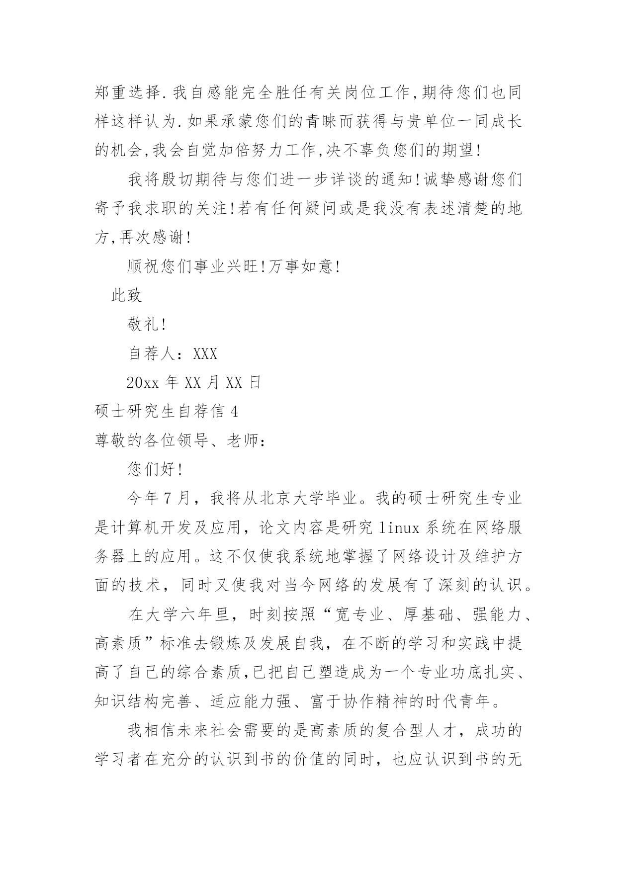 硕士研究生自荐信硕士研究生自荐信在如今这个时代,各种自荐信频频出现,自荐信可以展示出自己的才干和优势。想必许多人都在为如何写好自荐信而烦恼吧,以下是小编为大家收集的硕士研究生自荐信,仅供参考,大家一起来看看吧。硕士研究生自荐信1尊敬的领导:您好!首先感谢您在百忙之中抽出时间来阅读我的这份自荐材料。我叫****,是浙江大学电力系统及其自动化专业的一名硕士研究生,将于20xx年xx月xx日毕业。基于专业和兴趣取向,我非常希望能够成为贵单位的一分子,谨在此向您做一自我推荐。本人20xx年进入浙江大学,就读于电气工程及其自动化专业,同时辅修经济管理学;20xx年获得免试研究生资格,在电力系统及其自动化专业继续深造。在浙大的六年里,我勇于尝试,积极进取,各方面能力都得到了很大的提高。责任心强,吃苦耐劳,能胜任诸多工作。在科研项目方面,主动承担多个课题,完成好导师交给的各项工作:作为“发电厂GCB应用经济效益分析软件开发及应用研究”的主要工作者,推动项目进展顺利;负责学习并推广德国亚琛工业大学可靠性分析软件RAMSES,已服务于实验室多项课题研究,效果显著;还曾独立开发过电网规划经济性分析软件。在社会工作方面,曾任浙江大学电气工程学院研究生会主席、电力经济及其信息化06硕党支部书记、电气工程学院学生会主席等职务,带领团队,成功策划组织过许许多多深受广大师生喜爱的活动。此外,曾作为浙江大学带队人,成功访问过台湾新竹清华大学,并给对方留下非常深刻的印象。严谨敬业,团队合作。多年的科研和社会工作让我养成了严谨敬业、追求团队协作以提高效率的好习惯。20xx年暑期,我在北京电力公司实习,先后在调度通信中心和客户服务中心学习和工作,认真的态度和踏实的作风受到领导和客户的一致好评;20xx年暑期,我在宝洁(中国)有限公司采购部实习,通过与研发部门同事良好的合作,为公司“镁皂”项目的主要原料Mg(OH)2找到三家合适的供货商,并供货至今;作为“浙江省遂昌县电力公司‘十一五’电网发展规划”的参与者,配合师兄很好地完成了负荷预测、经济分析、绘制网架示意图、编写文本等工作,使项目顺利通过上级有关部门验收。品学兼优,成绩显著。多年的刻苦努力,让我取得了许多成果。曾在《华东电力》发表文章《TPPW软件对大容量发电机装设出口断路器的技术经济分析》、《电力市场可中断负荷用户属性研究》,在《内蒙古科技与经济》发表文章《永磁涡流制动的电磁分析与设计》、《基于MATLAB的BP神经网络的设计与训练》;多次获得浙江大学优秀学生干部、三好学生、社会实践优秀个人等荣誉称号,优秀学生、研究与创新等多项奖学金,20xx年被评为浙江大学优秀毕业生、优秀毕业论文。多才多艺,兴趣广泛。由于在声乐和铜管乐方面有一技之长,我曾多次参加学校各类文艺演出和比赛,曾获浙江大学“青春风采”歌手大赛三等奖。另外,我还非常喜欢游泳、篮球和旅行,锻炼身体,磨练意志。诚望贵单位能够全面考察我的情况。若能蒙贵单位垂青,我将倍感骄傲,并继续发扬踏实肯干、吃苦耐劳、责任感强、严谨敬业的优点,在日后的工作中,不懈拼搏之劲,不失进取之心,克尽己能,为电力事业的发展贡献自己的力量!最后,祝您工作顺利,身体健康!再次感谢您阅读此信,敬盼回音!此致敬礼!自荐人20xx年xx月xx日硕士研究生自荐信2尊敬的女士/先生:您好!真诚地感谢您在百忙之中查阅我的求职信。我是电子科技大学自动化工程学院20xx级硕士研究生,20xx年6月我将顺利从学校毕业并获得硕士学位。有幸获悉贵单位正在招聘新员工,我觉得自己开朗稳重、善于教学思考的性格和研究生及本科期间的教学工作情况,很适合贵单位的要求。请允许我简单介绍一下自己:在教学科研方面,自200x年考入电子科技大学攻读工学学士学位以来,我一直积极进取,以认真、严谨的态度对待教学、生活,取得了优秀的成绩,每学年都获得了奖学金。在200x年,由于本科教学期间获得了优异的成绩,我被保送入本校自动化工程学院继续攻读硕士学位。第一学年的课程教学期间获得了优异的成绩。20xx年5月进入教研室以后,开始教学、研究VXI任意波形发生器。半年的时间里,完成了软面板和波形编辑器软件的开发完善和测试。20xx年2月,我来到北京经纬纺机新技术有限公司,参与国家二级攻关项目自动络筒机的电气控制研发,主要负责通讯软件和逻辑控制部分。通过近一年的时间,使得软、硬件控制单锭动作均能达到用户要求,受到领导的好评。本科阶段曾担任校公寓管理委员会生活部部长,和其他干部一起带领会员出色的完成公管会的各项工作,被评为优秀干部。通过公管会的管理,增强了自己的组织能力,锻炼了自己与人沟通的本领。性格积极活泼,能和别人很融洽的相处。我真诚地希望加盟贵单位,我定会以饱满的热情和坚韧的性格勤奋工作,与同事精诚合作,为贵单位的发展尽自己的绵薄