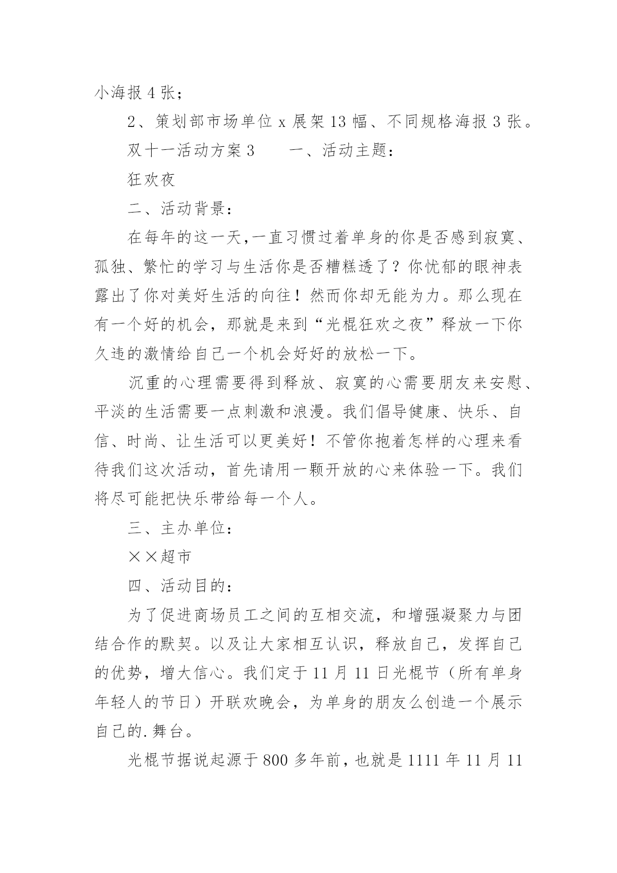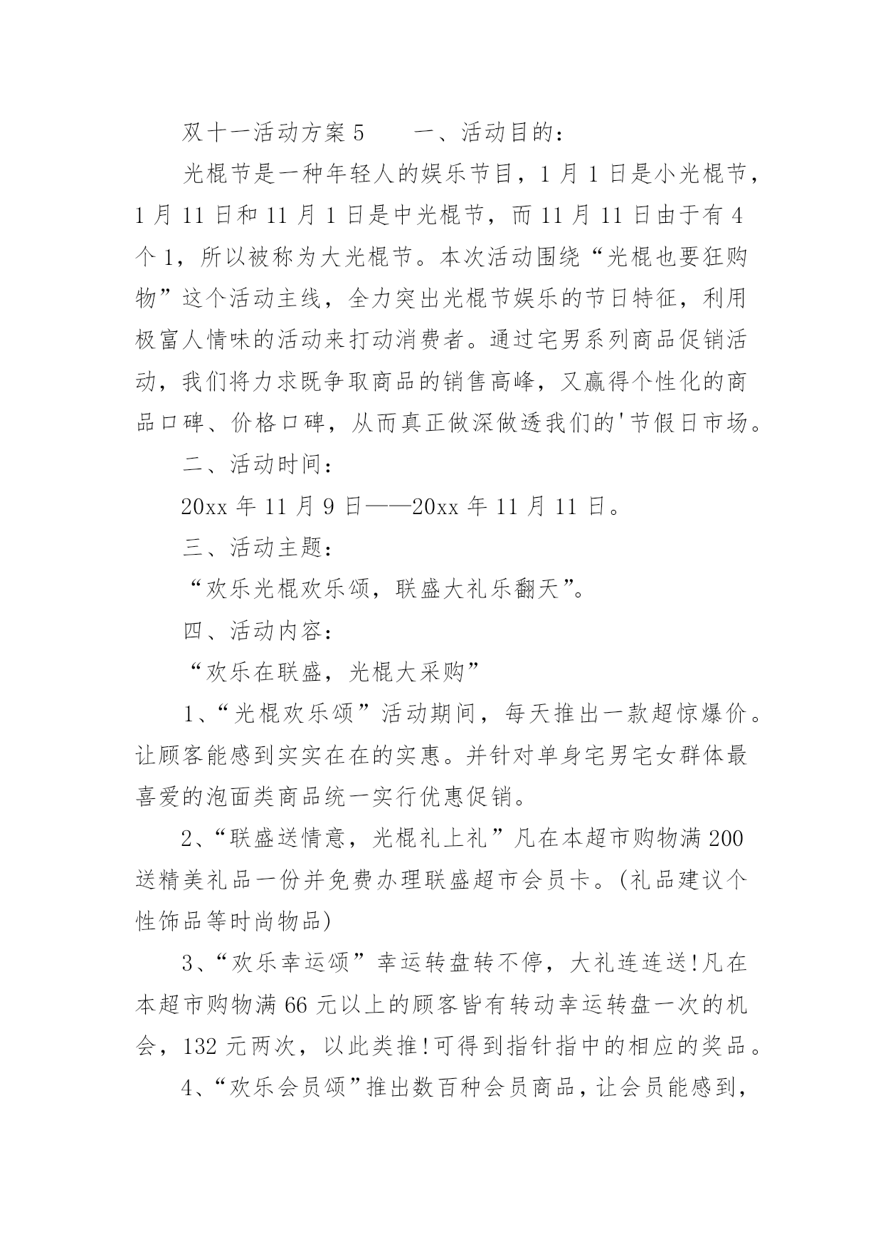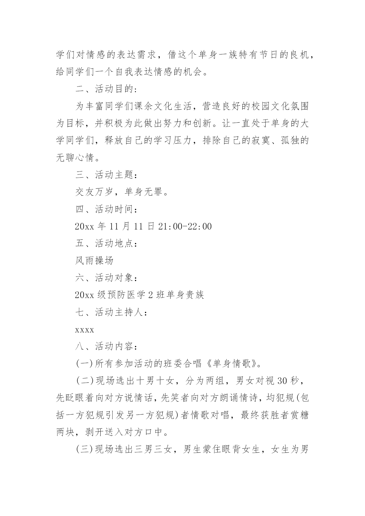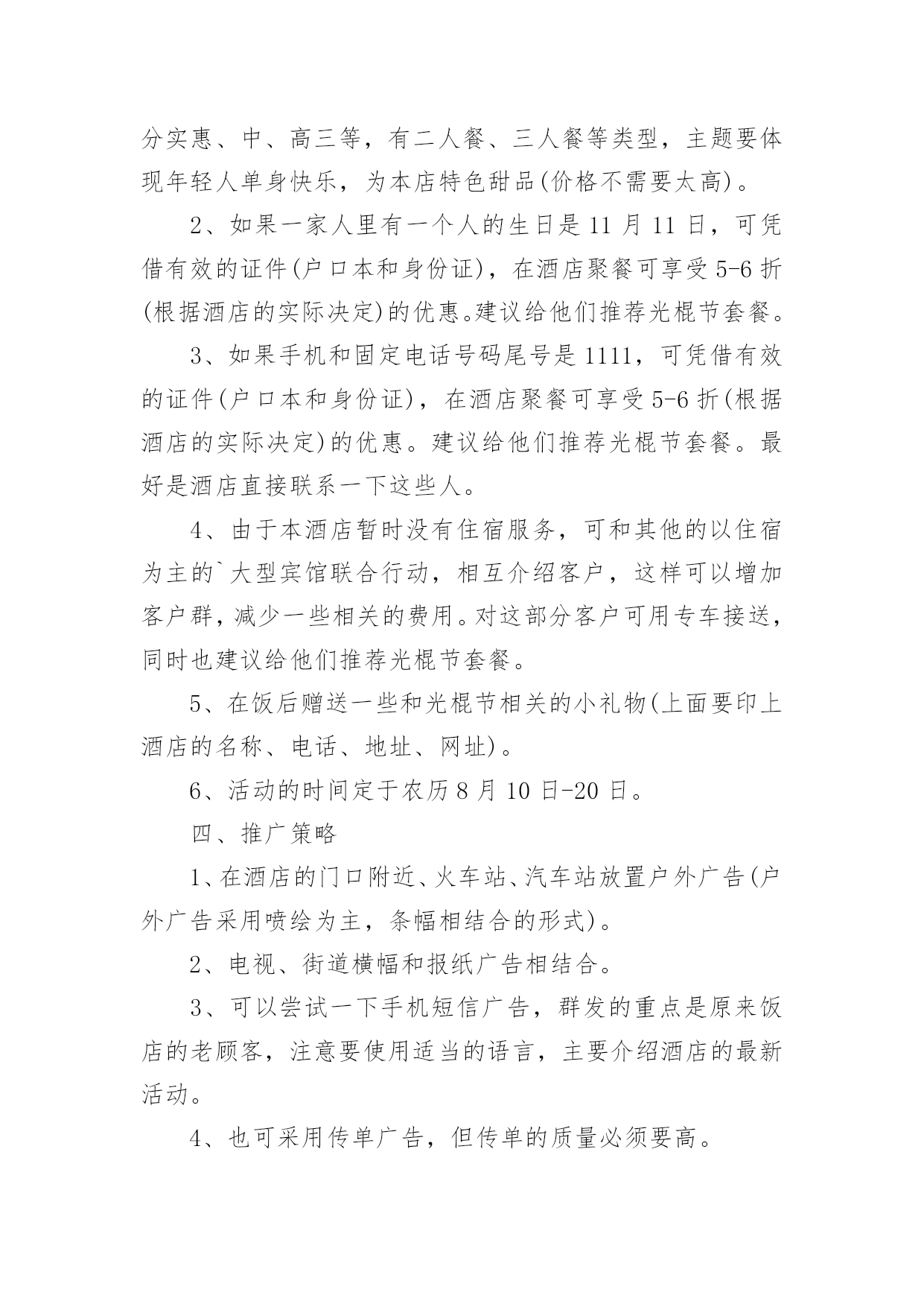 双十一活动方案2021双十一活动方案范文(精选6篇)为了确保活动有序有力开展,通常需要预先制定一份完整的活动方案,活动方案是从活动的目的、要求、方式、方法、进度等方面进行安排的书面计划。优秀的活动方案都具备一些什么特点呢?以下是小编精心整理的2021双十一活动方案范文(精选6篇),希望能够帮助到大家。双十一活动方案1一、目标市场分析本酒店的顾客主要是中上层人士和政府机关工作人员,但其中也有不少是私款消费,这要求酒店在提高档次的基础上必须兼顾那些私款消费者的个人利益。二、定价策略1、饭菜基本上可以保持原来的定价,但要考虑和光棍节相关的一些饭菜的价格,可采用打折(建议使用这种办法)或者直接降低价格的办法。2、针对价格高的饭菜,建议采用减量和减价想结合的办法。3、管滚接的套餐(下面有说明)的价格不要偏高。4、其他的酒水价格和其它服务的价格可根据酒店的实际情况灵活变动,在光棍节的前后达到最低价(但要针对酒店的纯利润来制定)。三、营销策略1、制作专门针对光棍节的套餐,可以根据实际的情况分实惠、中、高三等,有二人餐、三人餐等类型,主题要体现年轻人单身快乐,为本店特色甜品(价格不需要太高)。2、如果一家人里有一个人的生日是11月11日,可凭借有效的证件(户口本和身份证),在酒店聚餐可享受5-6折(根据酒店的实际决定)的优惠。建议给他们推荐光棍节套餐。3、如果手机和固定电话号码尾号是1111,可凭借有效的证件(户口本和身份证),在酒店聚餐可享受5-6折(根据酒店的实际决定)的优惠。建议给他们推荐光棍节套餐。最好是酒店直接联系一下这些人。4、由于本酒店暂时没有住宿服务,可和其他的以住宿为主的`大型宾馆联合行动,相互介绍客户,这样可以增加客户群,减少一些相关的费用。对这部分客户可用专车接送,同时也建议给他们推荐光棍节套餐。5、在饭后赠送一些和光棍节相关的小礼物(上面要印上酒店的名称、电话、地址、网址)。6、活动的时间定于农历8月10日-20日。四、推广策略1、在酒店的门口附近、火车站、汽车站放置户外广告(户外广告采用喷绘为主,条幅相结合的形式)。2、电视、街道横幅和报纸广告相结合。3、可以尝试一下手机短信广告,群发的重点是原来饭店的老顾客,注意要使用适当的语言,主要介绍酒店的最新活动。4、也可采用传单广告,但传单的质量必须要高。注意:以上的广告可同时选择几种,推广的重点在市区,也可向周边的县市推广。广告的受众最低要保证15万人。双十一活动方案2一、活动主题我光棍,我快乐二、活动口号让光棍节见鬼去吧三、活动目的提升餐厅营业额,提升餐厅知名度四、活动地点xx餐厅大厅五、活动时间20xx年11月11日六、活动背景:11月11日是光棍节,每年的光棍节都格外引人关注,社会上越来越多的光棍们,想脱离光棍的.生活状态,因为我们餐厅推出光棍节活动满足光棍们的需求,避免下一个光棍节的光棍。七、活动内容1、活动当晚两人男女通行,免费一个。最低消费需要150元。时间在当天7点至23点。2、凭埋单收据,参与大转盘(奖品设计有玫瑰花、公仔、精美小礼品)。八、活动宣传1、一楼大门口大型海报一张、店内k展架3幅、电梯小海报4张;2、策划部市场单位x展架13幅、不同规格海报3张。双十一活动方案3一、活动主题:狂欢夜二、活动背景:在每年的这一天,一直习惯过着单身的你是否感到寂寞、孤独、繁忙的学习与生活你是否糟糕透了?你忧郁的眼神表露出了你对美好生活的向往!然而你却无能为力。那么现在有一个好的机会,那就是来到“光棍狂欢之夜”释放一下你久违的激情给自己一个机会好好的放松一下。沉重的心理需要得到释放、寂寞的心需要朋友来安慰、平淡的生活需要一点刺激和浪漫。我们倡导健康、快乐、自信、时尚、让生活可以更美好!不管你抱着怎样的心理来看待我们这次活动,首先请用一颗开放的心来体验一下。我们将尽可能把快乐带给每一个人。三、主办单位:××超市四、活动目的:为了促进商场员工之间的互相交流,和增强凝聚力与团结合作的默契。以及让大家相互认识,释放自己,发挥自己的优势,增大信心。我们定于11月11日光棍节(所有单身年轻人的节日)开联欢晚会,为单身的朋友么创造一个展示自己的.舞台。光棍节据说起源于800多年前,也就是1111年11月11日,那天光棍总数达到创纪录的8条。如今光棍节不仅是校园趣味文化的代表产品之一,更成为弥散于社会的一种文化形态。在这里,希望单身的学子们能在我们的组织下挥洒青春热情,展示自己青春洋溢,活力四射的一面。那天我们将一起欢乐地度过,让我们的笑容洋溢在这“狂欢之夜”,成为我们青春历程上的一段美好记忆。五、活动开展:(一)活动时间20xx年11月11日(二)晚上6:30—9:00(三)活动地点生活区c4楼前草坪(四)活动对象××商场的全体会员、邀请的嘉宾以及有兴趣的路人(五)活动内容(1