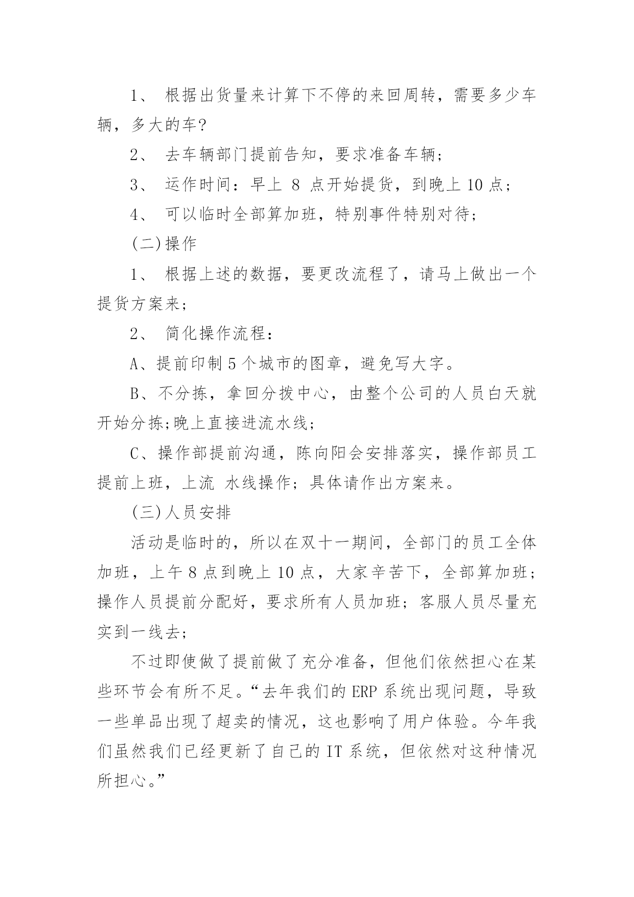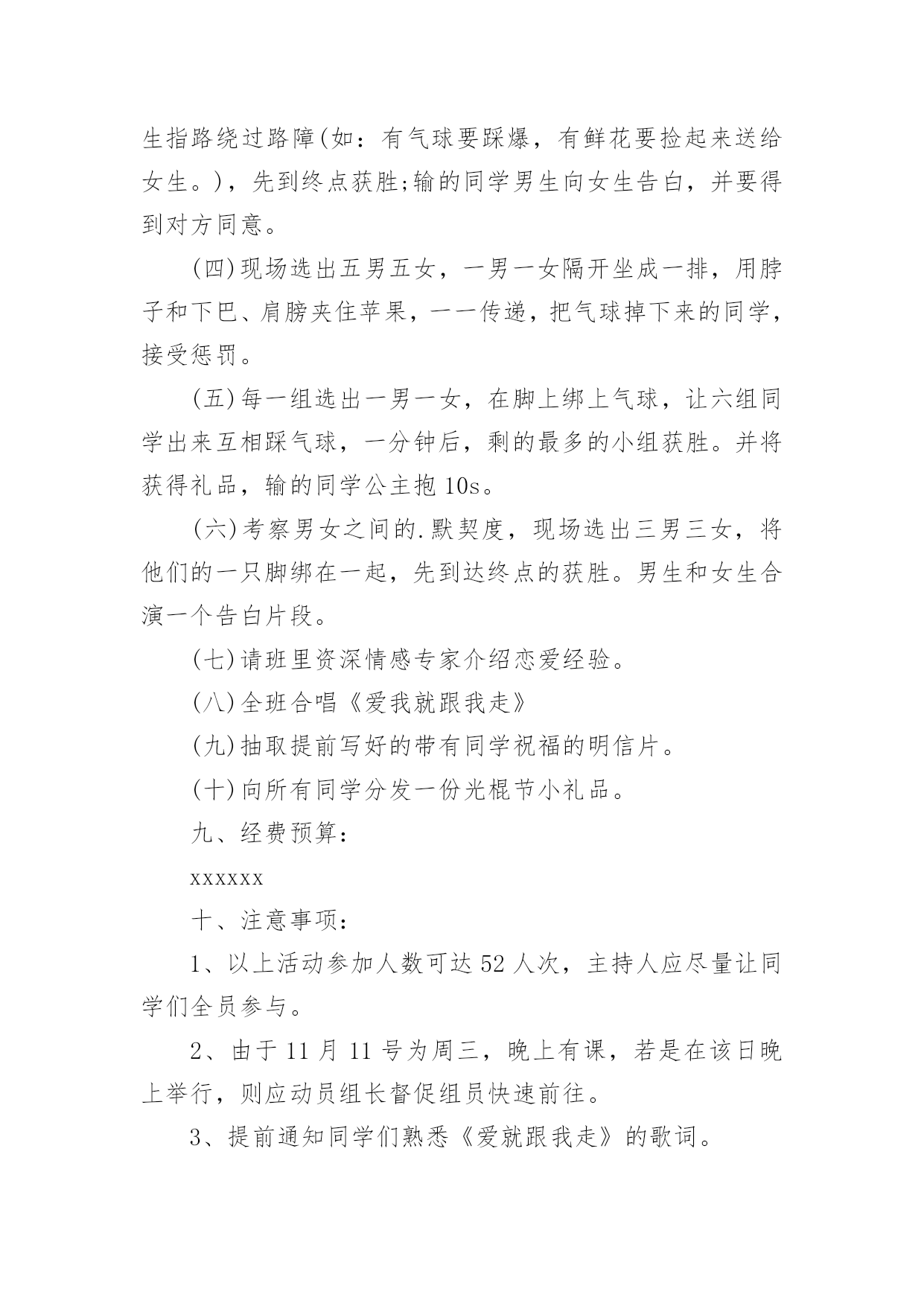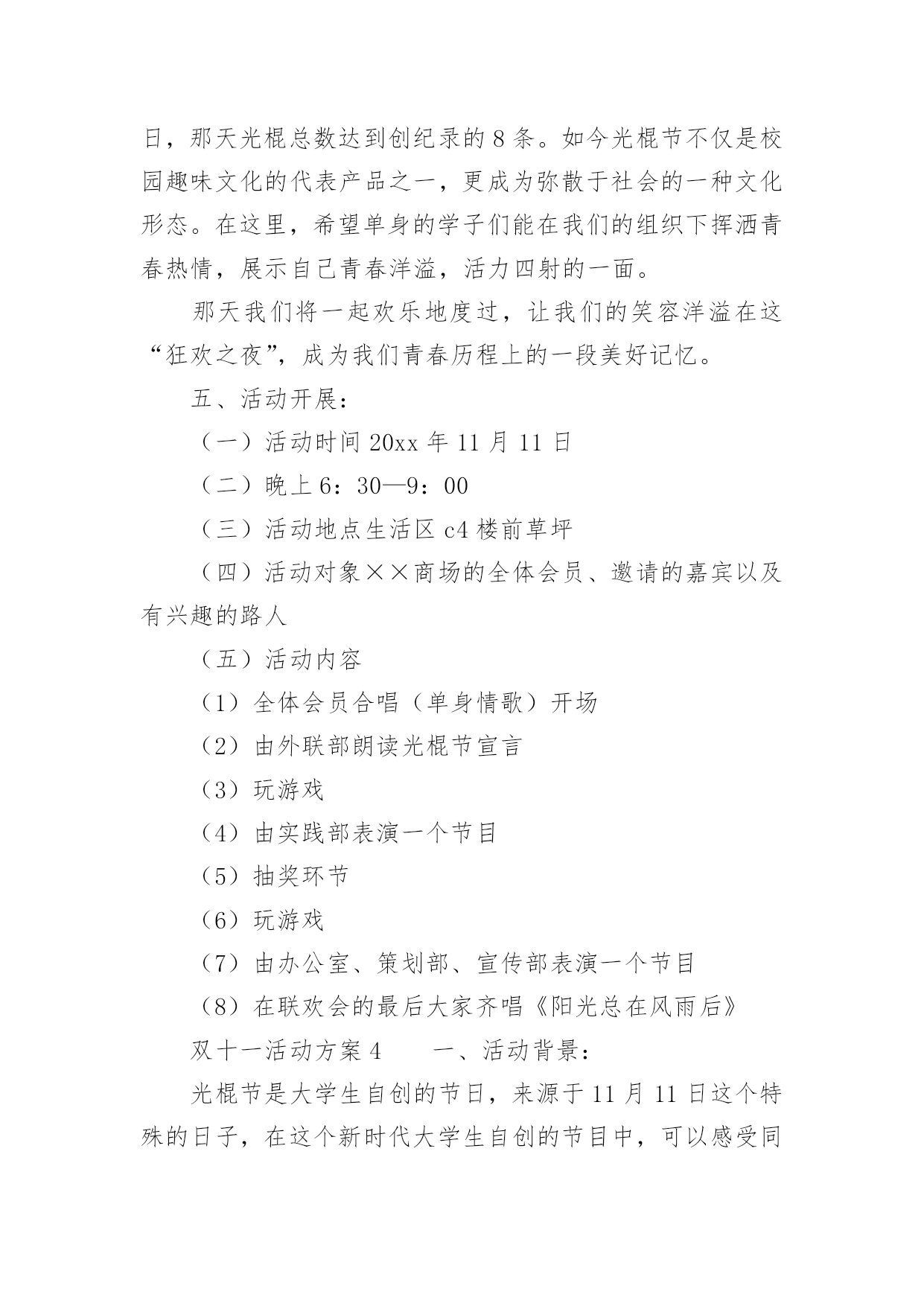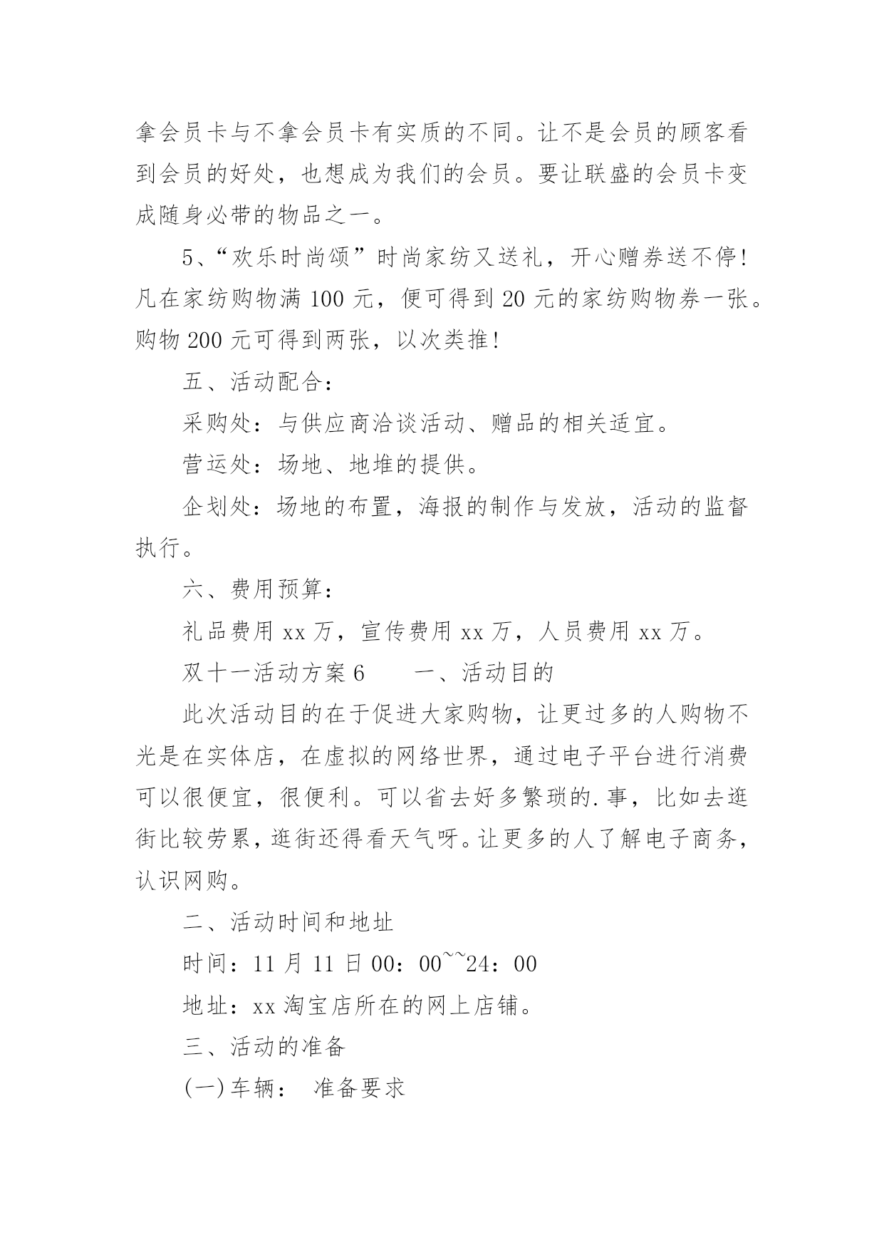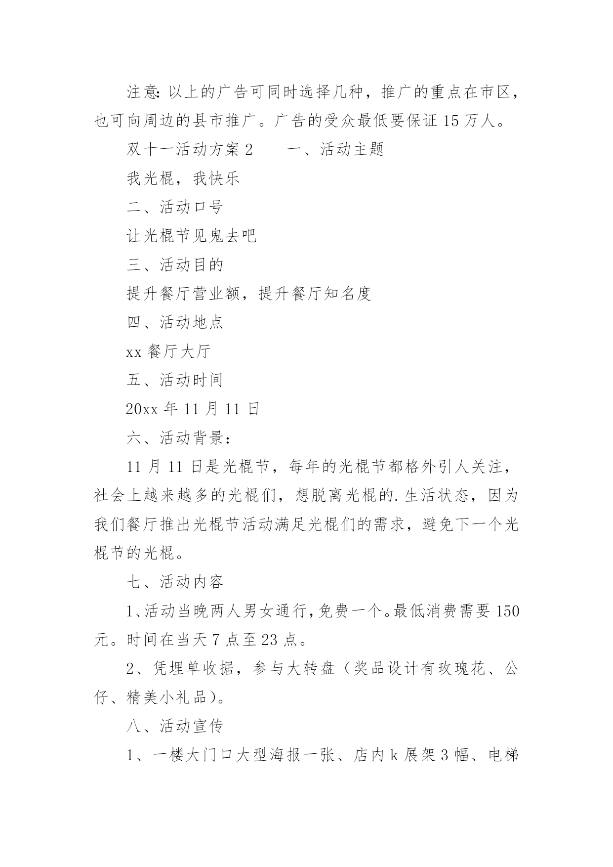 双十一活动方案2021双十一活动方案范文(精选6篇)为了确保活动有序有力开展,通常需要预先制定一份完整的活动方案,活动方案是从活动的目的、要求、方式、方法、进度等方面进行安排的书面计划。优秀的活动方案都具备一些什么特点呢?以下是小编精心整理的2021双十一活动方案范文(精选6篇),希望能够帮助到大家。双十一活动方案1一、目标市场分析本酒店的顾客主要是中上层人士和政府机关工作人员,但其中也有不少是私款消费,这要求酒店在提高档次的基础上必须兼顾那些私款消费者的个人利益。二、定价策略1、饭菜基本上可以保持原来的定价,但要考虑和光棍节相关的一些饭菜的价格,可采用打折(建议使用这种办法)或者直接降低价格的办法。2、针对价格高的饭菜,建议采用减量和减价想结合的办法。3、管滚接的套餐(下面有说明)的价格不要偏高。4、其他的酒水价格和其它服务的价格可根据酒店的实际情况灵活变动,在光棍节的前后达到最低价(但要针对酒店的纯利润来制定)。三、营销策略1、制作专门针对光棍节的套餐,可以根据实际的情况分实惠、中、高三等,有二人餐、三人餐等类型,主题要体现年轻人单身快乐,为本店特色甜品(价格不需要太高)。2、如果一家人里有一个人的生日是11月11日,可凭借有效的证件(户口本和身份证),在酒店聚餐可享受5-6折(根据酒店的实际决定)的优惠。建议给他们推荐光棍节套餐。3、如果手机和固定电话号码尾号是1111,可凭借有效的证件(户口本和身份证),在酒店聚餐可享受5-6折(根据酒店的实际决定)的优惠。建议给他们推荐光棍节套餐。最好是酒店直接联系一下这些人。4、由于本酒店暂时没有住宿服务,可和其他的以住宿为主的`大型宾馆联合行动,相互介绍客户,这样可以增加客户群,减少一些相关的费用。对这部分客户可用专车接送,同时也建议给他们推荐光棍节套餐。5、在饭后赠送一些和光棍节相关的小礼物(上面要印上酒店的名称、电话、地址、网址)。6、活动的时间定于农历8月10日-20日。四、推广策略1、在酒店的门口附近、火车站、汽车站放置户外广告(户外广告采用喷绘为主,条幅相结合的形式)。2、电视、街道横幅和报纸广告相结合。3、可以尝试一下手机短信广告,群发的重点是原来饭店的老顾客,注意要使用适当的语言,主要介绍酒店的最新活动。4、也可采用传单广告,但传单的质量必须要高。注意:以上的广告可同时选择几种,推广的重点在市区,也可向周边的县市推广。广告的受众最低要保证15万人。双十一活动方案2一、活动主题我光棍,我快乐二、活动口号让光棍节见鬼去吧三、活动目的提升餐厅营业额,提升餐厅知名度四、活动地点xx餐厅大厅五、活动时间20xx年11月11日六、活动背景:11月11日是光棍节,每年的光棍节都格外引人关注,社会上越来越多的光棍们,想脱离光棍的.生活状态,因为我们餐厅推出光棍节活动满足光棍们的需求,避免下一个光棍节的光棍。七、活动内容1、活动当晚两人男女通行,免费一个。最低消费需要150元。时间在当天7点至23点。2、凭埋单收据,参与大转盘(奖品设计有玫瑰花、公仔、精美小礼品)。八、活动宣传1、一楼大门口大型海报一张、店内k展架3幅、电梯小海报4张;2、策划部市场单位x展架13幅、不同规格海报3张。双十一活动方案3一、活动主题:狂欢夜二、活动背景:在每年的这一天,一直习惯过着单身的你是否感到寂寞、孤独、繁忙的学习与生活你是否糟糕透了?你忧郁的眼神表露出了你对美好生活的向往!然而你却无能为力。那么现在有一个好的机会,那就是来到“光棍狂欢之夜”释放一下你久违的激情给自己一个机会好好的放松一下。沉重的心理需要得到释放、寂寞的心需要朋友来安慰、平淡的生活需要一点刺激和浪漫。我们倡导健康、快乐、自信、时尚、让生活可以更美好!不管你抱着怎样的心理来看待我们这次活动,首先请用一颗开放的心来体验一下。我们将尽可能把快乐带给每一个人。三、主办单位:××超市四、活动目的:为了促进商场员工之间的互相交流,和增强凝聚力与团结合作的默契。以及让大家相互认识,释放自己,发挥自己的优势,增大信心。我们定于11月11日光棍节(所有单身年轻人的节日)开联欢晚会,为单身的朋友么创造一个展示自己的.舞台。光棍节据说起源于800多年前,也就是1111年11月11日,那天光棍总数达到创纪录的8条。如今光棍节不仅是校园趣味文化的代表产品之一,更成为弥散于社会的一种文化形态。在这里,希望单身的学子们能在我们的组织下挥洒青春热情,展示自己青春洋溢,活力四射的一面。那天我们将一起欢乐地度过,让我们的笑容洋溢在这“狂欢之夜”,成为我们青春历程上的一段美好记忆。五、活动开展:(一)活动时间20xx年11月11日(二)晚上6:30—9:00(三)活动地点生活区c4楼前草坪(四)活动对象××商场的全体会员、邀请的嘉宾以及有兴趣的路人(五)活动内容(1
