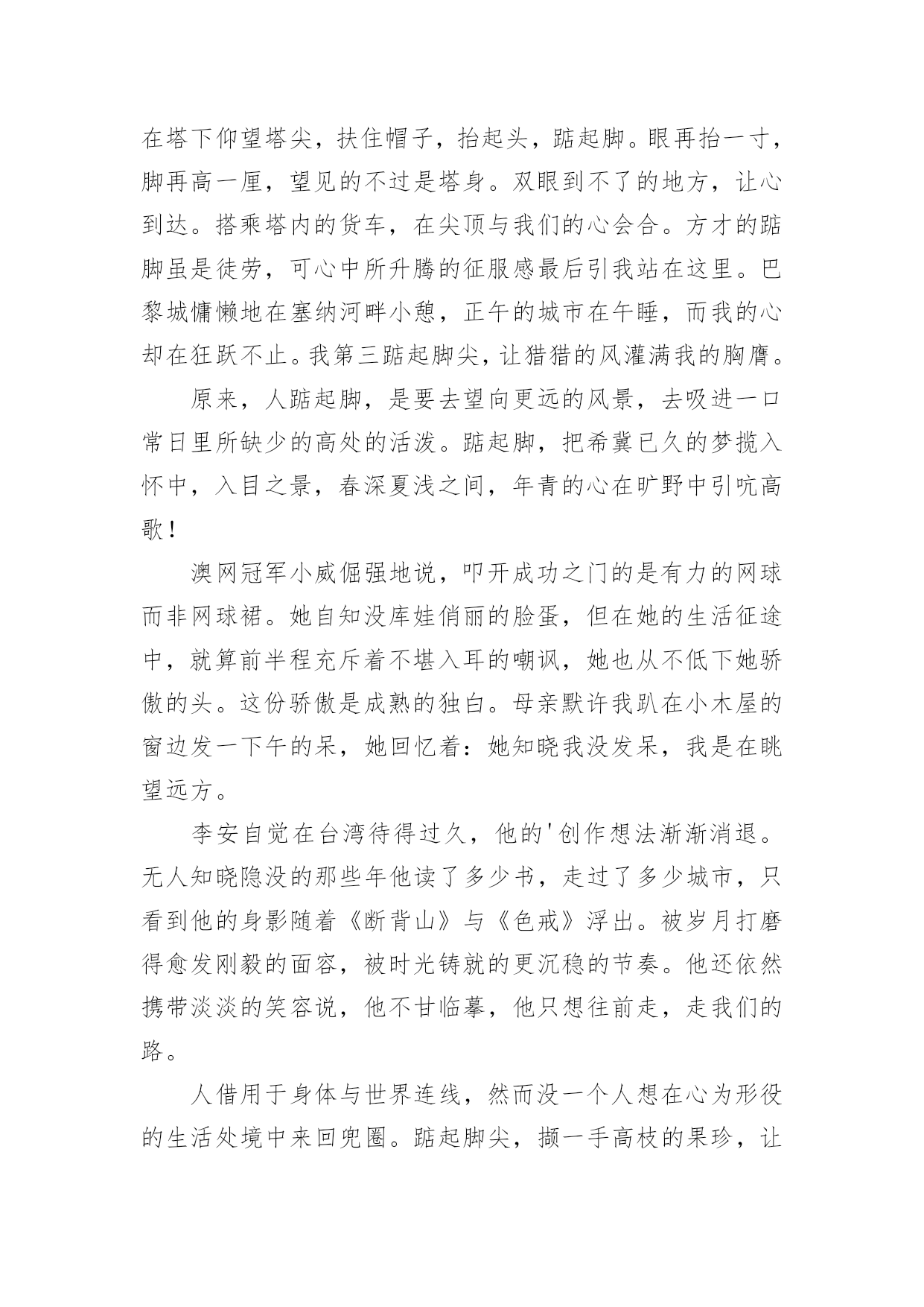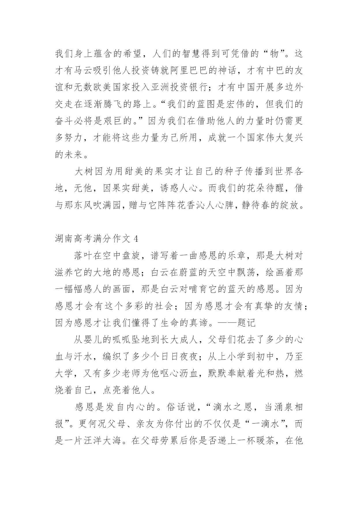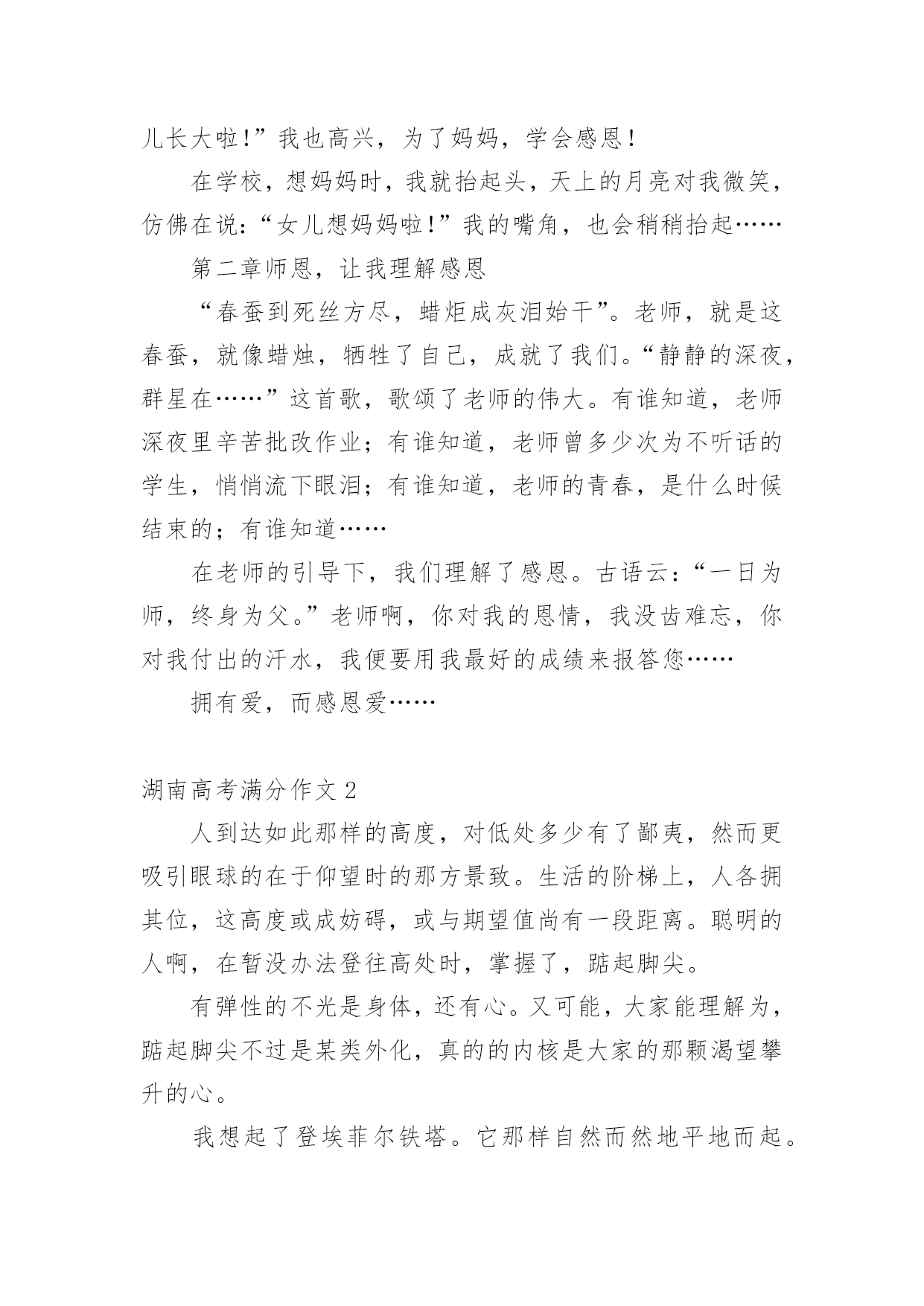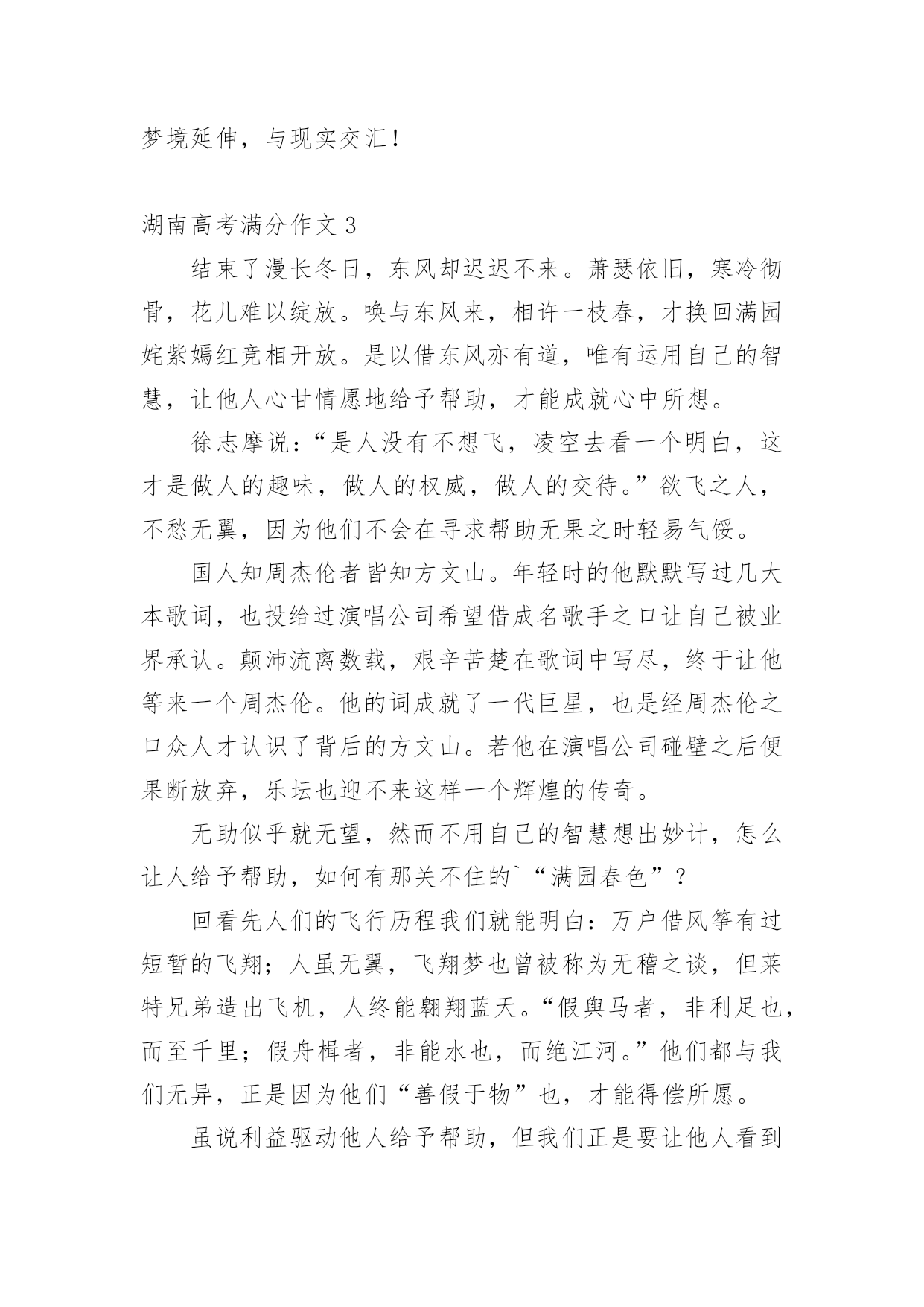湖南高考满分作文在日复一日的学习、工作或生活中,大家都不可避免地要接触到作文吧,作文是由文字组成,经过人的思想考虑,通过语言组织来表达一个主题意义的文体。相信写作文是一个让许多人都头痛的问题,以下是小编帮大家整理的湖南高考满分作文,欢迎阅读与收藏。湖南高考满分作文1世界,因为爱,而多了感动;世界,因为感动,而多了感恩;谁能说谁没有被爱过、没有被感动过,那感恩这束美丽的火花,也会在你的心中悄然燃起……——题记第一章母爱,让我学会感恩十二年,就这样匆匆地过去了,一个人,能有多少个十二年,母亲为我匆忙了十二年,劳累了十二年,换来的,是女儿长大了。吃饭的时候,看到母亲的`头上,又多了几根银丝,眼角的皱纹,像一条条河流,愈来愈多了。饭后,我独自一人走在小路上,夜,静静地,我抬头望着天空,似乎星星上,都刻着一个个熟悉的字眼——妈妈……女儿长大了,是该为妈妈做些什么了。过后,我学会了一些家务,拖地板、擦桌子、洗碗、洗衣服……我学会的家务越来越多,母亲的压力也越来越少,妈妈时常感慨道:“女儿长大啦!”我也高兴,为了妈妈,学会感恩!在学校,想妈妈时,我就抬起头,天上的月亮对我微笑,仿佛在说:“女儿想妈妈啦!”我的嘴角,也会稍稍抬起……第二章师恩,让我理解感恩“春蚕到死丝方尽,蜡炬成灰泪始干”。老师,就是这春蚕,就像蜡烛,牺牲了自己,成就了我们。“静静的深夜,群星在……”这首歌,歌颂了老师的伟大。有谁知道,老师深夜里辛苦批改作业;有谁知道,老师曾多少次为不听话的学生,悄悄流下眼泪;有谁知道,老师的青春,是什么时候结束的;有谁知道……在老师的引导下,我们理解了感恩。古语云:“一日为师,终身为父。”老师啊,你对我的恩情,我没齿难忘,你对我付出的汗水,我便要用我最好的成绩来报答您……拥有爱,而感恩爱……湖南高考满分作文2人到达如此那样的高度,对低处多少有了鄙夷,然而更吸引眼球的在于仰望时的那方景致。生活的阶梯上,人各拥其位,这高度或成妨碍,或与期望值尚有一段距离。聪明的人啊,在暂没办法登往高处时,掌握了,踮起脚尖。有弹性的不光是身体,还有心。又可能,大家能理解为,踮起脚尖不过是某类外化,真的的内核是大家的那颗渴望攀升的心。我想起了登埃菲尔铁塔。它那样自然而然地平地而起。在塔下仰望塔尖,扶住帽子,抬起头,踮起脚。眼再抬一寸,脚再高一厘,望见的不过是塔身。双眼到不了的地方,让心到达。搭乘塔内的货车,在尖顶与我们的心会合。方才的踮脚虽是徒劳,可心中所升腾的征服感最后引我站在这里。巴黎城慵懒地在塞纳河畔小憩,正午的城市在午睡,而我的心却在狂跃不止。我第三踮起脚尖,让猎猎的风灌满我的胸膺。原来,人踮起脚,是要去望向更远的风景,去吸进一口常日里所缺少的高处的活泼。踮起脚,把希冀已久的梦揽入怀中,入目之景,春深夏浅之间,年青的心在旷野中引吭高歌!澳网冠军小威倔强地说,叩开成功之门的是有力的网球而非网球裙。她自知没库娃俏丽的脸蛋,但在她的生活征途中,就算前半程充斥着不堪入耳的嘲讽,她也从不低下她骄傲的头。这份骄傲是成熟的独白。母亲默许我趴在小木屋的窗边发一下午的呆,她回忆着:她知晓我没发呆,我是在眺望远方。李安自觉在台湾待得过久,他的'创作想法渐渐消退。无人知晓隐没的那些年他读了多少书,走过了多少城市,只看到他的身影随着《断背山》与《色戒》浮出。被岁月打磨得愈发刚毅的面容,被时光铸就的更沉稳的节奏。他还依然携带淡淡的笑容说,他不甘临摹,他只想往前走,走我们的路。人借用于身体与世界连线,然而没一个人想在心为形役的生活处境中来回兜圈。踮起脚尖,撷一手高枝的果珍,让梦境延伸,与现实交汇!湖南高考满分作文3结束了漫长冬日,东风却迟迟不来。萧瑟依旧,寒冷彻骨,花儿难以绽放。唤与东风来,相许一枝春,才换回满园姹紫嫣红竞相开放。是以借东风亦有道,唯有运用自己的智慧,让他人心甘情愿地给予帮助,才能成就心中所想。徐志摩说:“是人没有不想飞,凌空去看一个明白,这才是做人的趣味,做人的权威,做人的交待。”欲飞之人,不愁无翼,因为他们不会在寻求帮助无果之时轻易气馁。国人知周杰伦者皆知方文山。年轻时的他默默写过几大本歌词,也投给过演唱公司希望借成名歌手之口让自己被业界承认。颠沛流离数载,艰辛苦楚在歌词中写尽,终于让他等来一个周杰伦。他的词成就了一代巨星,也是经周杰伦之口众人才认识了背后的方文山。若他在演唱公司碰壁之后便果断放弃,乐坛也迎不来这样一个辉煌的传奇。无助似乎就无望,然而不用自己的智慧想出妙计,怎么让人给予帮助,如何有那关不住的`“满园春色”?回看先人们的飞行历程我们就能明白:万户借风筝有过短暂的飞翔;人虽无翼,飞翔梦也曾被称为无稽之谈,但莱特兄弟造出飞机,人终能翱翔蓝天。“假舆马者,非利足也,而至千里;假舟楫者,非能水也,而绝江河。”他们都与我们无异,正是因为他们“善假于物”也,