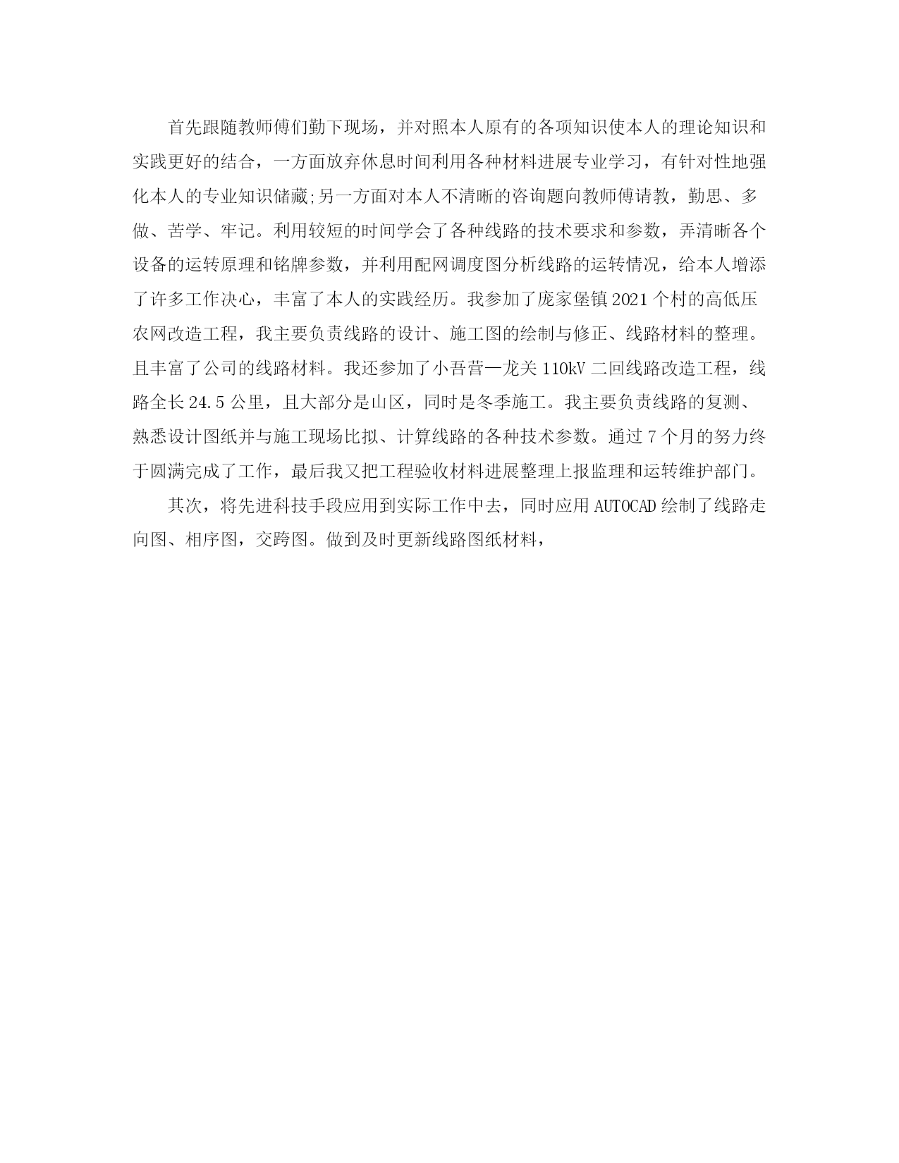 电力专业技术工作参考总结(通用)本人毕业于华北电力大学,所学专业为供用电工程。进入电力实业公司参加工作至今。在这五年中,我先后在电力实业公司的线路班、变电班、生技股从事消费一线工作。在各位领导和同事的支持和协助下,本人的思想、工作、学习等各方面都获得了一定的成绩,个人综合素养也得到了一定的提高,下面就从专业技术角度对我这五年来的工作做一次全面总结:电力企业是一个特别的行业,它需要职工有良好的本身才能和心理素养,因而我不断学习各种技能,努力学习和掌握电力系统运转方式及其特点,理解全地区的配电网运转情况,同时能依照各类电气设备的需要,掌握相关的电工根底、电工材料、高压工程技术专业知识,能依照现场电气设备运转情况选择最正确运转方式及经济运转方法,依照实际运转经历,正确处理电气系统的设备毛病以及系统突发性事故,初步理解班组治理和消费技术治理的根本常识,进一步加强本人的业务水平。一、学习消费运转专业知识,提高岗位劳动技能从XX年参加工作,领导为了让我尽快转变角色,熟悉工作环境,习惯消费要求,我先后被分配至电力实业公司的线路班和变电班从事线路架设、电缆敷设、高压试验、继保及变电检修等工作。工作伊始,我发觉学校里学到的专业知识同消费实际有特别大的不同和差距。为此我努力学习消费运转专业知识,努力提高本人的岗位劳动技能,在短短的一年内,我主动吸收教师傅们的工作经历,谦虚向他们请教工作中的技术咨询题,并通过本人的努力,迅速掌握了线路和变电运转的消费程序及各种一、二次设备的标准、参数。二、从事施工设计和技术治理工作XX年年底,我被分配到电力实业公司生技股,主要负责输配电线路的设计和施工。如今,正是农网改造初期,工作量特别大,在时间紧任务重的情势下,我边工作边学习,特别快就步入了正规。首先跟随教师傅们勤下现场,并对照本人原有的各项知识使本人的理论知识和实践更好的结合,一方面放弃休息时间利用各种材料进展专业学习,有针对性地强化本人的专业知识储藏;另一方面对本人不清晰的咨询题向教师傅请教,勤思、多做、苦学、牢记。利用较短的时间学会了各种线路的技术要求和参数,弄清晰各个设备的运转原理和铭牌参数,并利用配网调度图分析线路的运转情况,给本人增添了许多工作决心,丰富了本人的实践经历。我参加了庞家堡镇2021个村的高低压农网改造工程,我主要负责线路的设计、施工图的绘制与修正、线路材料的整理。且丰富了公司的线路材料。我还参加了小吾营—龙关110kV二回线路改造工程,线路全长24.5公里,且大部分是山区,同时是冬季施工。我主要负责线路的复测、熟悉设计图纸并与施工现场比拟、计算线路的各种技术参数。通过7个月的努力终于圆满完成了工作,最后我又把工程验收材料进展整理上报监理和运转维护部门。其次,将先进科技手段应用到实际工作中去,同时应用AUTOCAD绘制了线路走向图、相序图,交跨图。做到及时更新线路图纸材料,