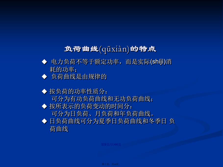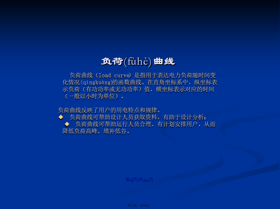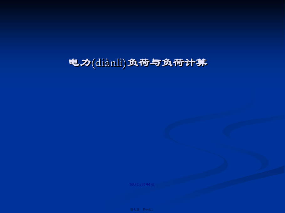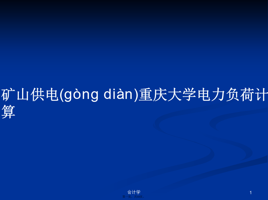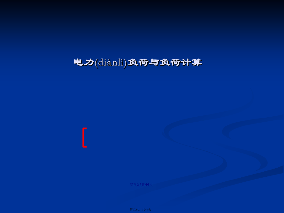 会计学电力(diànlì)负荷计算电力负荷(fùhè)计算电力负荷(fùhè)与负荷(fùhè)计算电力(diànlì)负荷与负荷计算电力(diànlì)负荷与负荷计算电力(diànlì)负荷与负荷计算负荷(fùhè)分级负荷(fùhè)曲线负荷曲线(qūxiàn)的特点日有功负荷(fùhè)曲线的绘制:年有功(yǒuɡōnɡ)负荷曲线的绘制:日负荷(fùhè)曲线和年负荷(fùhè)曲线的区别:与负荷(fùhè)计算相关的物理量:与负荷(fùhè)计算相关的物理量:计算负荷(calculatedload):通常将以半小时平均负荷为依据(yījù)所绘制的负荷曲线上的“最大负荷”称为计算负荷,并把它作为按发热条件选择电气设备的依据(yījù),用Pca(Qca、Sca、Ica)或P30(Q30、S30、I30)表示。特点:运行时间长,足以使之达到热平衡。通风机、水泵(shuǐbèng)、空气压缩机、发电机组、照明灯具等。设备容量:Pe=Pn特点(tèdiǎn):工作或停歇时间均达不到热平衡时间。如:电焊机、吊车电动机等暂载率:吊车机组用电动机的设备容量统一换算到ε=25%时的额定功率(édìnɡɡōnɡlǜ)(kW),若其εN不等于25%时应进行换算,公式为:小结(xiǎojié):需用(xūyònɡ)系数法计算负荷单个用电设备组的计算(jìsuàn)负荷例:某企业有一组用电设备,共有电压(diànyā)为380V的电动机39台,其中3台10KW,8台4KW,18台3KW,10台1.5KW。用需用系数法求该设备的计算负荷。该用电设备为连续工作制,Pe=Pn。Pe=10x3+8x4+18x3+10x1.5=131KW查表得:当Kd值有一定变动范围时,取值要作具体分析。如台数多时,一般取用较小值,台数少时取用较大值;设备使用率高时,取用较大值,使用率低时取用较小值。当一条线路内的用电设备的台数较小(n<3台)时,一般是将用电设备额定容量的总和(zǒnghé)作为计算负荷,或者采用较大的Kd值(0.85~1)。需用系数是一个长期经验数据,当设备台数较多、总容量够大时,并且没有特殊(tèshū)的大型用电设备时,表中查出的值才较为准确。但如果计算的组别中含有大型用电设备时,则需用二项式法确定计算负荷。例:一机修车间的380V线路(xiànlù)上,接有金属切削机床电动机20台共50kW;另接通风机3台共5kW;电葫芦4个共6kW(FCN=40%)试求计算负荷。解:电动机组:查表可得Kd=0.16~0.2(取0.2),cos=0.5,tan=1.73,因此Pca(1)=Kd∑Pe=0.2×50=10(kW)Qca(1)=Pca(1)tanwm=10×1.73=17.3(kvar)Sca(1)=Pca(1)/coswm=10/0.5=20(kVA)尖峰电流:单台或多台设备持续1-2S的短时最大负荷电流。用Ipk表征。尖峰电流产生的原因:主要由大容量电动机的启动、电压(diànyā)的波动等原因造成。计算尖峰电流的目的:选择熔断器、继电保护装置。单台设备尖峰(jiānfēnɡ)电流的计算:Ipk=KstIn式中:Kst为启动电流倍数多台设备尖峰电流(diànliú)的计算:当设备不是同时启动时当设备同时启动时功率损耗(sǔnhào)与电能损耗(sǔnhào)的计算功率(gōnglǜ)损耗与电能损耗的计算功率(gōnglǜ)损耗与电能损耗的计算变压器的功率(gōnglǜ)损耗变压器的功率(gōnglǜ)损耗供电线路年电能损耗(sǔnhào)的计算企业(qǐyè)负荷计算---逐级计算法企业负荷(fùhè)计算---逐级计算法本章(běnzhānɡ)小结: