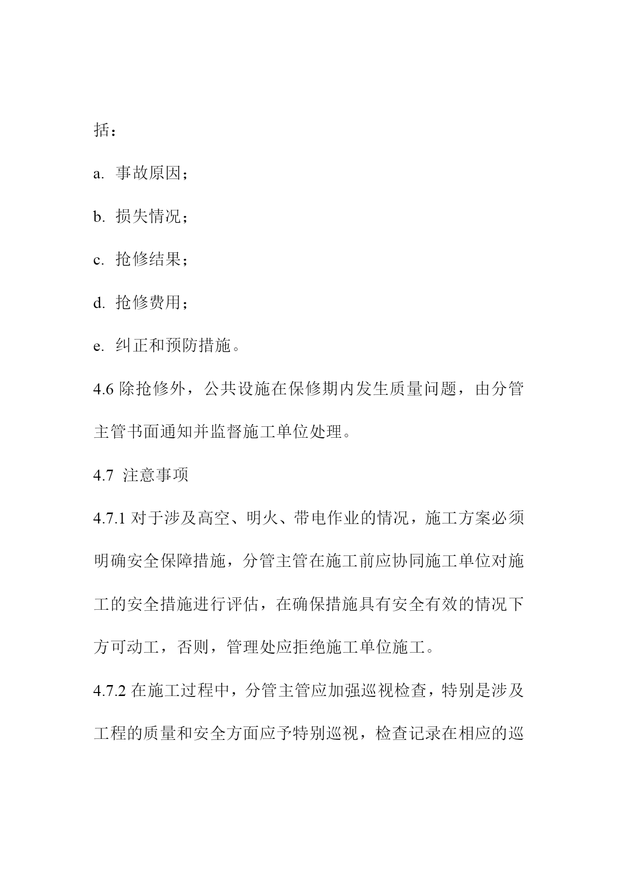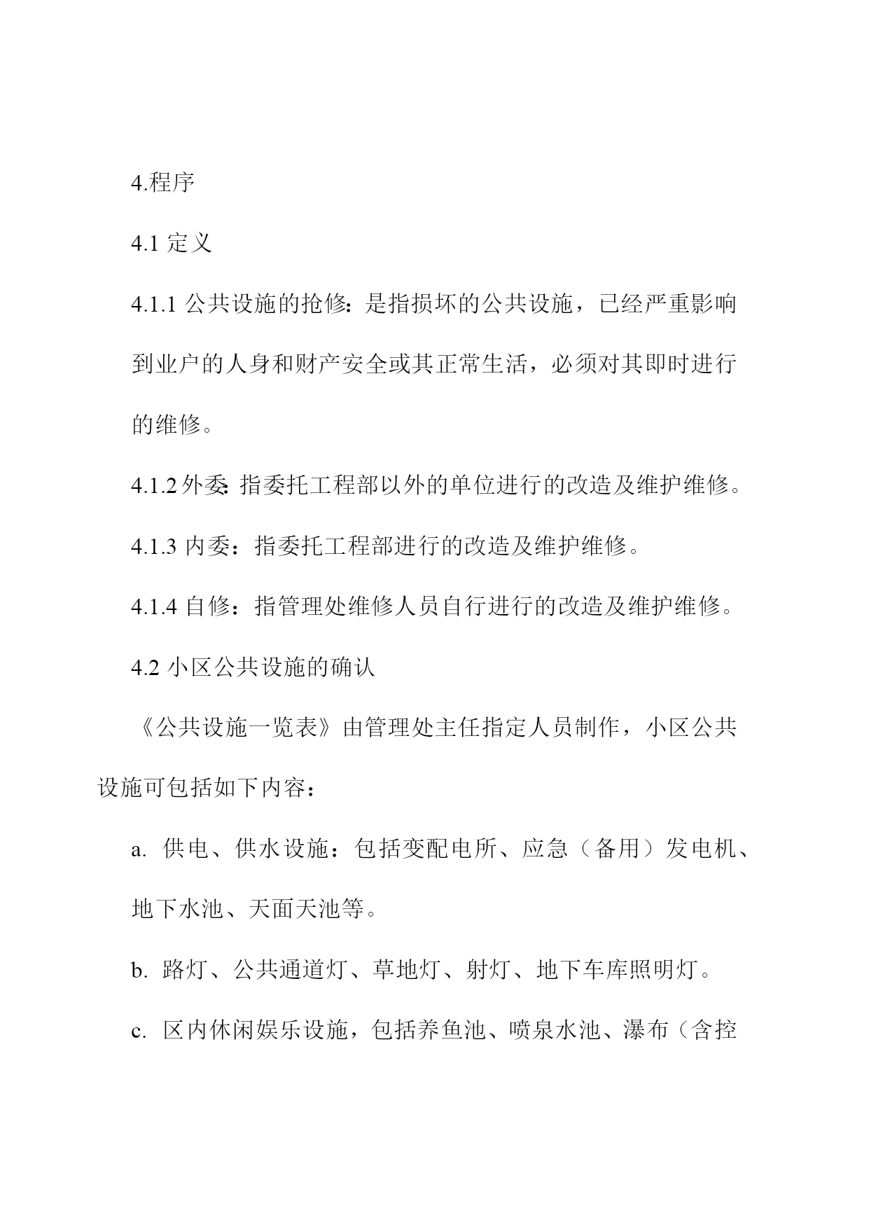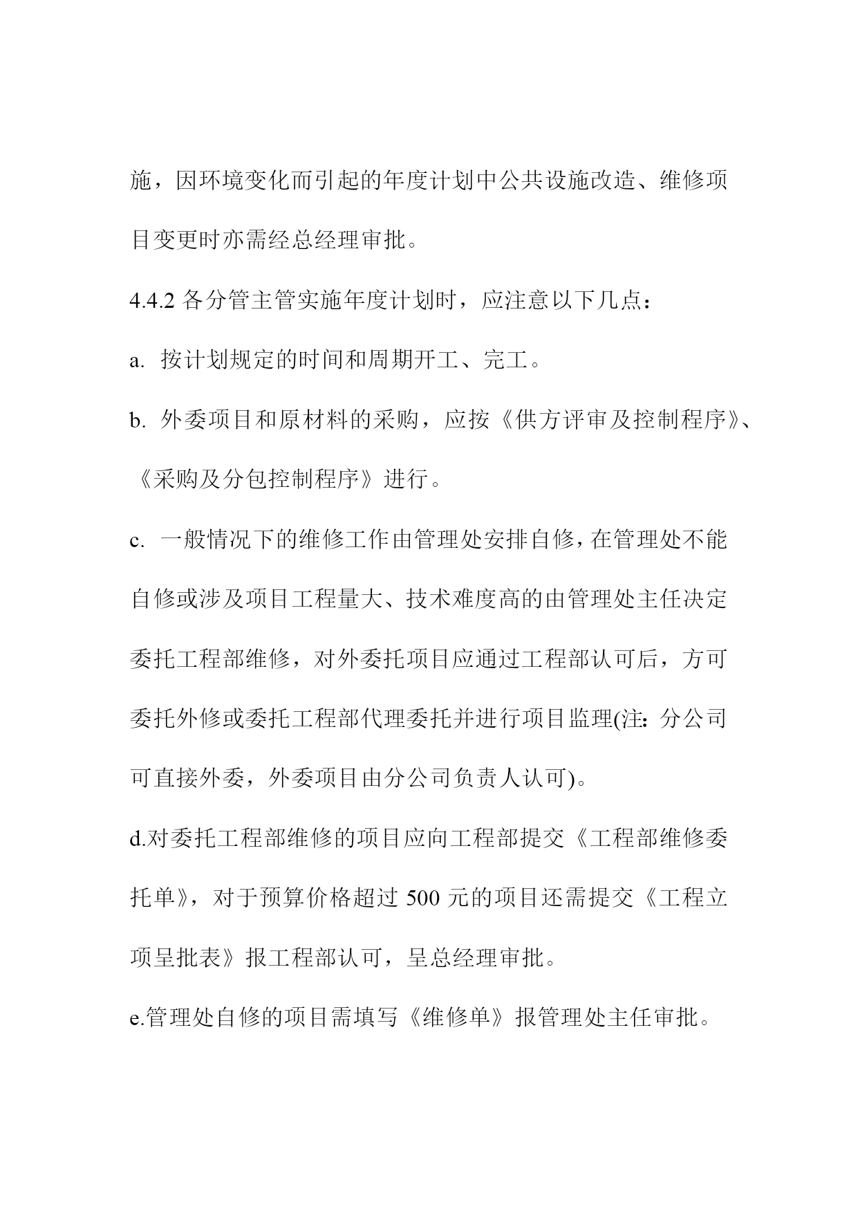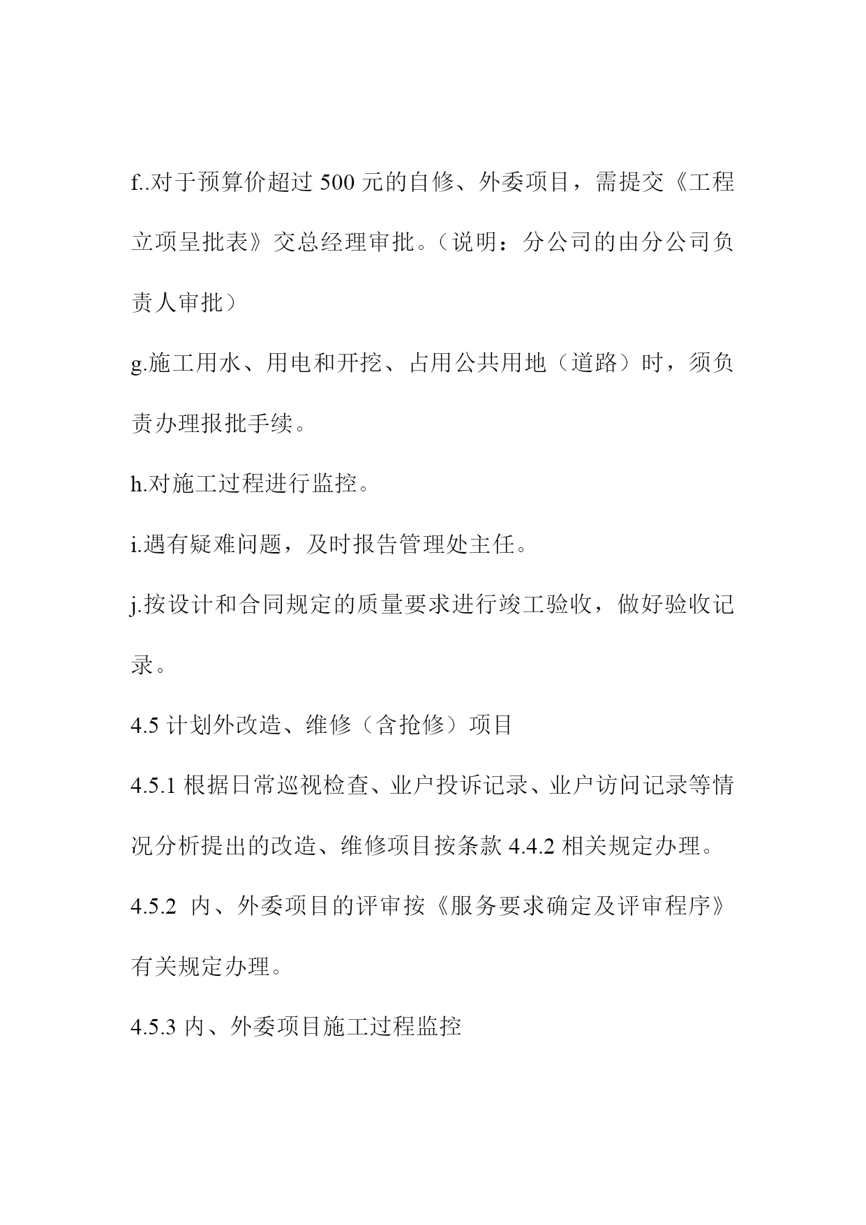 公共设施改造及维护维修工作规程1目的确保及时更新、改造、维护维修公共设施,保证其适时适量增容和正常运行。2.适用范围适用于各管理处管理的公共设施的改造及维护维修。3.职责3.1总经理负责审批《年度公共设施改造及维护维修工作计划》。3.2管理处主任负责组织有关人员评估公共设施改造及维护维修的必要性和可行性。3.3分管主管负责监控和验收公共设施改造及维护维修工作质量。4.程序4.1定义4.1.1公共设施的抢修:是指损坏的公共设施,已经严重影响到业户的人身和财产安全或其正常生活,必须对其即时进行的维修。4.1.2外委:指委托工程部以外的单位进行的改造及维护维修。4.1.3内委:指委托工程部进行的改造及维护维修。4.1.4自修:指管理处维修人员自行进行的改造及维护维修。4.2小区公共设施的确认《公共设施一览表》由管理处主任指定人员制作,小区公共设施可包括如下内容:供电、供水设施:包括变配电所、应急(备用)发电机、地下水池、天面天池等。路灯、公共通道灯、草地灯、射灯、地下车库照明灯。区内休闲娱乐设施,包括养鱼池、喷泉水池、瀑布(含控制装置)、休闲桌、椅、滑梯、秋千等。消防设施,包括室内、外消火栓、消防喷淋、消防报警装置等。公共天线、公共电信线路、电话DP箱、有线电视接线箱。卫生设施,包括垃圾桶、果皮箱、化粪池。公共防盗设施,包括对讲报警系统、红外线报警系统、闭路电视监控系统、治安岗亭。道路及道路设施,包括路面、汽车道闸。停车场及设施,包括自行车、摩托车停车场、地面停车场、地下停车场(含排水泵及自动控制装置)、道路标识系统。电梯(含机房)、大堂空调、大堂设施。其他公共设施,包括燃气管道及阀门、雨水、污水、井盖、草地喷灌、电表箱、水表箱、区内标识、天面隔热层。4.3年度公共设施改造及维护维修计划(以下简称年度计划)的制定4.3.1每年12月30日前管理处主任组织相关分管主管根据公共设施运行情况、日常的巡视检查情况、定期保养情况、维修情况以及相关法律法规的要求评估公共设施改造、维护维修的必要性和可行性,并拟制下年度公共设施改造、维护维修计划报总经理审批。提出该计划时可考虑如下内容:需要增加的公共设施。需要更新、改造的公共设施。需要增容的公共设施。需要进行维护维修的公共设施。进行增加、更新、改造、增容及维护维修的时间和周期。其他有关事项。4.3.2总经理在次年1月30日前审批完毕年度计划。必要时,总经理可组织有关专业人员讨论年度计划。4.4年度计划的实施4.4.1总经理批准的年度计划由管理处主任安排分管主管实施,因环境变化而引起的年度计划中公共设施改造、维修项目变更时亦需经总经理审批。4.4.2各分管主管实施年度计划时,应注意以下几点:按计划规定的时间和周期开工、完工。外委项目和原材料的采购,应按《供方评审及控制程序》、《采购及分包控制程序》进行。一般情况下的维修工作由管理处安排自修,在管理处不能自修或涉及项目工程量大、技术难度高的由管理处主任决定委托工程部维修,对外委托项目应通过工程部认可后,方可委托外修或委托工程部代理委托并进行项目监理(注:分公司可直接外委,外委项目由分公司负责人认可)。d.对委托工程部维修的项目应向工程部提交《工程部维修委托单》,对于预算价格超过500元的项目还需提交《工程立项呈批表》报工程部认可,呈总经理审批。e.管理处自修的项目需填写《维修单》报管理处主任审批。f..对于预算价超过500元的自修、外委项目,需提交《工程立项呈批表》交总经理审批。(说明:分公司的由分公司负责人审批)g.施工用水、用电和开挖、占用公共用地(道路)时,须负责办理报批手续。h.对施工过程进行监控。i.遇有疑难问题,及时报告管理处主任。j.按设计和合同规定的质量要求进行竣工验收,做好验收记录。4.5计划外改造、维修(含抢修)项目4.5.1根据日常巡视检查、业户投诉记录、业户访问记录等情况分析提出的改造、维修项目按条款4.4.2相关规定办理。4.5.2内、外委项目的评审按《服务要求确定及评审程序》有关规定办理。4.5.3内、外委项目施工过程监控4.5.3.1管理处应严格按照签定的协议或合同条款监控受托方施工,对不符合协议或合同条款的施工及时提请受托方整改,直至符合要求。4.5.3.2对施工项目,管理处分管主管每天至少巡视一次,对重要改造、维修项目应适当加巡视频率,巡视检查情况记录于相应的巡视检查记录表上。4.5.4对施工完毕的工程由管理处按设计和合同规定的质量要求进行竣工验收,并做好验收记录。4.5.5公共设施的抢修4.5.5.1管理处主任当班时,由主任组织实施抢修;管理处主任不在时,由分管主管组织实施抢修。4.5.5.2必要