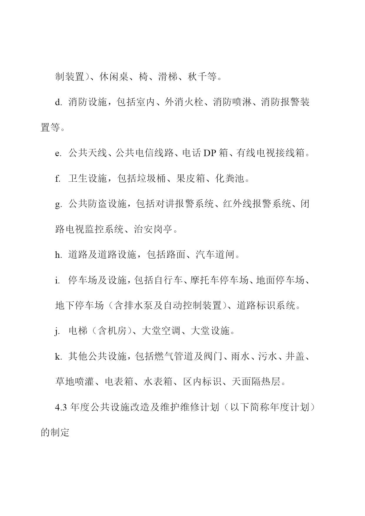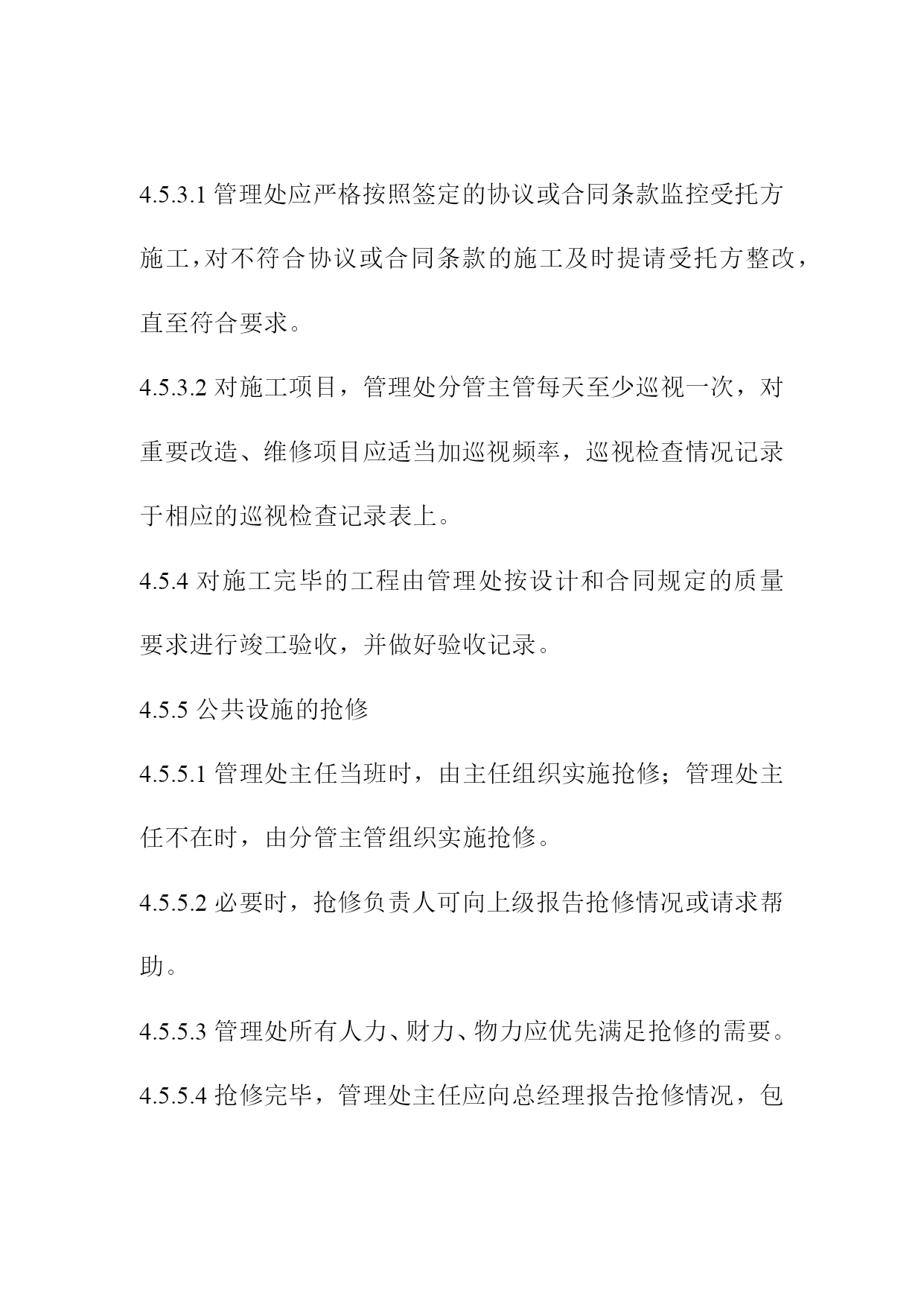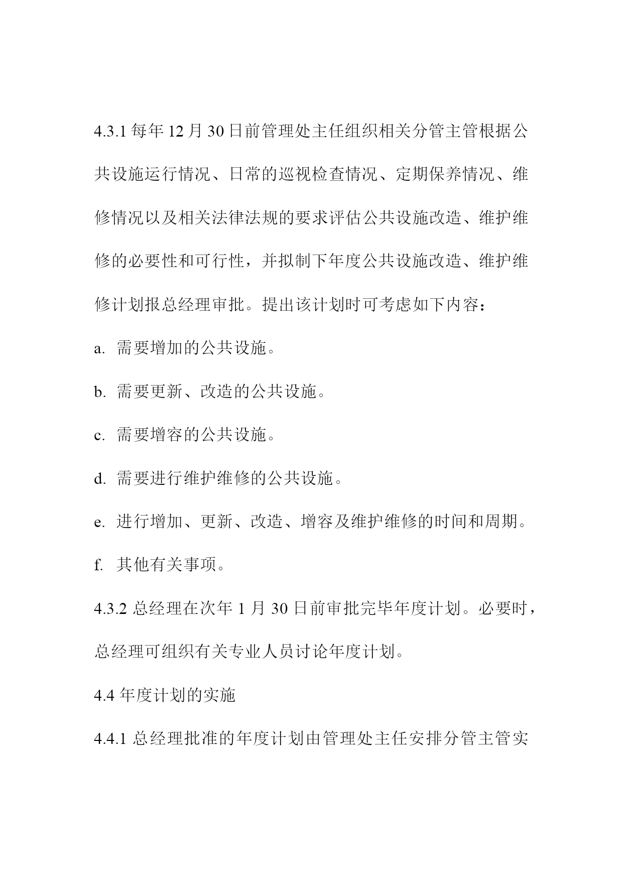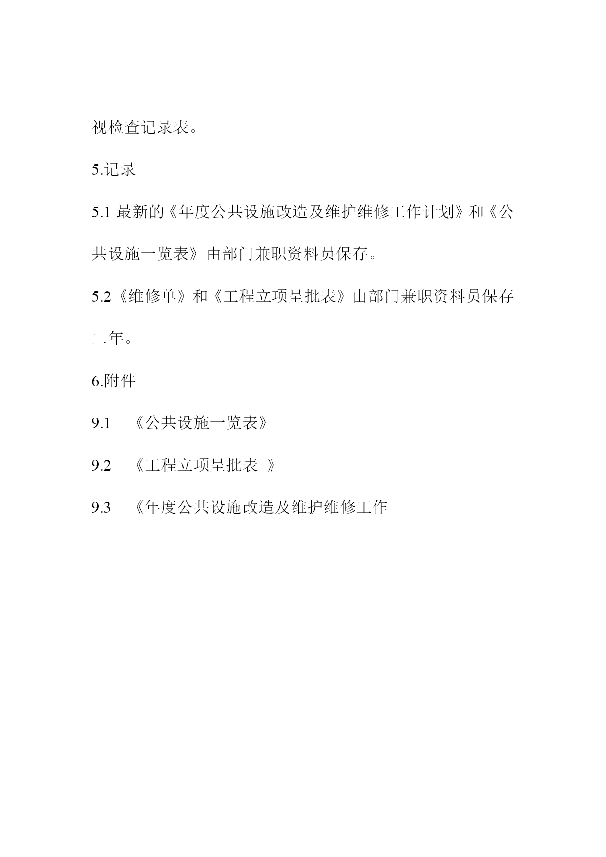 公共设施改造及维护维修工作规程1目的确保及时更新、改造、维护维修公共设施,保证其适时适量增容和正常运行。2.适用范围适用于各管理处管理的公共设施的改造及维护维修。3.职责3.1总经理负责审批《年度公共设施改造及维护维修工作计划》。3.2管理处主任负责组织有关人员评估公共设施改造及维护维修的必要性和可行性。3.3分管主管负责监控和验收公共设施改造及维护维修工作质量。4.程序4.1定义4.1.1公共设施的抢修:是指损坏的公共设施,已经严重影响到业户的人身和财产安全或其正常生活,必须对其即时进行的维修。4.1.2外委:指委托工程部以外的单位进行的改造及维护维修。4.1.3内委:指委托工程部进行的改造及维护维修。4.1.4自修:指管理处维修人员自行进行的改造及维护维修。4.2小区公共设施的确认《公共设施一览表》由管理处主任指定人员制作,小区公共设施可包括如下内容:供电、供水设施:包括变配电所、应急(备用)发电机、地下水池、天面天池等。路灯、公共通道灯、草地灯、射灯、地下车库照明灯。区内休闲娱乐设施,包括养鱼池、喷泉水池、瀑布(含控制装置)、休闲桌、椅、滑梯、秋千等。消防设施,包括室内、外消火栓、消防喷淋、消防报警装置等。公共天线、公共电信线路、电话DP箱、有线电视接线箱。卫生设施,包括垃圾桶、果皮箱、化粪池。公共防盗设施,包括对讲报警系统、红外线报警系统、闭路电视监控系统、治安岗亭。道路及道路设施,包括路面、汽车道闸。停车场及设施,包括自行车、摩托车停车场、地面停车场、地下停车场(含排水泵及自动控制装置)、道路标识系统。电梯(含机房)、大堂空调、大堂设施。其他公共设施,包括燃气管道及阀门、雨水、污水、井盖、草地喷灌、电表箱、水表箱、区内标识、天面隔热层。4.3年度公共设施改造及维护维修计划(以下简称年度计划)的制定4.3.1每年12月30日前管理处主任组织相关分管主管根据公共设施运行情况、日常的巡视检查情况、定期保养情况、维修情况以及相关法律法规的要求评估公共设施改造、维护维修的必要性和可行性,并拟制下年度公共设施改造、维护维修计划报总经理审批。提出该计划时可考虑如下内容:需要增加的公共设施。需要更新、改造的公共设施。需要增容的公共设施。需要进行维护维修的公共设施。进行增加、更新、改造、增容及维护维修的时间和周期。其他有关事项。4.3.2总经理在次年1月30日前审批完毕年度计划。必要时,总经理可组织有关专业人员讨论年度计划。4.4年度计划的实施4.4.1总经理批准的年度计划由管理处主任安排分管主管实施,因环境变化而引起的年度计划中公共设施改造、维修项目变更时亦需经总经理审批。4.4.2各分管主管实施年度计划时,应注意以下几点:按计划规定的时间和周期开工、完工。外委项目和原材料的采购,应按《供方评审及控制程序》、《采购及分包控制程序》进行。一般情况下的维修工作由管理处安排自修,在管理处不能自修或涉及项目工程量大、技术难度高的由管理处主任决定委托工程部维修,对外委托项目应通过工程部认可后,方可委托外修或委托工程部代理委托并进行项目监理(注:分公司可直接外委,外委项目由分公司负责人认可)。d.对委托工程部维修的项目应向工程部提交《工程部维修委托单》,对于预算价格超过500元的项目还需提交《工程立项呈批表》报工程部认可,呈总经理审批。e.管理处自修的项目需填写《维修单》报管理处主任审批。f..对于预算价超过500元的自修、外委项目,需提交《工程立项呈批表》交总经理审批。(说明:分公司的由分公司负责人审批)g.施工用水、用电和开挖、占用公共用地(道路)时,须负责办理报批手续。h.对施工过程进行监控。i.遇有疑难问题,及时报告管理处主任。j.按设计和合同规定的质量要求进行竣工验收,做好验收记录。4.5计划外改造、维修(含抢修)项目4.5.1根据日常巡视检查、业户投诉记录、业户访问记录等情况分析提出的改造、维修项目按条款4.4.2相关规定办理。4.5.2内、外委项目的评审按《服务要求确定及评审程序》有关规定办理。4.5.3内、外委项目施工过程监控4.5.3.1管理处应严格按照签定的协议或合同条款监控受托方施工,对不符合协议或合同条款的施工及时提请受托方整改,直至符合要求。4.5.3.2对施工项目,管理处分管主管每天至少巡视一次,对重要改造、维修项目应适当加巡视频率,巡视检查情况记录于相应的巡视检查记录表上。4.5.4对施工完毕的工程由管理处按设计和合同规定的质量要求进行竣工验收,并做好验收记录。4.5.5公共设施的抢修4.5.5.1管理处主任当班时,由主任组织实施抢修;管理处主任不在时,由分管主管组织实施抢修。4.5.5.2必要