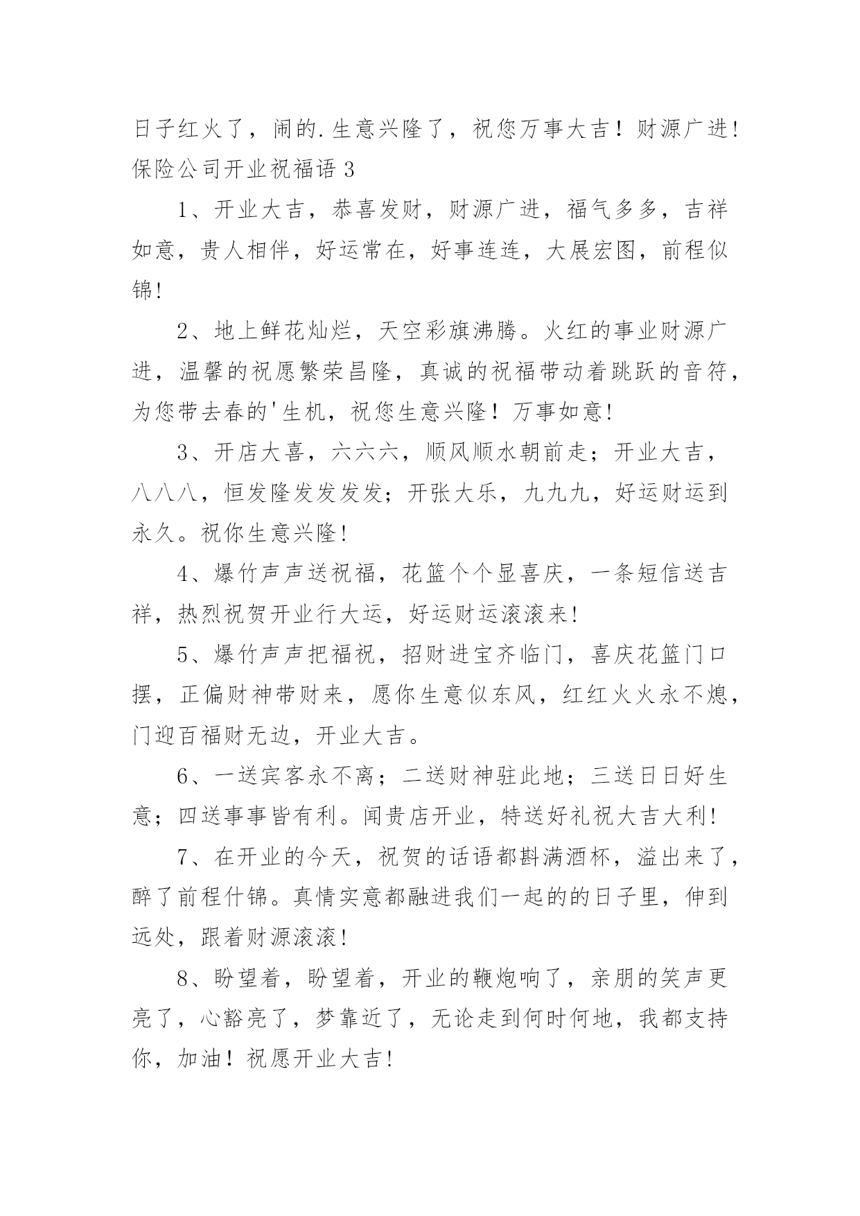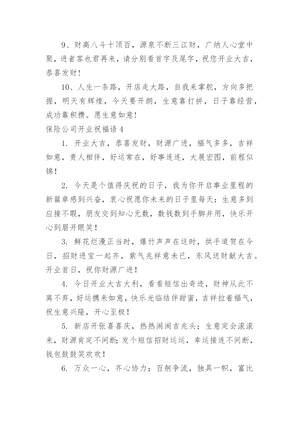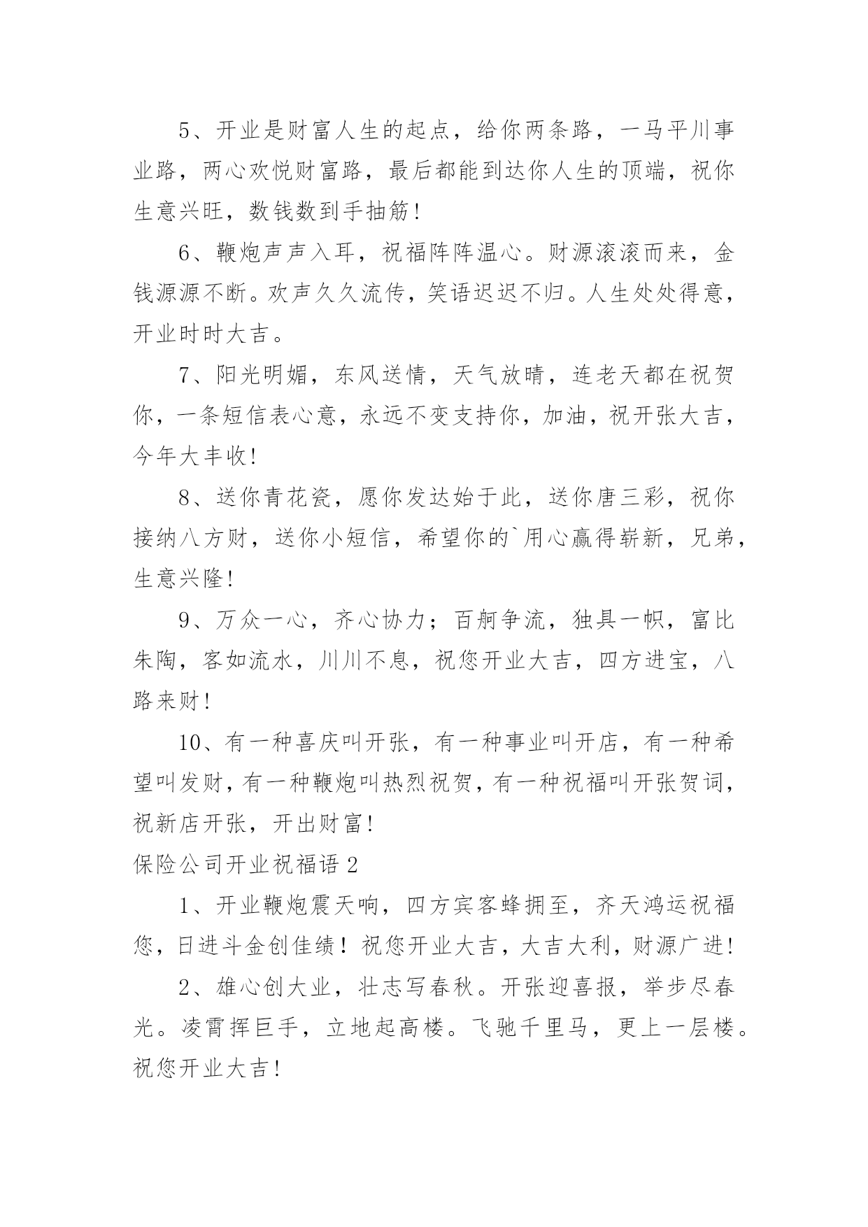 保险公司开业祝福语保险公司开业祝福语在日常学习、工作和生活中,大家最不陌生的就是祝福语了吧,祝福语可以起到增进人与人之间情感交流的作用。那什么样的祝福语才算得上是好的祝福语呢?下面是小编整理的保险公司开业祝福语,仅供参考,希望能够帮助到大家。保险公司开业祝福语11、用大吉和兴隆编一个花篮,用顺利和红火制一箱鞭炮,用祝福和祝愿写一段贺词;祝您新店开张大吉,生意兴隆,顺顺利利,一红到底!2、经营店面是一项事业,多用心做好,开启店面是一种选择,多用心努力,店面开张是一种拼搏,多尽心付出,店面开始是一种机会,全心去料理,愿你开店吉祥走下去,成功伴你更如意!3、锣鼓敲出喜庆,鞭炮释放吉祥,花篮装满祝愿,贵店开张,老朋友前来道喜,祝你财源滚滚而来,生意红红火火!4、喜闻好友开店开业开张大吉,特送你几个字,“诚信”“和气”,字字千金,诚信赢得回头客,和气生财,财源滚滚来,祝福你生意越做越大,财富甲天下!5、开业是财富人生的起点,给你两条路,一马平川事业路,两心欢悦财富路,最后都能到达你人生的顶端,祝你生意兴旺,数钱数到手抽筋!6、鞭炮声声入耳,祝福阵阵温心。财源滚滚而来,金钱源源不断。欢声久久流传,笑语迟迟不归。人生处处得意,开业时时大吉。7、阳光明媚,东风送情,天气放晴,连老天都在祝贺你,一条短信表心意,永远不变支持你,加油,祝开张大吉,今年大丰收!8、送你青花瓷,愿你发达始于此,送你唐三彩,祝你接纳八方财,送你小短信,希望你的`用心赢得崭新,兄弟,生意兴隆!9、万众一心,齐心协力;百舸争流,独具一帜,富比朱陶,客如流水,川川不息,祝您开业大吉,四方进宝,八路来财!10、有一种喜庆叫开张,有一种事业叫开店,有一种希望叫发财,有一种鞭炮叫热烈祝贺,有一种祝福叫开张贺词,祝新店开张,开出财富!保险公司开业祝福语21、开业鞭炮震天响,四方宾客蜂拥至,齐天鸿运祝福您,日进斗金创佳绩!祝您开业大吉,大吉大利,财源广进!2、雄心创大业,壮志写春秋。开张迎喜报,举步尽春光。凌霄挥巨手,立地起高楼。飞驰千里马,更上一层楼。祝您开业大吉!3、新店开张祝贺你,送上对联表心意;上联:‘开’四方财气‘张’八方乐事;下联:‘迎’四海朋友‘喜’八方来财;横批:生意兴隆!4、开业了,是新的开始,特送你几字开张贺词:诚信经营,顾客为本,团结员工,共创未来!祝你财源滚滚来,幸福美满人人爱!5、送你一棵发财树,财源滚滚挡不住;送你一朵好运花,财神天天来帮忙;送你一句祝福长,生意兴隆财气旺;祝开业大吉,财运不断!6、开店了,圆梦了;开业了,喜庆了;开张了,来踩了;送福了,吉祥了;财旺了,兴隆了;宏图了,大展了;成功了,圆满了!7、一滴水虽小,千千万万滴水就会汇聚成江河,一粒沙虽轻,千千万万颗沙就会变成沙漠,生意就是聚少成多,愿你从小做起,日日蒸腾!8、新店开张喜喜庆,热热闹闹吉兆头;生意定会滚滚来,财源肯定不间断;发个短信招财运运,幸运接连不间断,钱包鼓鼓笑欢欢!9、祝福是法宝,看看好运临,读读财神到,低头捡元宝,财神往家跑,生意上门找,金银满屋照,珠宝任你捞,祝你心情好,开业微微笑!10、开张日,选得好,吉吉祥祥有福相;开张时,放鞭炮,蹦蹦跳跳赚钱爽;开张灯,很明亮,坎坎坷坷路照亮;开张曲,已奏响,幸幸福福歌唱响;开张好,开张闹,闹的日子红火了,闹的.生意兴隆了,祝您万事大吉!财源广进!保险公司开业祝福语31、开业大吉,恭喜发财,财源广进,福气多多,吉祥如意,贵人相伴,好运常在,好事连连,大展宏图,前程似锦!2、地上鲜花灿烂,天空彩旗沸腾。火红的事业财源广进,温馨的祝愿繁荣昌隆,真诚的祝福带动着跳跃的音符,为您带去春的'生机,祝您生意兴隆!万事如意!3、开店大喜,六六六,顺风顺水朝前走;开业大吉,八八八,恒发隆发发发发;开张大乐,九九九,好运财运到永久。祝你生意兴隆!4、爆竹声声送祝福,花篮个个显喜庆,一条短信送吉祥,热烈祝贺开业行大运,好运财运滚滚来!5、爆竹声声把福祝,招财进宝齐临门,喜庆花篮门口摆,正偏财神带财来,愿你生意似东风,红红火火永不熄,门迎百福财无边,开业大吉。6、一送宾客永不离;二送财神驻此地;三送日日好生意;四送事事皆有利。闻贵店开业,特送好礼祝大吉大利!7、在开业的今天,祝贺的话语都斟满酒杯,溢出来了,醉了前程什锦。真情实意都融进我们一起的的日子里,伸到远处,跟着财源滚滚!8、盼望着,盼望着,开业的鞭炮响了,亲朋的笑声更亮了,心豁亮了,梦靠近了,无论走到何时何地,我都支持你,加油!祝愿开业大吉!9、财高八斗十顶百,源泉不断三江财,广纳人心堂中聚,进者客也君再来,请分别看首字及尾字,祝您开业大吉,恭喜发财!10、人生一条路,开店走大路,自我来掌舵,方向多把握,明天有辉煌,今天要开朗,生意靠打拼,日子靠经营,成功靠积攒。愿生意如意!保险公司开业祝福语4