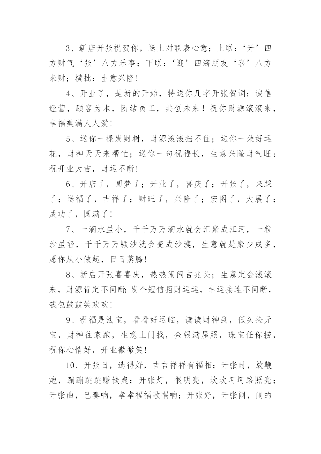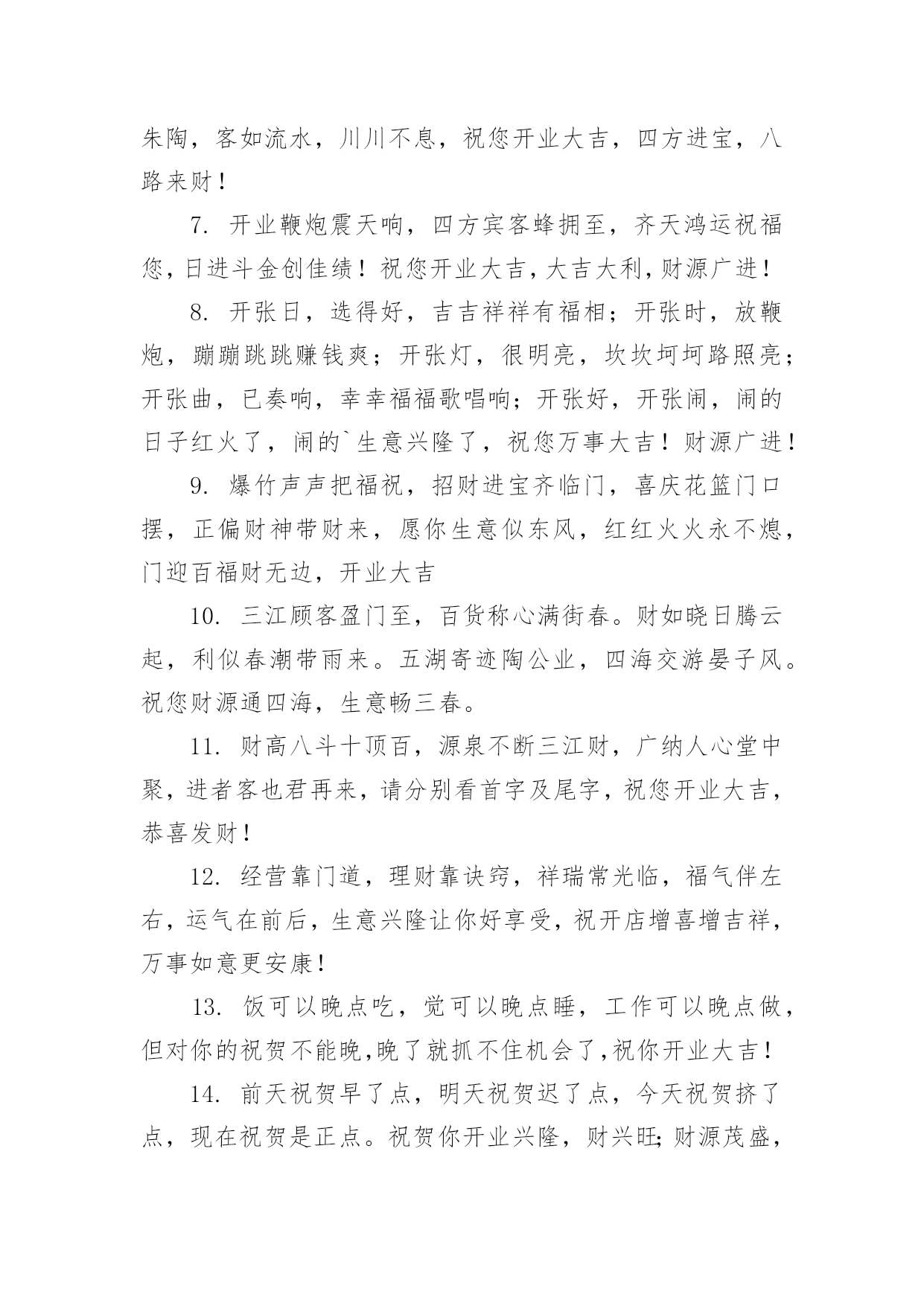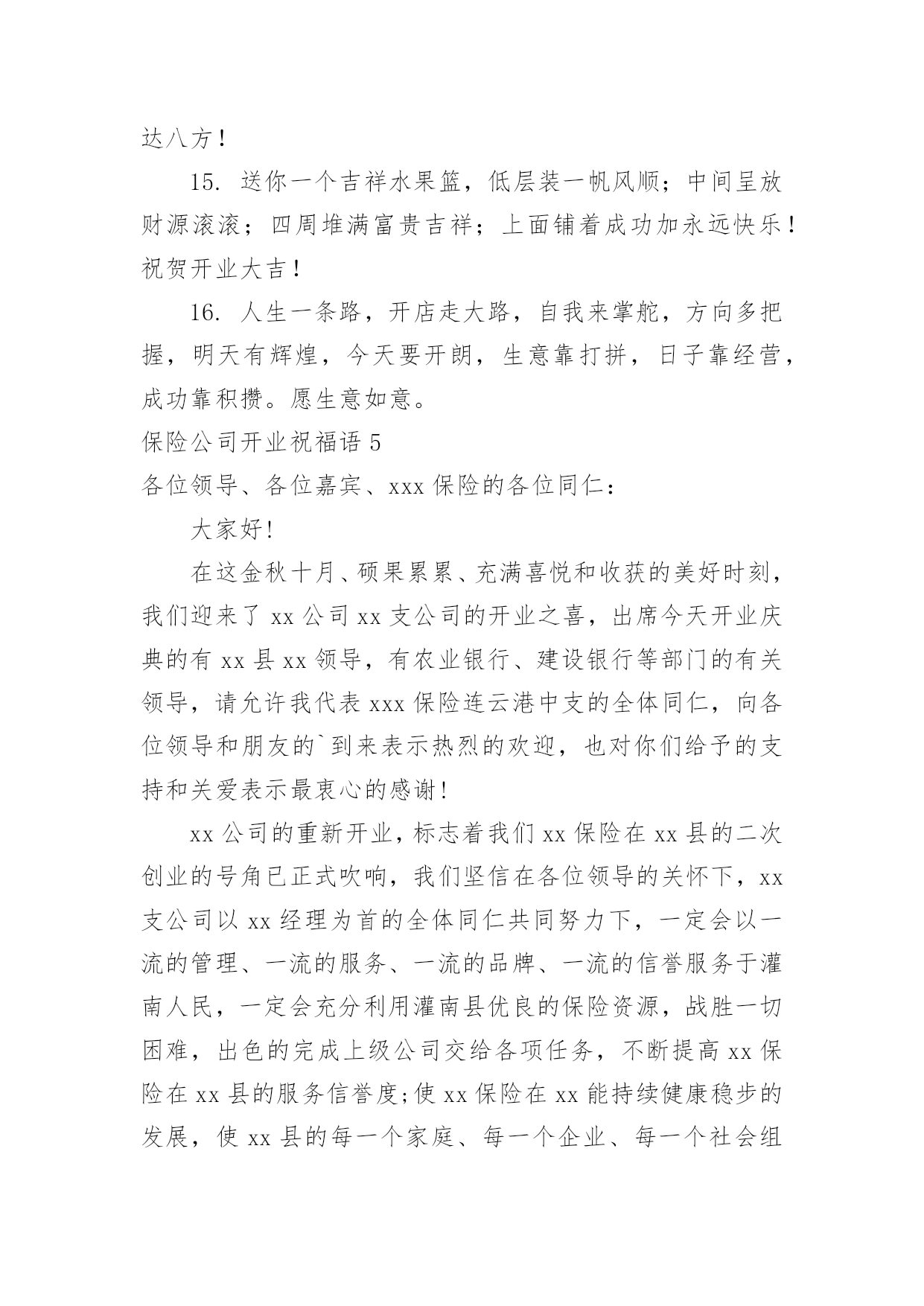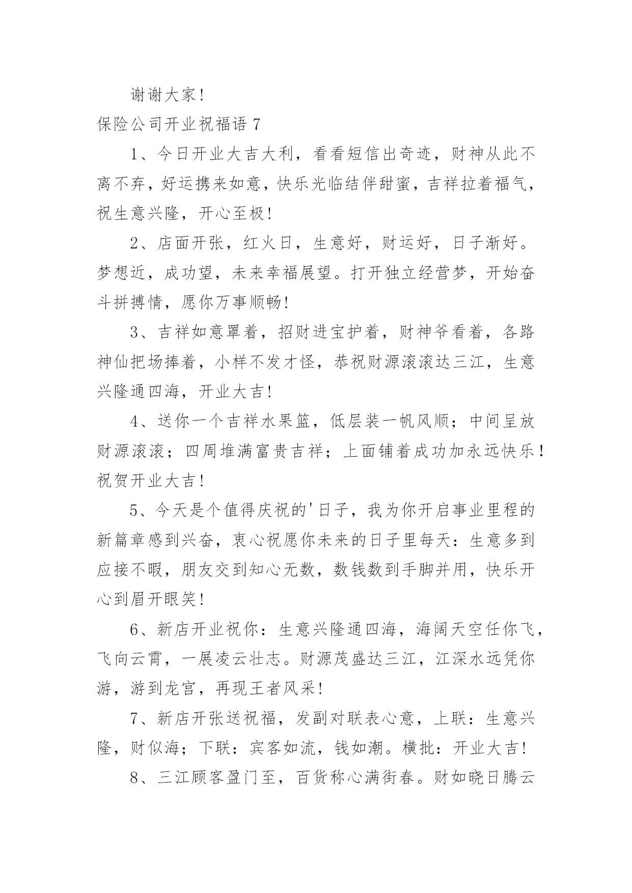 保险公司开业祝福语保险公司开业祝福语在日常学习、工作和生活中,大家最不陌生的就是祝福语了吧,祝福语可以起到增进人与人之间情感交流的作用。那什么样的祝福语才算得上是好的祝福语呢?下面是小编整理的保险公司开业祝福语,仅供参考,希望能够帮助到大家。保险公司开业祝福语11、用大吉和兴隆编一个花篮,用顺利和红火制一箱鞭炮,用祝福和祝愿写一段贺词;祝您新店开张大吉,生意兴隆,顺顺利利,一红到底!2、经营店面是一项事业,多用心做好,开启店面是一种选择,多用心努力,店面开张是一种拼搏,多尽心付出,店面开始是一种机会,全心去料理,愿你开店吉祥走下去,成功伴你更如意!3、锣鼓敲出喜庆,鞭炮释放吉祥,花篮装满祝愿,贵店开张,老朋友前来道喜,祝你财源滚滚而来,生意红红火火!4、喜闻好友开店开业开张大吉,特送你几个字,“诚信”“和气”,字字千金,诚信赢得回头客,和气生财,财源滚滚来,祝福你生意越做越大,财富甲天下!5、开业是财富人生的起点,给你两条路,一马平川事业路,两心欢悦财富路,最后都能到达你人生的顶端,祝你生意兴旺,数钱数到手抽筋!6、鞭炮声声入耳,祝福阵阵温心。财源滚滚而来,金钱源源不断。欢声久久流传,笑语迟迟不归。人生处处得意,开业时时大吉。7、阳光明媚,东风送情,天气放晴,连老天都在祝贺你,一条短信表心意,永远不变支持你,加油,祝开张大吉,今年大丰收!8、送你青花瓷,愿你发达始于此,送你唐三彩,祝你接纳八方财,送你小短信,希望你的`用心赢得崭新,兄弟,生意兴隆!9、万众一心,齐心协力;百舸争流,独具一帜,富比朱陶,客如流水,川川不息,祝您开业大吉,四方进宝,八路来财!10、有一种喜庆叫开张,有一种事业叫开店,有一种希望叫发财,有一种鞭炮叫热烈祝贺,有一种祝福叫开张贺词,祝新店开张,开出财富!保险公司开业祝福语21、开业鞭炮震天响,四方宾客蜂拥至,齐天鸿运祝福您,日进斗金创佳绩!祝您开业大吉,大吉大利,财源广进!2、雄心创大业,壮志写春秋。开张迎喜报,举步尽春光。凌霄挥巨手,立地起高楼。飞驰千里马,更上一层楼。祝您开业大吉!3、新店开张祝贺你,送上对联表心意;上联:‘开’四方财气‘张’八方乐事;下联:‘迎’四海朋友‘喜’八方来财;横批:生意兴隆!4、开业了,是新的开始,特送你几字开张贺词:诚信经营,顾客为本,团结员工,共创未来!祝你财源滚滚来,幸福美满人人爱!5、送你一棵发财树,财源滚滚挡不住;送你一朵好运花,财神天天来帮忙;送你一句祝福长,生意兴隆财气旺;祝开业大吉,财运不断!6、开店了,圆梦了;开业了,喜庆了;开张了,来踩了;送福了,吉祥了;财旺了,兴隆了;宏图了,大展了;成功了,圆满了!7、一滴水虽小,千千万万滴水就会汇聚成江河,一粒沙虽轻,千千万万颗沙就会变成沙漠,生意就是聚少成多,愿你从小做起,日日蒸腾!8、新店开张喜喜庆,热热闹闹吉兆头;生意定会滚滚来,财源肯定不间断;发个短信招财运运,幸运接连不间断,钱包鼓鼓笑欢欢!9、祝福是法宝,看看好运临,读读财神到,低头捡元宝,财神往家跑,生意上门找,金银满屋照,珠宝任你捞,祝你心情好,开业微微笑!10、开张日,选得好,吉吉祥祥有福相;开张时,放鞭炮,蹦蹦跳跳赚钱爽;开张灯,很明亮,坎坎坷坷路照亮;开张曲,已奏响,幸幸福福歌唱响;开张好,开张闹,闹的日子红火了,闹的.生意兴隆了,祝您万事大吉!财源广进!保险公司开业祝福语31、开业大吉,恭喜发财,财源广进,福气多多,吉祥如意,贵人相伴,好运常在,好事连连,大展宏图,前程似锦!2、地上鲜花灿烂,天空彩旗沸腾。火红的事业财源广进,温馨的祝愿繁荣昌隆,真诚的祝福带动着跳跃的音符,为您带去春的'生机,祝您生意兴隆!万事如意!3、开店大喜,六六六,顺风顺水朝前走;开业大吉,八八八,恒发隆发发发发;开张大乐,九九九,好运财运到永久。祝你生意兴隆!4、爆竹声声送祝福,花篮个个显喜庆,一条短信送吉祥,热烈祝贺开业行大运,好运财运滚滚来!5、爆竹声声把福祝,招财进宝齐临门,喜庆花篮门口摆,正偏财神带财来,愿你生意似东风,红红火火永不熄,门迎百福财无边,开业大吉。6、一送宾客永不离;二送财神驻此地;三送日日好生意;四送事事皆有利。闻贵店开业,特送好礼祝大吉大利!7、在开业的今天,祝贺的话语都斟满酒杯,溢出来了,醉了前程什锦。真情实意都融进我们一起的的日子里,伸到远处,跟着财源滚滚!8、盼望着,盼望着,开业的鞭炮响了,亲朋的笑声更亮了,心豁亮了,梦靠近了,无论走到何时何地,我都支持你,加油!祝愿开业大吉!9、财高八斗十顶百,源泉不断三江财,广纳人心堂中聚,进者客也君再来,请分别看首字及尾字,祝您开业大吉,恭喜发财!10、人生一条路,开店走大路,自我来掌舵,方向多把握,明天有辉煌,今天要开朗,生意靠打拼,日子靠经营,成功靠积攒。愿生意如意!保险公司开业祝福语4