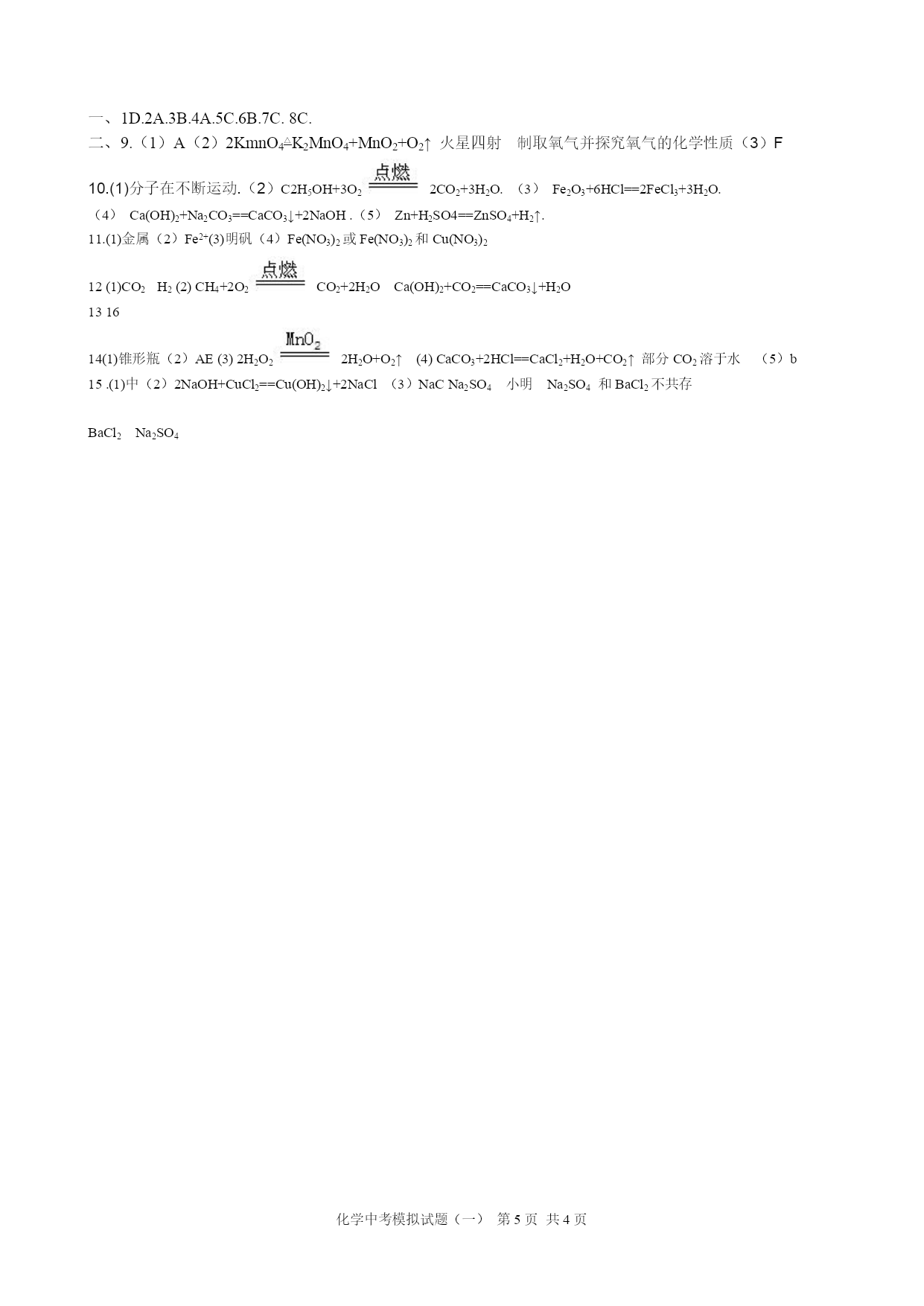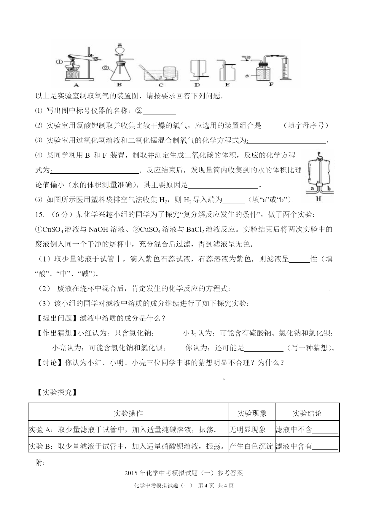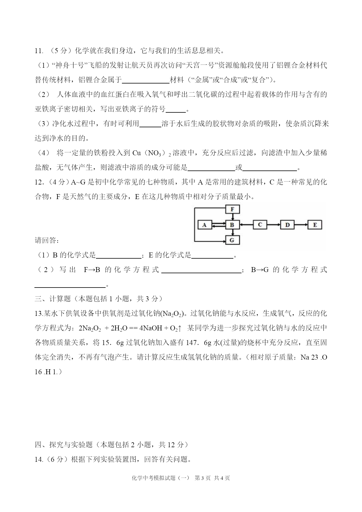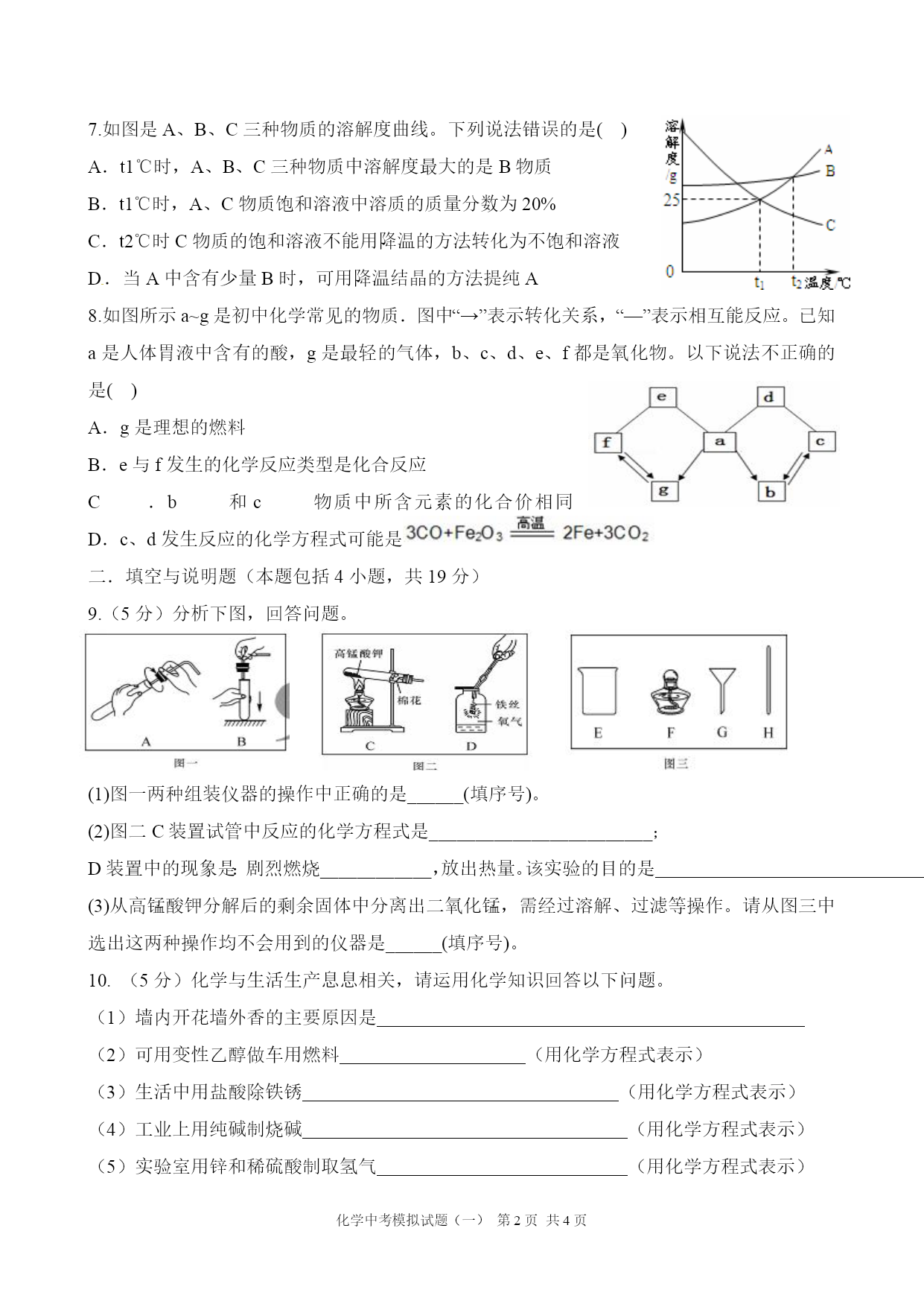 化学中考模拟试题(一)第PAGE\*MERGEFORMAT5页黄冈市2015年化学中考模拟试题一.选择题(每小题只有一个选项符合题意,每小题2分,共16分)1.下列主题变化中,属于物理变化的是()A酸碱指示剂遇碱变色。B无水硫酸铜遇水变蓝。C纸张、木材等遇浓硫酸变黑。D有色气体、带色的水等遇活性炭变成无色。2.分类是学习化学的方法之一,下列物质按单质、盐、混合物的顺序排列的是()A.氧气、碳酸钙、空气B.氢气、硫酸钠、水C.生铁、食盐、冰水D.金刚石、熟石灰、石油3.下列实验操作中,能达到实验目的的是()A.过滤B.加热液体C.除去CO中的水蒸气D.量取9.3mL液体4.下列对有关主题知识的归纳错误的是()A.安全常识室内煤气泄漏——立即打开排风扇浓硫酸沾到到皮肤上——立即用水清洗B.元素与人体健康人体缺铁——易引起贫血人体缺氟——易产生龋齿C.生活常识洗涤剂洗去油污——乳化作用煤炉取暖防中毒——开窗通风D.环保与物质的利用减少白色污染——使用可降解塑料减少汽车尾气污染——使用乙醇汽油5.银制容器在空气中放置一段时间后表面会变黑,原因是银和空气中的微量硫化物等物质发生反应,其化学反应方程式为4Ag+2H2S+O2===2X+2H2O,则X的化学式为()A.AgSB.Ag2OC.Ag2SD.Ag2O26.推理是化学学习中常用的思维方法。下列推理正确的是()A.氧化物中都含有氧元素,所以含氧元素的化合物一定是氧化物B.NaOH溶液中的OH−能与酸反应,则KOH溶液中的OH−也能与酸反应C.石蜡燃烧生成二氧化碳,所有石蜡中一定含有碳元素和氧元素D.盐是由金属离子和酸根离子组成的,NH4NO3中没有金属离子,所以不属于盐7.如图是A、B、C三种物质的溶解度曲线。下列说法错误的是()A.t1℃时,A、B、C三种物质中溶解度最大的是B物质B.t1℃时,A、C物质饱和溶液中溶质的质量分数为20%C.t2℃时C物质的饱和溶液不能用降温的方法转化为不饱和溶液D.当A中含有少量B时,可用降温结晶的方法提纯A8.如图所示a~g是初中化学常见的物质.图中“→”表示转化关系,“—”表示相互能反应。已知a是人体胃液中含有的酸,g是最轻的气体,b、c、d、e、f都是氧化物。以下说法不正确的是()A.g是理想的燃料B.e与f发生的化学反应类型是化合反应C.b和c物质中所含元素的化合价相同D.c、d发生反应的化学方程式可能是二.填空与说明题(本题包括4小题,共19分)9.(5分)分析下图,回答问题。(1)图一两种组装仪器的操作中正确的是______(填序号)。(2)图二C装置试管中反应的化学方程式是________________________;D装置中的现象是:剧烈燃烧____________,放出热量。该实验的目的是。(3)从高锰酸钾分解后的剩余固体中分离出二氧化锰,需经过溶解、过滤等操作。请从图三中选出这两种操作均不会用到的仪器是______(填序号)。10.(5分)化学与生活生产息息相关,请运用化学知识回答以下问题。(1)墙内开花墙外香的主要原因是(2)可用变性乙醇做车用燃料(用化学方程式表示)(3)生活中用盐酸除铁锈(用化学方程式表示)(4)工业上用纯碱制烧碱(用化学方程式表示)(5)实验室用锌和稀硫酸制取氢气(用化学方程式表示)11.(5分)化学就在我们身边,它与我们的生活息息相关。(1)“神舟十号”飞船的发射让航天员再次访问“天宫一号”资源舱舱段使用了铝锂合金材料代替传统材料,铝锂合金属于材料(“金属”或“合成”或“复合”)。(2)人体血液中的血红蛋白在吸入氧气和呼出二氧化碳的过程中起着载体的作用与含有的亚铁离子密切相关,写出亚铁离子的符号。(3)净化水过程中,有时可利用溶于水后生成的胶状物对杂质的吸附,使杂质沉降来达到净水的目的。(4)将一定量的铁粉投入到Cu(NO3)2溶液中,充分反应后过滤,向滤渣中加入少量稀盐酸,无气体产生,则滤液中溶质的成分可能是或。12.(4分)A~G是初中化学常见的七种物质,其中A是常用的建筑材料,C是一种常见的化合物,F是天然气的主要成分,E在这几种物质中相对分子质量最小。请回答:(1)B的化学式是;E的化学式是。(2)写出F→B的化学方程式;B→G的化学方程式。三、计算题(本题包括1小题,共3分)13.某水下供氧设备中供氧剂是过氧化钠(Na2O2)。过氧化钠能与水反应,生成氧气,反应的化学方程式为:2Na2O2+2H2O==4NaOH+O2↑某同学为进一步探究过氧化钠与水的反应中各物质质量关系,将15.6g过氧化钠加入盛有147.6g水(过量)的烧杯中充分反应,直至固体完全消失,不