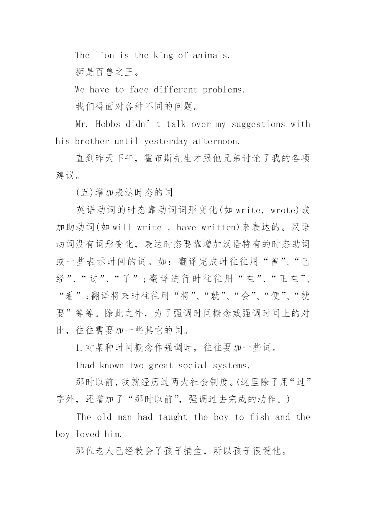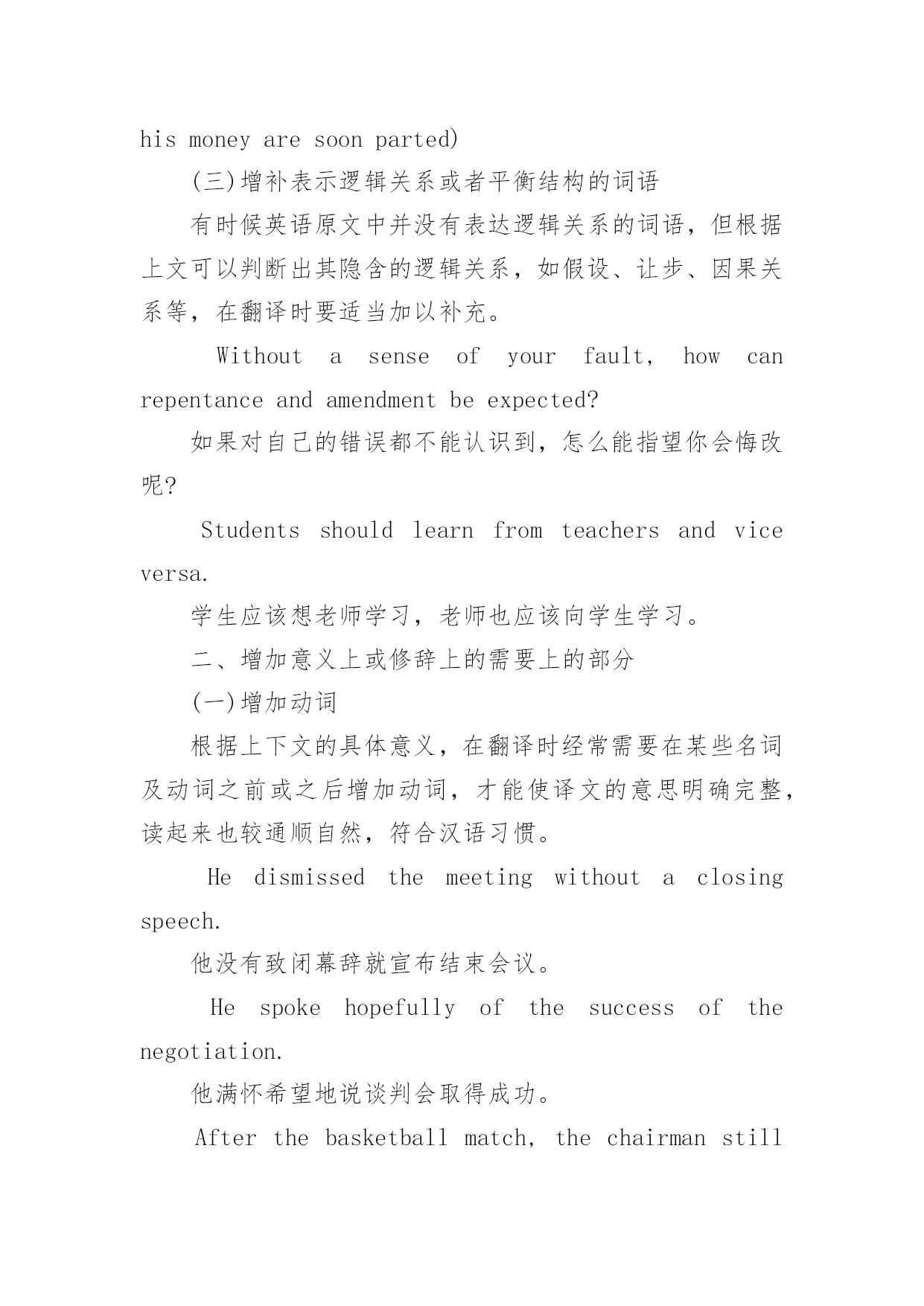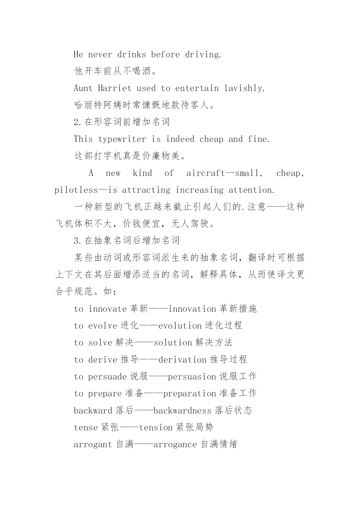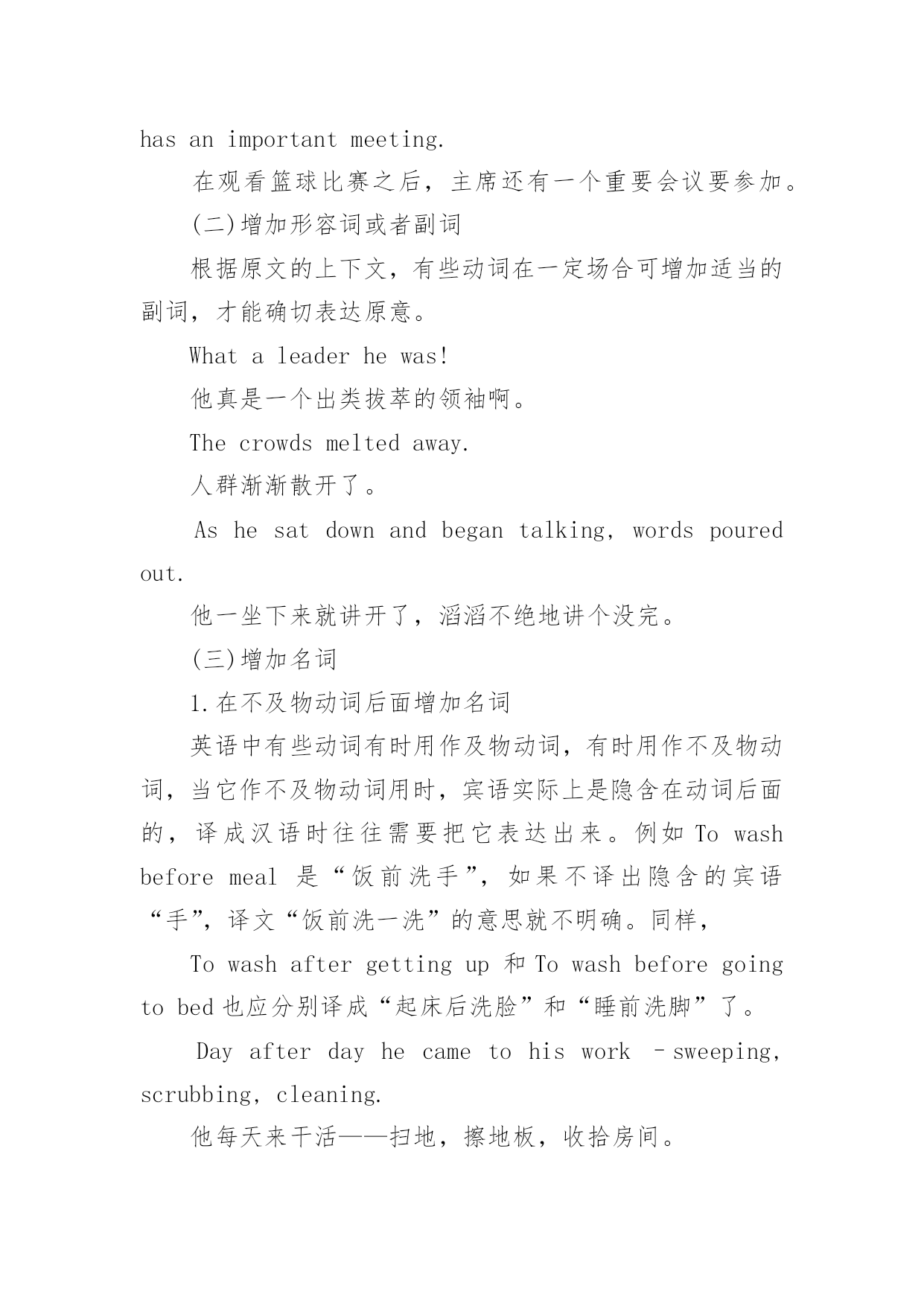英语翻译技巧英语翻译技巧总结在一个时期、一个年度、一个阶段对学习和工作生活等情况加以回顾和分析的一种书面材料,它可以使我们更有效率,让我们来为自己写一份总结吧。那么总结要注意有什么内容呢?下面是小编精心整理的英语翻译技巧,仅供参考,大家一起来看看吧。英语翻译技巧1一、增加原文中省略的部分(一)增补回答句中省略的词语Doyoulikesport?Yes,Ido.你喜欢体育运动吗?是的,我喜欢体育运动。Areyoutired?Notvery.你累了吗?不太累。(二)增补并列结构中省略的词语Wedon’tretreat,weneverhaveandneverwill。我们不后退,我们从没有后退过,将来也决不后退。(weneverhaveandneverwill=weneverhaveretreatedandneverwillretreat)Afoolandhiswordsaresoonparted;amanofgeniusandhismoney.愚人会很快忘记说过的话,智者会很快放弃手里的钱。(amanofgeniusandhismoney=amanofgeniusandhismoneyaresoonparted)(三)增补表示逻辑关系或者平衡结构的词语有时候英语原文中并没有表达逻辑关系的词语,但根据上文可以判断出其隐含的逻辑关系,如假设、让步、因果关系等,在翻译时要适当加以补充。Withoutasenseofyourfault,howcanrepentanceandamendmentbeexpected?如果对自己的错误都不能认识到,怎么能指望你会悔改呢?Studentsshouldlearnfromteachersandviceversa.学生应该想老师学习,老师也应该向学生学习。二、增加意义上或修辞上的需要上的部分(一)增加动词根据上下文的具体意义,在翻译时经常需要在某些名词及动词之前或之后增加动词,才能使译文的意思明确完整,读起来也较通顺自然,符合汉语习惯。Hedismissedthemeetingwithoutaclosingspeech.他没有致闭幕辞就宣布结束会议。Hespokehopefullyofthesuccessofthenegotiation.他满怀希望地说谈判会取得成功。Afterthebasketballmatch,thechairmanstillhasanimportantmeeting.在观看篮球比赛之后,主席还有一个重要会议要参加。(二)增加形容词或者副词根据原文的上下文,有些动词在一定场合可增加适当的副词,才能确切表达原意。Whataleaderhewas!他真是一个出类拔萃的领袖啊。Thecrowdsmeltedaway.人群渐渐散开了。Ashesatdownandbegantalking,wordspouredout.他一坐下来就讲开了,滔滔不绝地讲个没完。(三)增加名词1.在不及物动词后面增加名词英语中有些动词有时用作及物动词,有时用作不及物动词,当它作不及物动词用时,宾语实际上是隐含在动词后面的,译成汉语时往往需要把它表达出来。例如Towashbeforemeal是“饭前洗手”,如果不译出隐含的宾语“手”,译文“饭前洗一洗”的意思就不明确。同样,Towashaftergettingup和Towashbeforegoingtobed也应分别译成“起床后洗脸”和“睡前洗脚”了。Dayafterdayhecametohiswork–sweeping,scrubbing,cleaning.他每天来干活——扫地,擦地板,收拾房间。Heneverdrinksbeforedriving.他开车前从不喝酒。AuntHarrietusedtoentertainlavishly.哈丽特阿姨时常慷慨地款待客人。2.在形容词前增加名词Thistypewriterisindeedcheapandfine.这部打字机真是价廉物美。Anewkindofaircraft—small,cheap,pilotless—isattractingincreasingattention.一种新型的飞机正越来截止引起人们的.注意——这种飞机体积不大,价钱便宜,无人驾驶。3.在抽象名词后增加名词某些由动词或形容词派生来的抽象名词,翻译时可根据上下文在其后面增添适当的名词,解释具体,从而使译文更合乎规范。如:toinnovate革新——innovation革新措施toevolve进化——evolution进化过程tosolve解决——solution解决方法toderive推导——derivation推导过程topersuade说服——persuasion说服工作toprepare准备——preparation准备工作backwar
