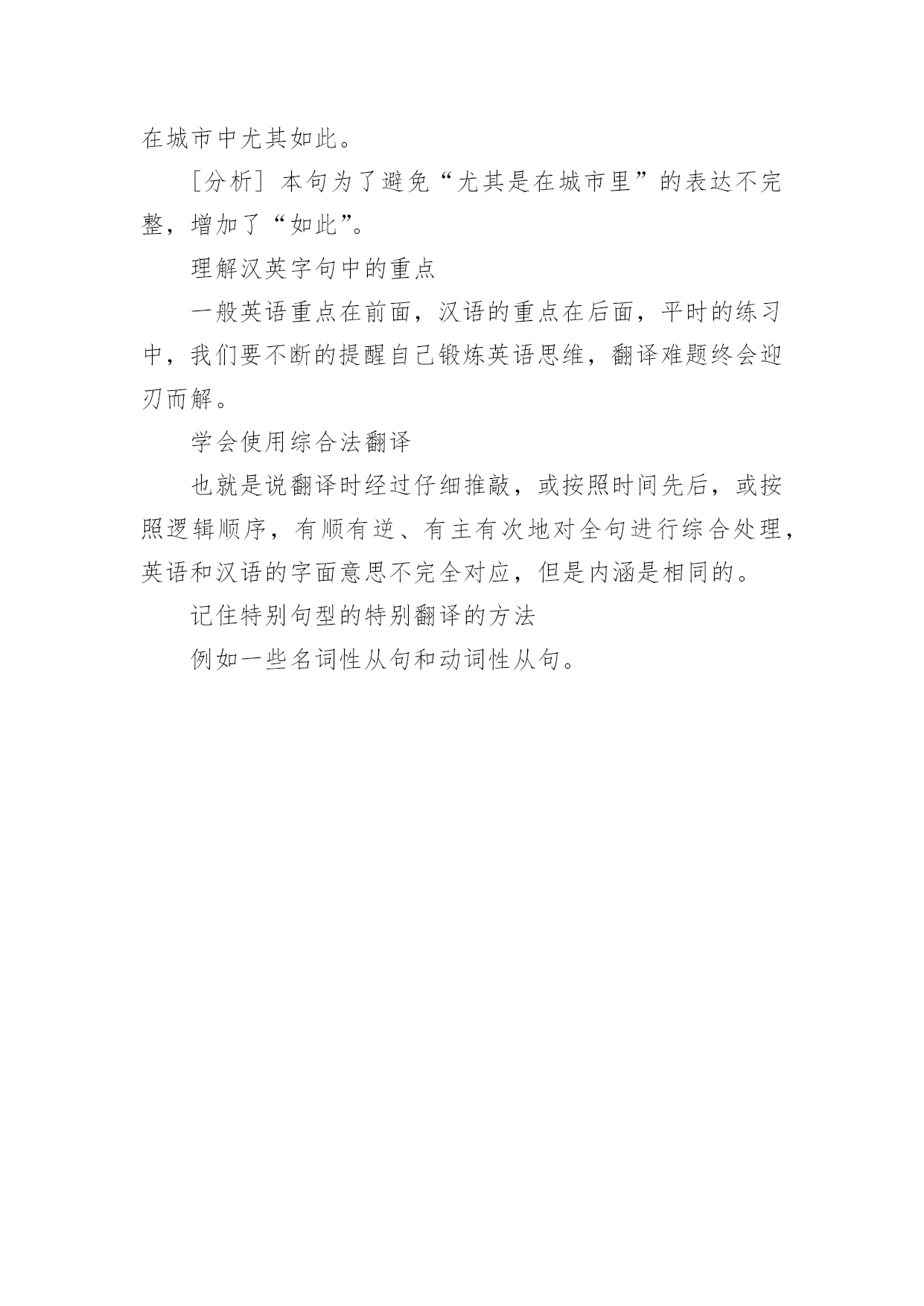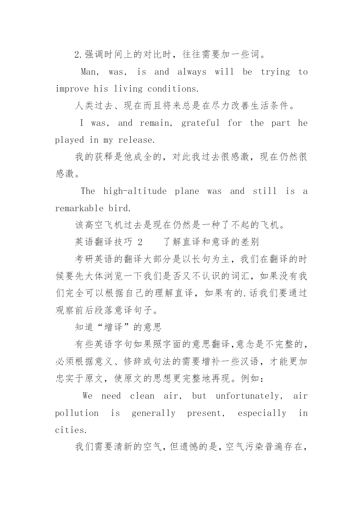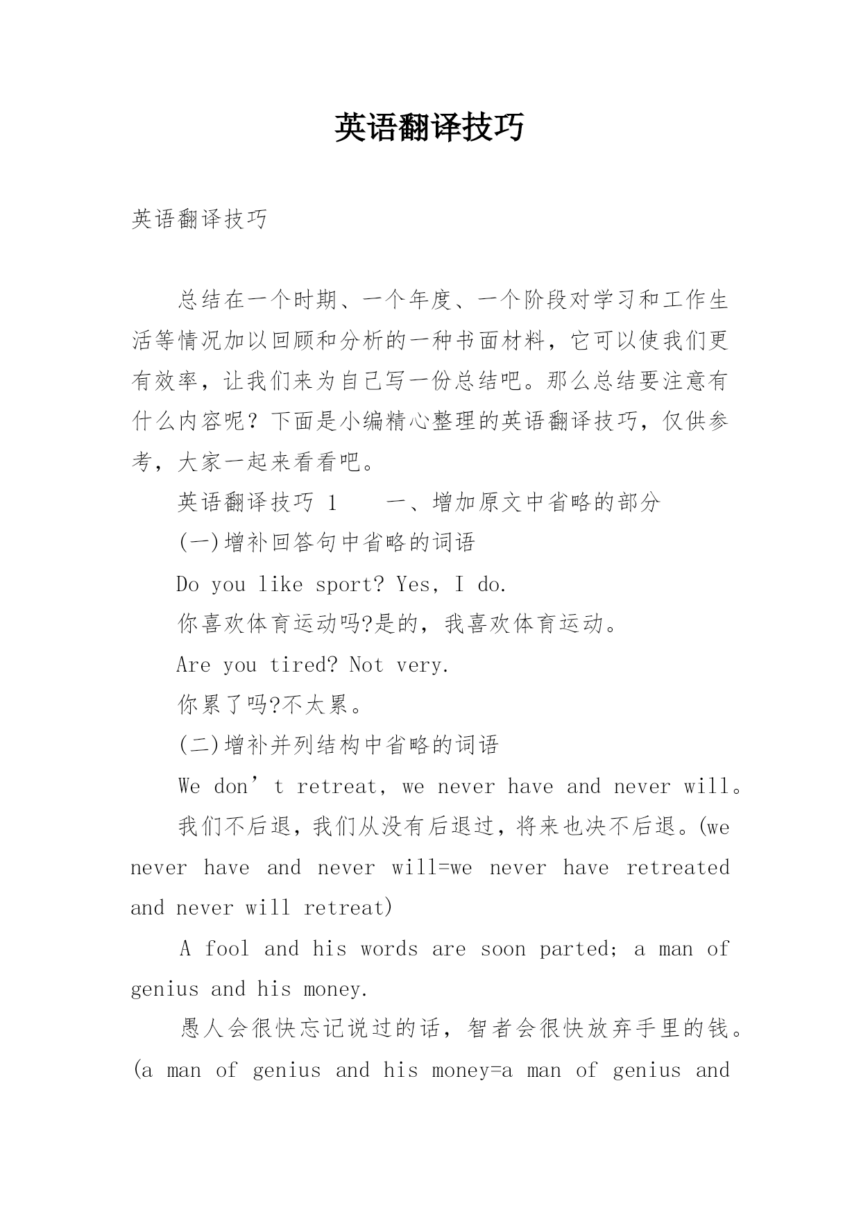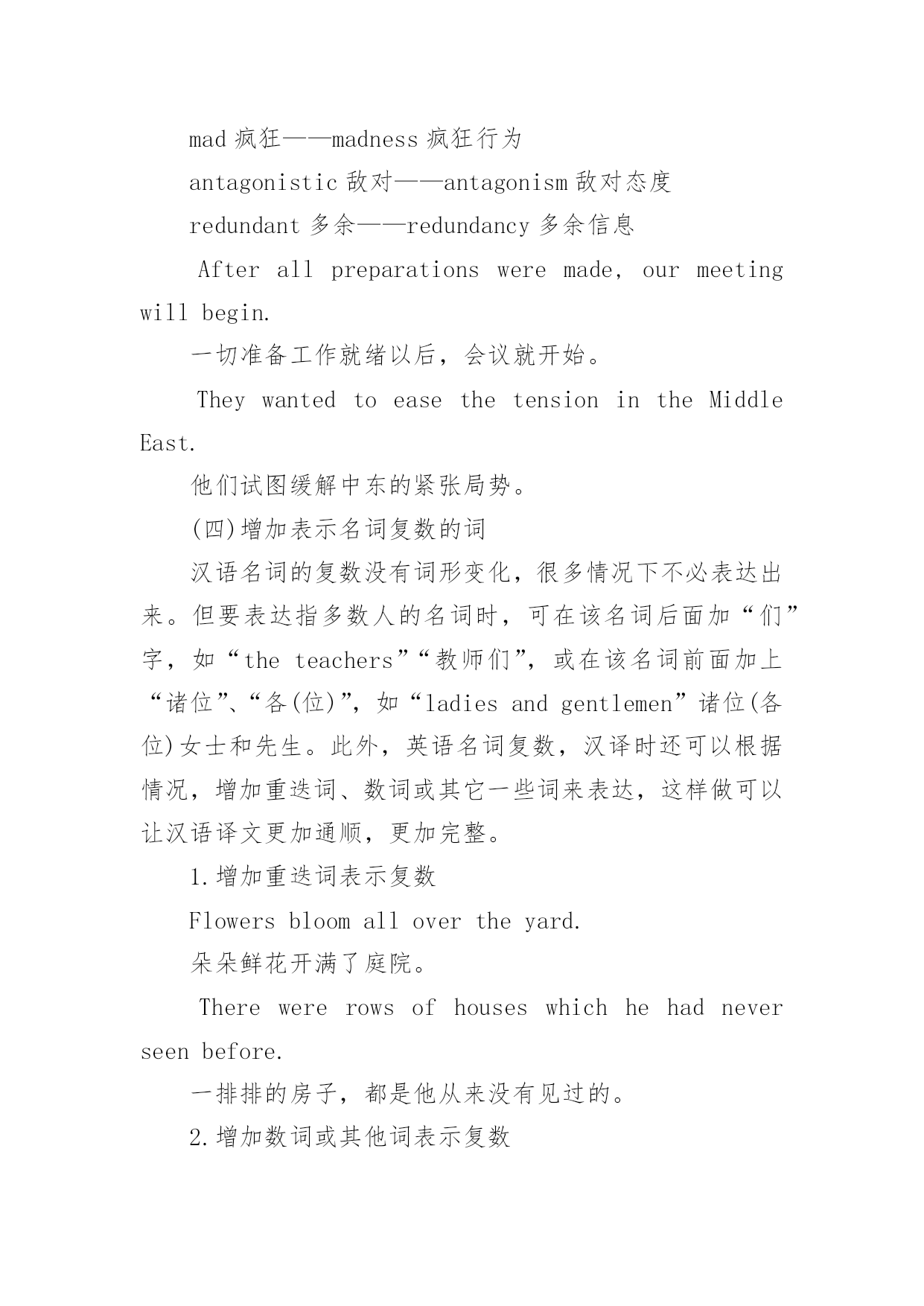 英语翻译技巧英语翻译技巧总结在一个时期、一个年度、一个阶段对学习和工作生活等情况加以回顾和分析的一种书面材料,它可以使我们更有效率,让我们来为自己写一份总结吧。那么总结要注意有什么内容呢?下面是小编精心整理的英语翻译技巧,仅供参考,大家一起来看看吧。英语翻译技巧1一、增加原文中省略的部分(一)增补回答句中省略的词语Doyoulikesport?Yes,Ido.你喜欢体育运动吗?是的,我喜欢体育运动。Areyoutired?Notvery.你累了吗?不太累。(二)增补并列结构中省略的词语Wedon’tretreat,weneverhaveandneverwill。我们不后退,我们从没有后退过,将来也决不后退。(weneverhaveandneverwill=weneverhaveretreatedandneverwillretreat)Afoolandhiswordsaresoonparted;amanofgeniusandhismoney.愚人会很快忘记说过的话,智者会很快放弃手里的钱。(amanofgeniusandhismoney=amanofgeniusandhismoneyaresoonparted)(三)增补表示逻辑关系或者平衡结构的词语有时候英语原文中并没有表达逻辑关系的词语,但根据上文可以判断出其隐含的逻辑关系,如假设、让步、因果关系等,在翻译时要适当加以补充。Withoutasenseofyourfault,howcanrepentanceandamendmentbeexpected?如果对自己的错误都不能认识到,怎么能指望你会悔改呢?Studentsshouldlearnfromteachersandviceversa.学生应该想老师学习,老师也应该向学生学习。二、增加意义上或修辞上的需要上的部分(一)增加动词根据上下文的具体意义,在翻译时经常需要在某些名词及动词之前或之后增加动词,才能使译文的意思明确完整,读起来也较通顺自然,符合汉语习惯。Hedismissedthemeetingwithoutaclosingspeech.他没有致闭幕辞就宣布结束会议。Hespokehopefullyofthesuccessofthenegotiation.他满怀希望地说谈判会取得成功。Afterthebasketballmatch,thechairmanstillhasanimportantmeeting.在观看篮球比赛之后,主席还有一个重要会议要参加。(二)增加形容词或者副词根据原文的上下文,有些动词在一定场合可增加适当的副词,才能确切表达原意。Whataleaderhewas!他真是一个出类拔萃的领袖啊。Thecrowdsmeltedaway.人群渐渐散开了。Ashesatdownandbegantalking,wordspouredout.他一坐下来就讲开了,滔滔不绝地讲个没完。(三)增加名词1.在不及物动词后面增加名词英语中有些动词有时用作及物动词,有时用作不及物动词,当它作不及物动词用时,宾语实际上是隐含在动词后面的,译成汉语时往往需要把它表达出来。例如Towashbeforemeal是“饭前洗手”,如果不译出隐含的宾语“手”,译文“饭前洗一洗”的意思就不明确。同样,Towashaftergettingup和Towashbeforegoingtobed也应分别译成“起床后洗脸”和“睡前洗脚”了。Dayafterdayhecametohiswork–sweeping,scrubbing,cleaning.他每天来干活——扫地,擦地板,收拾房间。Heneverdrinksbeforedriving.他开车前从不喝酒。AuntHarrietusedtoentertainlavishly.哈丽特阿姨时常慷慨地款待客人。2.在形容词前增加名词Thistypewriterisindeedcheapandfine.这部打字机真是价廉物美。Anewkindofaircraft—small,cheap,pilotless—isattractingincreasingattention.一种新型的飞机正越来截止引起人们的.注意——这种飞机体积不大,价钱便宜,无人驾驶。3.在抽象名词后增加名词某些由动词或形容词派生来的抽象名词,翻译时可根据上下文在其后面增添适当的名词,解释具体,从而使译文更合乎规范。如:toinnovate革新——innovation革新措施toevolve进化——evolution进化过程tosolve解决——solution解决方法toderive推导——derivation推导过程topersuade说服——persuasion说服工作toprepare准备——preparation准备工作backwar