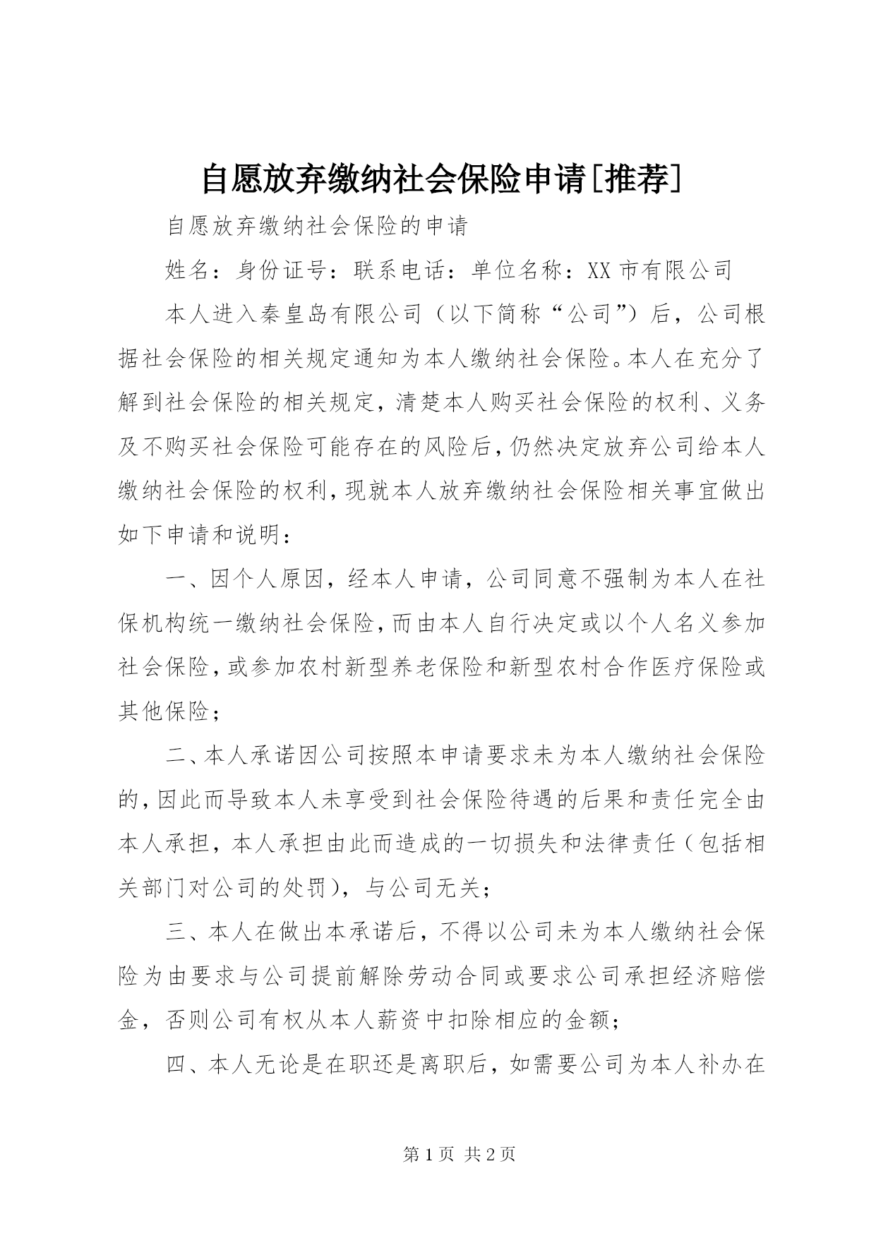 第PAGE\*Arabic\*MERGEFORMAT2页共NUMPAGES\*MERGEFORMAT2页自愿放弃缴纳社会保险申请[推荐]自愿放弃缴纳社会保险的申请姓名:身份证号:联系电话:单位名称:XX市有限公司本人进入秦皇岛有限公司(以下简称“公司”)后,公司根据社会保险的相关规定通知为本人缴纳社会保险。本人在充分了解到社会保险的相关规定,清楚本人购买社会保险的权利、义务及不购买社会保险可能存在的风险后,仍然决定放弃公司给本人缴纳社会保险的权利,现就本人放弃缴纳社会保险相关事宜做出如下申请和说明:一、因个人原因,经本人申请,公司同意不强制为本人在社保机构统一缴纳社会保险,而由本人自行决定或以个人名义参加社会保险,或参加农村新型养老保险和新型农村合作医疗保险或其他保险;二、本人承诺因公司按照本申请要求未为本人缴纳社会保险的,因此而导致本人未享受到社会保险待遇的后果和责任完全由本人承担,本人承担由此而造成的一切损失和法律责任(包括相关部门对公司的处罚),与公司无关;三、本人在做出本承诺后,不得以公司未为本人缴纳社会保险为由要求与公司提前解除劳动合同或要求公司承担经济赔偿金,否则公司有权从本人薪资中扣除相应的金额;四、本人无论是在职还是离职后,如需要公司为本人补办在职期间未缴纳的社会保险,经书面申请后,公司应在规定允许的范围内协助本人办理相关手续,全部社保费用及社保机构按照规定要求缴纳的滞纳金全部由本人承担,如未支付相关费用,公司有权拒绝协助补办相关手续,因此所导致的利益损失由本人承担。五、在工作期间,如本人申请缴纳社会保险,公司应在接到申请后次月起为本人缴纳社会保险,并按规定在本人工资中代扣代缴相应的参保费用;六、本人申请完全出于自身真实意愿,自签订之日起,即时生效。附:身份证复印件、缴纳相关保险证明申请人签字:(手印)申请日期:
