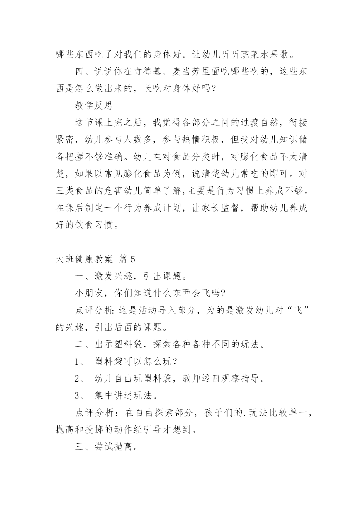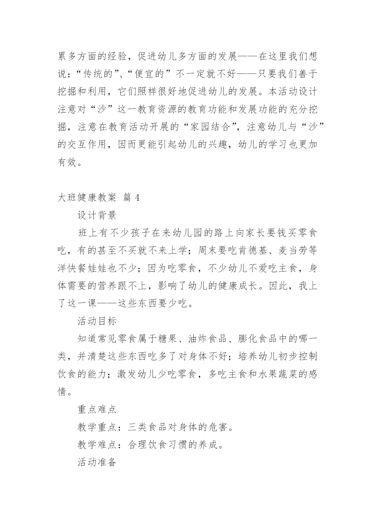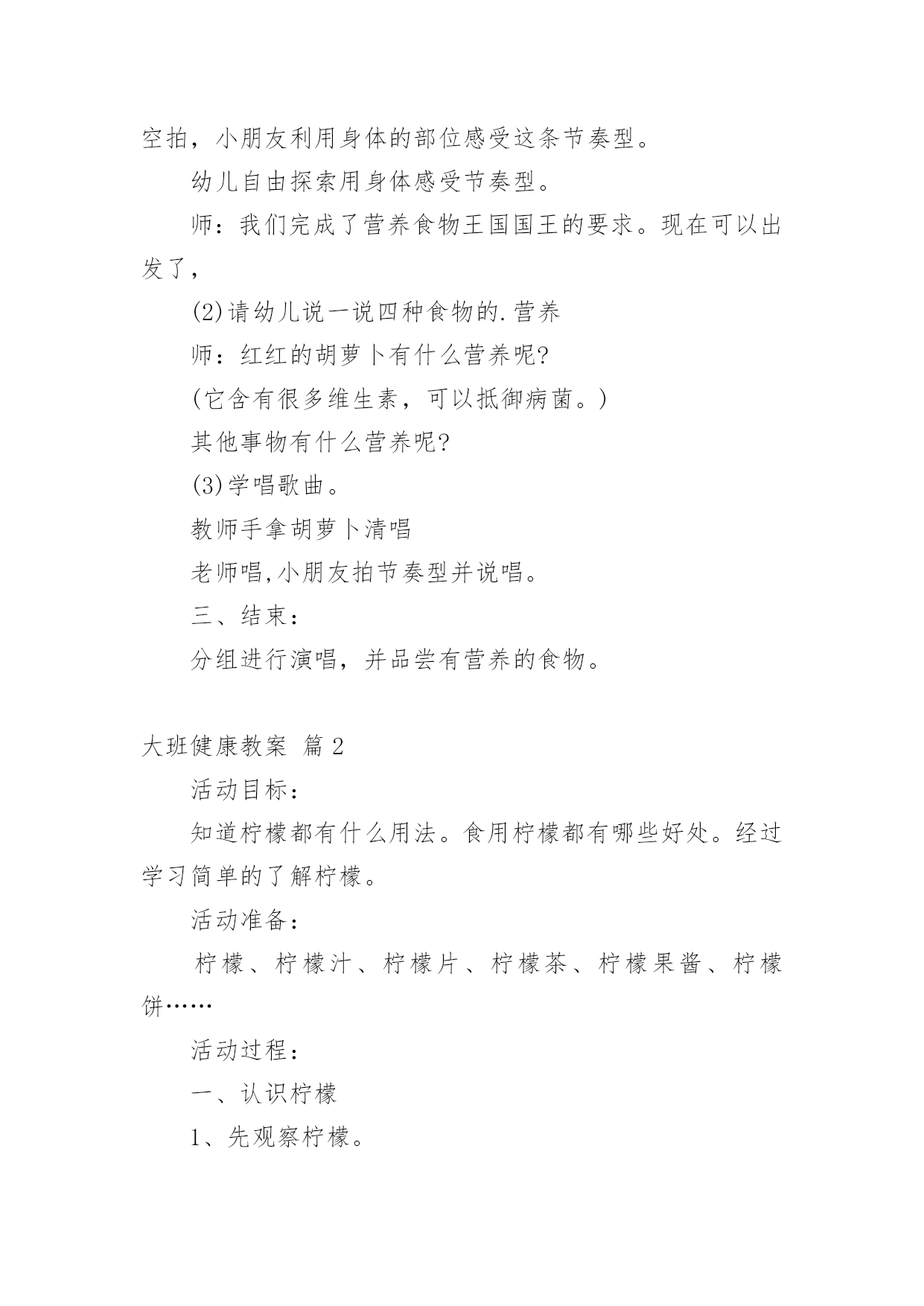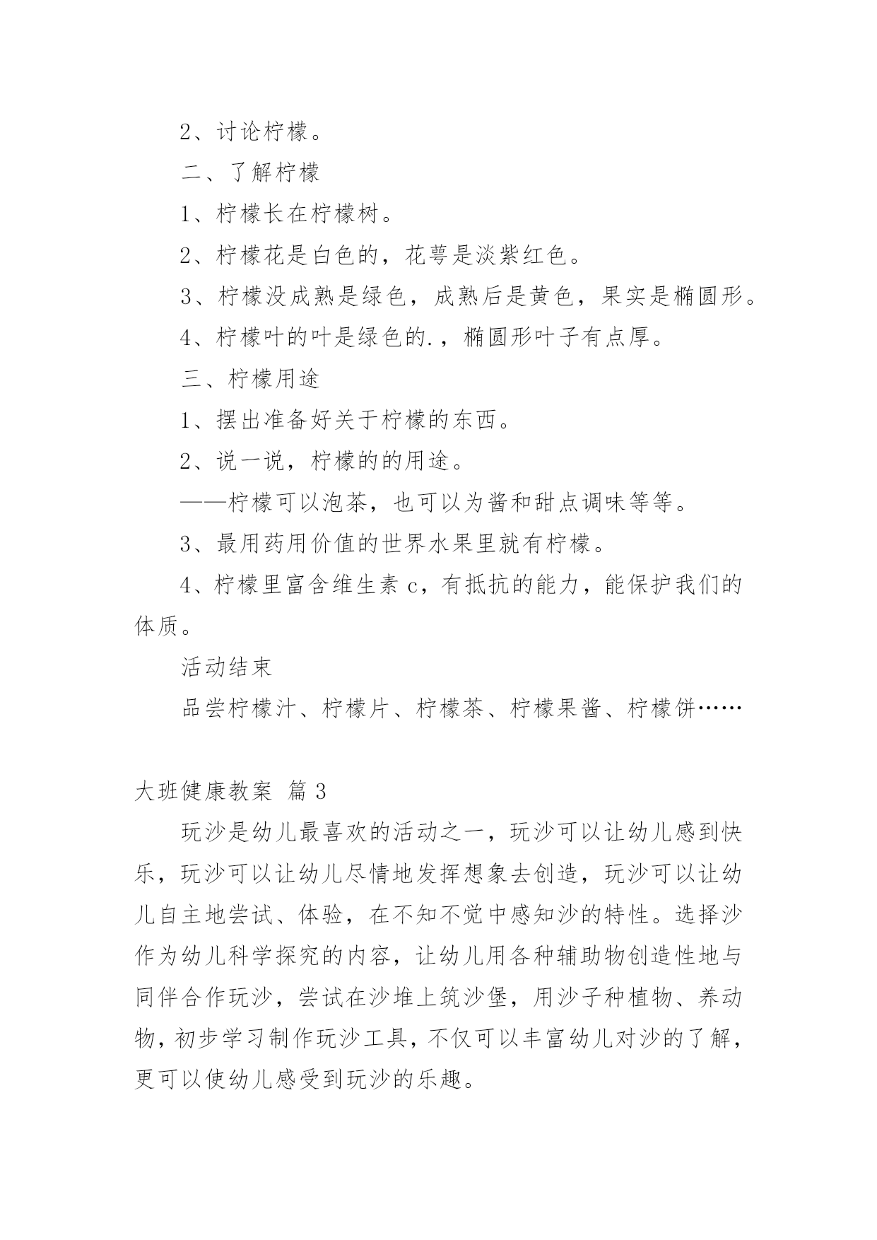 大班健康教案有关大班健康教案集合6篇作为一位杰出的教职工,常常要根据教学需要编写教案,教案有助于学生理解并掌握系统的知识。那么优秀的教案是什么样的呢?下面是小编精心整理的大班健康教案6篇,仅供参考,欢迎大家阅读。大班健康教案篇1活动目标1、认识有营养的胡萝卜、豆腐、菠菜等食物。2、懂得合理饮食,在日常生活中做到不挑食,不偏食。活动准备录音机、胡萝卜、菠菜等食物活动过程一、激趣导入:师:小朋友们,营养食物王国的国王邀请我们去做客,在哪里有许多好吃的,你们想不想去?(想去)师:但请柬上有几个要求,我们能达到要求才能顺利到达。二、食物营养表达:(1)老师示范请同学们拍打节奏,在拍打这条节奏型时要注意附点和空拍,小朋友利用身体的部位感受这条节奏型。幼儿自由探索用身体感受节奏型。师:我们完成了营养食物王国国王的要求。现在可以出发了,(2)请幼儿说一说四种食物的.营养师:红红的胡萝卜有什么营养呢?(它含有很多维生素,可以抵御病菌。)其他事物有什么营养呢?(3)学唱歌曲。教师手拿胡萝卜清唱老师唱,小朋友拍节奏型并说唱。三、结束:分组进行演唱,并品尝有营养的食物。大班健康教案篇2活动目标:知道柠檬都有什么用法。食用柠檬都有哪些好处。经过学习简单的了解柠檬。活动准备:柠檬、柠檬汁、柠檬片、柠檬茶、柠檬果酱、柠檬饼……活动过程:一、认识柠檬1、先观察柠檬。2、讨论柠檬。二、了解柠檬1、柠檬长在柠檬树。2、柠檬花是白色的,花萼是淡紫红色。3、柠檬没成熟是绿色,成熟后是黄色,果实是椭圆形。4、柠檬叶的叶是绿色的.,椭圆形叶子有点厚。三、柠檬用途1、摆出准备好关于柠檬的东西。2、说一说,柠檬的的用途。——柠檬可以泡茶,也可以为酱和甜点调味等等。3、最用药用价值的世界水果里就有柠檬。4、柠檬里富含维生素c,有抵抗的能力,能保护我们的体质。活动结束品尝柠檬汁、柠檬片、柠檬茶、柠檬果酱、柠檬饼……大班健康教案篇3玩沙是幼儿最喜欢的活动之一,玩沙可以让幼儿感到快乐,玩沙可以让幼儿尽情地发挥想象去创造,玩沙可以让幼儿自主地尝试、体验,在不知不觉中感知沙的特性。选择沙作为幼儿科学探究的内容,让幼儿用各种辅助物创造性地与同伴合作玩沙,尝试在沙堆上筑沙堡,用沙子种植物、养动物,初步学习制作玩沙工具,不仅可以丰富幼儿对沙的了解,更可以使幼儿感受到玩沙的乐趣。一、环境与材料1.供幼儿玩沙用的玩沙区(沙地、沙池或沙盆即可)。2.师生共同建设“种养园地”,在园地中种植仙人掌、仙人柱、仙人球等喜沙植物,用沙子进行种子发芽的实验;在沙箱中养蚂蚁,在沙盆中养螃蟹、沙龟等。3.玩沙的工具:小棍,小铲、小桶、小瓶、模子等。4.安全剪刀,废旧材料:塑料瓶、易拉罐、瓶盖等。5.各种小玩具。6.实验用品:透明玻璃杯、污水、沙子等。不同直径的管子。时钟或手表等。7.制作沙画的材料:颜料、绘有图案的底板、浆糊或胶水、细沙等。8.制作沙包的材料:布、沙子、针线等。9.制作沙漏的材料:带盖的塑料瓶若干、干沙等。二、观察与指导1.开展分组活动,让幼儿自选活动,允许幼儿在小组间流动活动。第1组:玩沙(1)让幼儿在沙地里自由玩沙,可以引导幼儿光着脚丫在沙子上走一走,跳一跳,看沙面上留下了什么?用手抓一抓,捏一捏沙,试试干沙能捏成球吗?借助各种玩具玩沙,用玩具或模子扣一扣沙,看看能做出什么形状。让幼儿在玩中感知沙的柔软与松散等特征,体验玩沙的乐趣。(2)让幼儿在沙子里喷水或把水倒入沙中,比一比干沙和湿沙有什么不同?想一想湿沙可以怎么玩?探索干沙、湿沙、粗沙、细沙的多种玩法。(3)让幼儿用小棍或手指在沙面上写写画画。在沙地上印上自己的脚印和手印,想象单一的或组合的手印或脚印象什么?(4)利用工具和一些材料与同伴合作玩沙,尝试在沙池里创造性地表现各种造型,如筑长城、建城堡、挖地洞、建公园……,比比看,谁的最牢固?谁的最漂亮?让幼儿体验成功的喜悦。(5)教师观察幼儿玩沙的'创意,鼓励和表扬幼儿的创造性玩法。第2组:沙中寻宝将小玩具埋在沙里,让幼儿在规定时间内进行竞赛,看谁从沙子里找出的玩具多。第3组:筛沙给幼儿提供筛子、纱网,让幼儿用筛子、纱网等筛沙子,引导幼儿观察并报告自己的发现。第4组:小实验(1)用沙子净水。探索用沙过滤水,了解沙可以净化的作用,教师可让幼儿在一杯混浊的泥水中,倒进一些沙子,过一会再观察,水有什么变化。(2)流沙。让幼儿尝试让沙流过不同直径的管子,比较等量的沙流过每一个管子的时间的多少。第5组:看蚂蚁钻沙让幼儿观察蚂蚁钻沙的情况,边观察边交流。第6组:小制作(1)利用废物制作玩沙工具,如在塑料瓶了上扎上小孔,把干沙装进去抖动瓶子玩沙等。(2)制作沙包。(3)制作沙画,指导幼儿用颜料染各色沙,在底板上按图案抹浆糊或胶水,洒上相应的色沙制作成沙画,体验创造的乐趣。(4)制作漏沙瓶,在瓶盖钻大