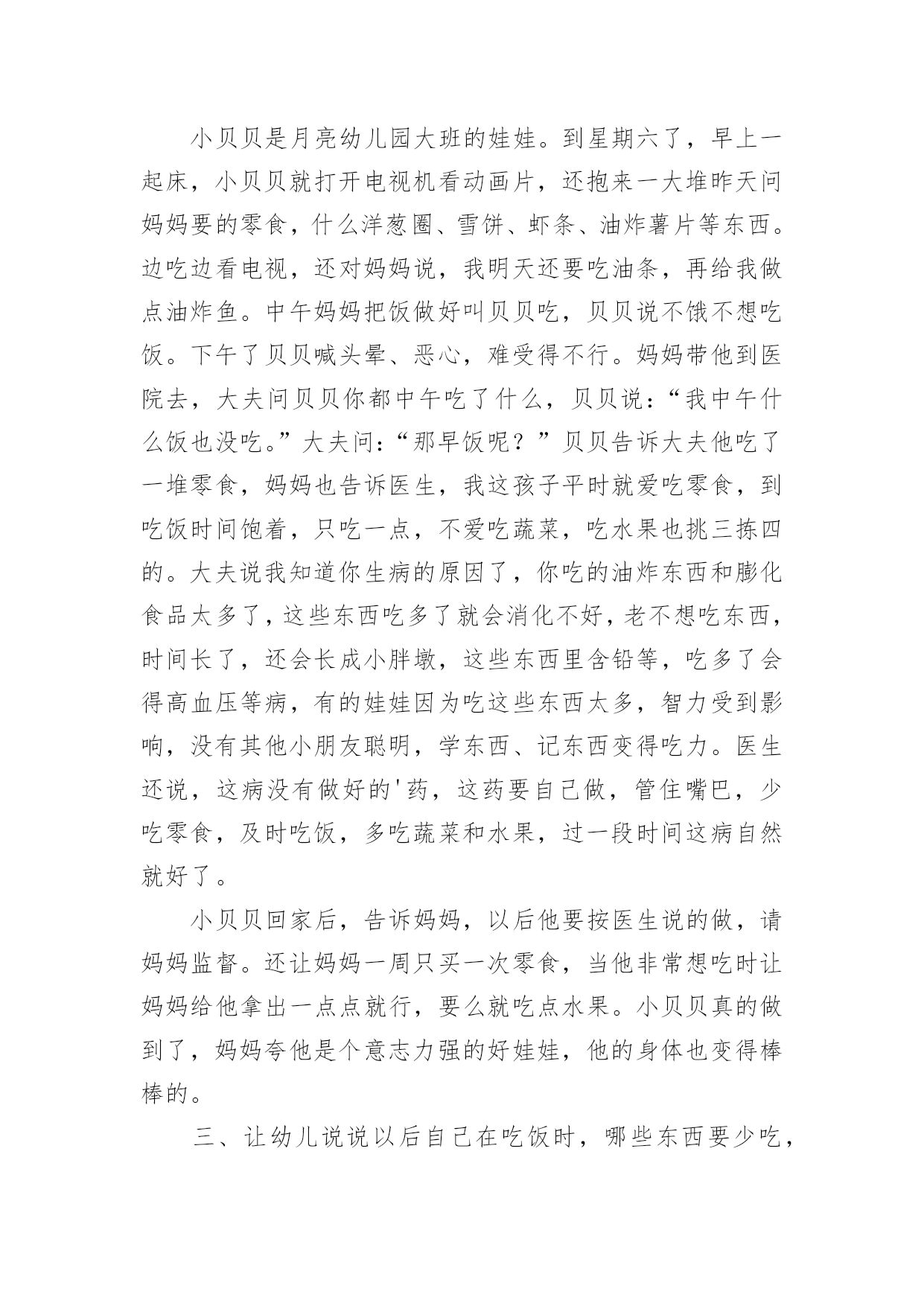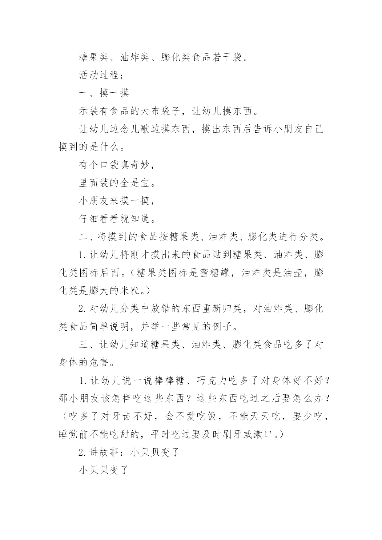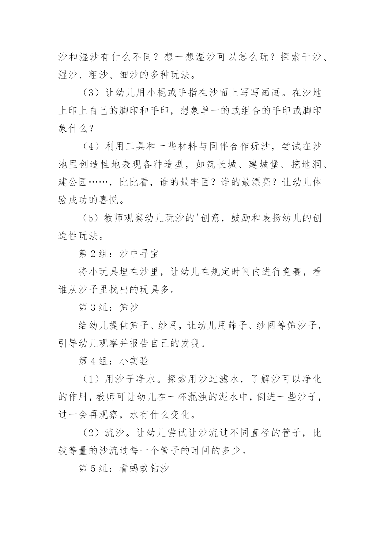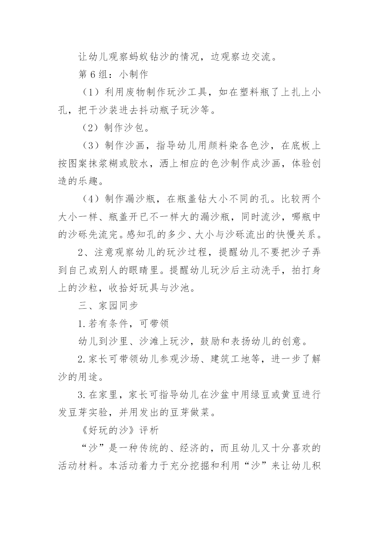 大班健康教案有关大班健康教案集合6篇作为一位杰出的教职工,常常要根据教学需要编写教案,教案有助于学生理解并掌握系统的知识。那么优秀的教案是什么样的呢?下面是小编精心整理的大班健康教案6篇,仅供参考,欢迎大家阅读。大班健康教案篇1活动目标1、认识有营养的胡萝卜、豆腐、菠菜等食物。2、懂得合理饮食,在日常生活中做到不挑食,不偏食。活动准备录音机、胡萝卜、菠菜等食物活动过程一、激趣导入:师:小朋友们,营养食物王国的国王邀请我们去做客,在哪里有许多好吃的,你们想不想去?(想去)师:但请柬上有几个要求,我们能达到要求才能顺利到达。二、食物营养表达:(1)老师示范请同学们拍打节奏,在拍打这条节奏型时要注意附点和空拍,小朋友利用身体的部位感受这条节奏型。幼儿自由探索用身体感受节奏型。师:我们完成了营养食物王国国王的要求。现在可以出发了,(2)请幼儿说一说四种食物的.营养师:红红的胡萝卜有什么营养呢?(它含有很多维生素,可以抵御病菌。)其他事物有什么营养呢?(3)学唱歌曲。教师手拿胡萝卜清唱老师唱,小朋友拍节奏型并说唱。三、结束:分组进行演唱,并品尝有营养的食物。大班健康教案篇2活动目标:知道柠檬都有什么用法。食用柠檬都有哪些好处。经过学习简单的了解柠檬。活动准备:柠檬、柠檬汁、柠檬片、柠檬茶、柠檬果酱、柠檬饼……活动过程:一、认识柠檬1、先观察柠檬。2、讨论柠檬。二、了解柠檬1、柠檬长在柠檬树。2、柠檬花是白色的,花萼是淡紫红色。3、柠檬没成熟是绿色,成熟后是黄色,果实是椭圆形。4、柠檬叶的叶是绿色的.,椭圆形叶子有点厚。三、柠檬用途1、摆出准备好关于柠檬的东西。2、说一说,柠檬的的用途。——柠檬可以泡茶,也可以为酱和甜点调味等等。3、最用药用价值的世界水果里就有柠檬。4、柠檬里富含维生素c,有抵抗的能力,能保护我们的体质。活动结束品尝柠檬汁、柠檬片、柠檬茶、柠檬果酱、柠檬饼……大班健康教案篇3玩沙是幼儿最喜欢的活动之一,玩沙可以让幼儿感到快乐,玩沙可以让幼儿尽情地发挥想象去创造,玩沙可以让幼儿自主地尝试、体验,在不知不觉中感知沙的特性。选择沙作为幼儿科学探究的内容,让幼儿用各种辅助物创造性地与同伴合作玩沙,尝试在沙堆上筑沙堡,用沙子种植物、养动物,初步学习制作玩沙工具,不仅可以丰富幼儿对沙的了解,更可以使幼儿感受到玩沙的乐趣。一、环境与材料1.供幼儿玩沙用的玩沙区(沙地、沙池或沙盆即可)。2.师生共同建设“种养园地”,在园地中种植仙人掌、仙人柱、仙人球等喜沙植物,用沙子进行种子发芽的实验;在沙箱中养蚂蚁,在沙盆中养螃蟹、沙龟等。3.玩沙的工具:小棍,小铲、小桶、小瓶、模子等。4.安全剪刀,废旧材料:塑料瓶、易拉罐、瓶盖等。5.各种小玩具。6.实验用品:透明玻璃杯、污水、沙子等。不同直径的管子。时钟或手表等。7.制作沙画的材料:颜料、绘有图案的底板、浆糊或胶水、细沙等。8.制作沙包的材料:布、沙子、针线等。9.制作沙漏的材料:带盖的塑料瓶若干、干沙等。二、观察与指导1.开展分组活动,让幼儿自选活动,允许幼儿在小组间流动活动。第1组:玩沙(1)让幼儿在沙地里自由玩沙,可以引导幼儿光着脚丫在沙子上走一走,跳一跳,看沙面上留下了什么?用手抓一抓,捏一捏沙,试试干沙能捏成球吗?借助各种玩具玩沙,用玩具或模子扣一扣沙,看看能做出什么形状。让幼儿在玩中感知沙的柔软与松散等特征,体验玩沙的乐趣。(2)让幼儿在沙子里喷水或把水倒入沙中,比一比干沙和湿沙有什么不同?想一想湿沙可以怎么玩?探索干沙、湿沙、粗沙、细沙的多种玩法。(3)让幼儿用小棍或手指在沙面上写写画画。在沙地上印上自己的脚印和手印,想象单一的或组合的手印或脚印象什么?(4)利用工具和一些材料与同伴合作玩沙,尝试在沙池里创造性地表现各种造型,如筑长城、建城堡、挖地洞、建公园……,比比看,谁的最牢固?谁的最漂亮?让幼儿体验成功的喜悦。(5)教师观察幼儿玩沙的'创意,鼓励和表扬幼儿的创造性玩法。第2组:沙中寻宝将小玩具埋在沙里,让幼儿在规定时间内进行竞赛,看谁从沙子里找出的玩具多。第3组:筛沙给幼儿提供筛子、纱网,让幼儿用筛子、纱网等筛沙子,引导幼儿观察并报告自己的发现。第4组:小实验(1)用沙子净水。探索用沙过滤水,了解沙可以净化的作用,教师可让幼儿在一杯混浊的泥水中,倒进一些沙子,过一会再观察,水有什么变化。(2)流沙。让幼儿尝试让沙流过不同直径的管子,比较等量的沙流过每一个管子的时间的多少。第5组:看蚂蚁钻沙让幼儿观察蚂蚁钻沙的情况,边观察边交流。第6组:小制作(1)利用废物制作玩沙工具,如在塑料瓶了上扎上小孔,把干沙装进去抖动瓶子玩沙等。(2)制作沙包。(3)制作沙画,指导幼儿用颜料染各色沙,在底板上按图案抹浆糊或胶水,洒上相应的色沙制作成沙画,体验创造的乐趣。(4)制作漏沙瓶,在瓶盖钻大